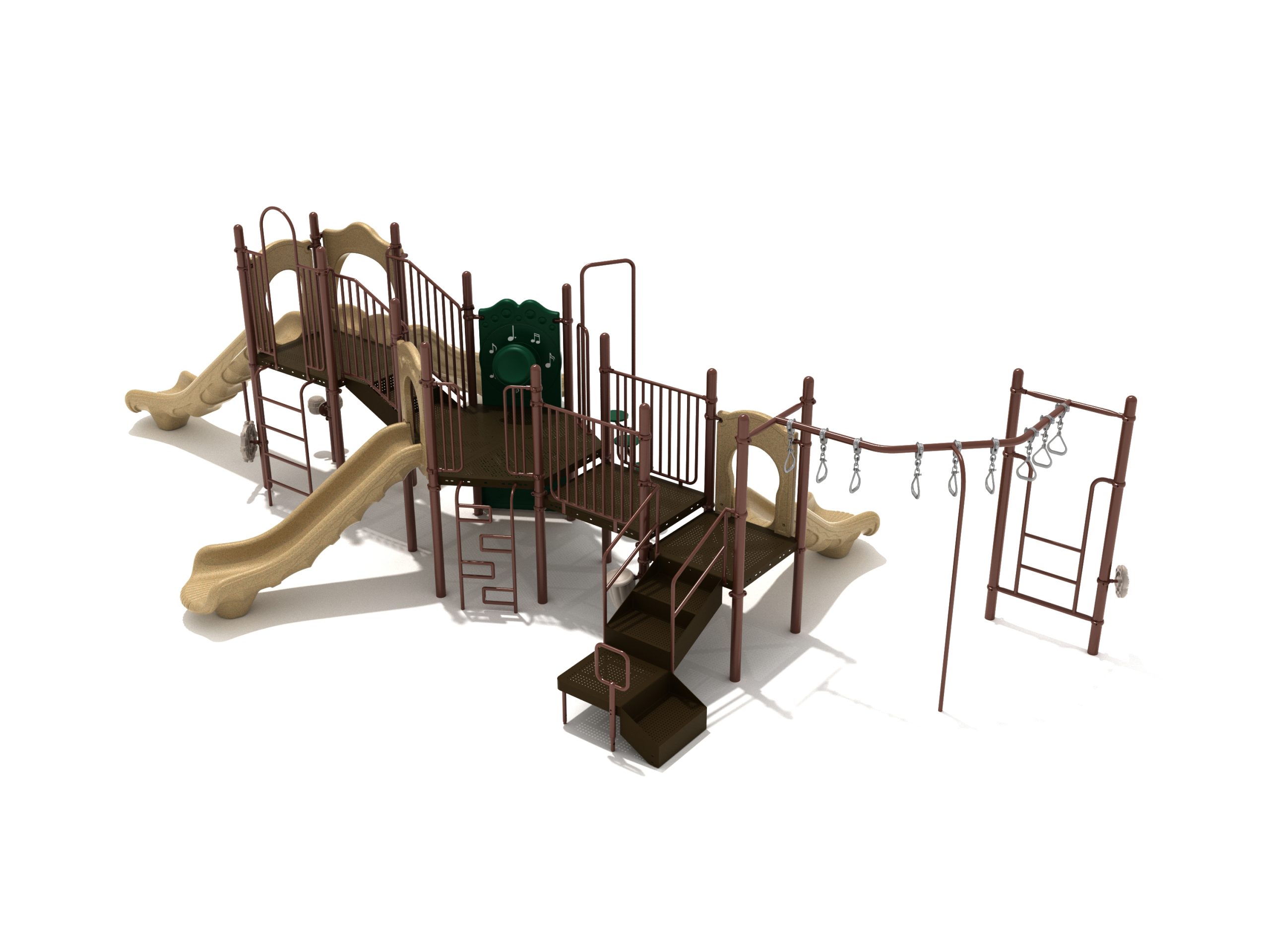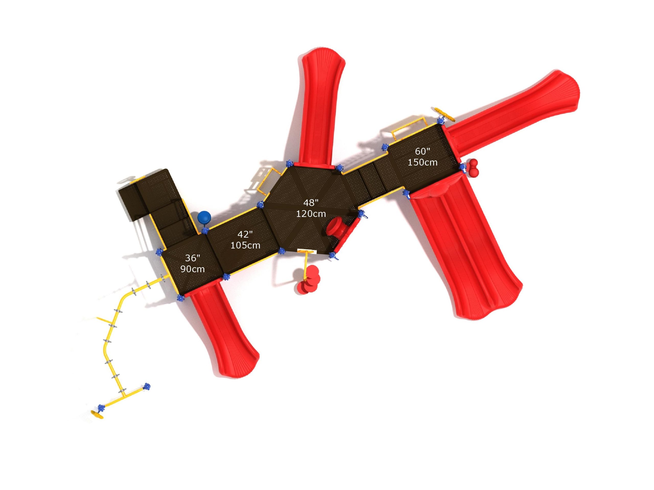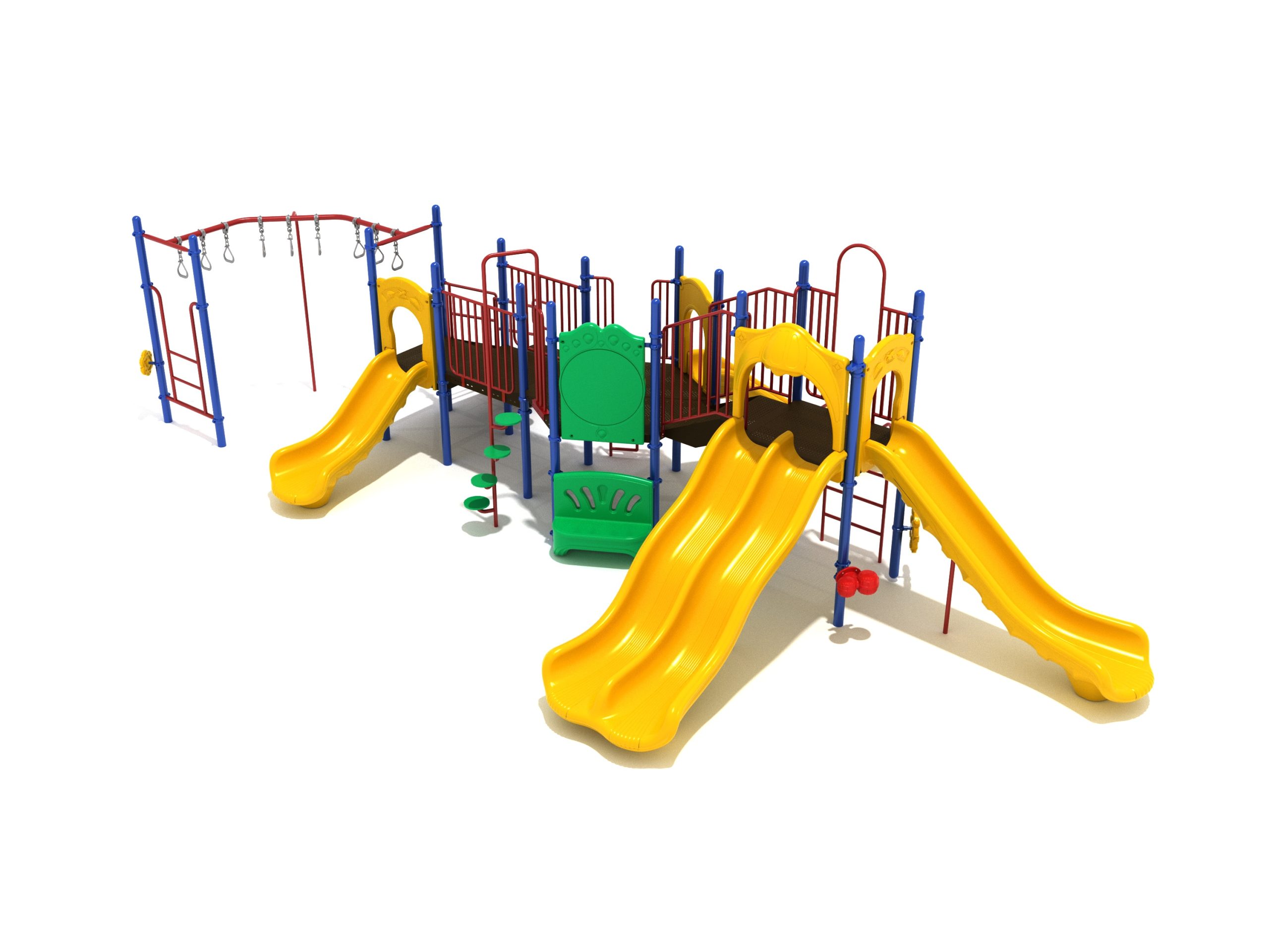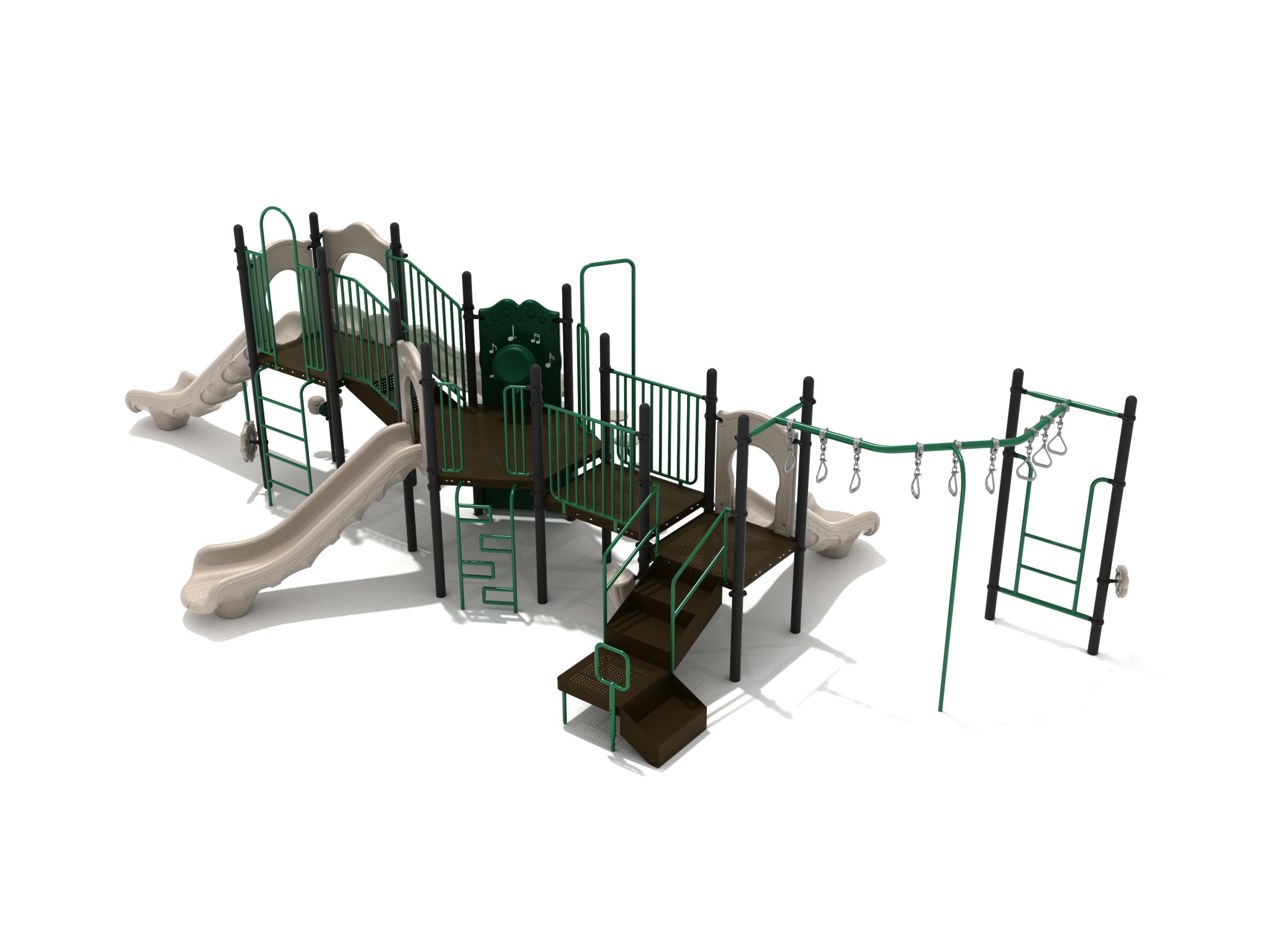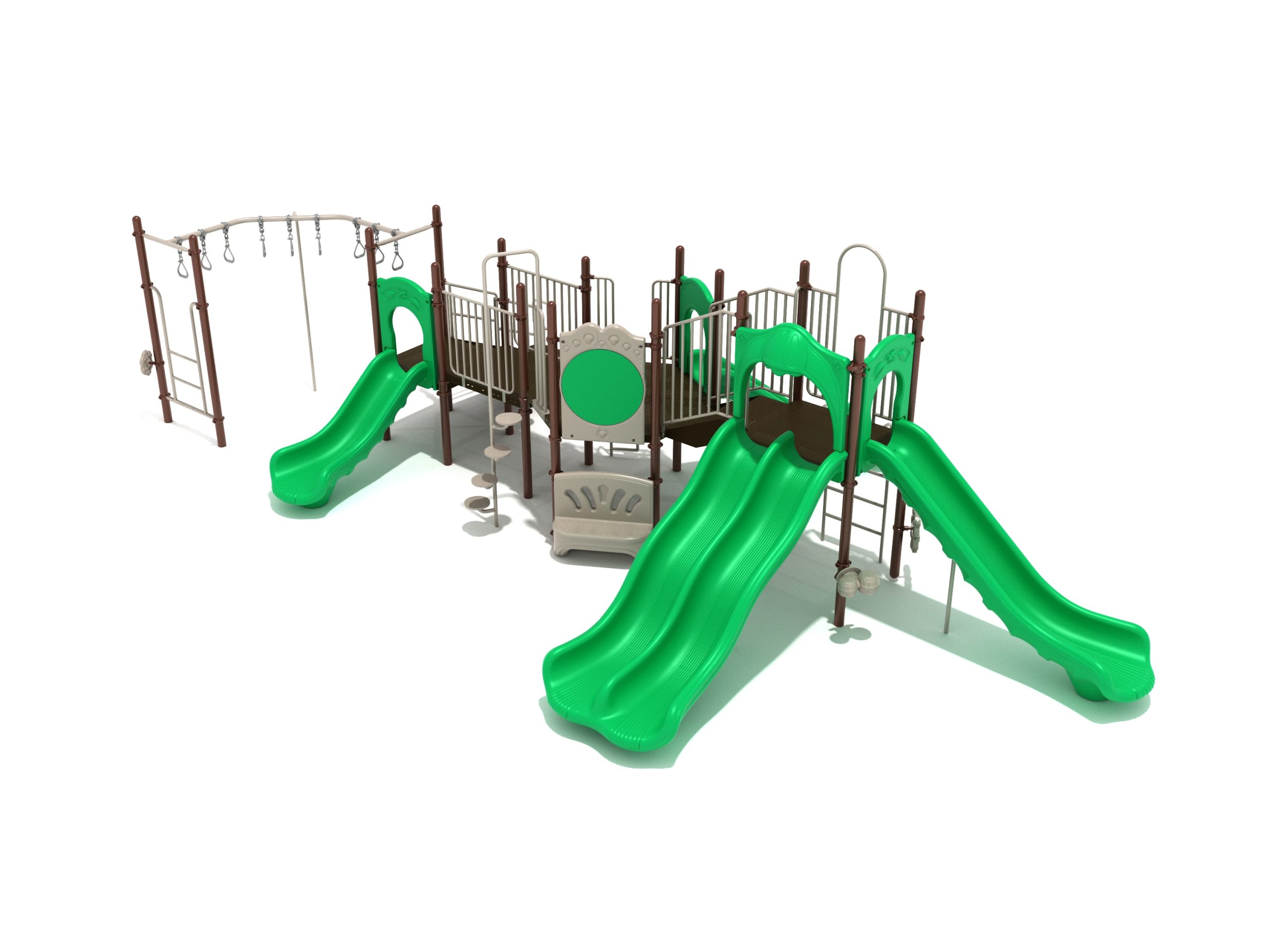 When you install the Santa Monica structure in a playground or public space you’re providing lots of enjoyment for many children of different ages and abilities. Promote physical fitness with a 90 Degree Overhead Swing Ladder accessible by a short Vertical Ladder and watch them use their upper body strength to achieve success. There is a longer Vertical Ladder to access the platform directly, but you can be sure that children will be choosing the more adventurous ways to climb up including the Disk Climber made up of circular footpads of the Zipper Climber which requires some basic hand-eye coordination. Three Straight Slides emerge in different directions which allow children to make decisions about which one they choose, but there’s a Double Wave Slide that every child will want to zip down quickly. Features like the Single Drum, Drum Panel and Bongos add an auditory experience to the structure, and the Rain Wheel and Ship’s Wheel add movement as they spin round and round when touched. A Bench Panel underneath provides an area for respite when kids need to recharge their batteries.