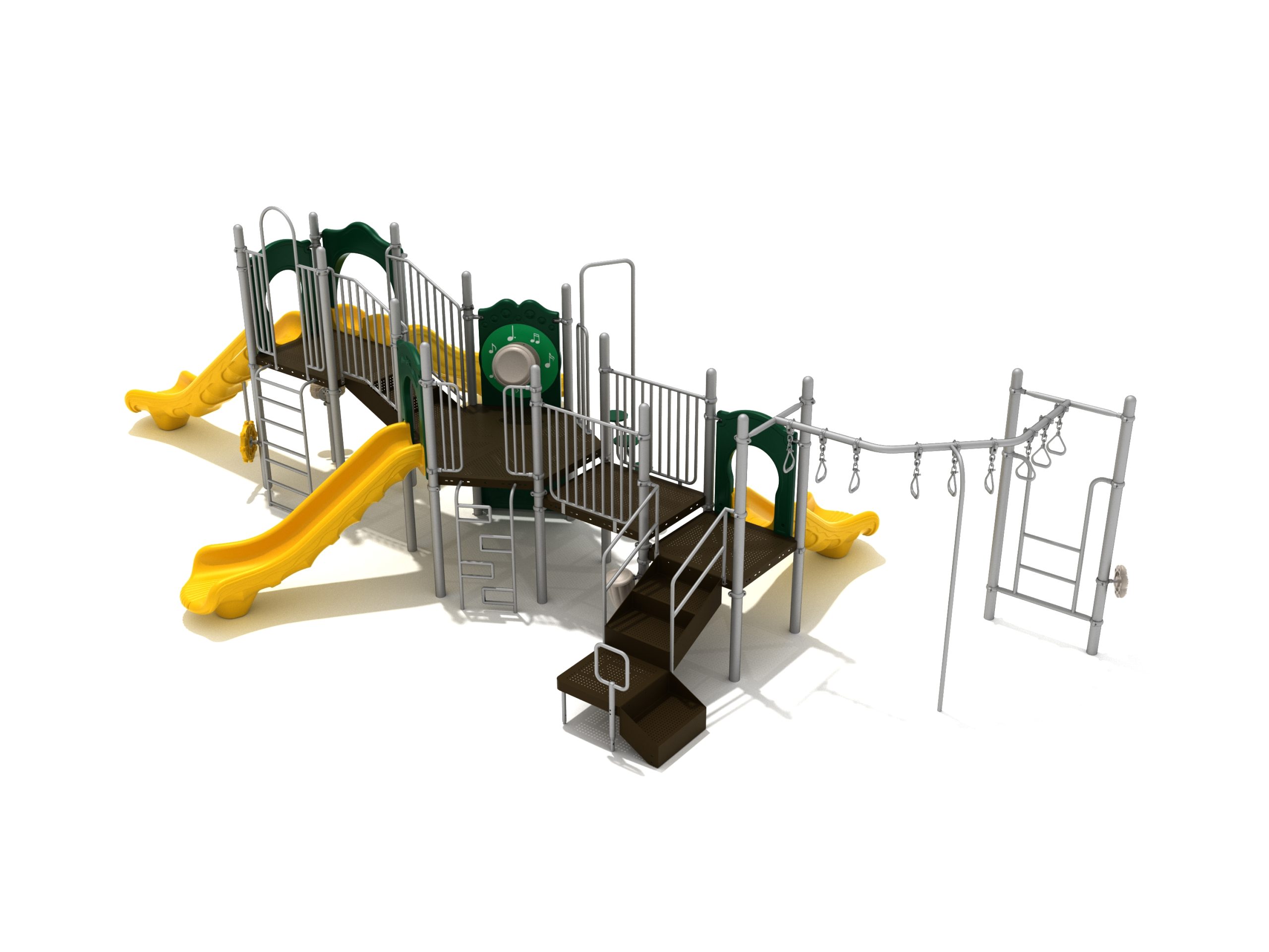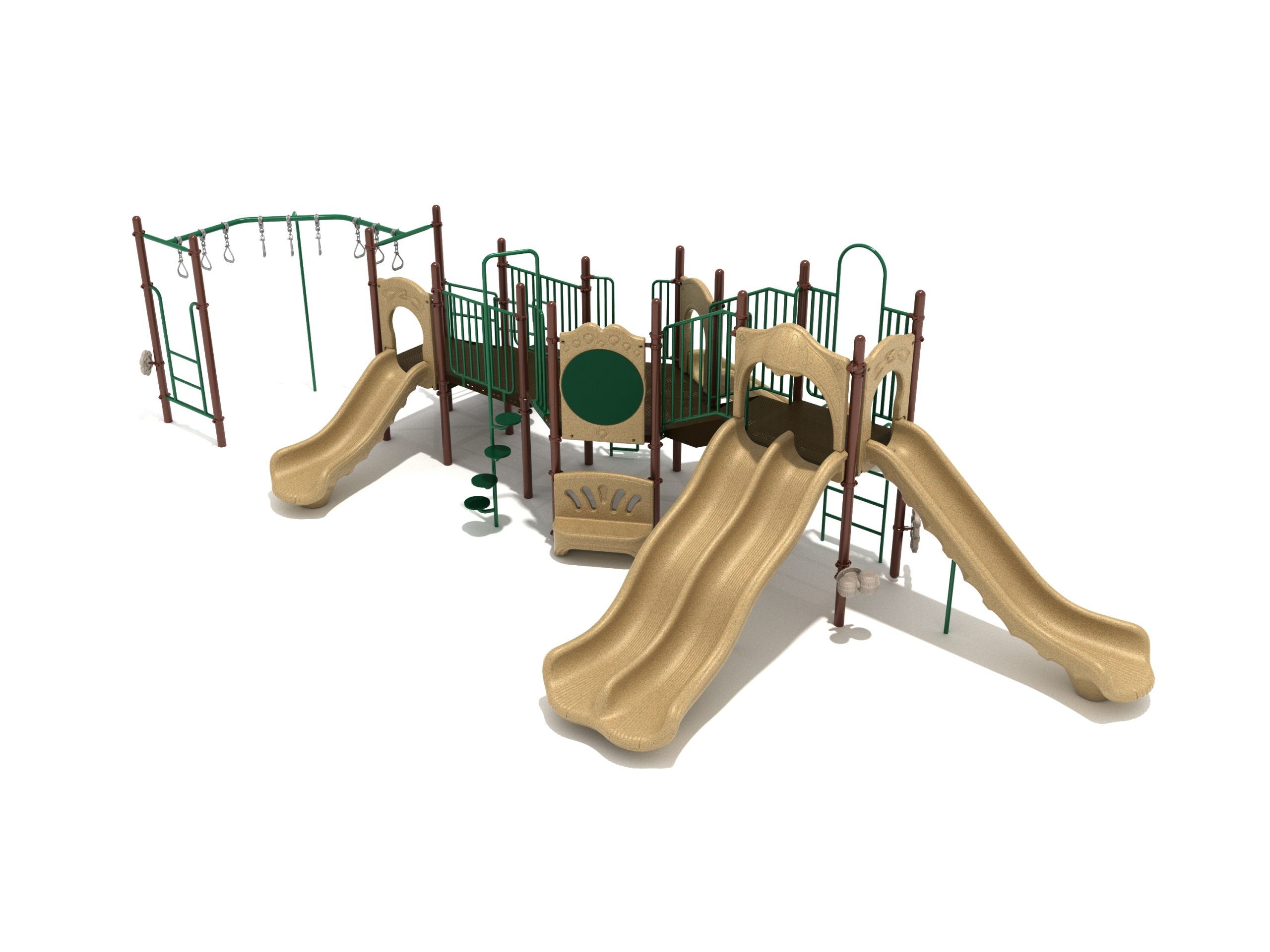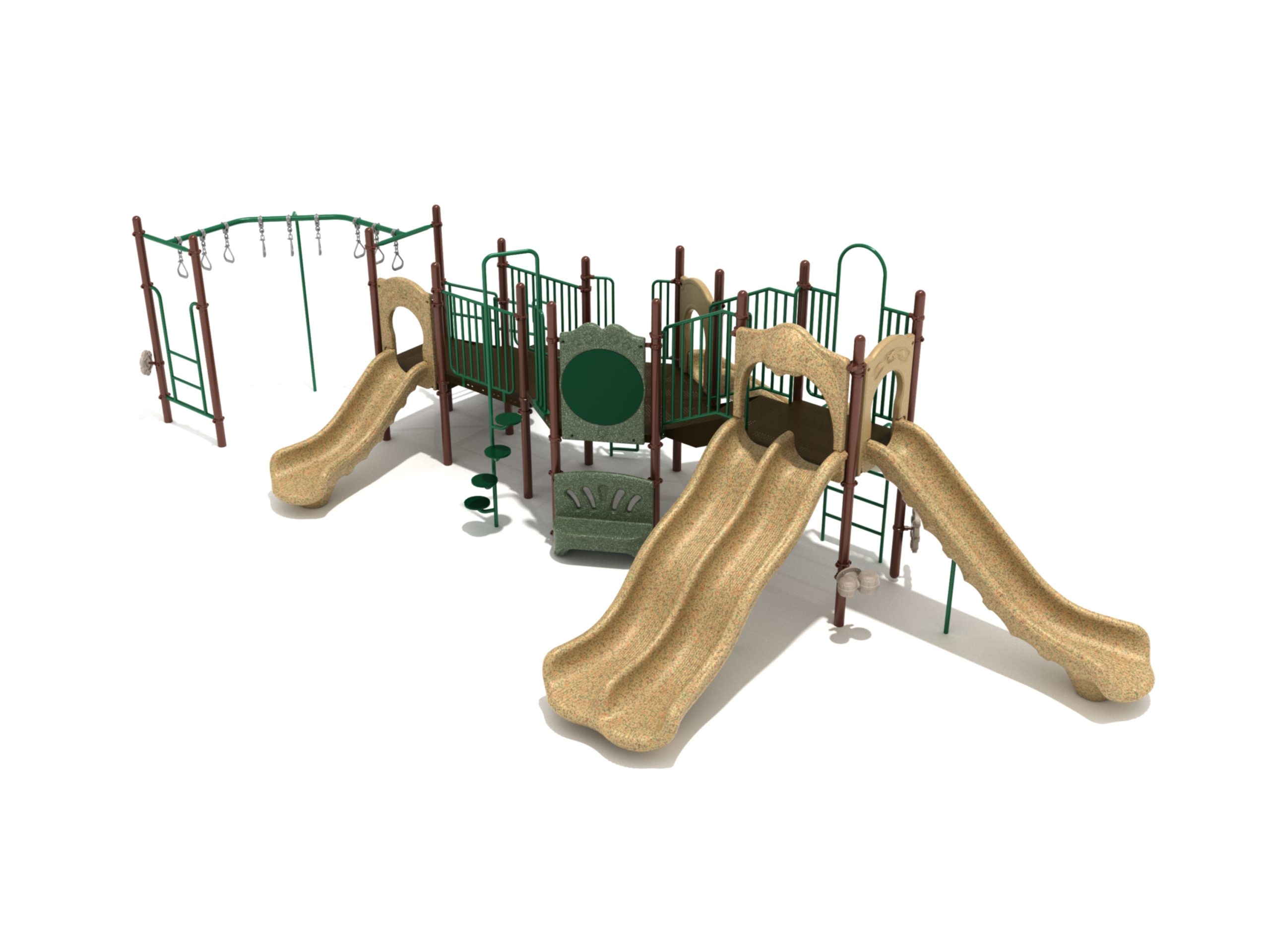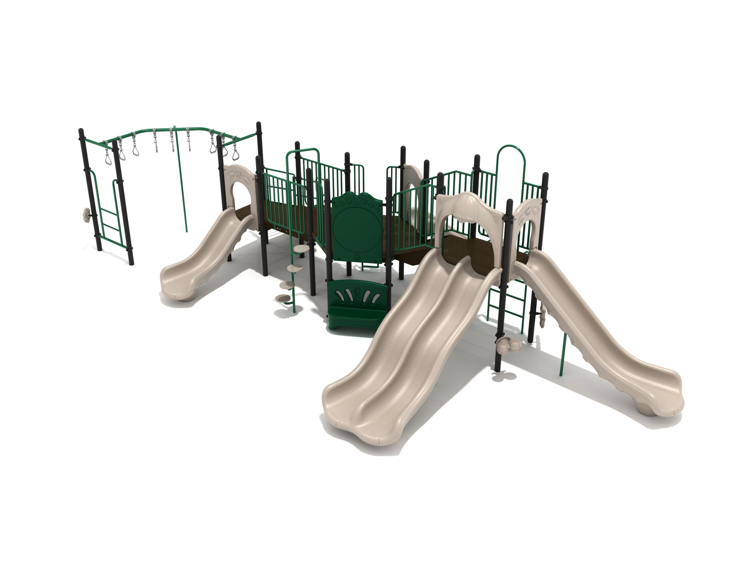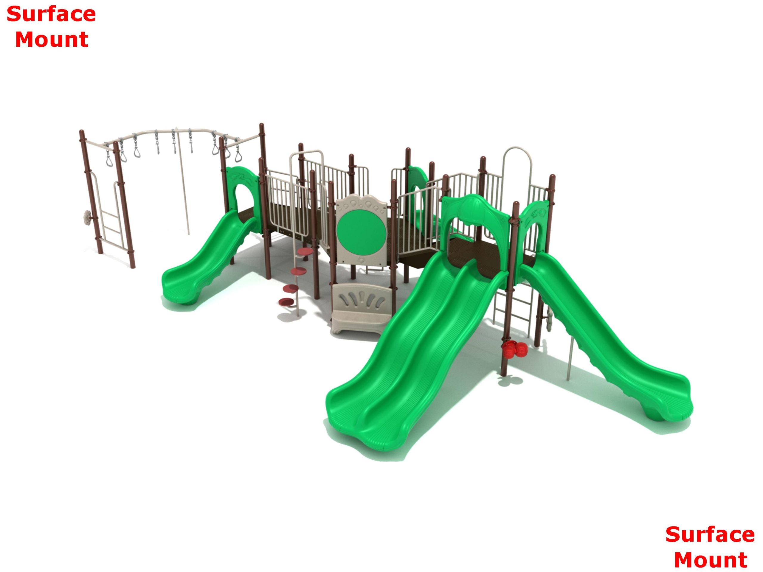 When you install the Santa Monica structure in a playground or public space you’re providing lots of enjoyment for many children of different ages and abilities. Promote physical fitness with a 90 Degree Overhead Swing Ladder accessible by a short Vertical Ladder and watch them use their upper body strength to achieve success. There is a longer Vertical Ladder to access the platform directly, but you can be sure that children will be choosing the more adventurous ways to climb up including the Disk Climber made up of circular footpads of the Zipper Climber which requires some basic hand-eye coordination. Three Straight Slides emerge in different directions which allow children to make decisions about which one they choose, but there’s a Double Wave Slide that every child will want to zip down quickly. Features like the Single Drum, Drum Panel and Bongos add an auditory experience to the structure, and the Rain Wheel and Ship’s Wheel add movement as they spin round and round when touched. A Bench Panel underneath provides an area for respite when kids need to recharge their batteries.