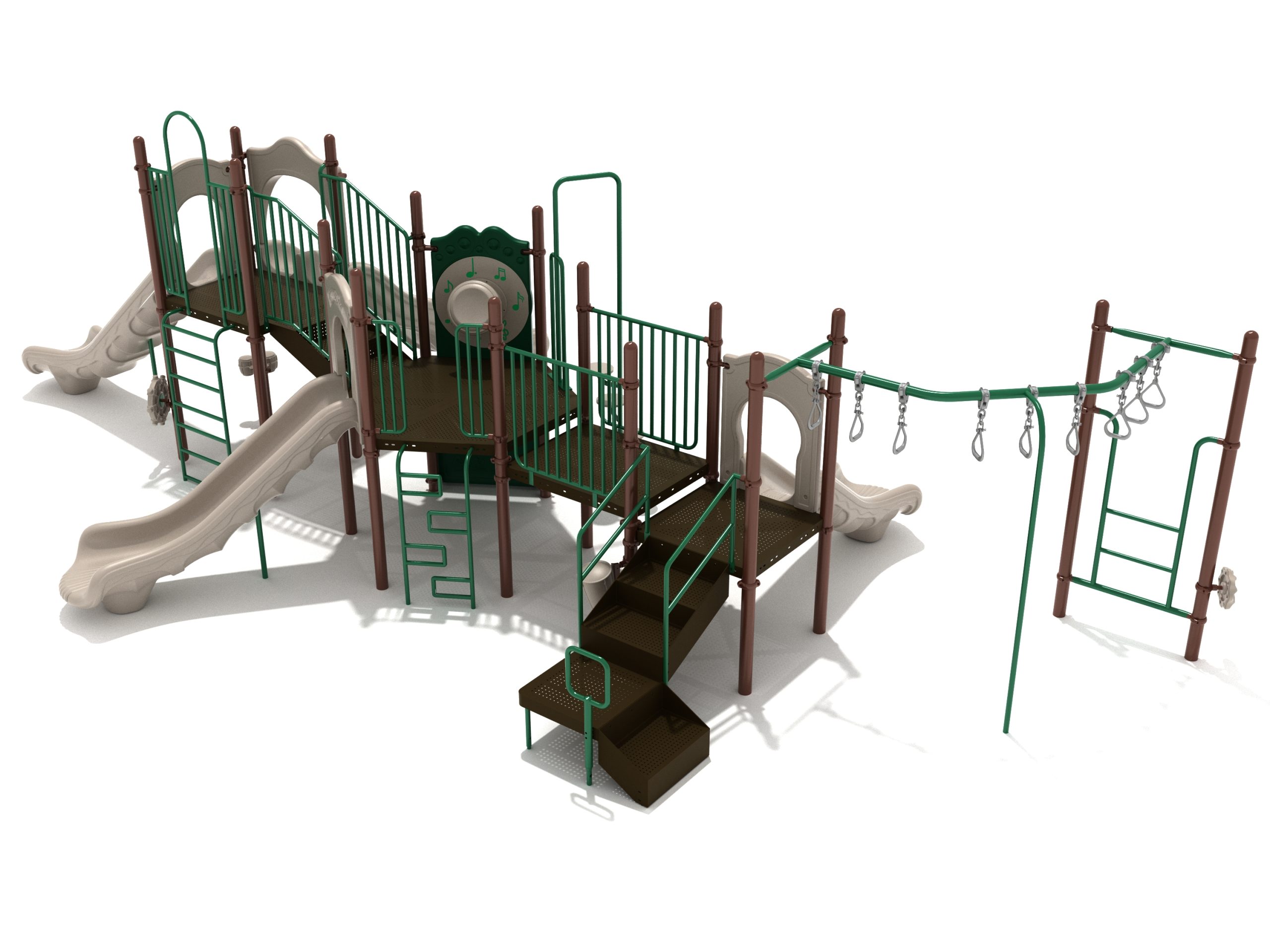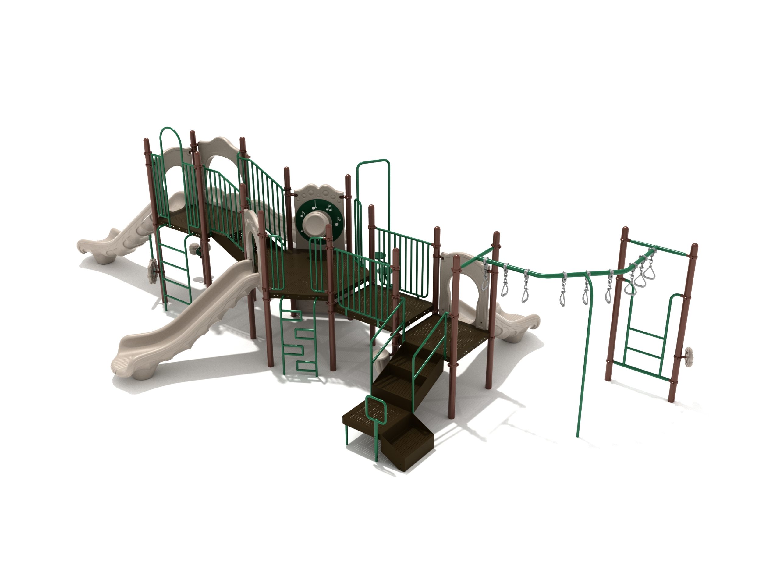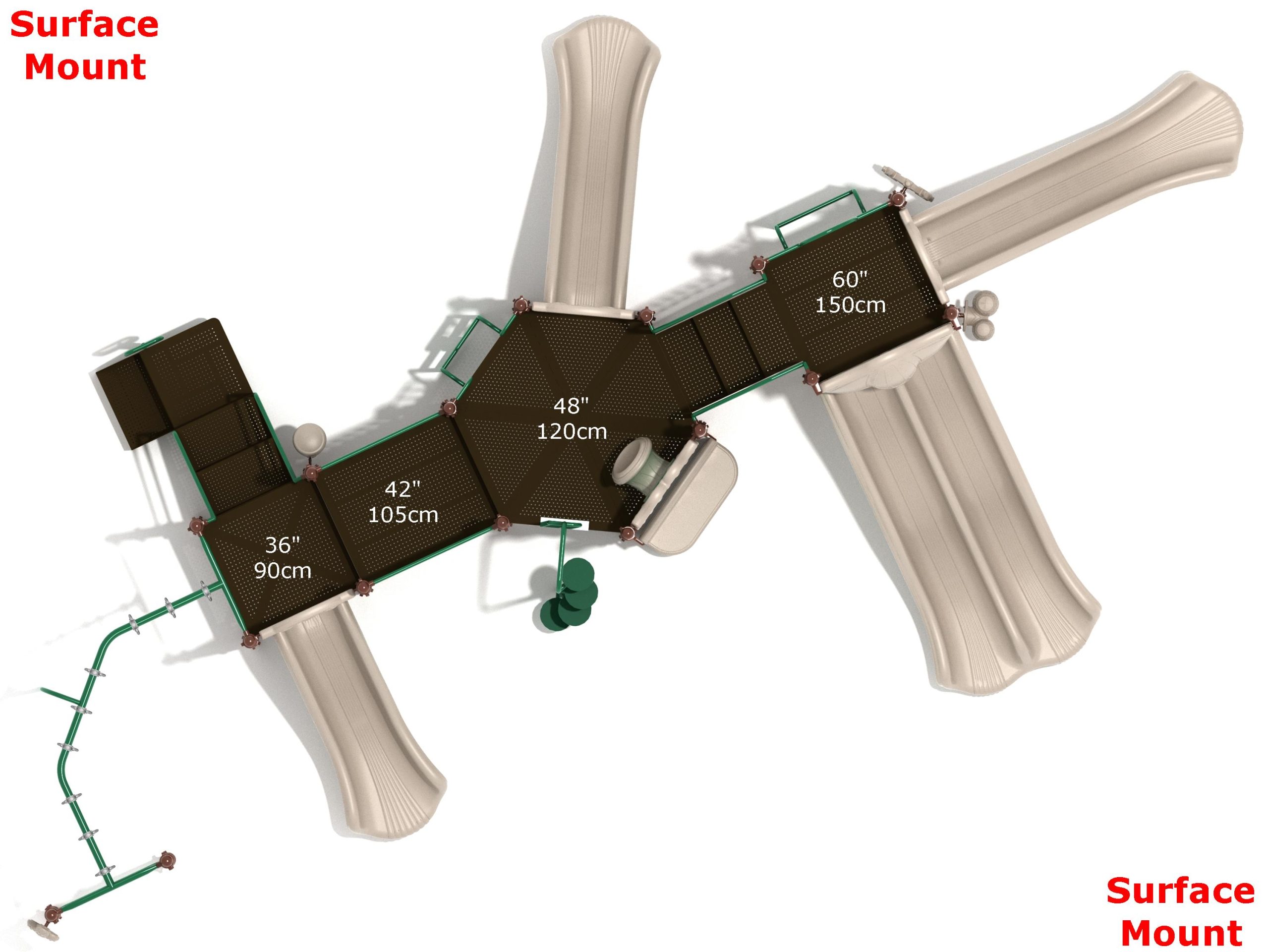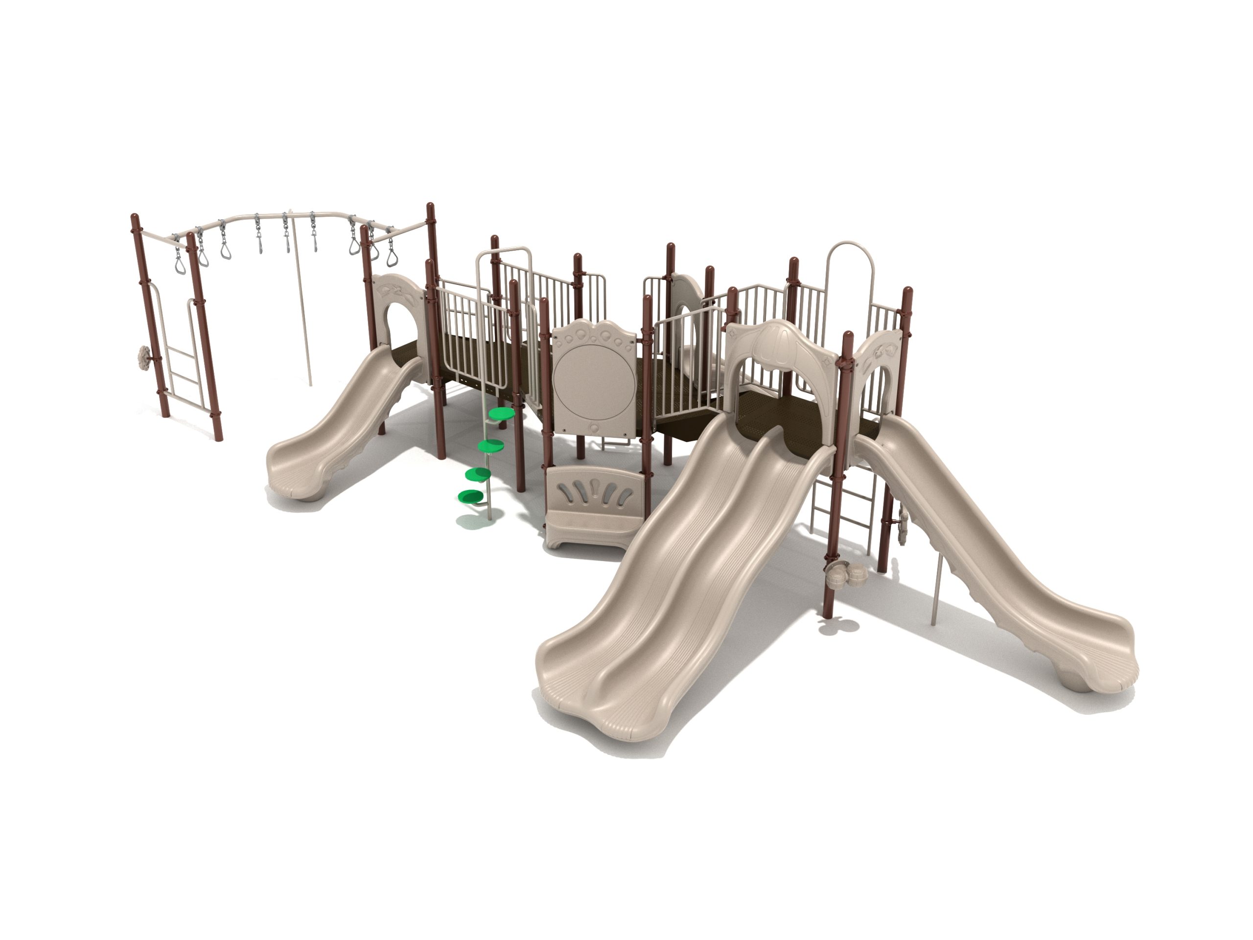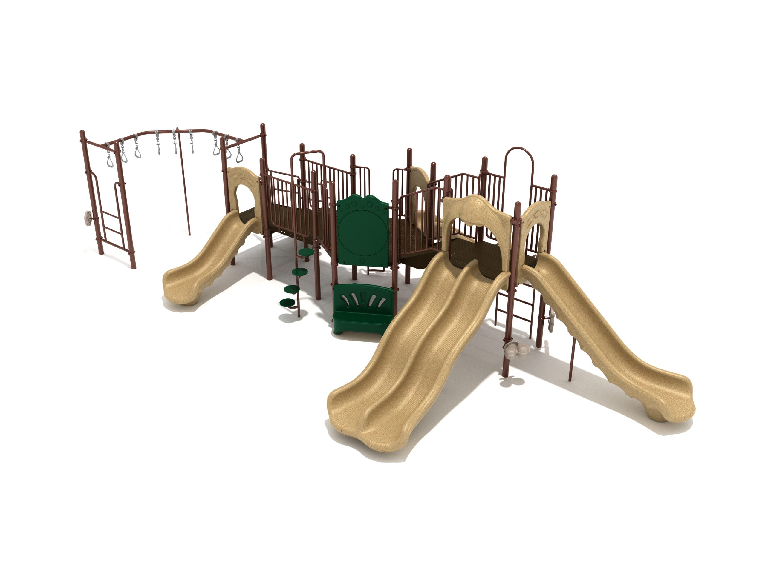When you install the Santa Monica structure in a playground or public space you’re providing lots of enjoyment for many children of different ages and abilities. Promote physical fitness with a 90 Degree Overhead Swing Ladder accessible by a short Vertical Ladder and watch them use their upper body strength to achieve success. There is a longer Vertical Ladder to access the platform directly, but you can be sure that children will be choosing the more adventurous ways to climb up including the Disk Climber made up of circular footpads of the Zipper Climber which requires some basic hand-eye coordination. Three Straight Slides emerge in different directions which allow children to make decisions about which one they choose, but there’s a Double Wave Slide that every child will want to zip down quickly. Features like the Single Drum, Drum Panel and Bongos add an auditory experience to the structure, and the Rain Wheel and Ship’s Wheel add movement as they spin round and round when touched. A Bench Panel underneath provides an area for respite when kids need to recharge their batteries.