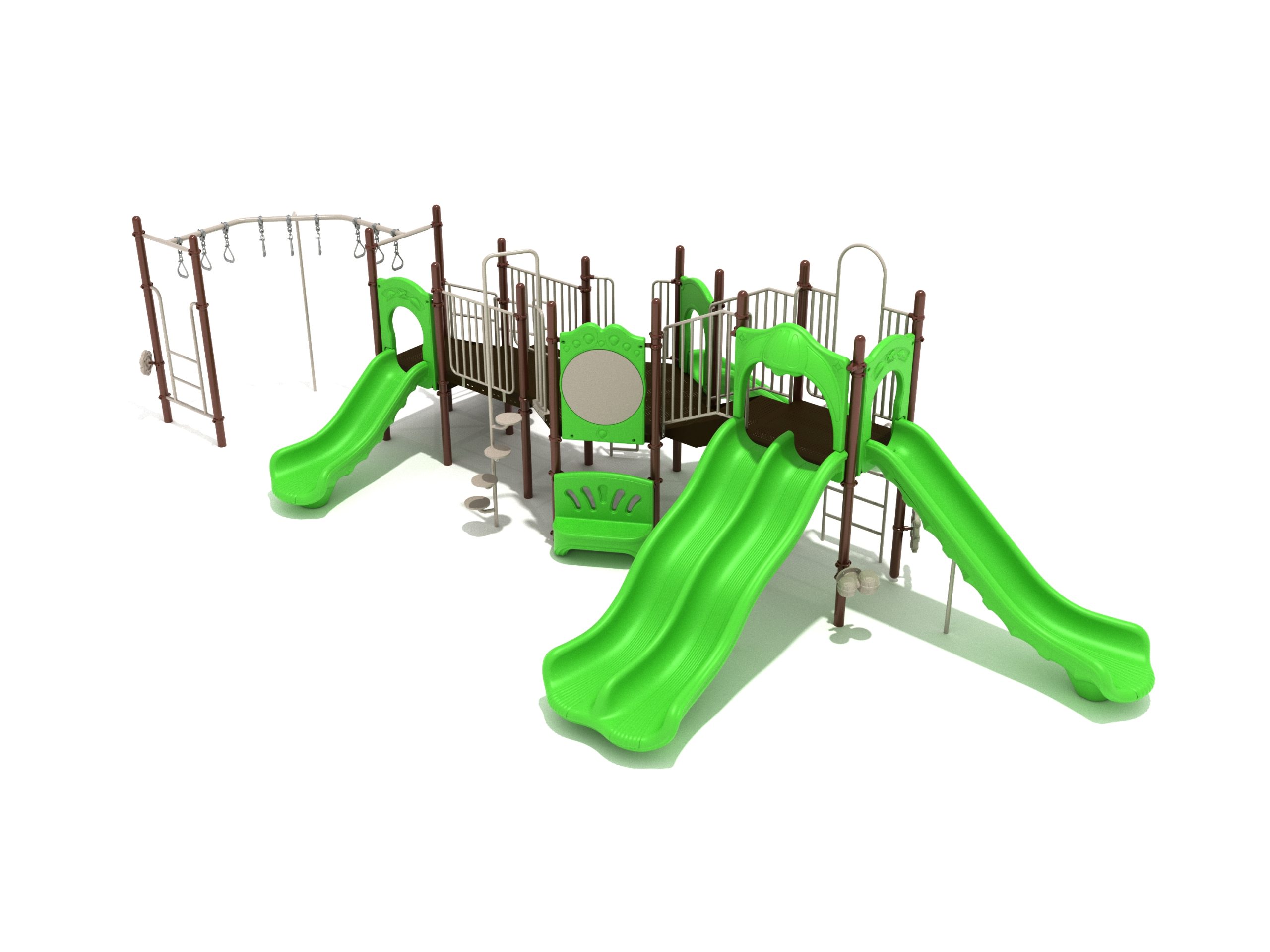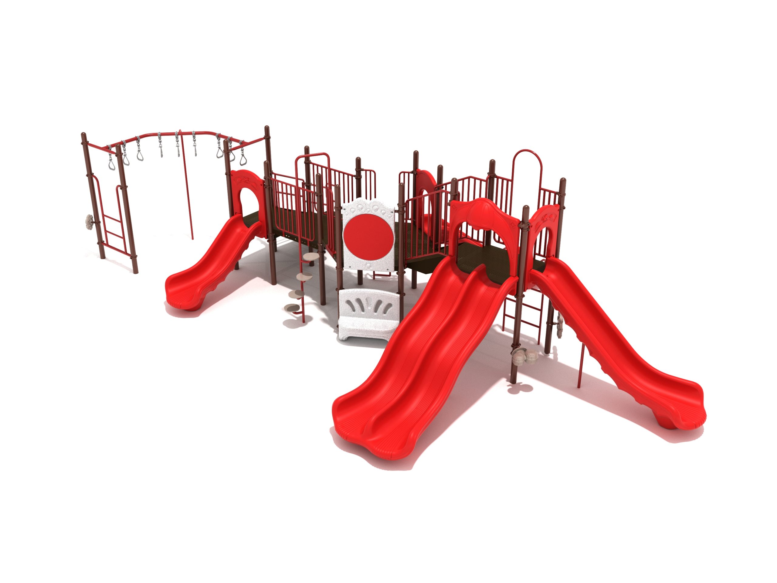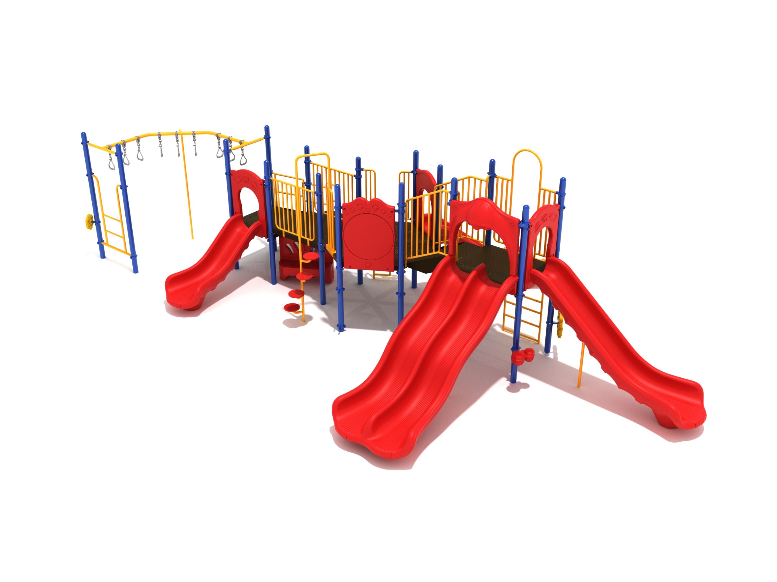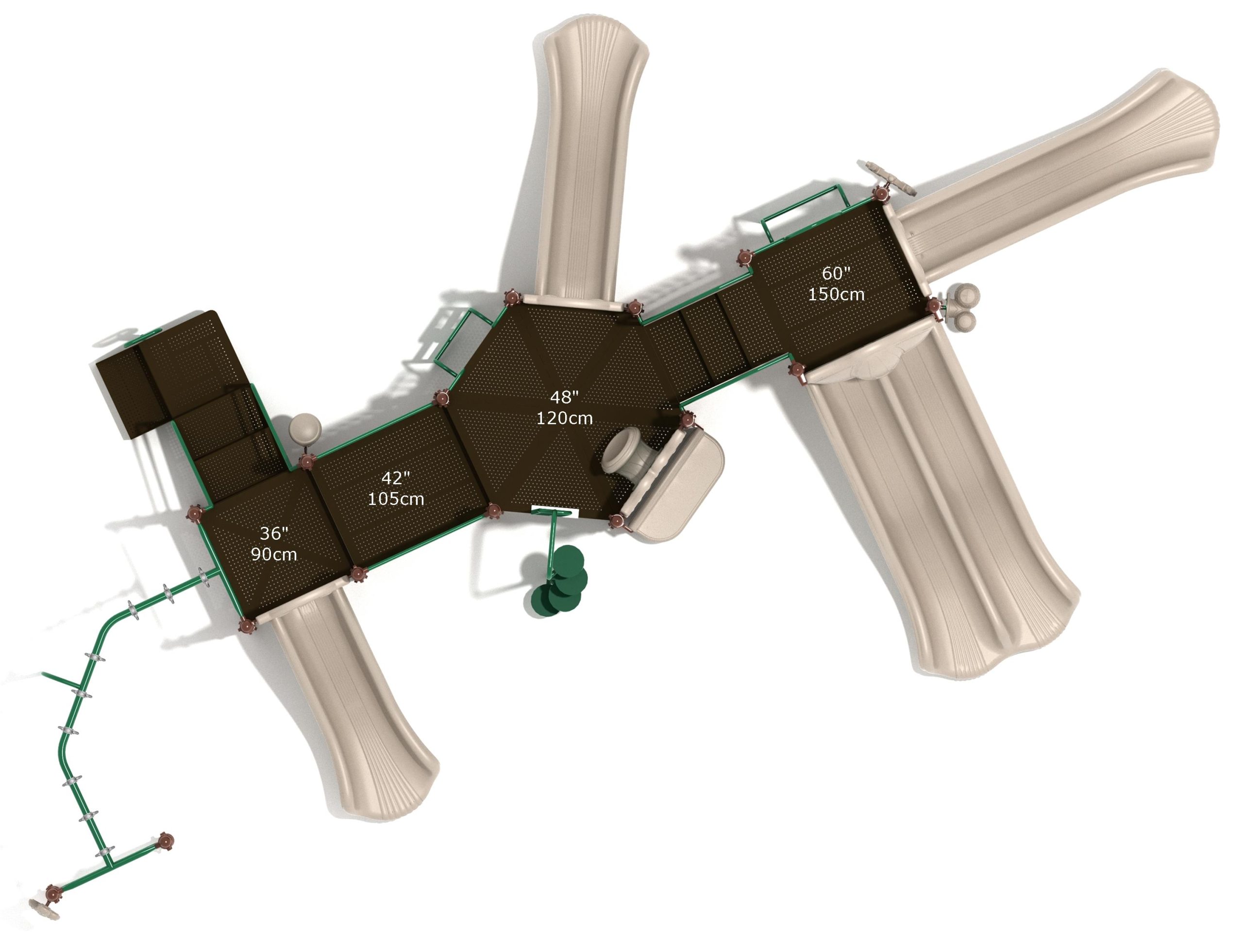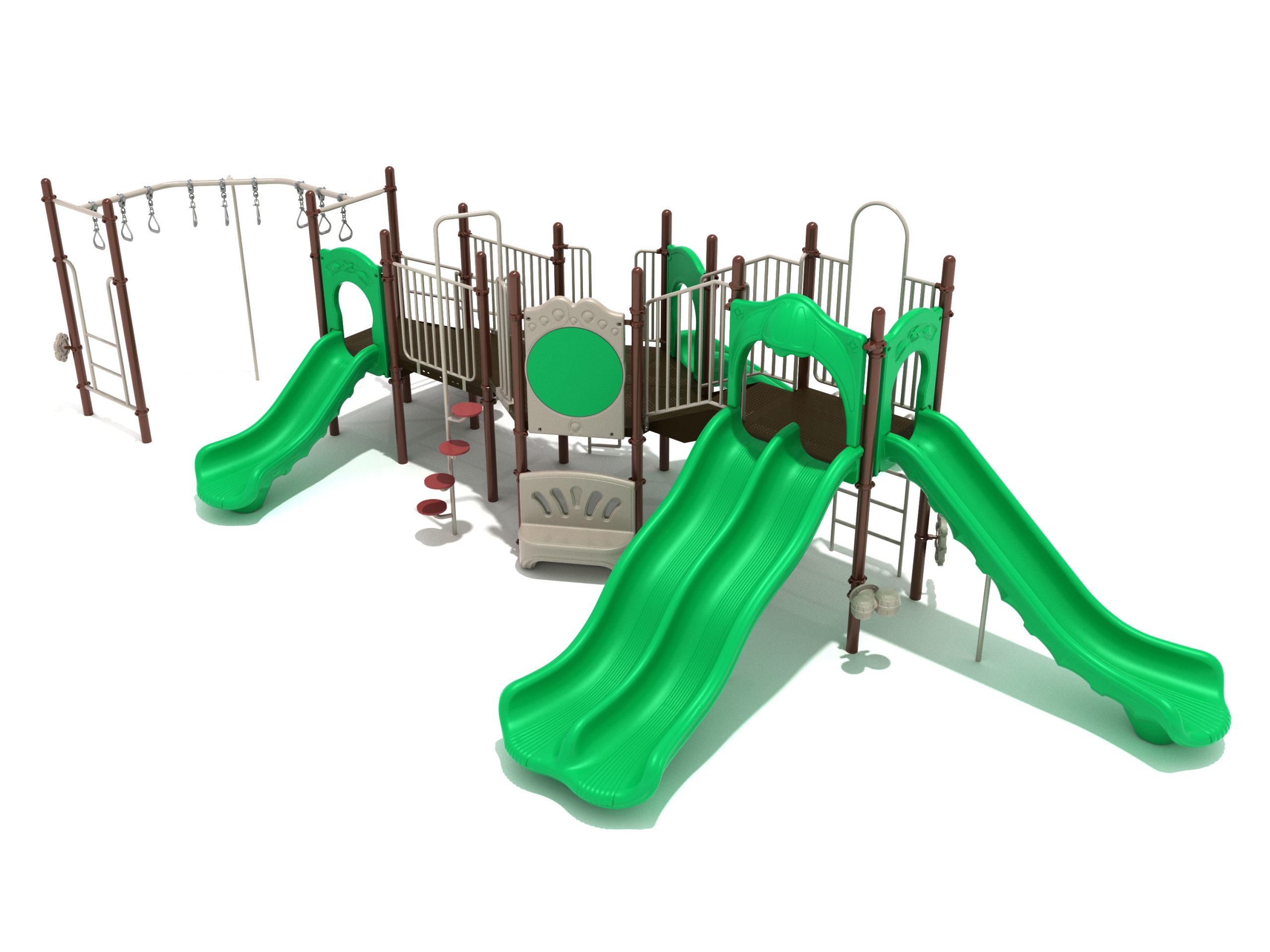 When you install the Santa Monica structure in a playground or public space you’re providing lots of enjoyment for many children of different ages and abilities. Promote physical fitness with a 90 Degree Overhead Swing Ladder accessible by a short Vertical Ladder and watch them use their upper body strength to achieve success. There is a longer Vertical Ladder to access the platform directly, but you can be sure that children will be choosing the more adventurous ways to climb up including the Disk Climber made up of circular footpads of the Zipper Climber which requires some basic hand-eye coordination. Three Straight Slides emerge in different directions which allow children to make decisions about which one they choose, but there’s a Double Wave Slide that every child will want to zip down quickly. Features like the Single Drum, Drum Panel and Bongos add an auditory experience to the structure, and the Rain Wheel and Ship’s Wheel add movement as they spin round and round when touched. A Bench Panel underneath provides an area for respite when kids need to recharge their batteries.