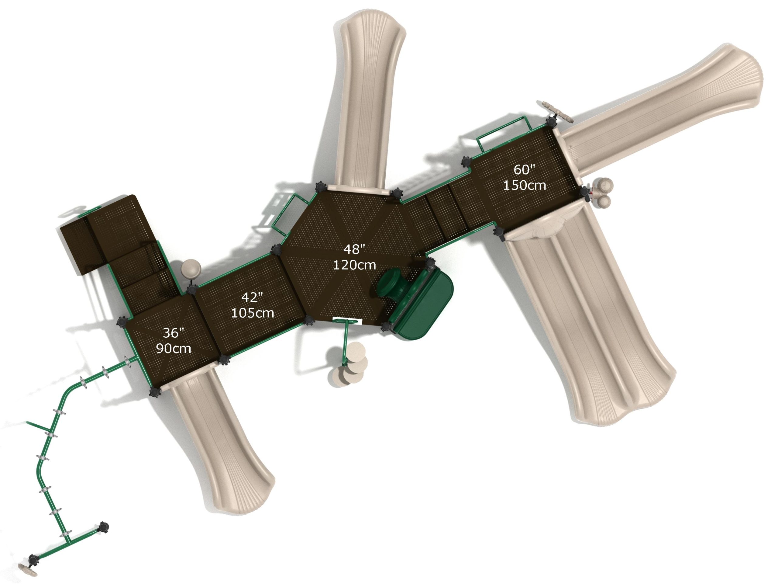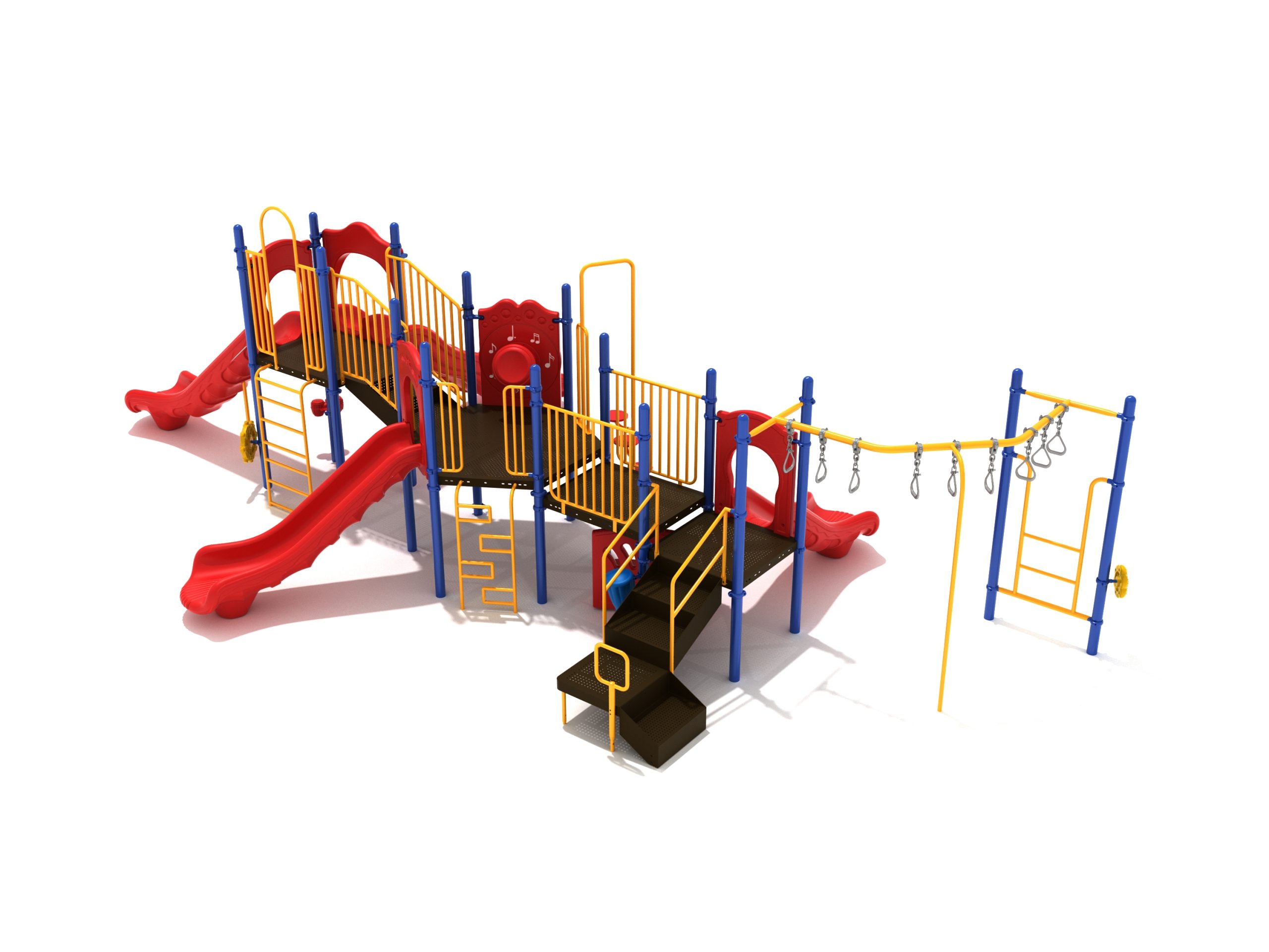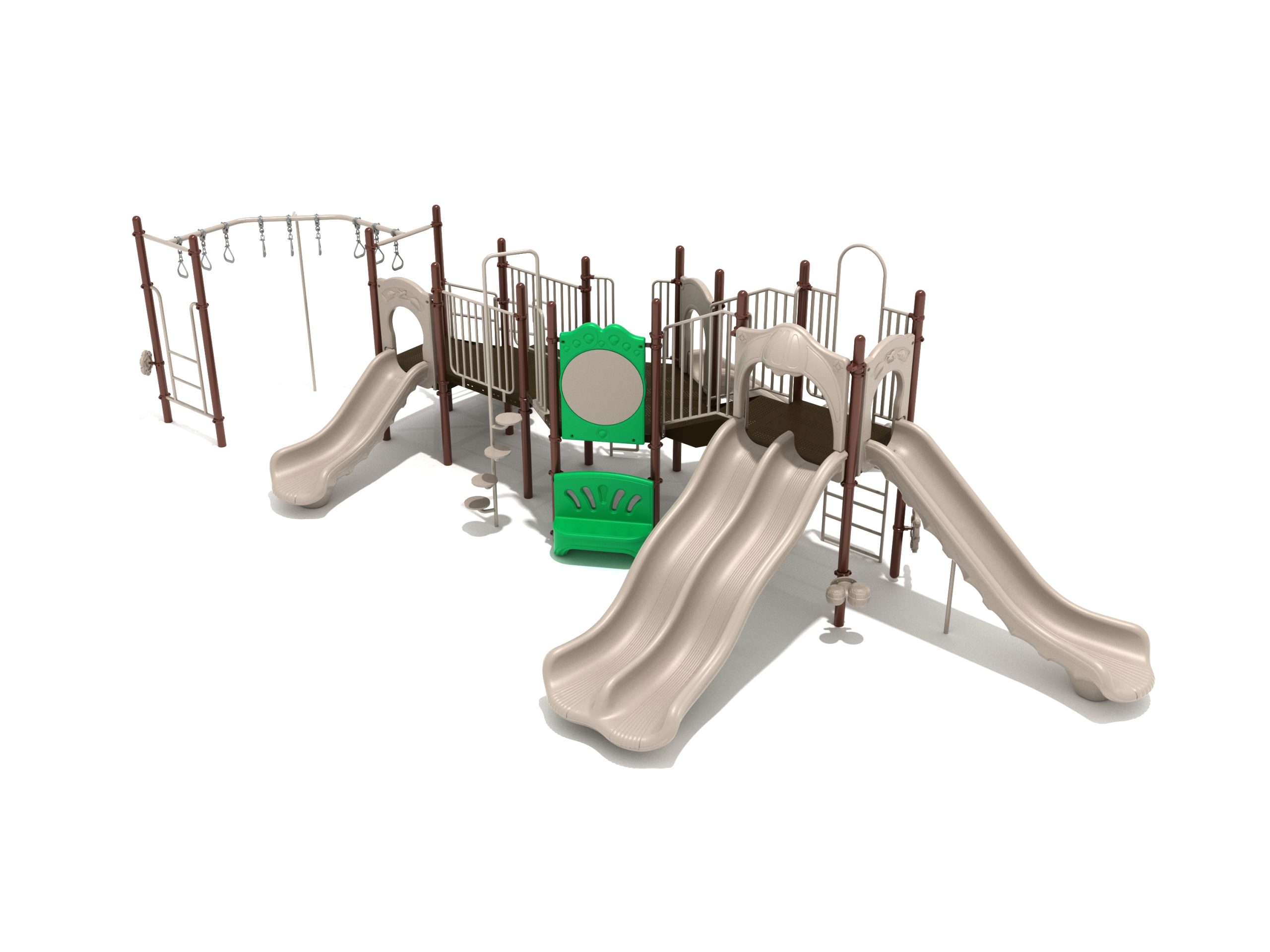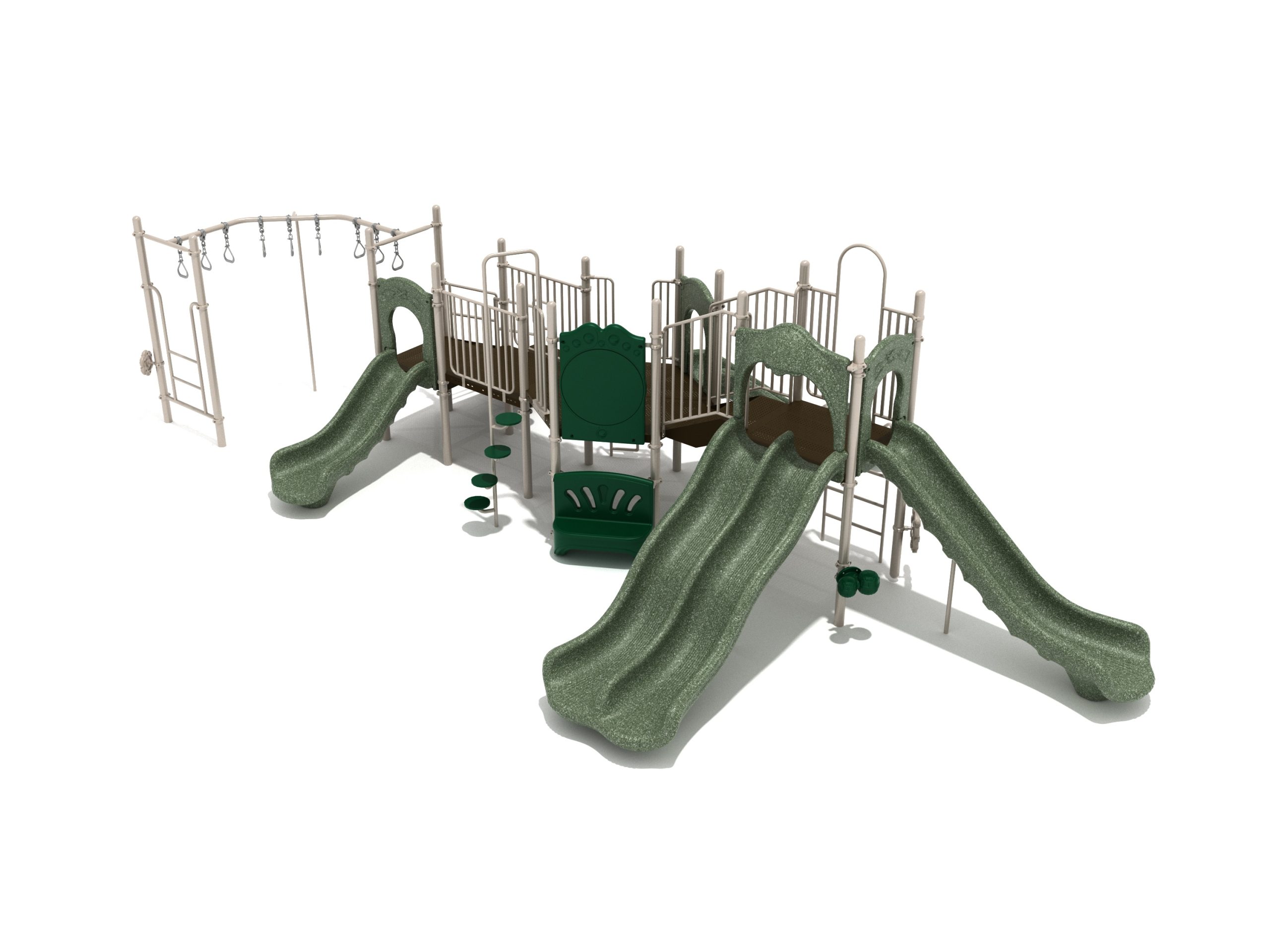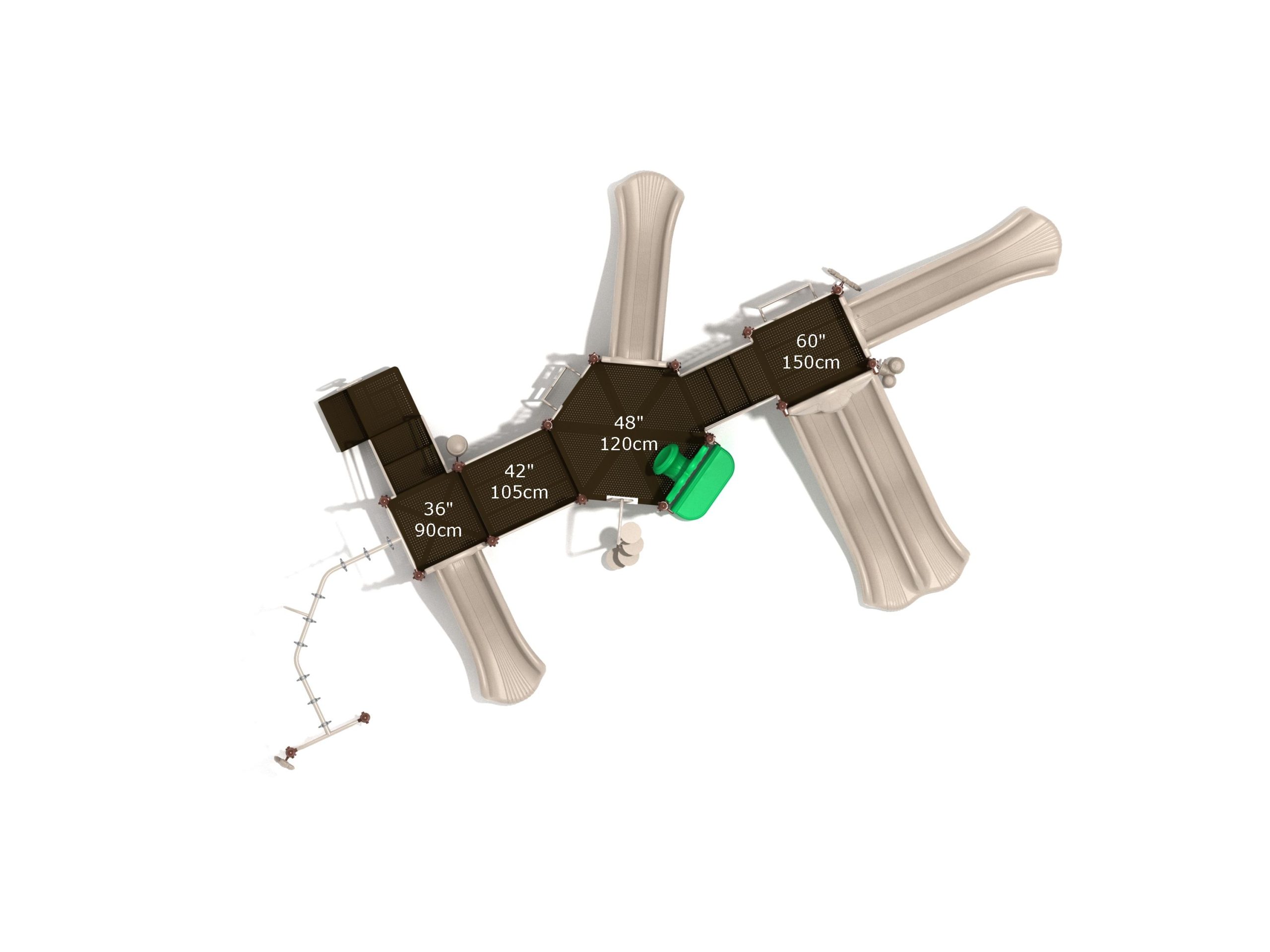 When you install the Santa Monica structure in a playground or public space you’re providing lots of enjoyment for many children of different ages and abilities. Promote physical fitness with a 90 Degree Overhead Swing Ladder accessible by a short Vertical Ladder and watch them use their upper body strength to achieve success. There is a longer Vertical Ladder to access the platform directly, but you can be sure that children will be choosing the more adventurous ways to climb up including the Disk Climber made up of circular footpads of the Zipper Climber which requires some basic hand-eye coordination. Three Straight Slides emerge in different directions which allow children to make decisions about which one they choose, but there’s a Double Wave Slide that every child will want to zip down quickly. Features like the Single Drum, Drum Panel and Bongos add an auditory experience to the structure, and the Rain Wheel and Ship’s Wheel add movement as they spin round and round when touched. A Bench Panel underneath provides an area for respite when kids need to recharge their batteries.