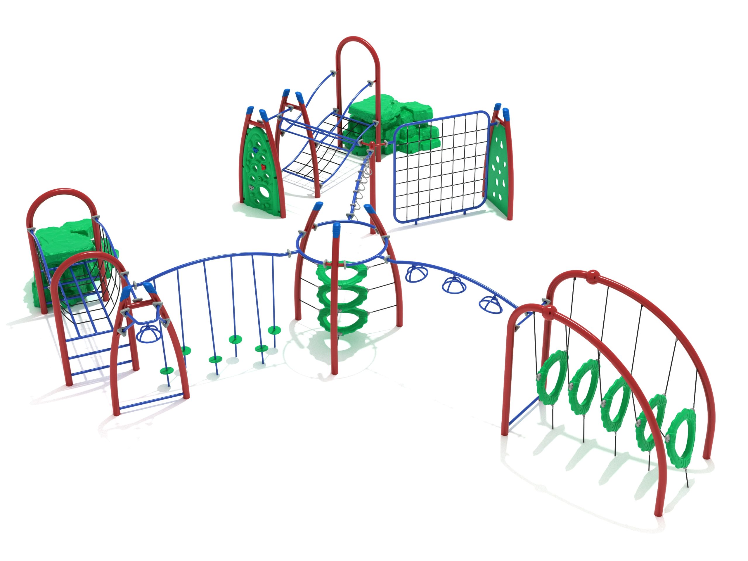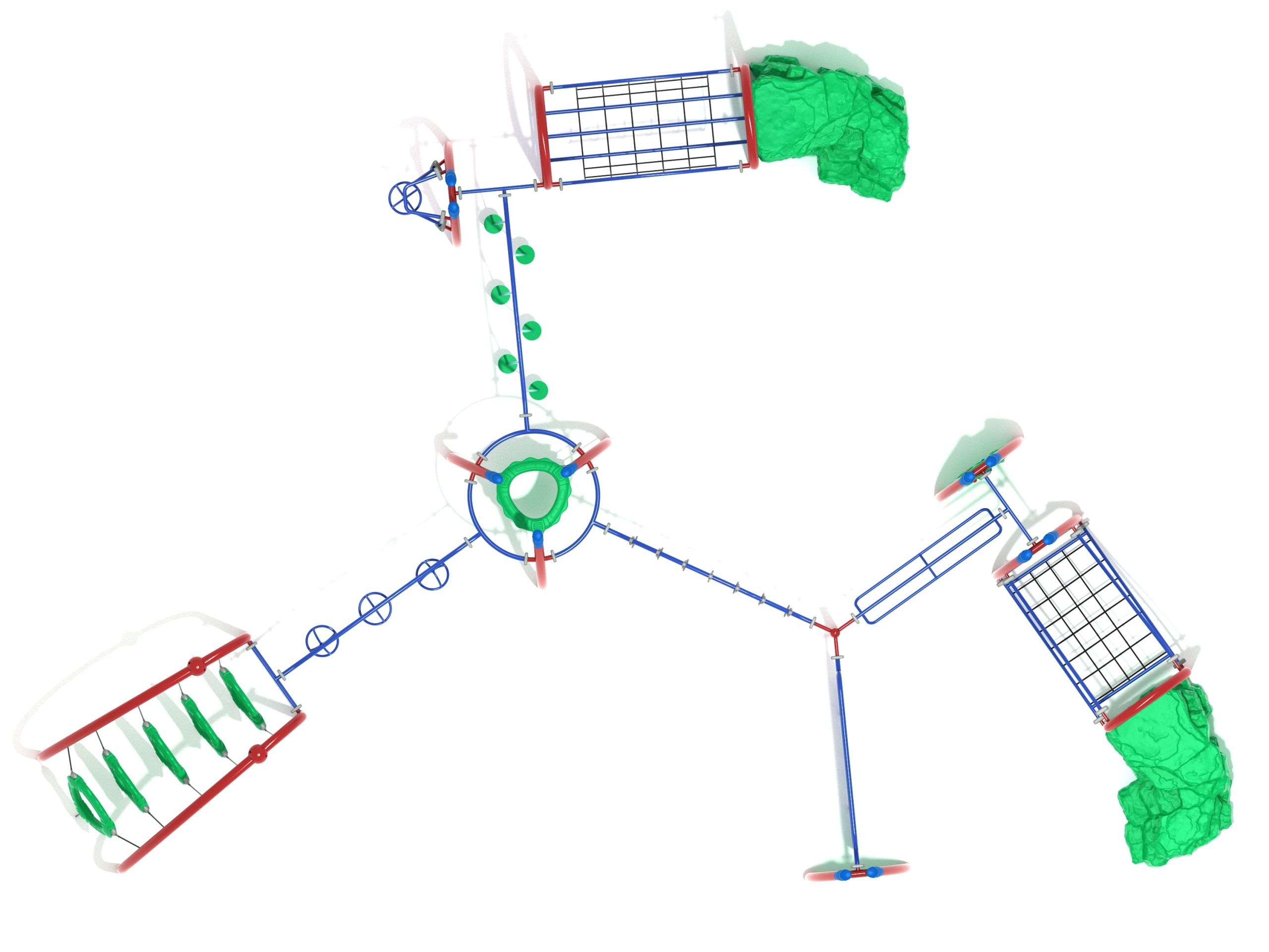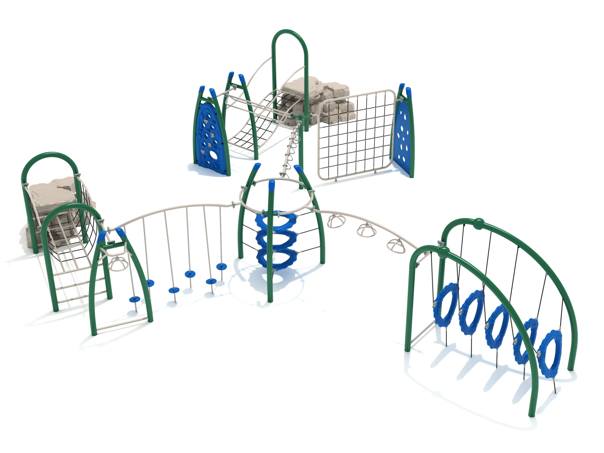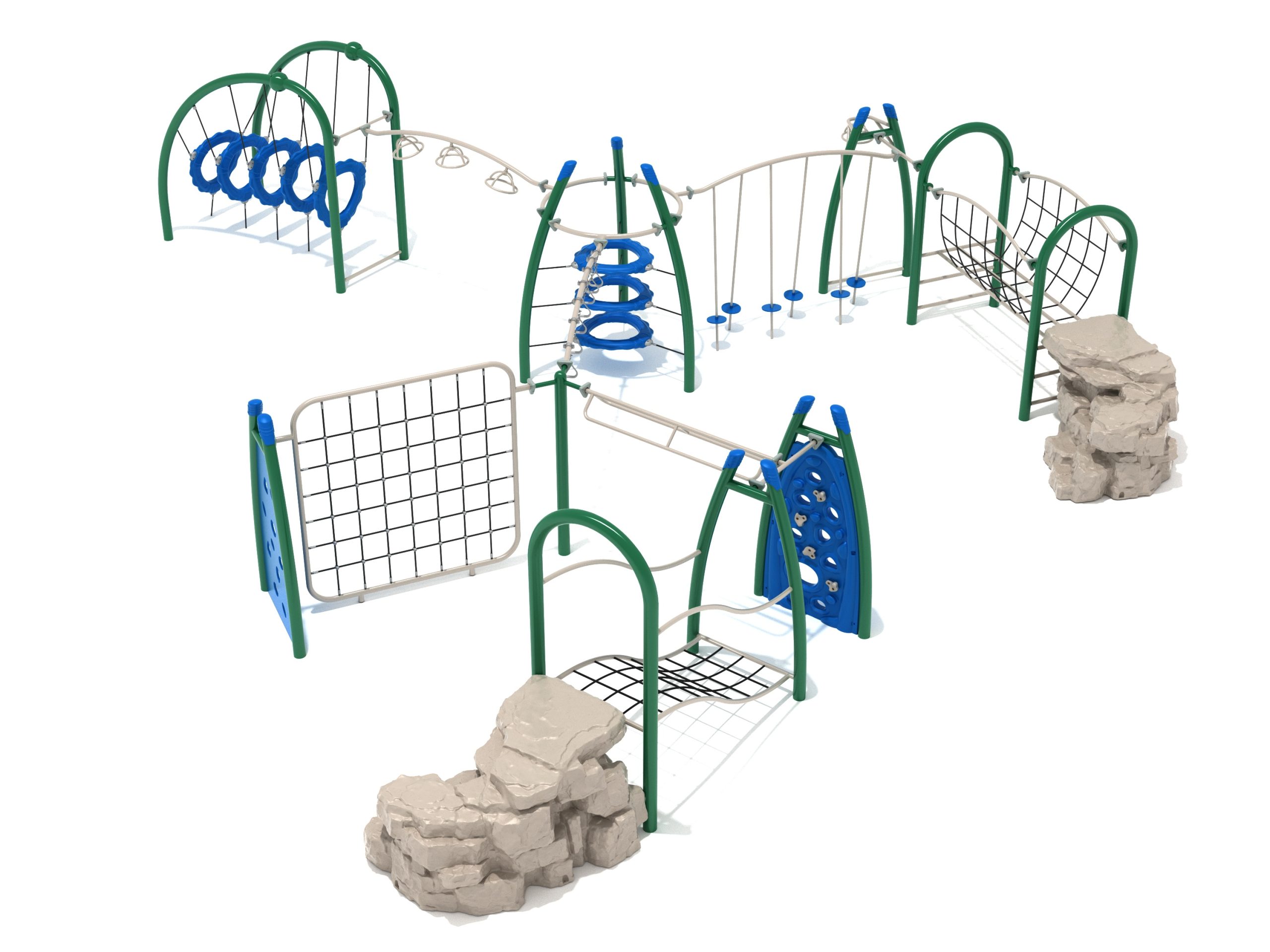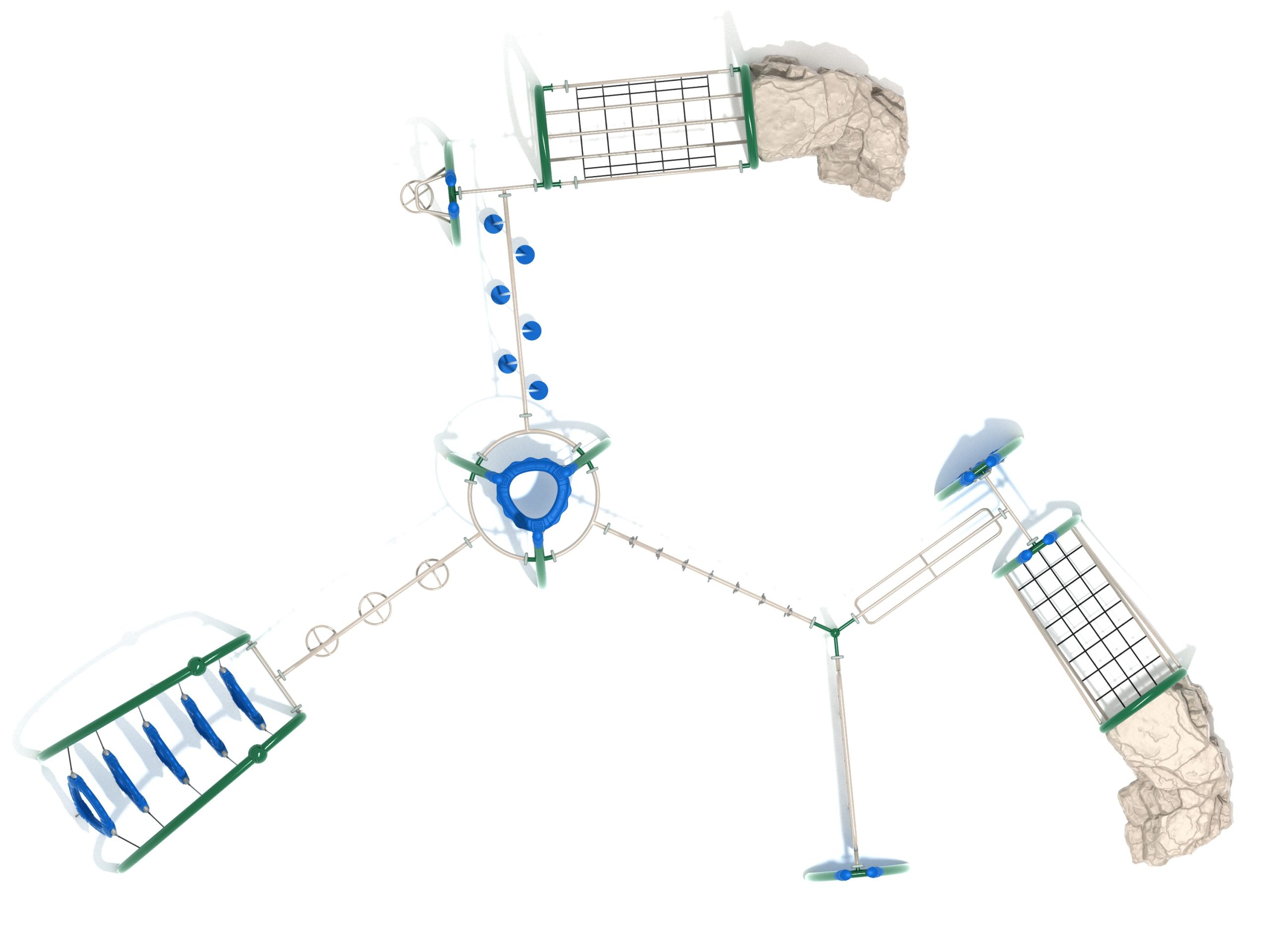 The Silver Star is a huge obstacle course designed especially for kids with so many features packed into one play structure. Promote physical fitness in the playground when you add this to any school or playpark as there are multiple overhead activities to swing on and lots of nets to climb across. Kids can choose from the Overhead Parallel Bar Climber or get dizzy on the 3 Wheel Overhead Spinner which is much harder than it looks. There’s a Floating Tunnel of Rings that kids will find hilarious as they try to wiggle their bodies across it horizontally, and the Tower of Rings provides a challenge of balance and hand-foot coordination. Two Net Bridges offers children a completely different kind of bridge to get across that requires careful foot placement so they don’t fall through a gap. Moving on to the Tilted Lily Pad Bridge provides yet another kind of bridge experience as kids must grab on and work their way across multiple poles to reach the other side. Boulder Climbers are a welcome addition to the play set and kids will love to scramble up their side as if they were scaling a mountain.