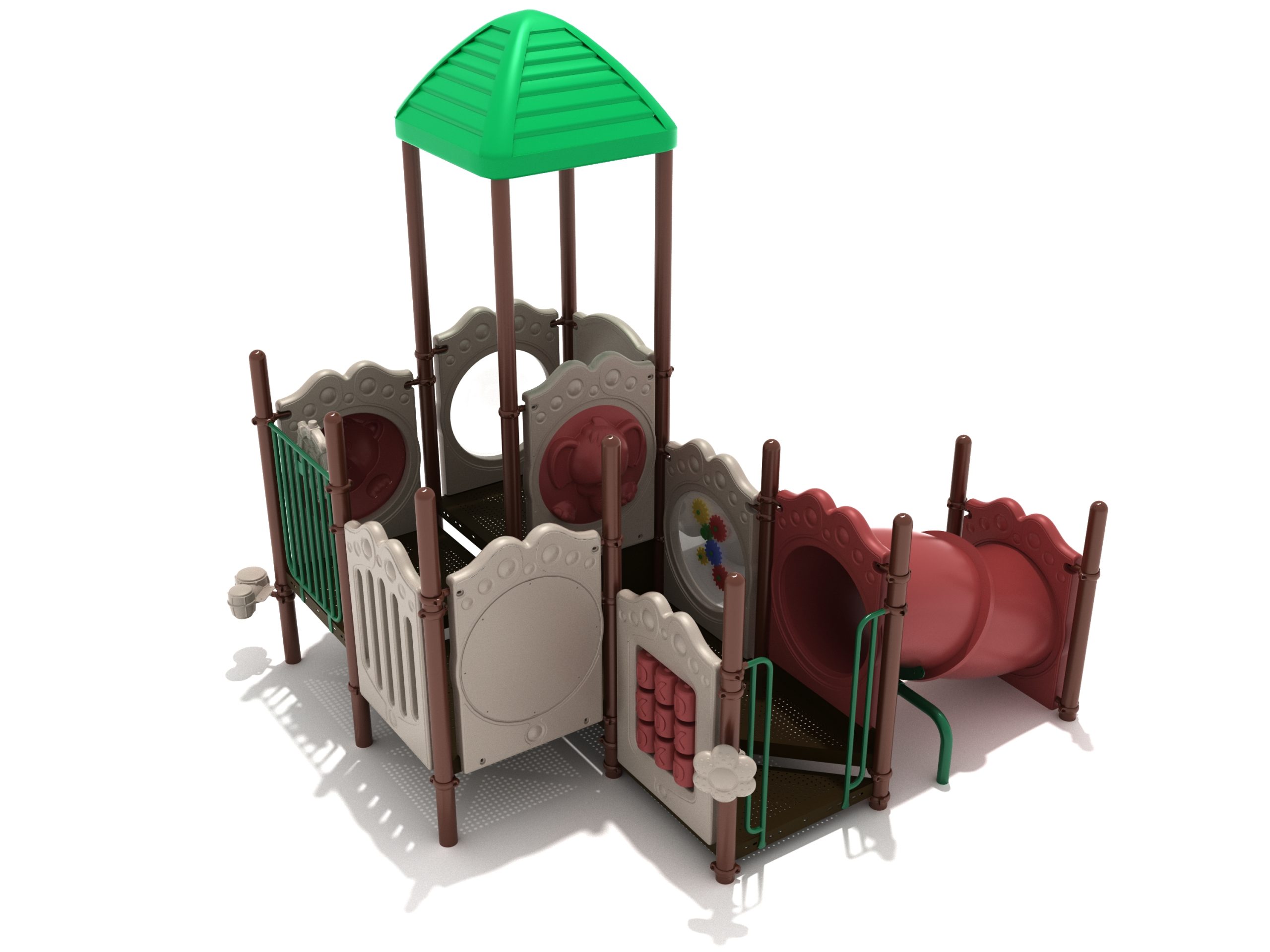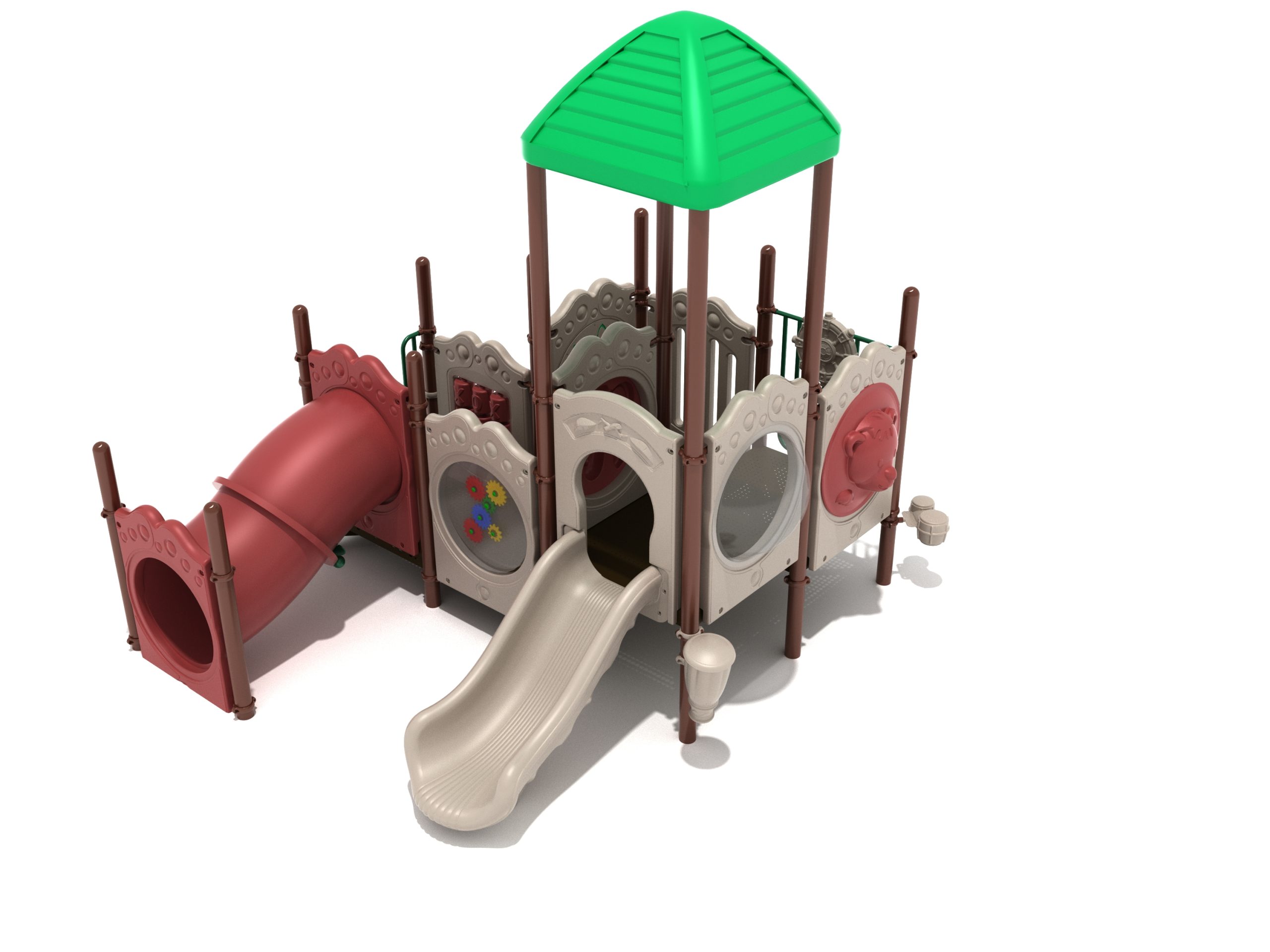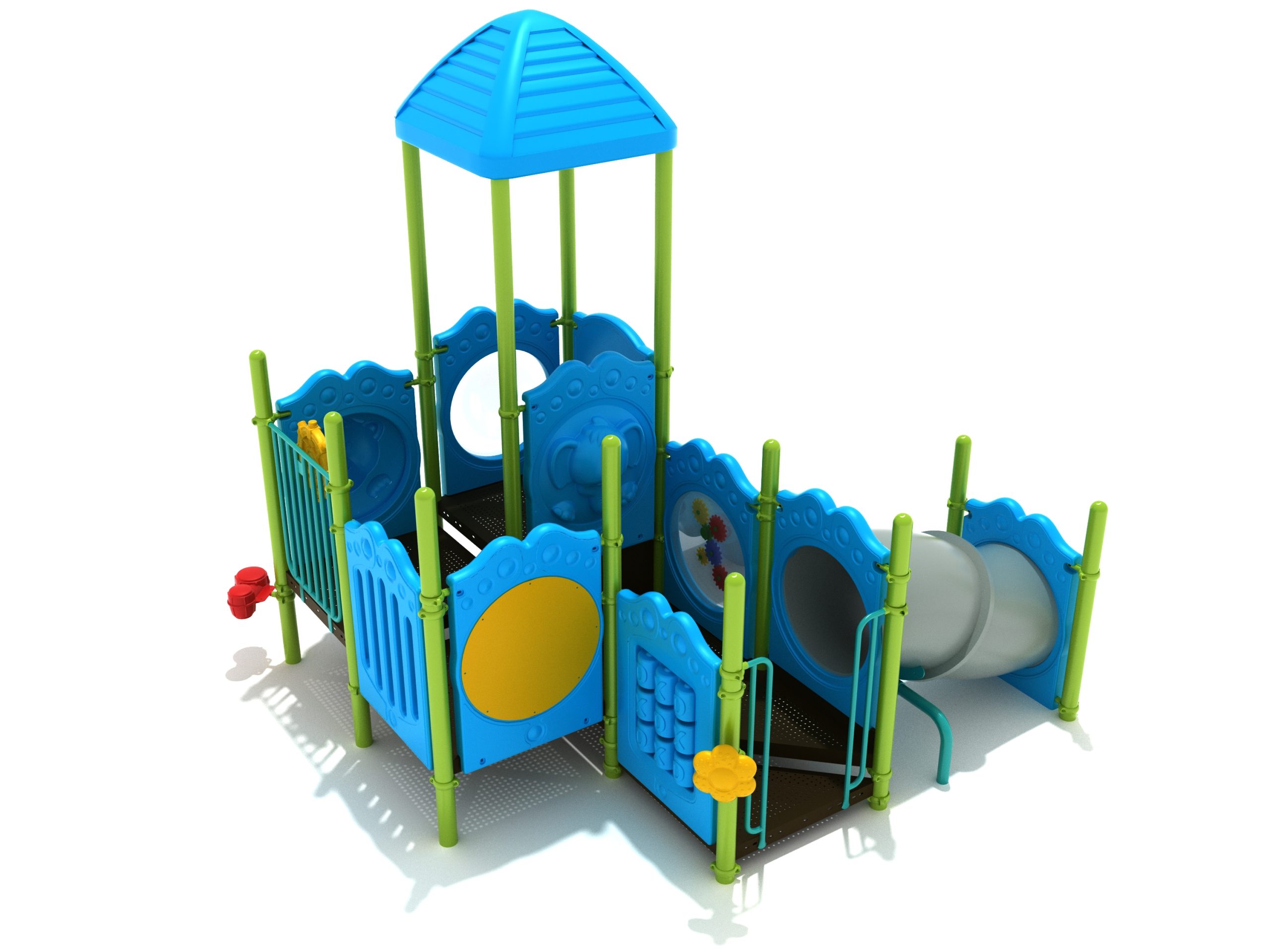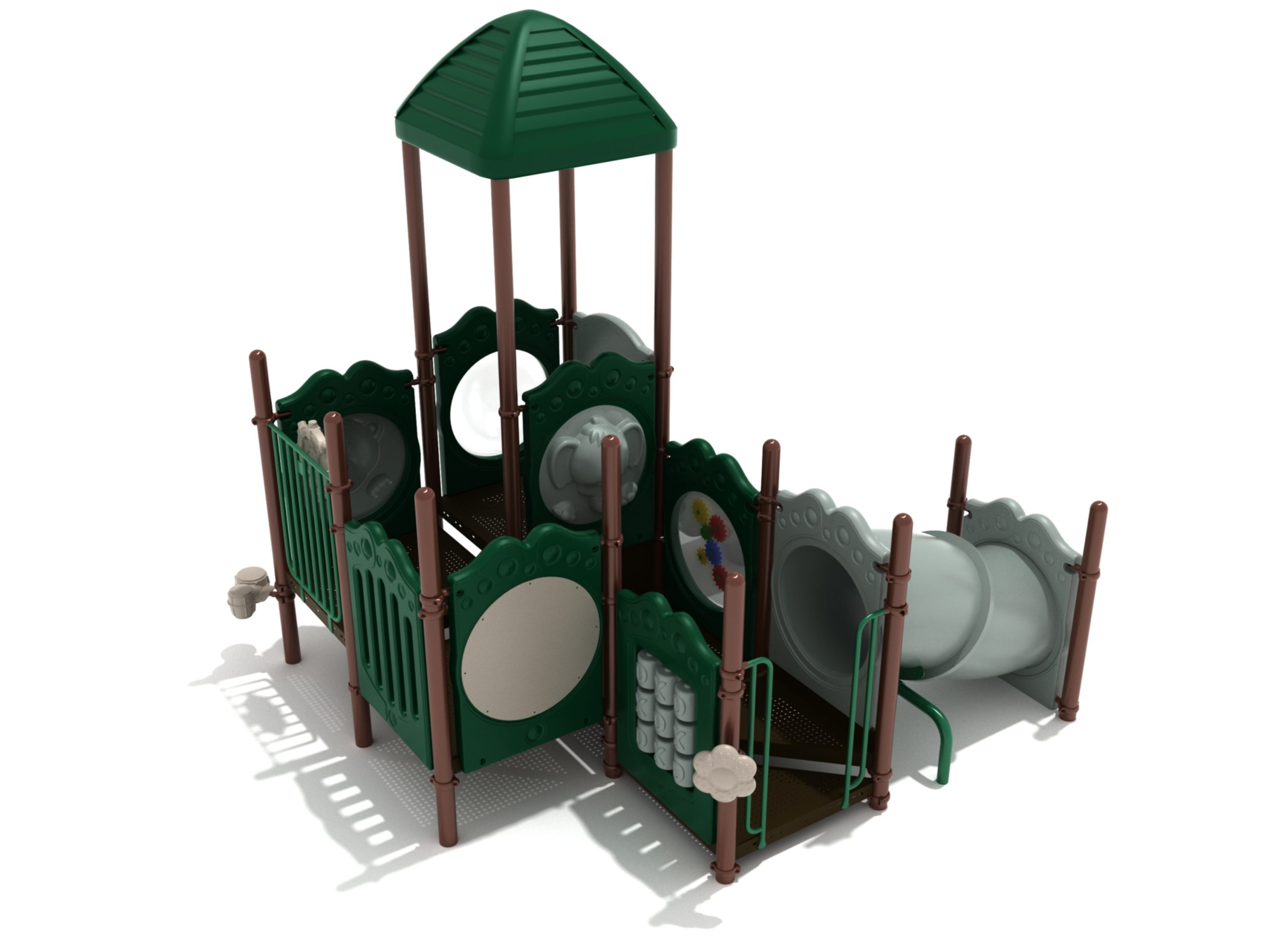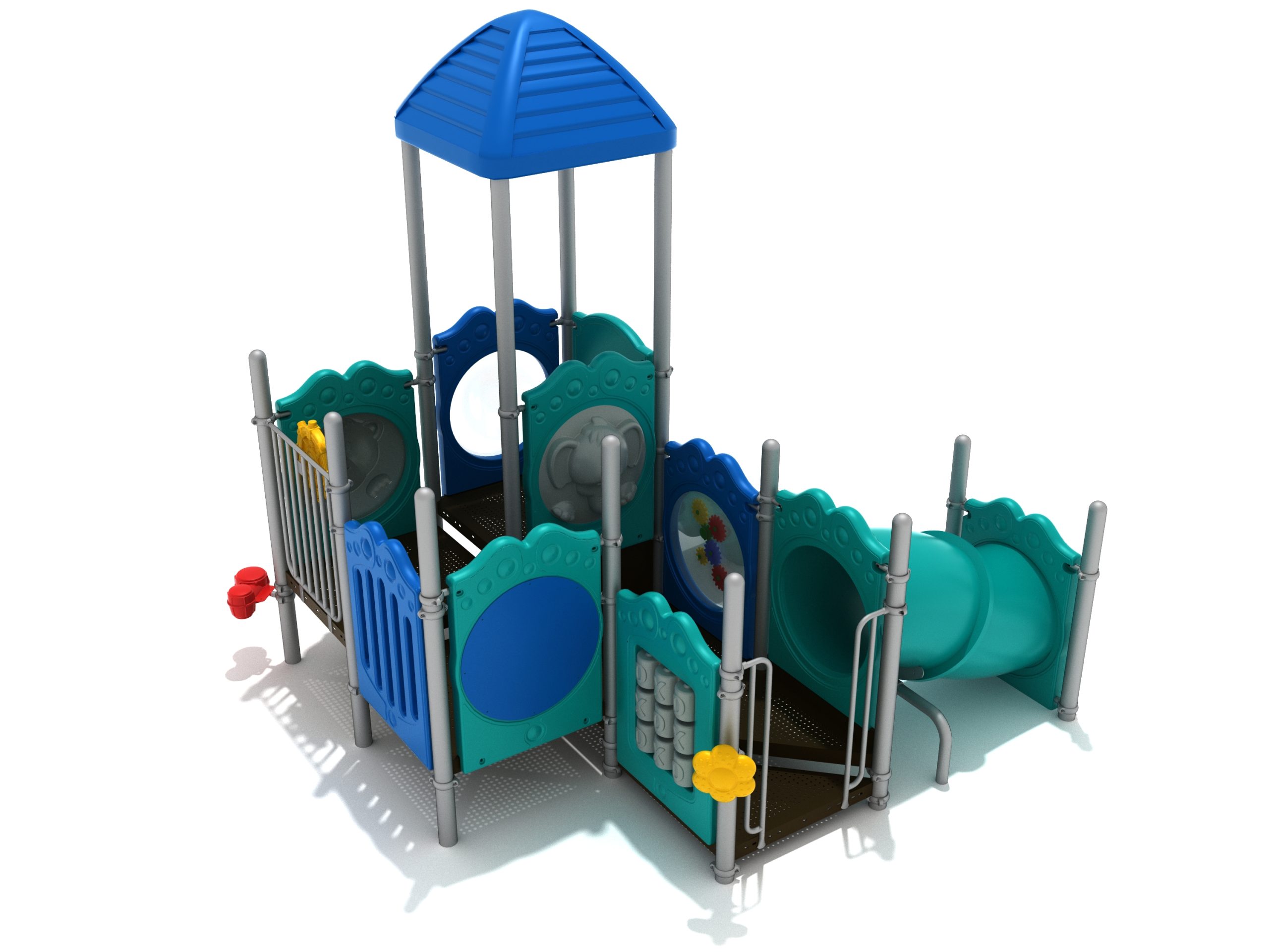 The Stamford play center is jam-packed with interesting features designed to stimulate young minds. From problem-solving on the Tic Tac Toe Panel and Maze Panel to giggling at the Bear Panel and Elephant Panel which feature cute characters, children will love to explore this structure on their own or with an adult as the sides are low enough to reach over and keep an eye on them. There’s a Metal Barrier with Ship’s Wheel attached which spins around to steer the fun in any creative way they want, and kids who love music will be drawn to features like the Rain Wheel, Bongos and Single Drum. There’s an Incline Tube Bridge to encourage crawling and you can pop your head out at the other end to give them a surprise as they pass through. A Straight Slide leads down from the main platform, but before they do you can guarantee they’re going to want a quick game of peek-a-boo at the Bubble Panel window.