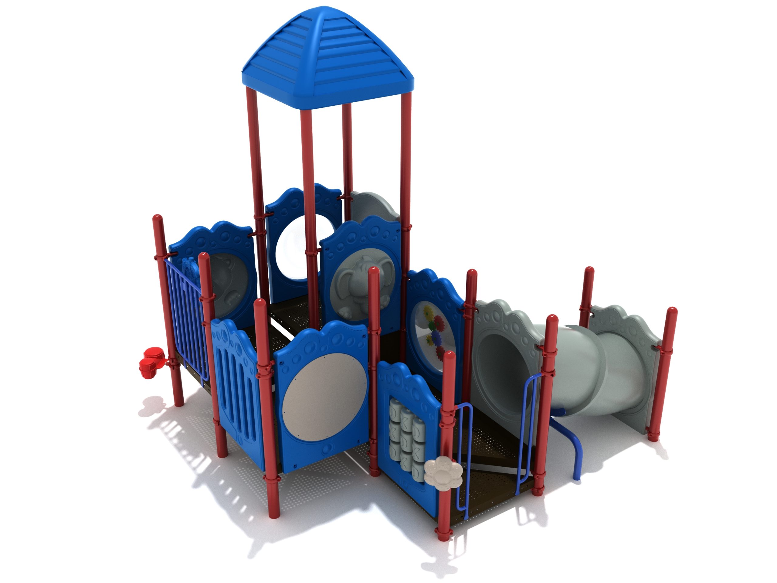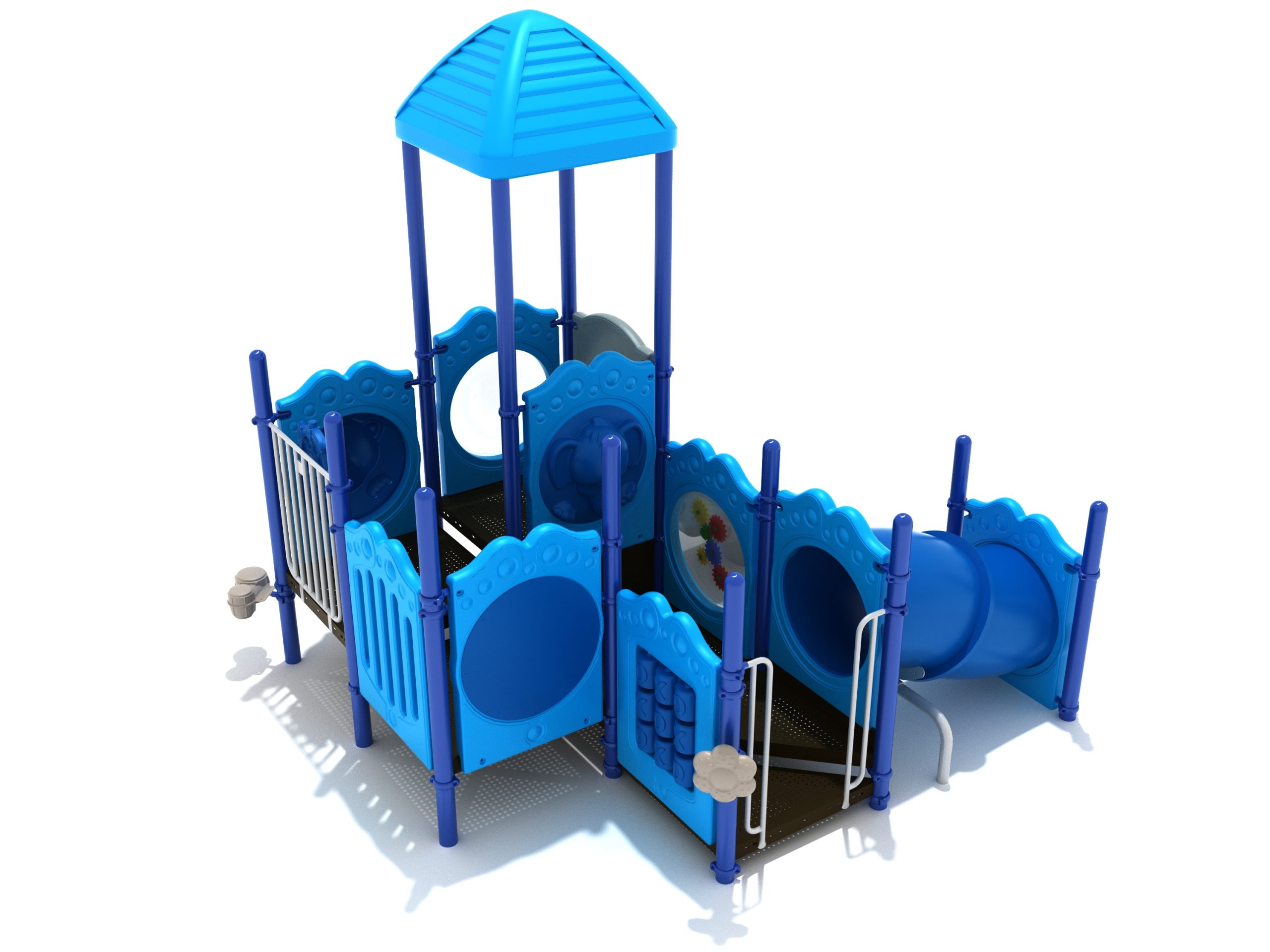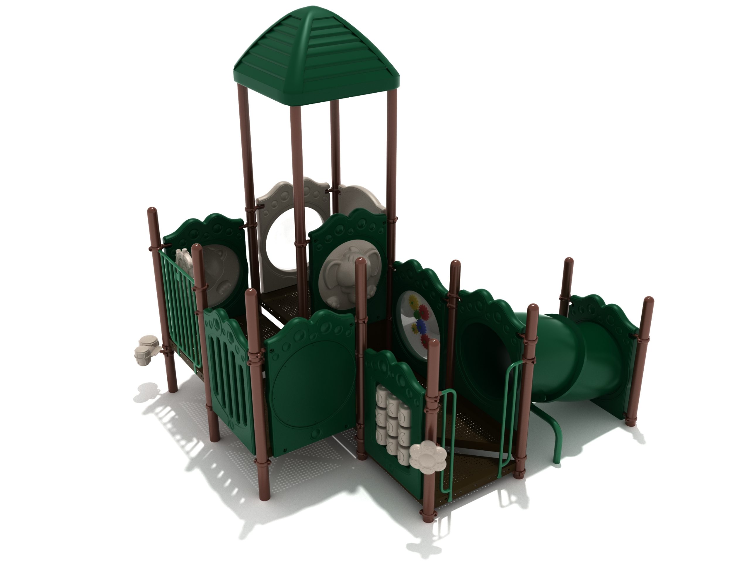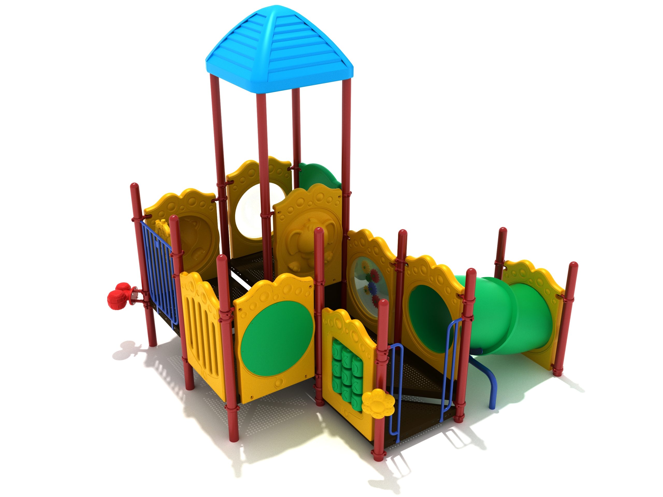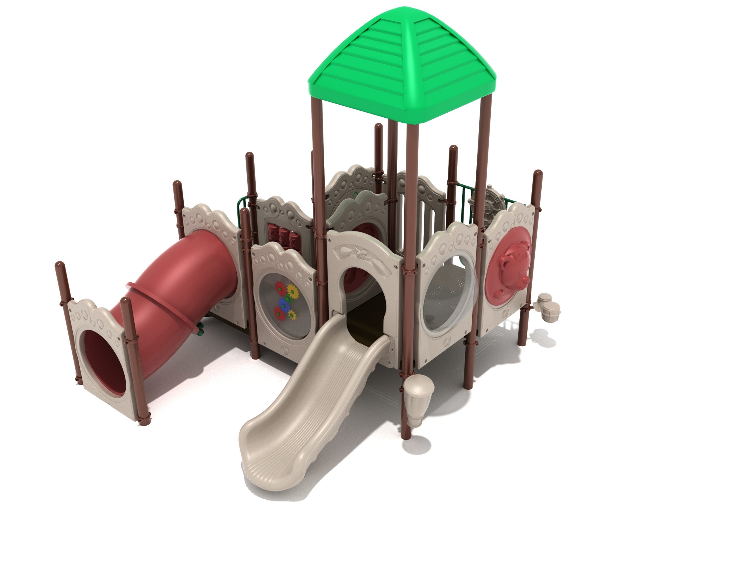 The Stamford play center is jam-packed with interesting features designed to stimulate young minds. From problem-solving on the Tic Tac Toe Panel and Maze Panel to giggling at the Bear Panel and Elephant Panel which feature cute characters, children will love to explore this structure on their own or with an adult as the sides are low enough to reach over and keep an eye on them. There’s a Metal Barrier with Ship’s Wheel attached which spins around to steer the fun in any creative way they want, and kids who love music will be drawn to features like the Rain Wheel, Bongos and Single Drum. There’s an Incline Tube Bridge to encourage crawling and you can pop your head out at the other end to give them a surprise as they pass through. A Straight Slide leads down from the main platform, but before they do you can guarantee they’re going to want a quick game of peek-a-boo at the Bubble Panel window.