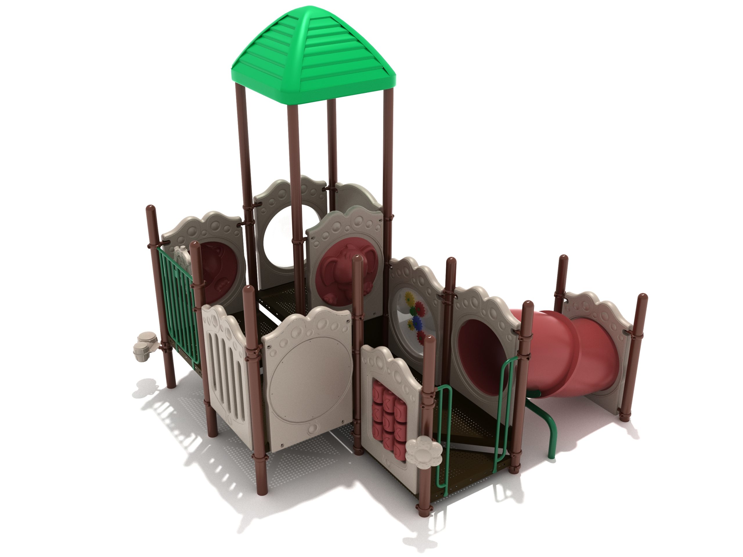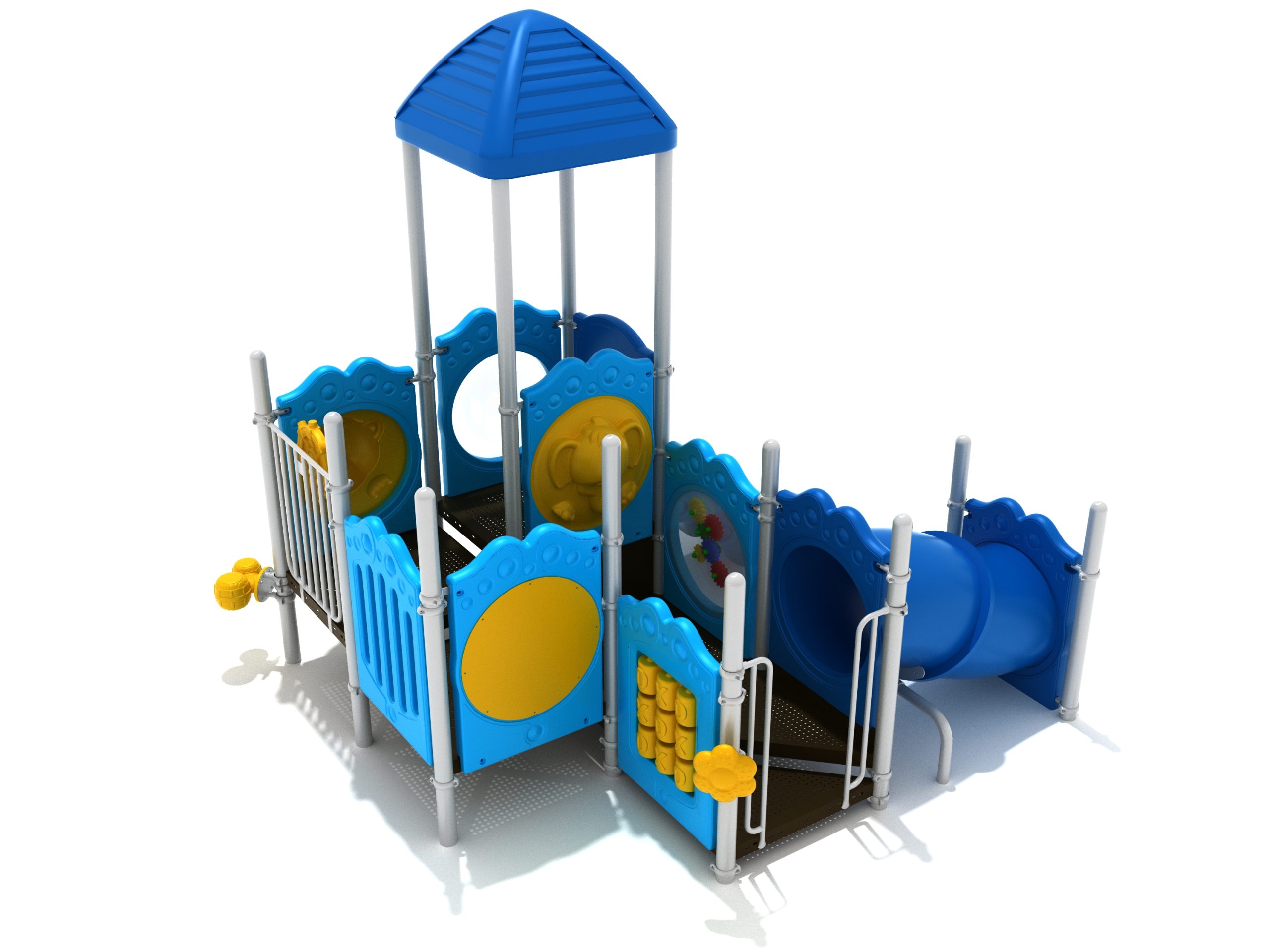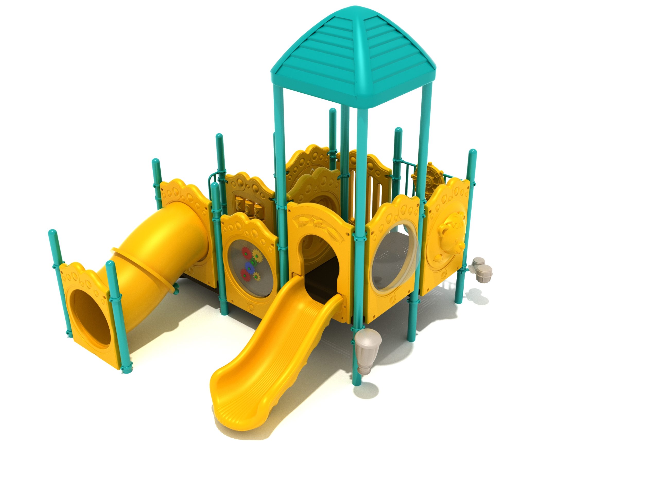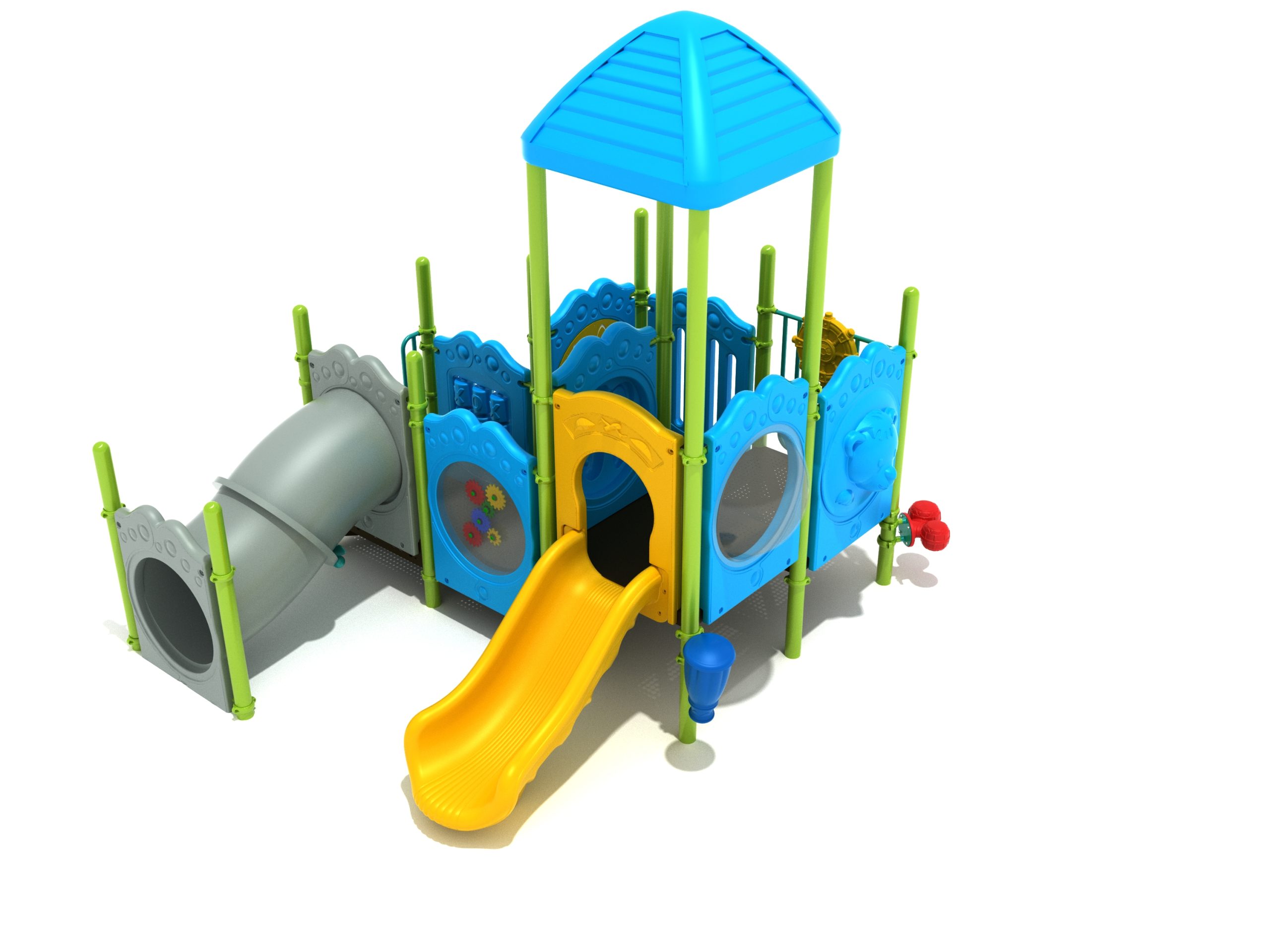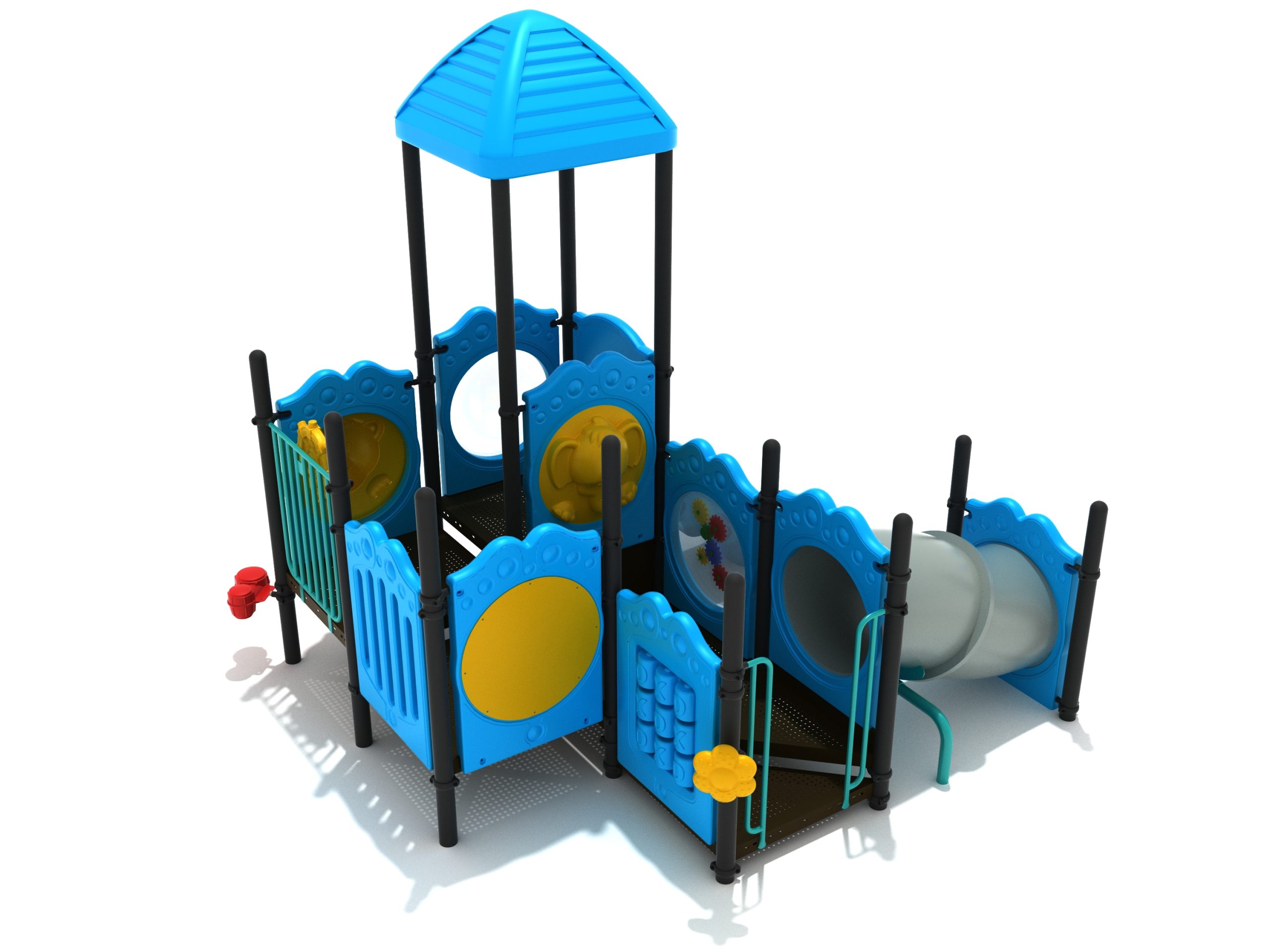 The Stamford play center is jam-packed with interesting features designed to stimulate young minds. From problem-solving on the Tic Tac Toe Panel and Maze Panel to giggling at the Bear Panel and Elephant Panel which feature cute characters, children will love to explore this structure on their own or with an adult as the sides are low enough to reach over and keep an eye on them. There’s a Metal Barrier with Ship’s Wheel attached which spins around to steer the fun in any creative way they want, and kids who love music will be drawn to features like the Rain Wheel, Bongos and Single Drum. There’s an Incline Tube Bridge to encourage crawling and you can pop your head out at the other end to give them a surprise as they pass through. A Straight Slide leads down from the main platform, but before they do you can guarantee they’re going to want a quick game of peek-a-boo at the Bubble Panel window.