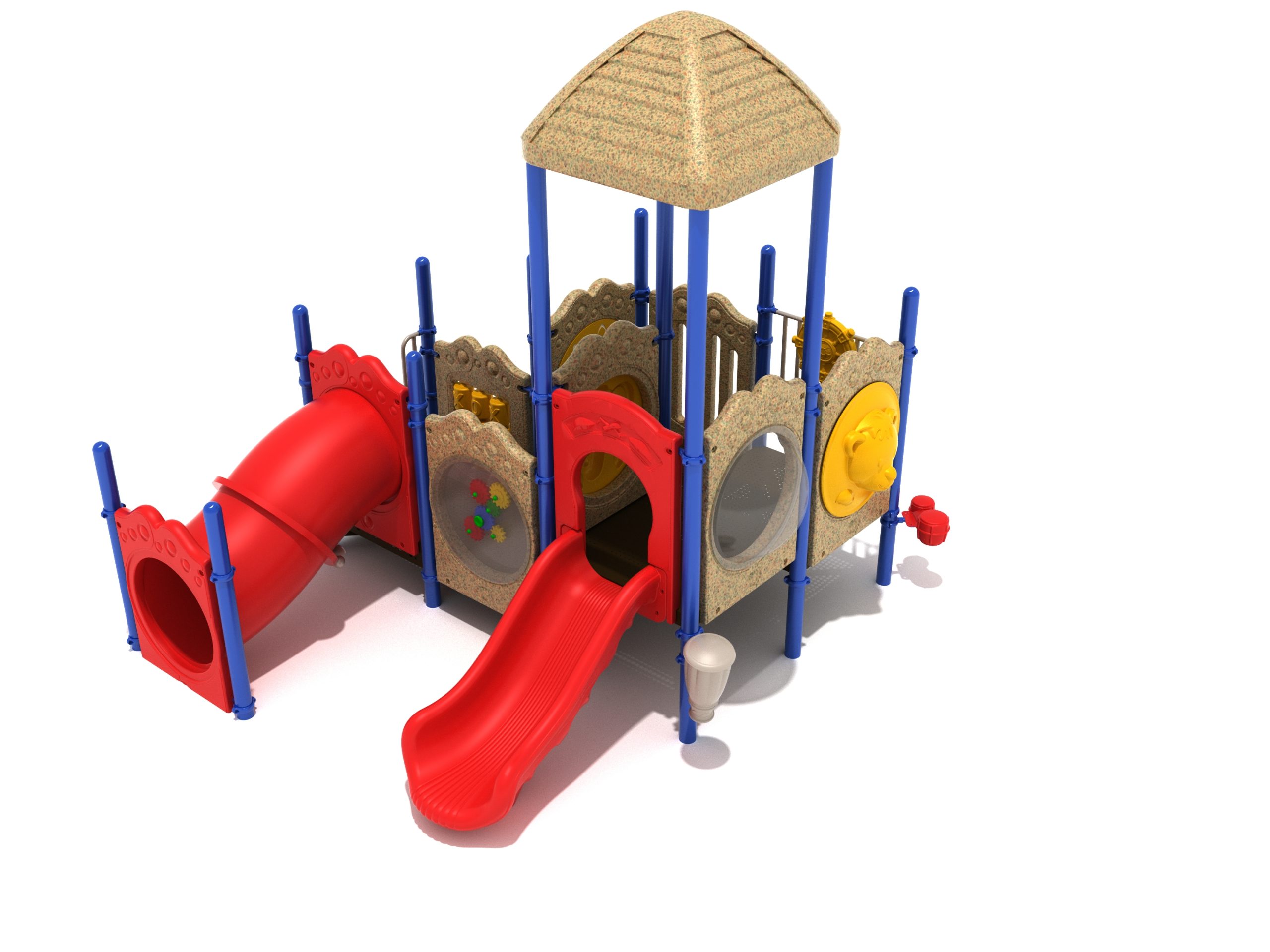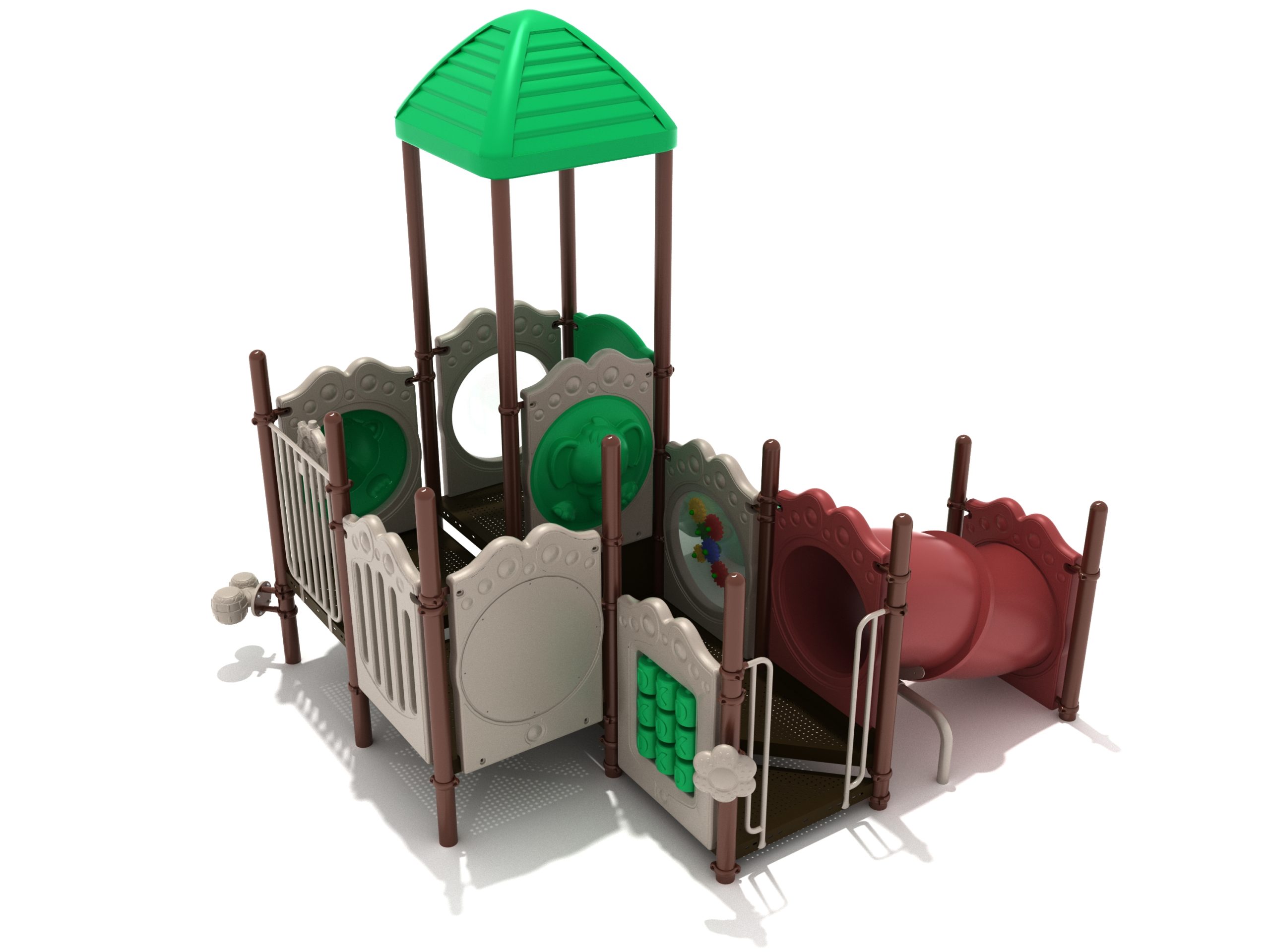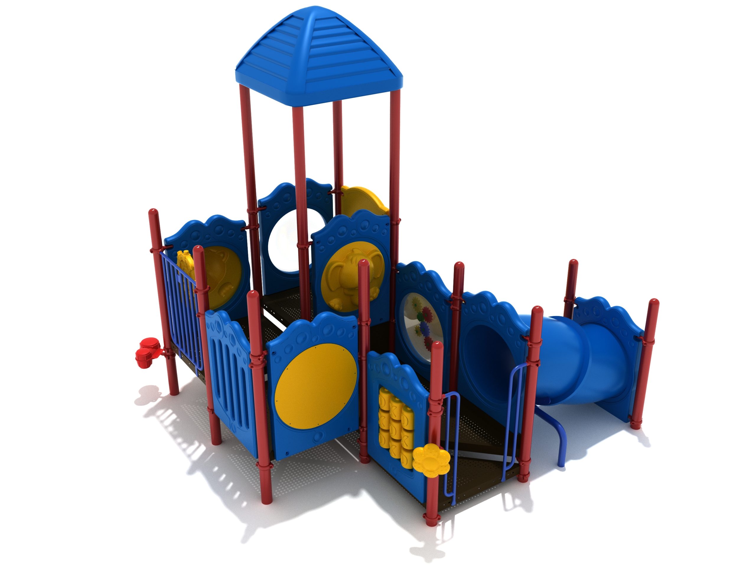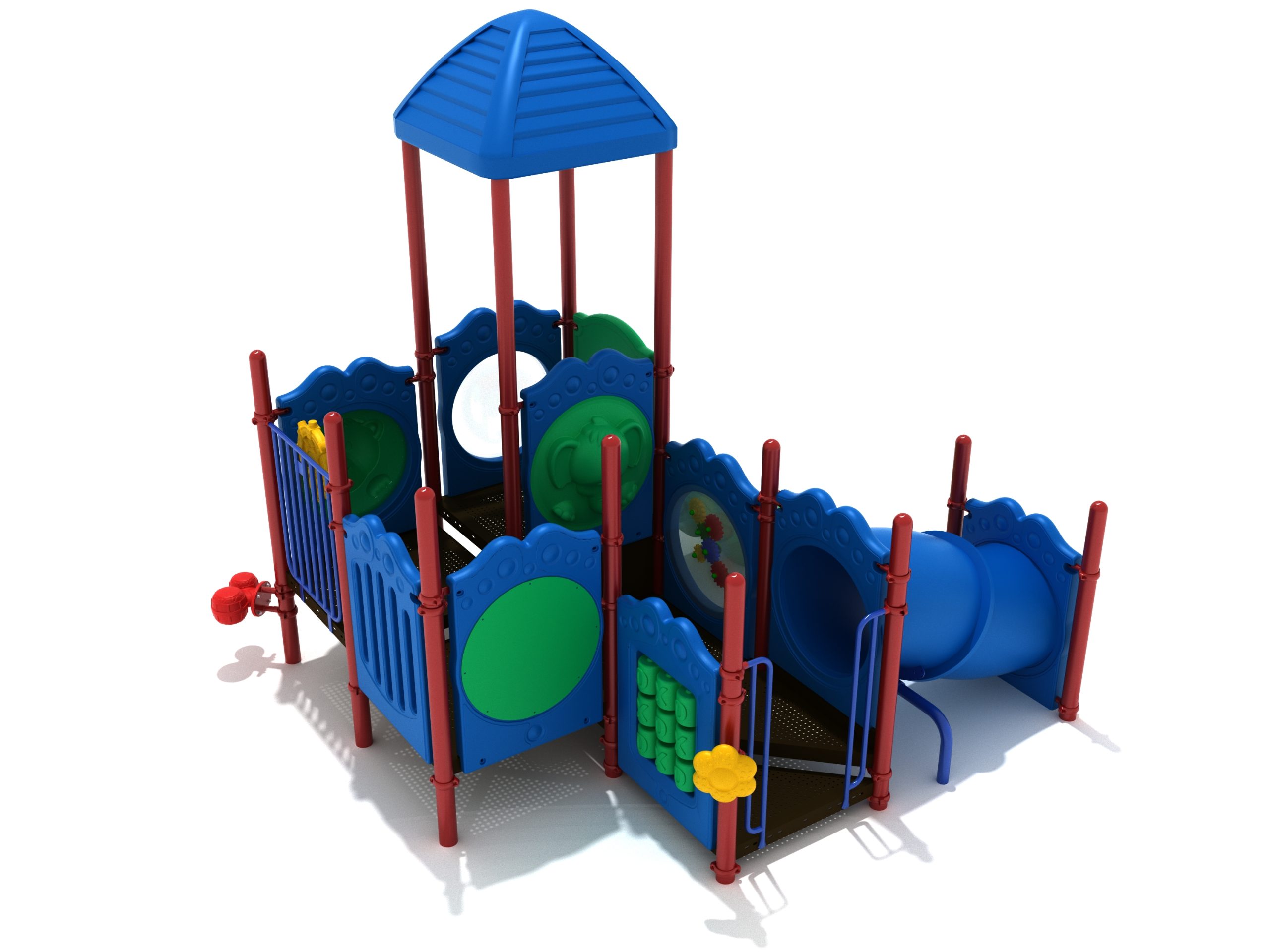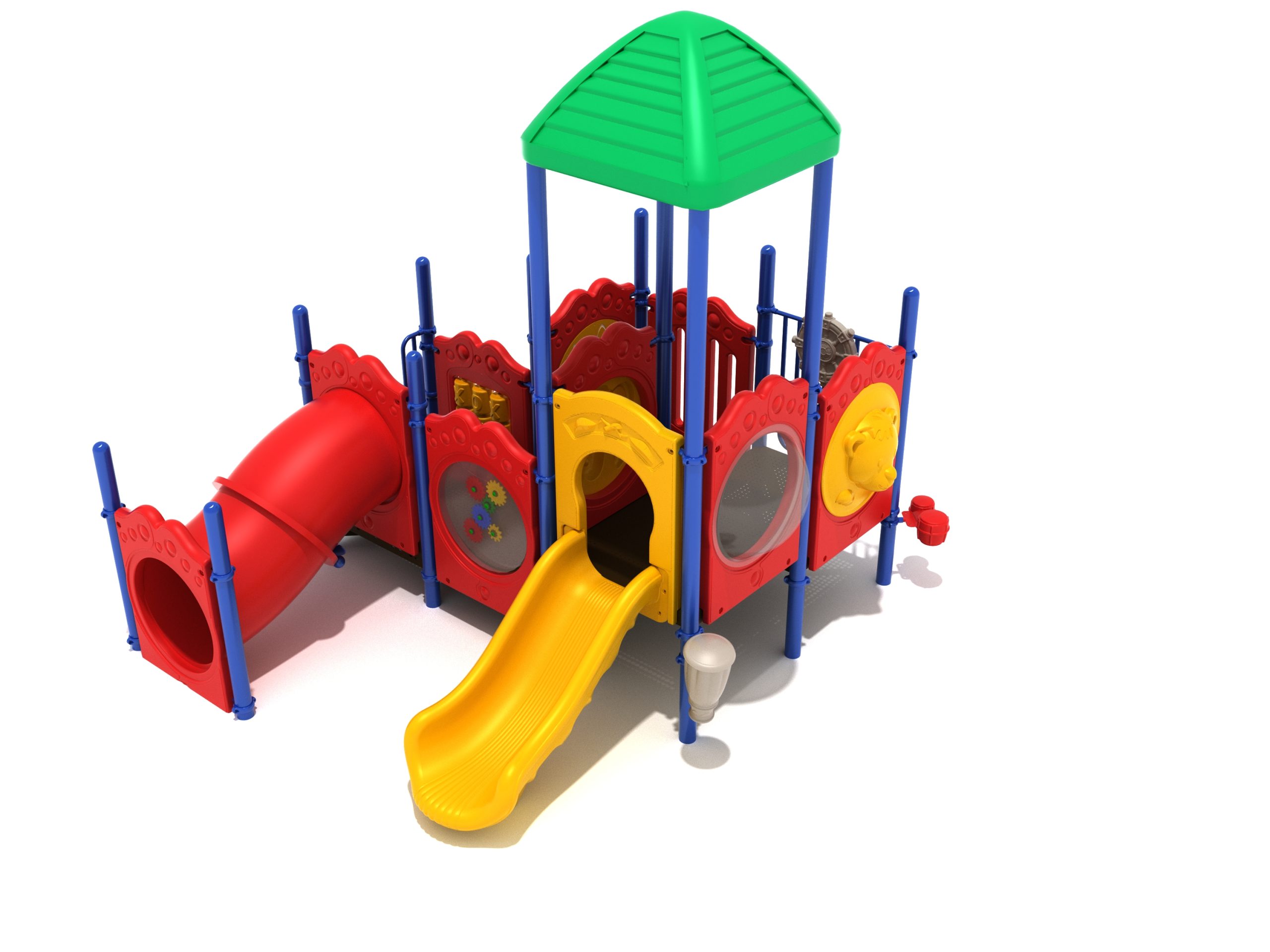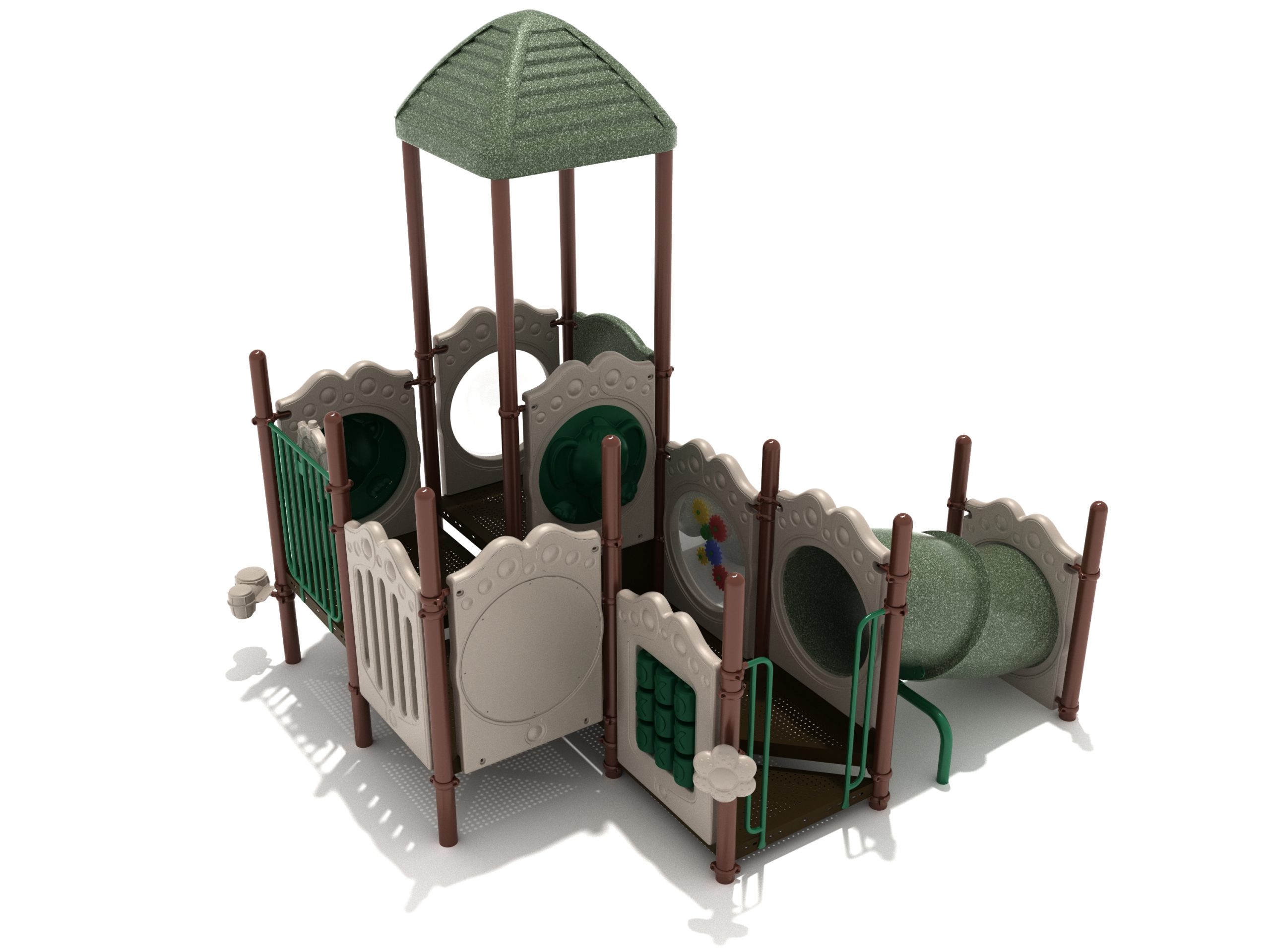 The Stamford play center is jam-packed with interesting features designed to stimulate young minds. From problem-solving on the Tic Tac Toe Panel and Maze Panel to giggling at the Bear Panel and Elephant Panel which feature cute characters, children will love to explore this structure on their own or with an adult as the sides are low enough to reach over and keep an eye on them. There’s a Metal Barrier with Ship’s Wheel attached which spins around to steer the fun in any creative way they want, and kids who love music will be drawn to features like the Rain Wheel, Bongos and Single Drum. There’s an Incline Tube Bridge to encourage crawling and you can pop your head out at the other end to give them a surprise as they pass through. A Straight Slide leads down from the main platform, but before they do you can guarantee they’re going to want a quick game of peek-a-boo at the Bubble Panel window.
