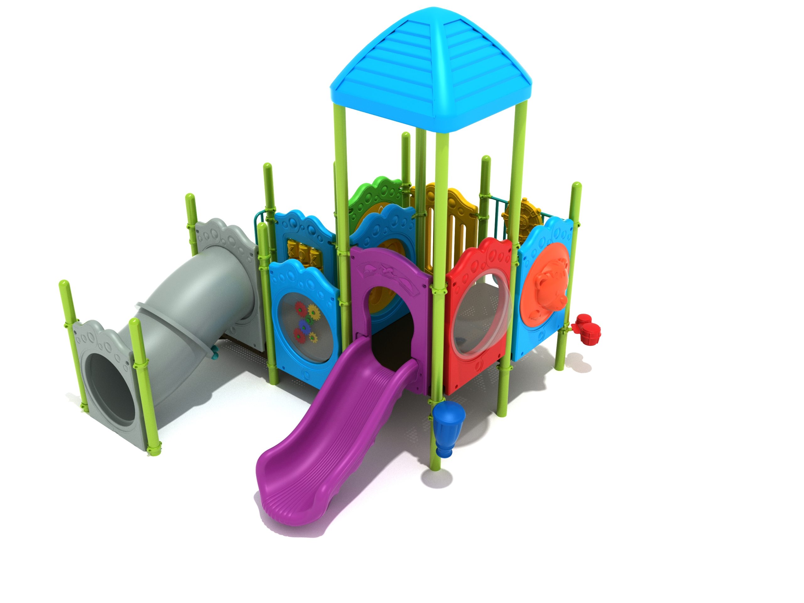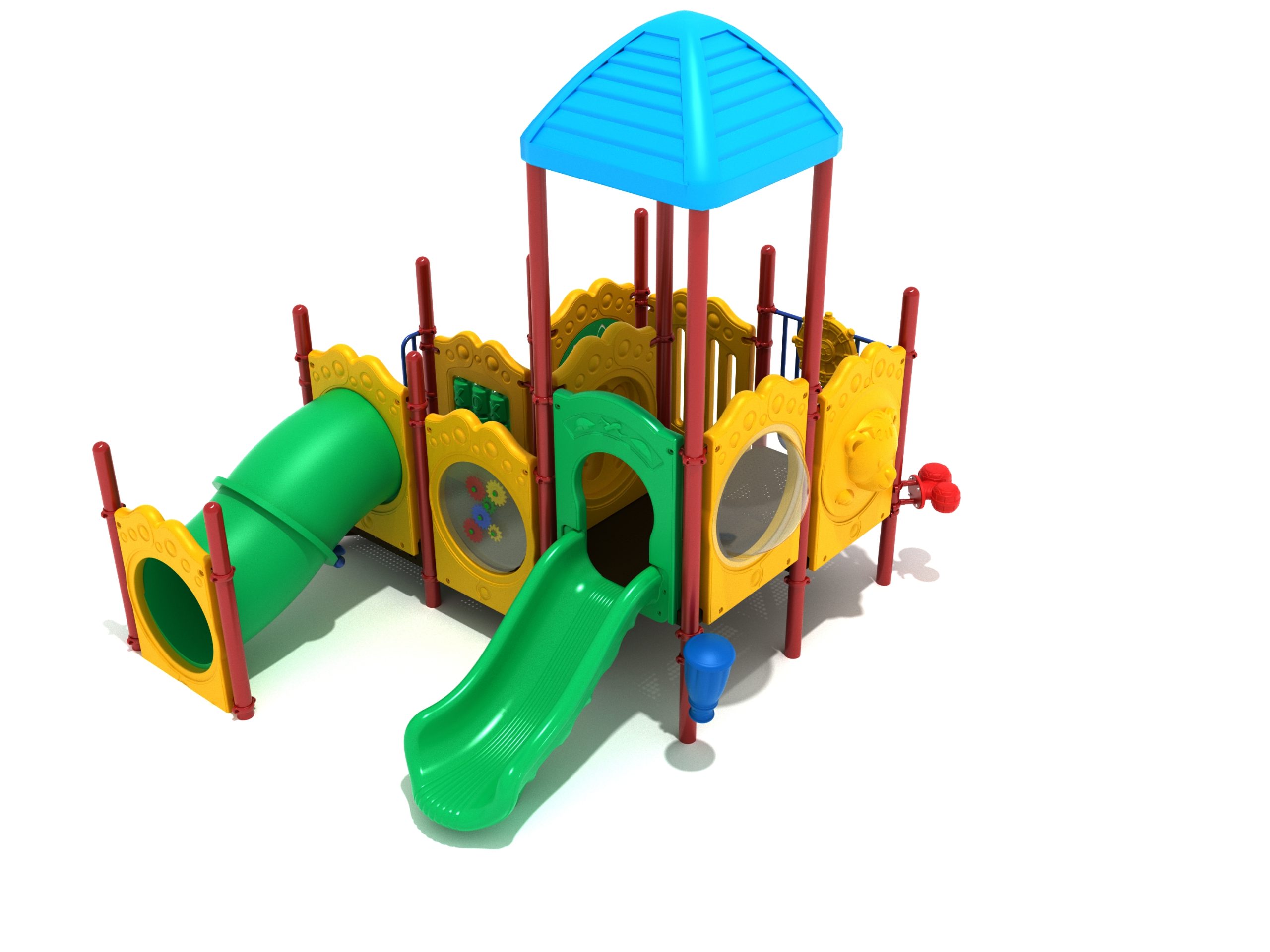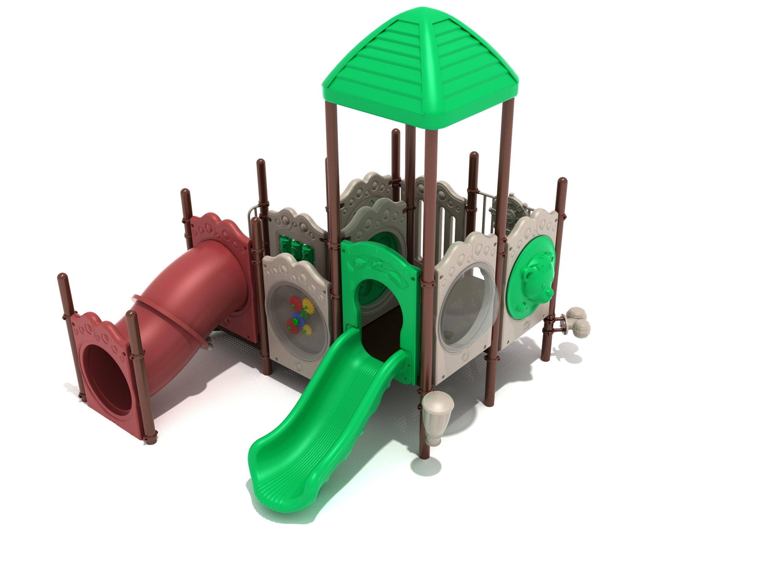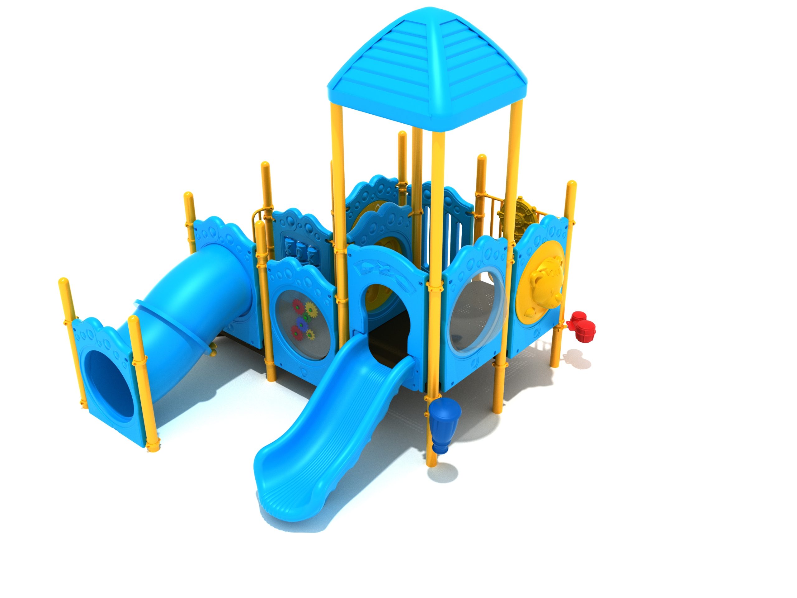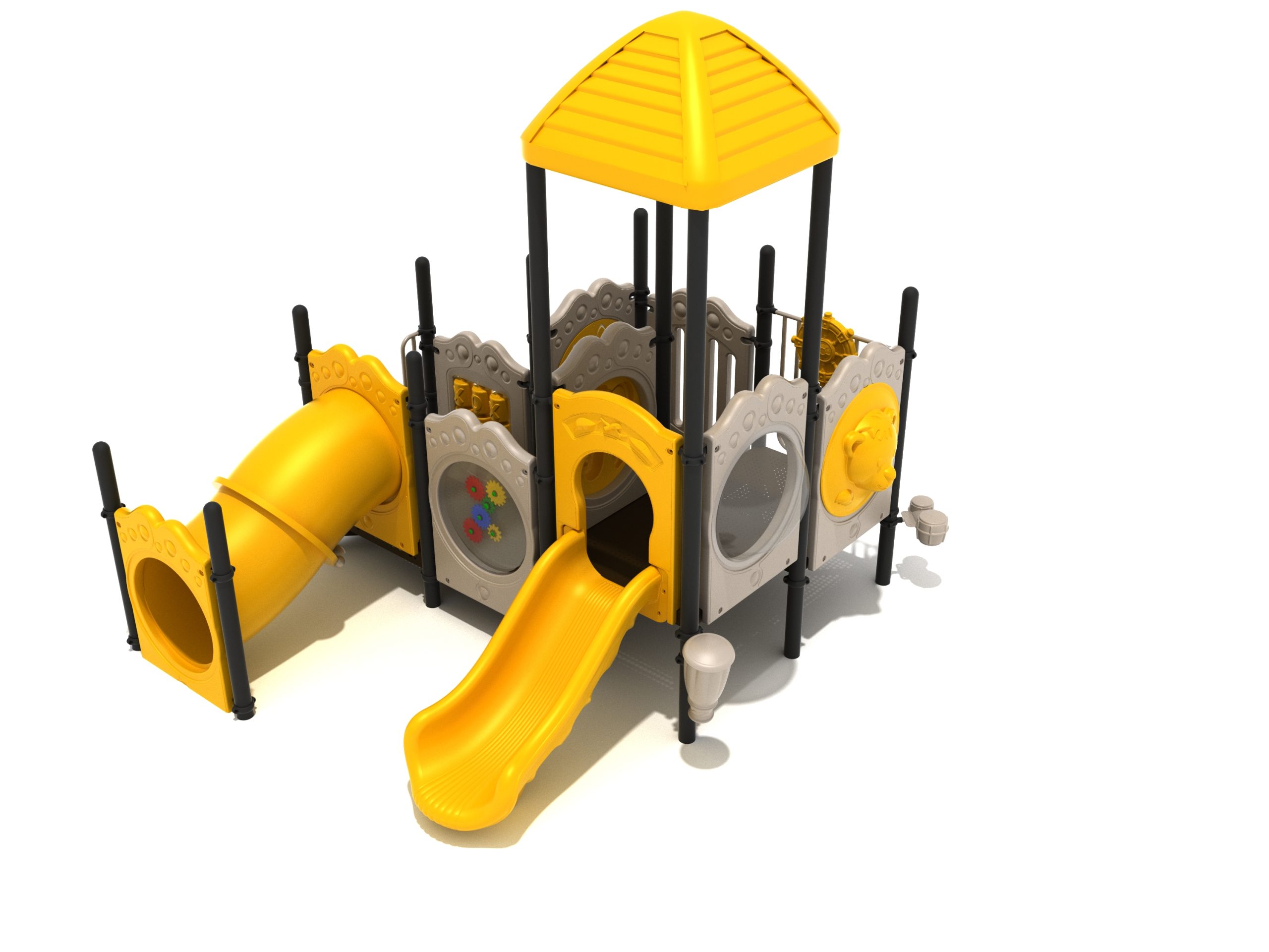 The Stamford play center is jam-packed with interesting features designed to stimulate young minds. From problem-solving on the Tic Tac Toe Panel and Maze Panel to giggling at the Bear Panel and Elephant Panel which feature cute characters, children will love to explore this structure on their own or with an adult as the sides are low enough to reach over and keep an eye on them. There’s a Metal Barrier with Ship’s Wheel attached which spins around to steer the fun in any creative way they want, and kids who love music will be drawn to features like the Rain Wheel, Bongos and Single Drum. There’s an Incline Tube Bridge to encourage crawling and you can pop your head out at the other end to give them a surprise as they pass through. A Straight Slide leads down from the main platform, but before they do you can guarantee they’re going to want a quick game of peek-a-boo at the Bubble Panel window.