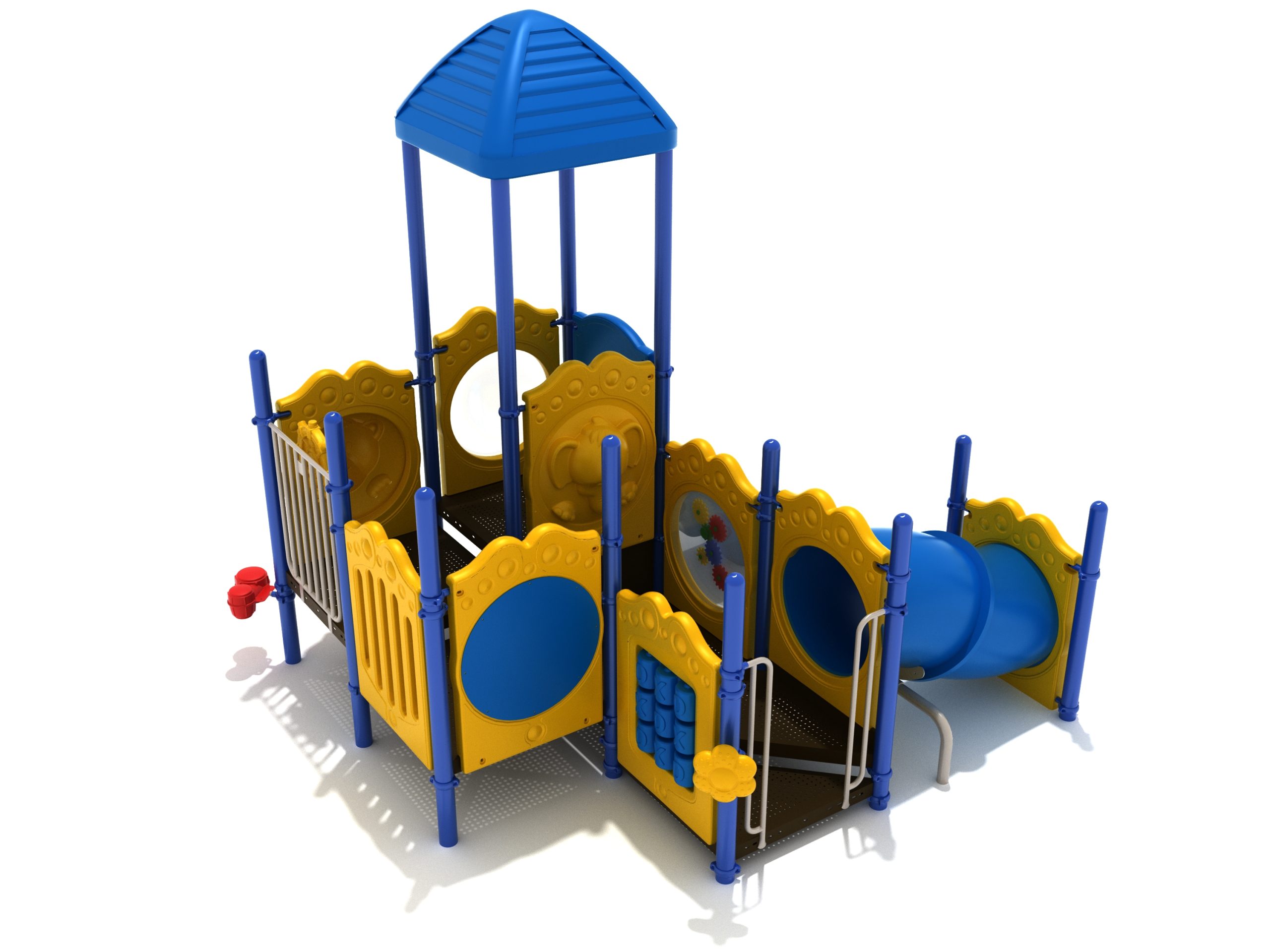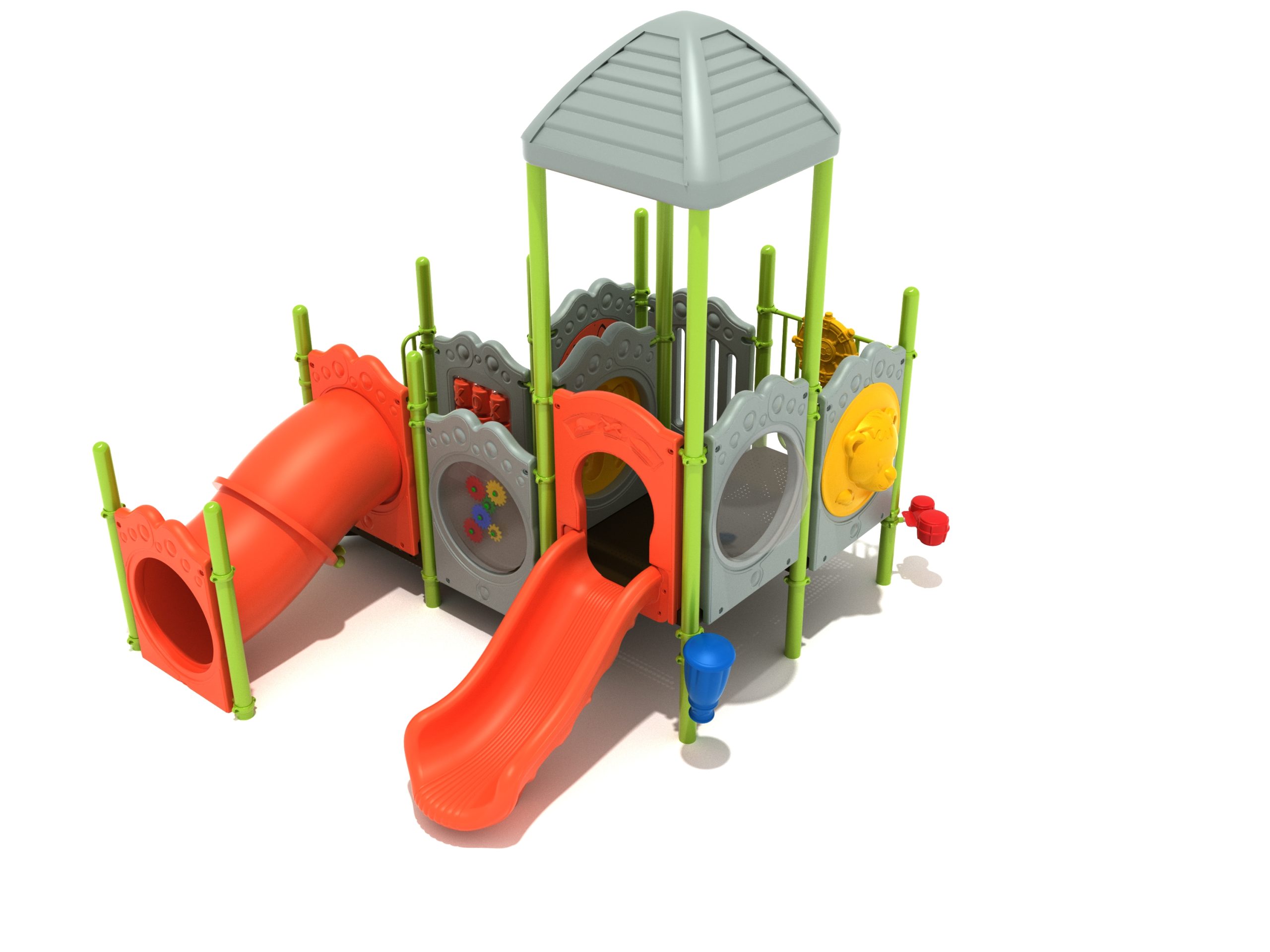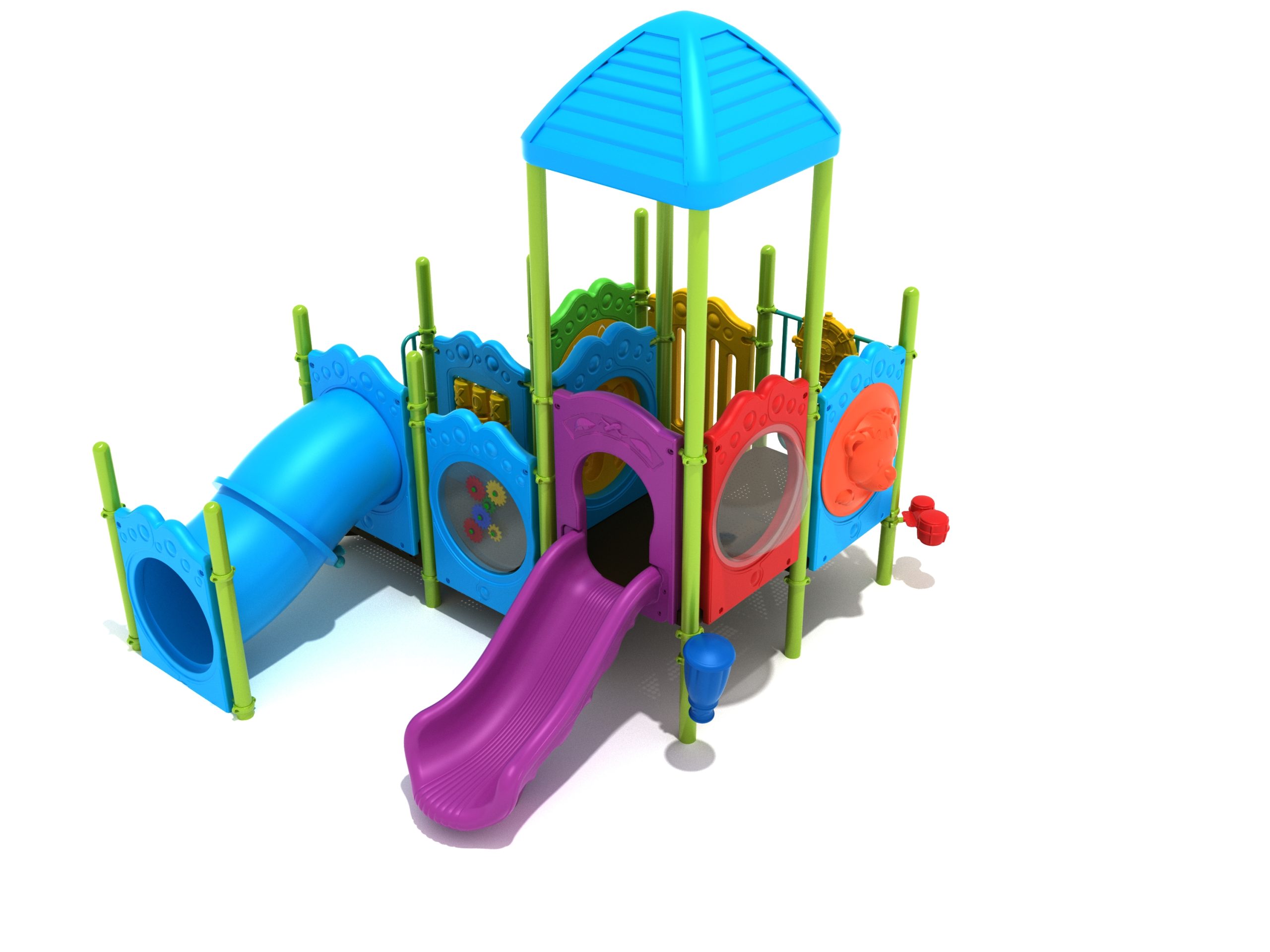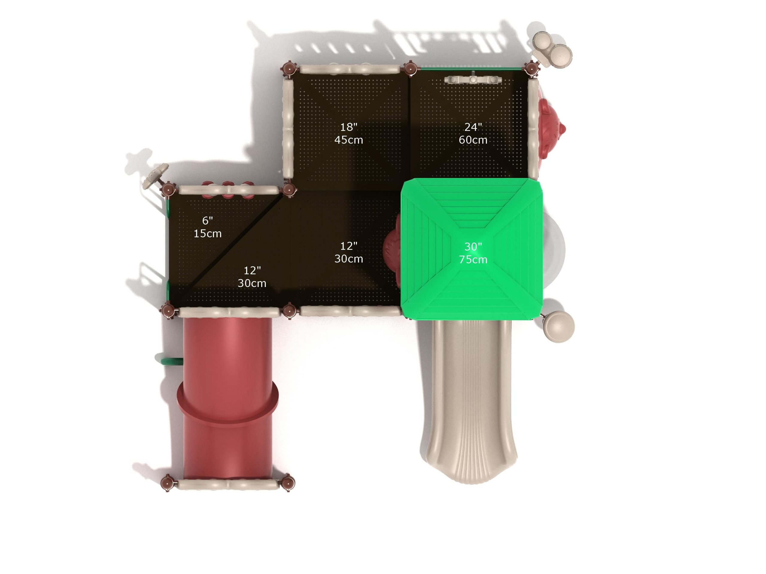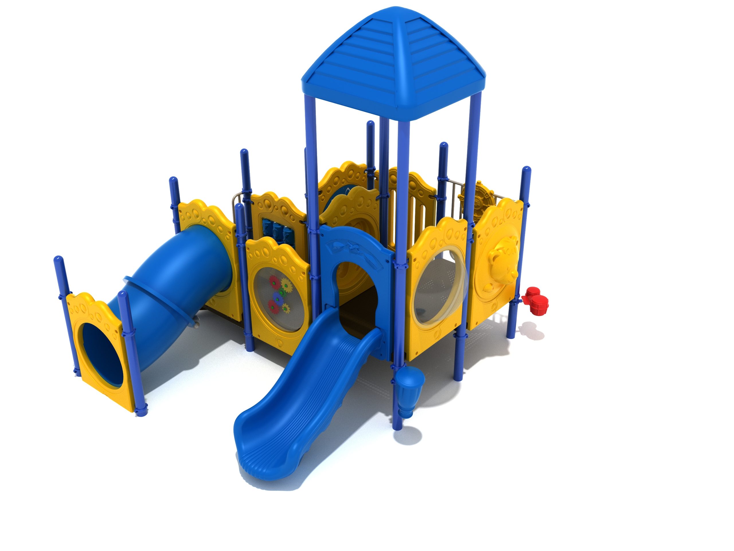 The Stamford play center is jam-packed with interesting features designed to stimulate young minds. From problem-solving on the Tic Tac Toe Panel and Maze Panel to giggling at the Bear Panel and Elephant Panel which feature cute characters, children will love to explore this structure on their own or with an adult as the sides are low enough to reach over and keep an eye on them. There’s a Metal Barrier with Ship’s Wheel attached which spins around to steer the fun in any creative way they want, and kids who love music will be drawn to features like the Rain Wheel, Bongos and Single Drum. There’s an Incline Tube Bridge to encourage crawling and you can pop your head out at the other end to give them a surprise as they pass through. A Straight Slide leads down from the main platform, but before they do you can guarantee they’re going to want a quick game of peek-a-boo at the Bubble Panel window.