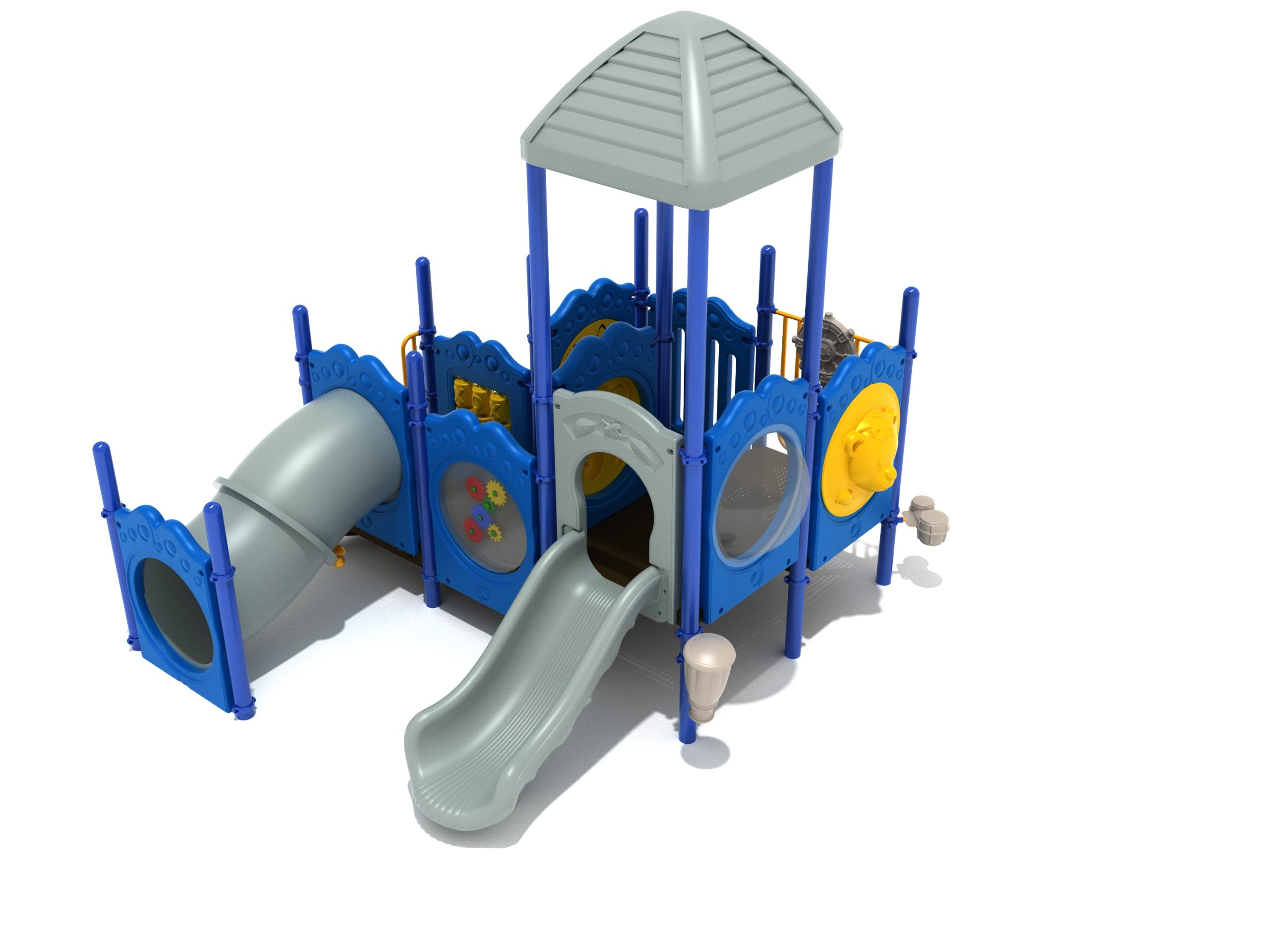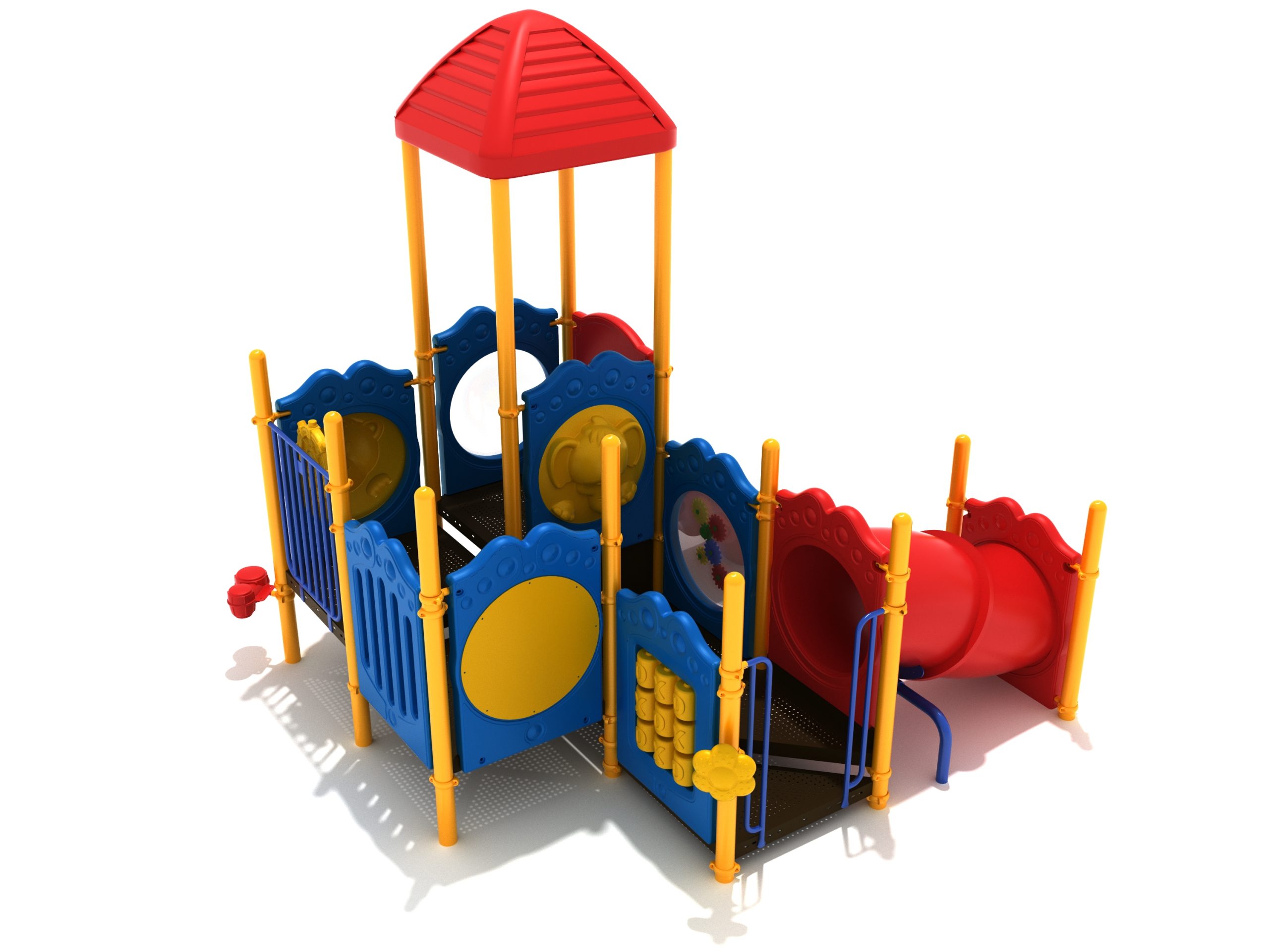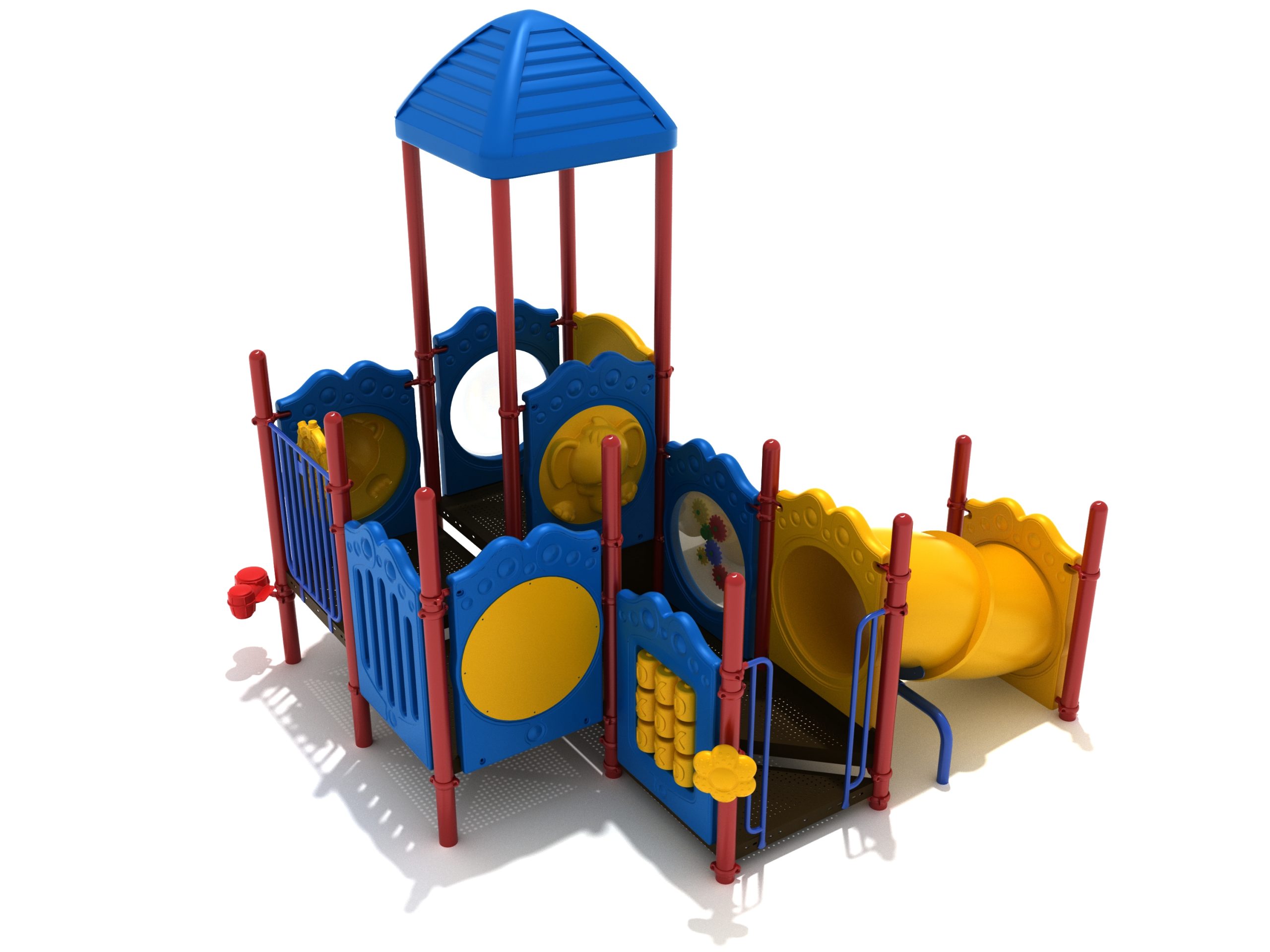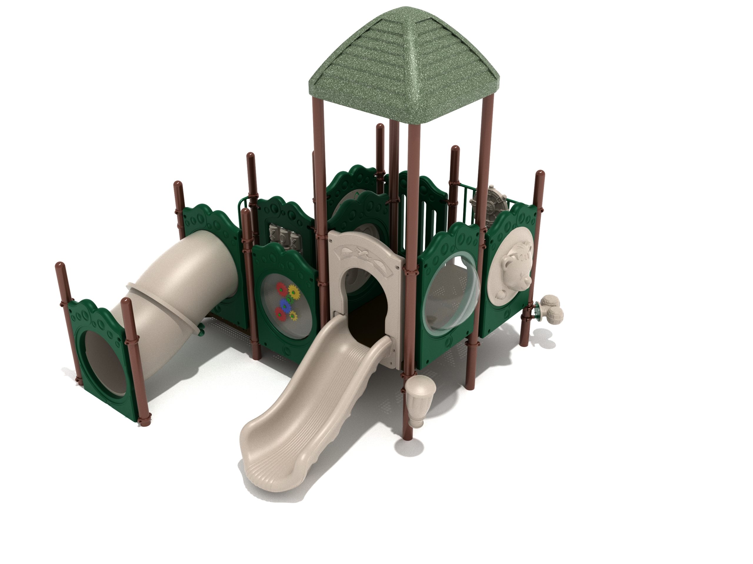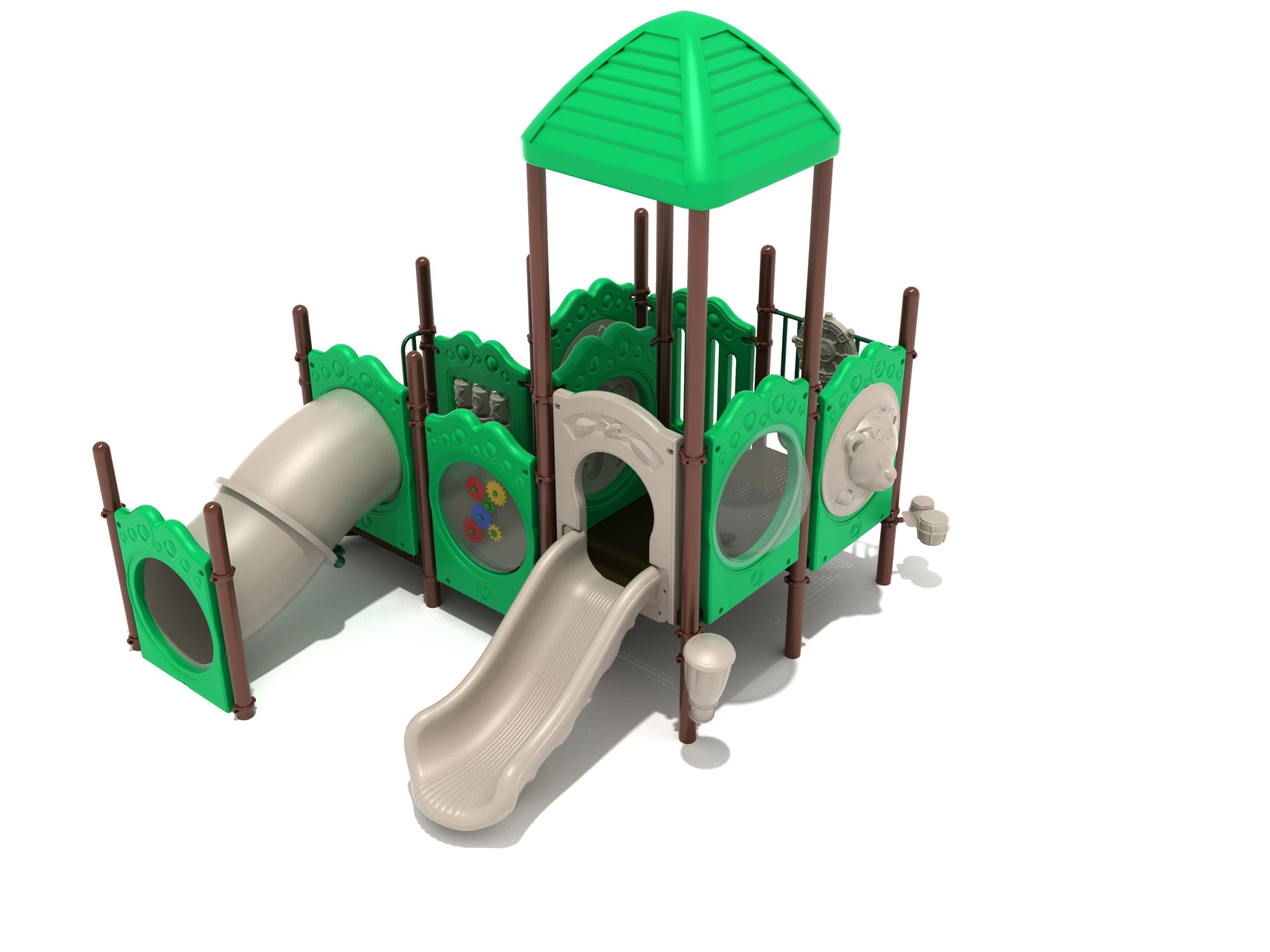 The Stamford play center is jam-packed with interesting features designed to stimulate young minds. From problem-solving on the Tic Tac Toe Panel and Maze Panel to giggling at the Bear Panel and Elephant Panel which feature cute characters, children will love to explore this structure on their own or with an adult as the sides are low enough to reach over and keep an eye on them. There’s a Metal Barrier with Ship’s Wheel attached which spins around to steer the fun in any creative way they want, and kids who love music will be drawn to features like the Rain Wheel, Bongos and Single Drum. There’s an Incline Tube Bridge to encourage crawling and you can pop your head out at the other end to give them a surprise as they pass through. A Straight Slide leads down from the main platform, but before they do you can guarantee they’re going to want a quick game of peek-a-boo at the Bubble Panel window.
