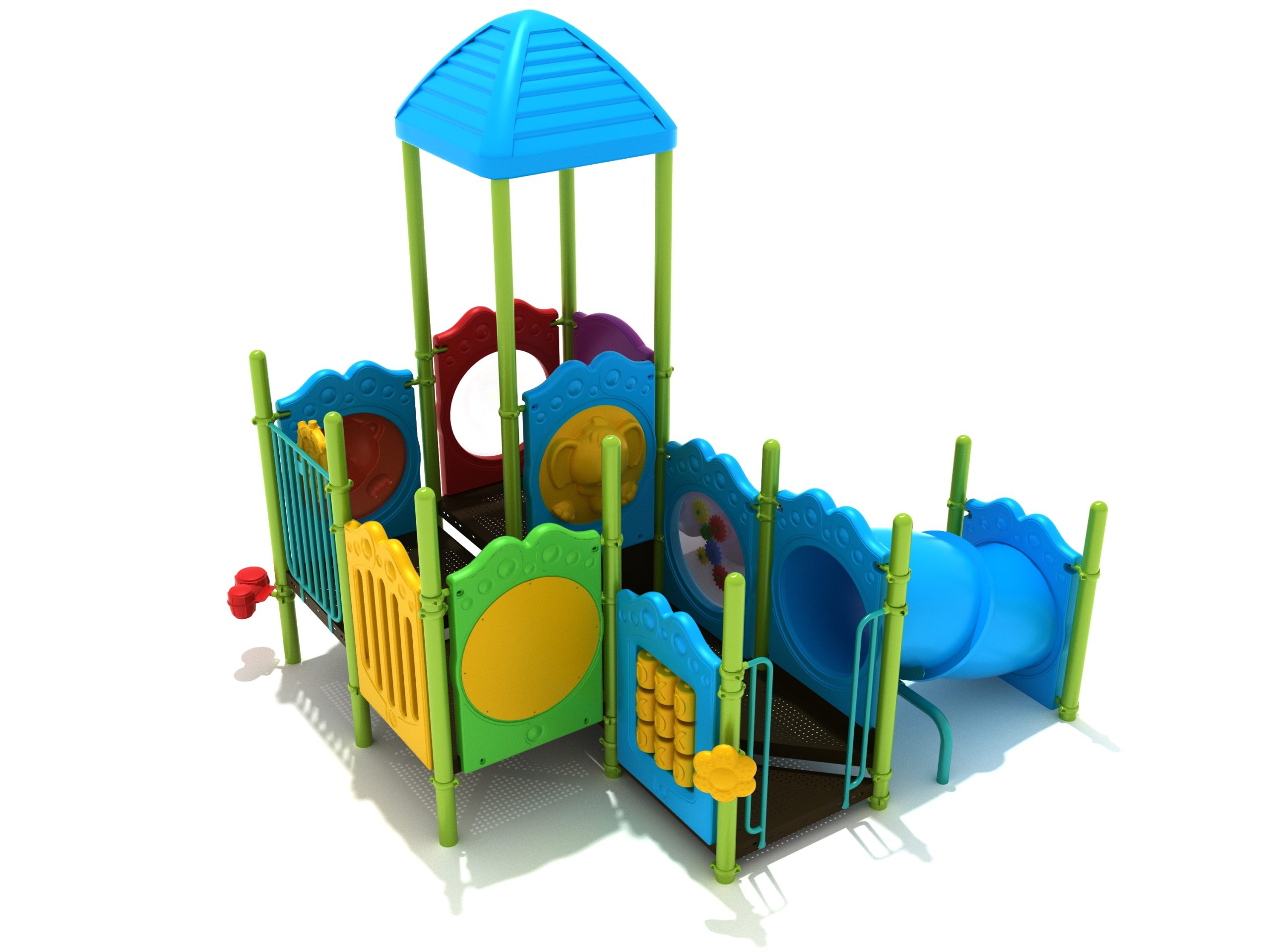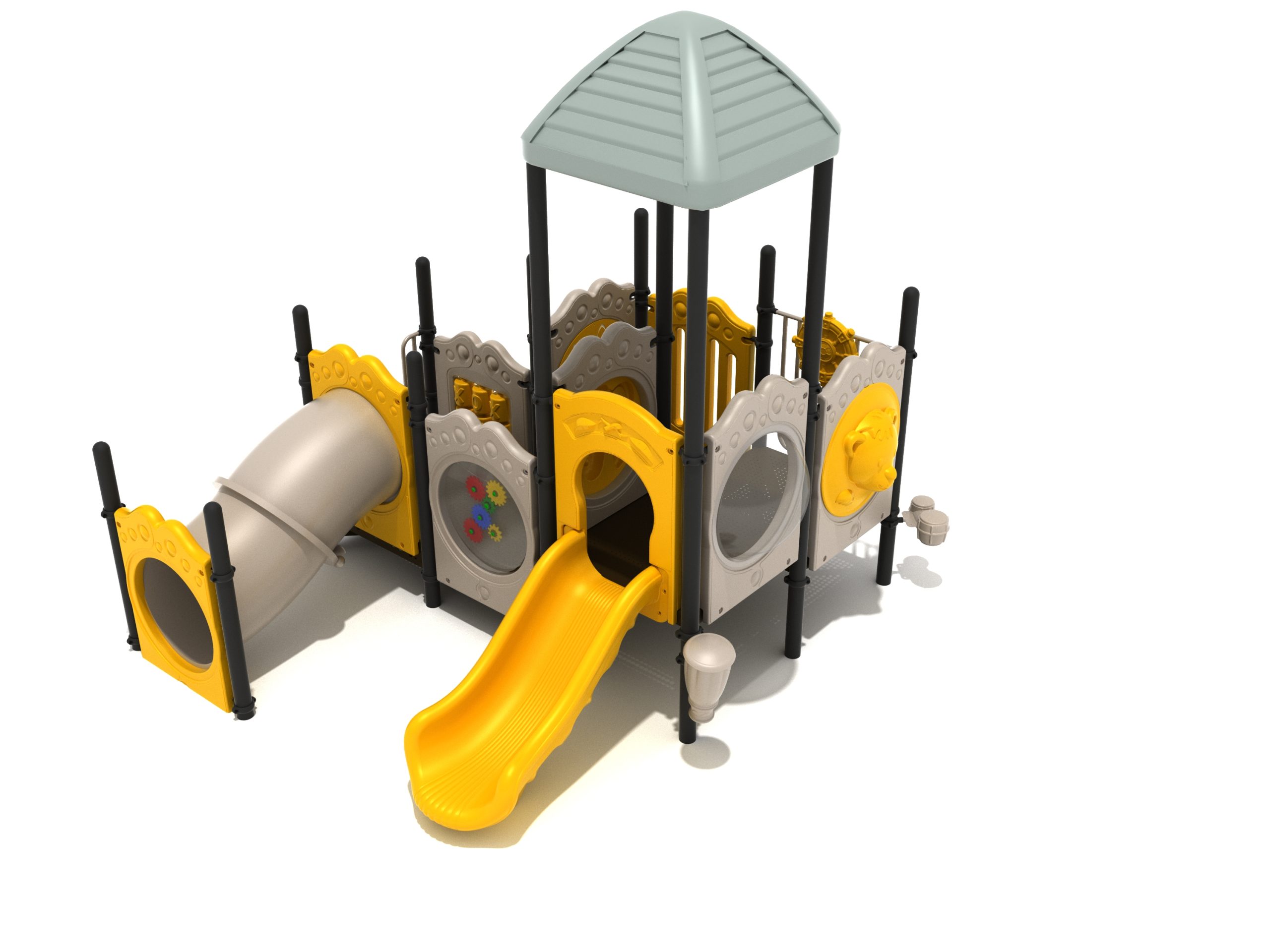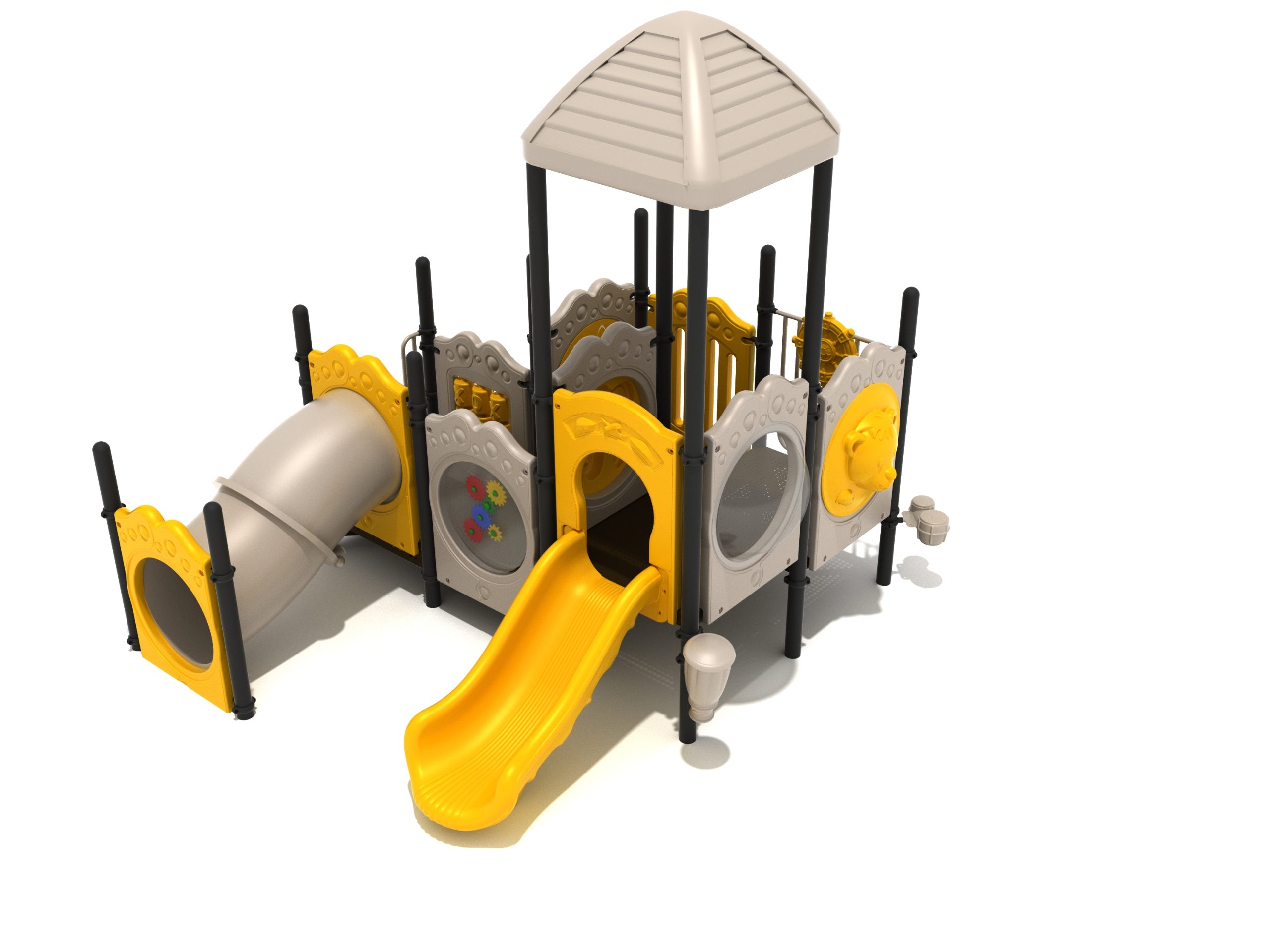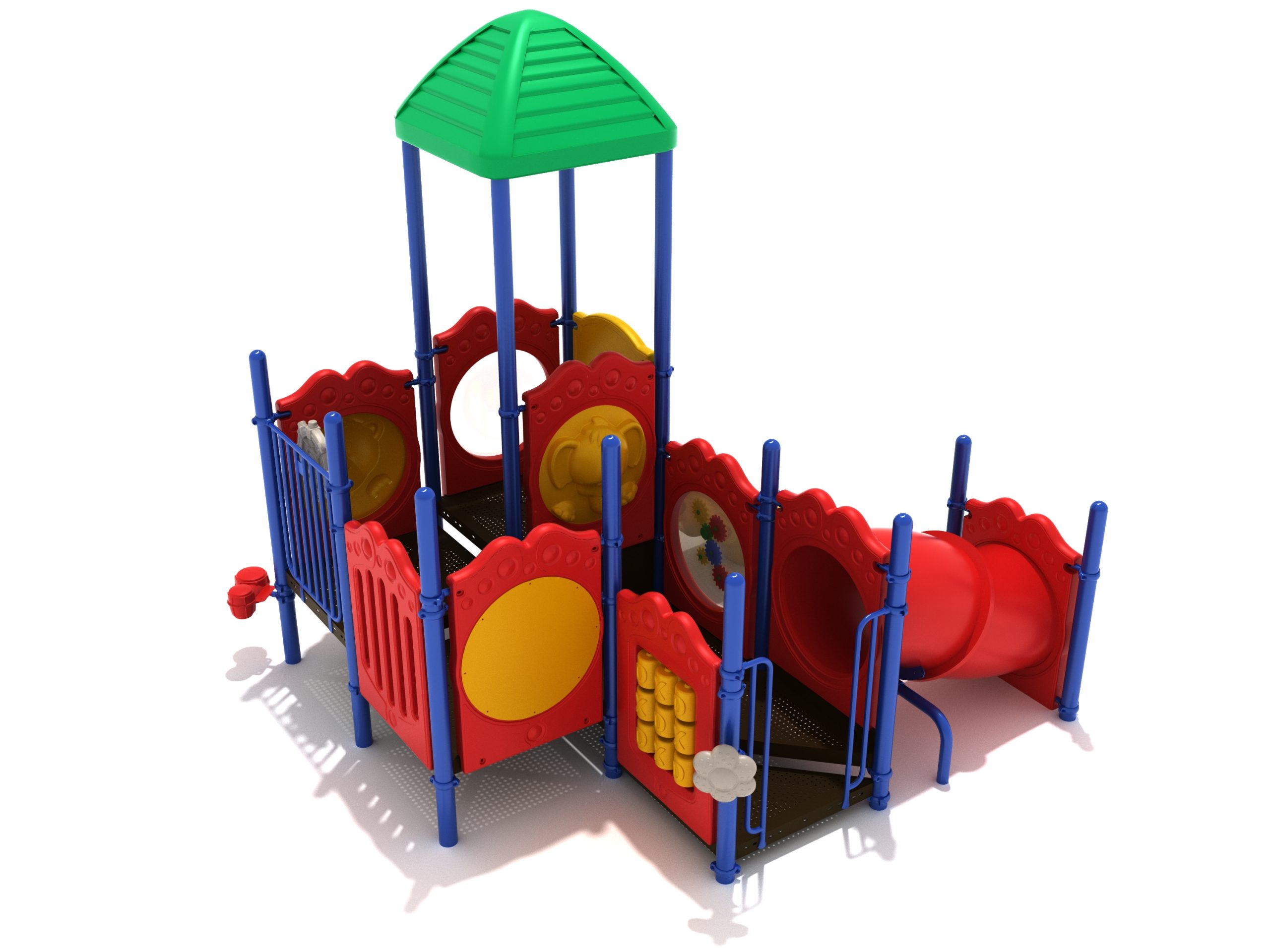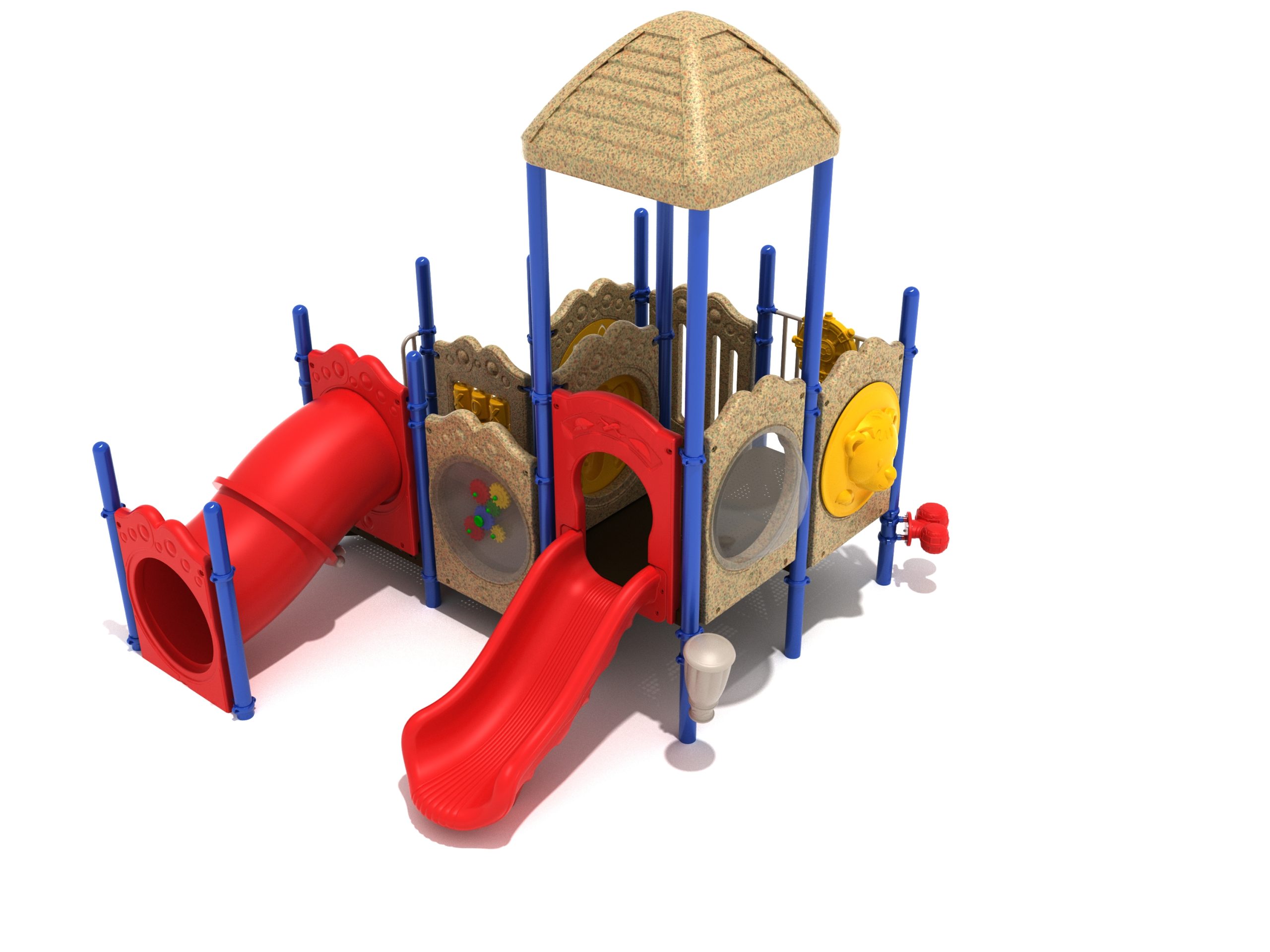 The Stamford play center is jam-packed with interesting features designed to stimulate young minds. From problem-solving on the Tic Tac Toe Panel and Maze Panel to giggling at the Bear Panel and Elephant Panel which feature cute characters, children will love to explore this structure on their own or with an adult as the sides are low enough to reach over and keep an eye on them. There’s a Metal Barrier with Ship’s Wheel attached which spins around to steer the fun in any creative way they want, and kids who love music will be drawn to features like the Rain Wheel, Bongos and Single Drum. There’s an Incline Tube Bridge to encourage crawling and you can pop your head out at the other end to give them a surprise as they pass through. A Straight Slide leads down from the main platform, but before they do you can guarantee they’re going to want a quick game of peek-a-boo at the Bubble Panel window.