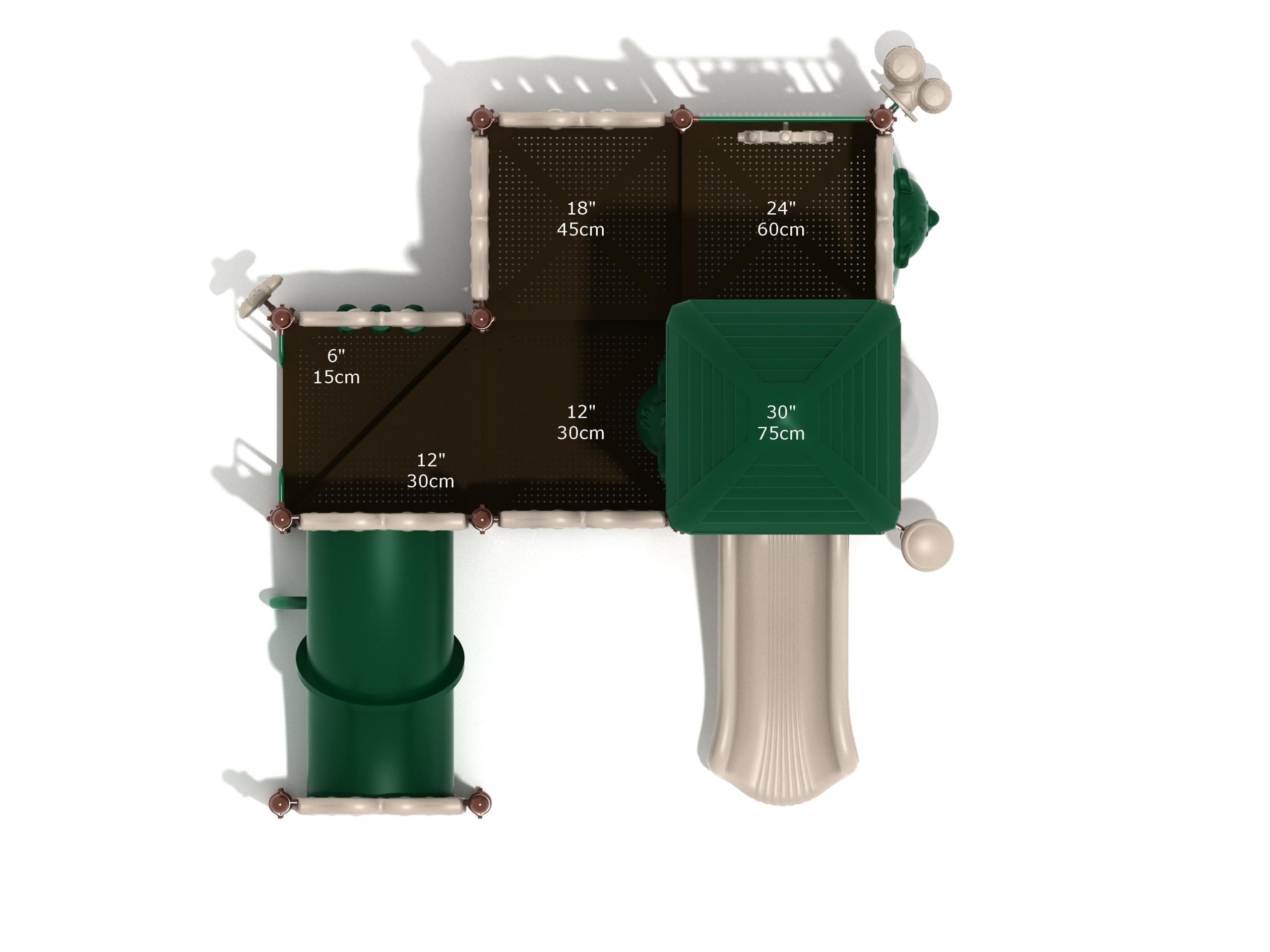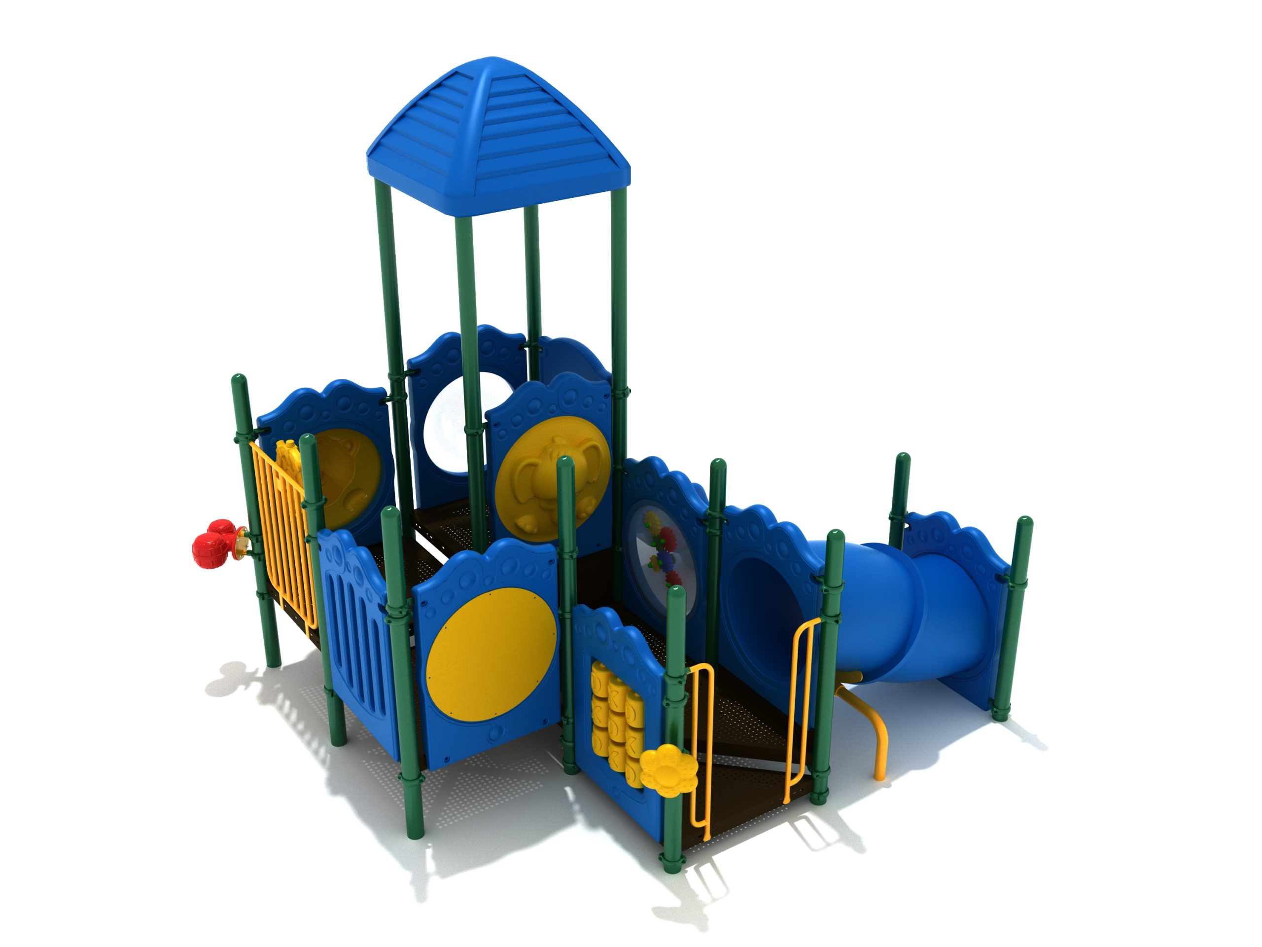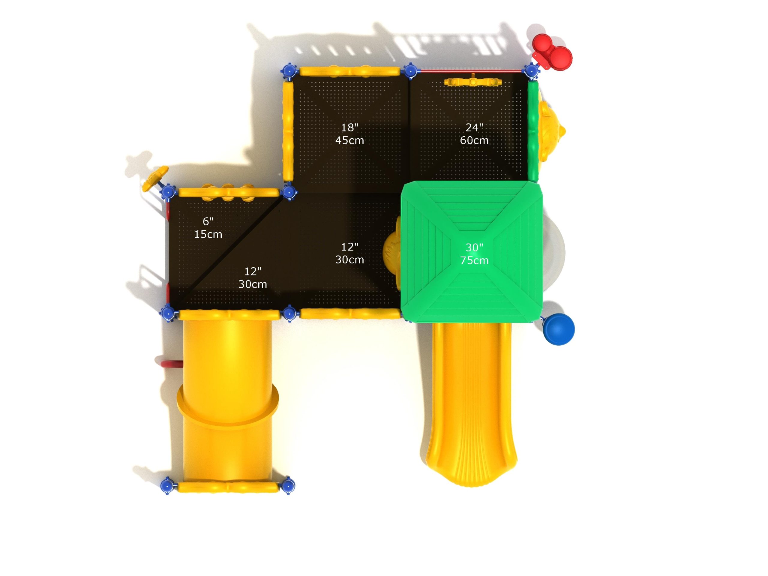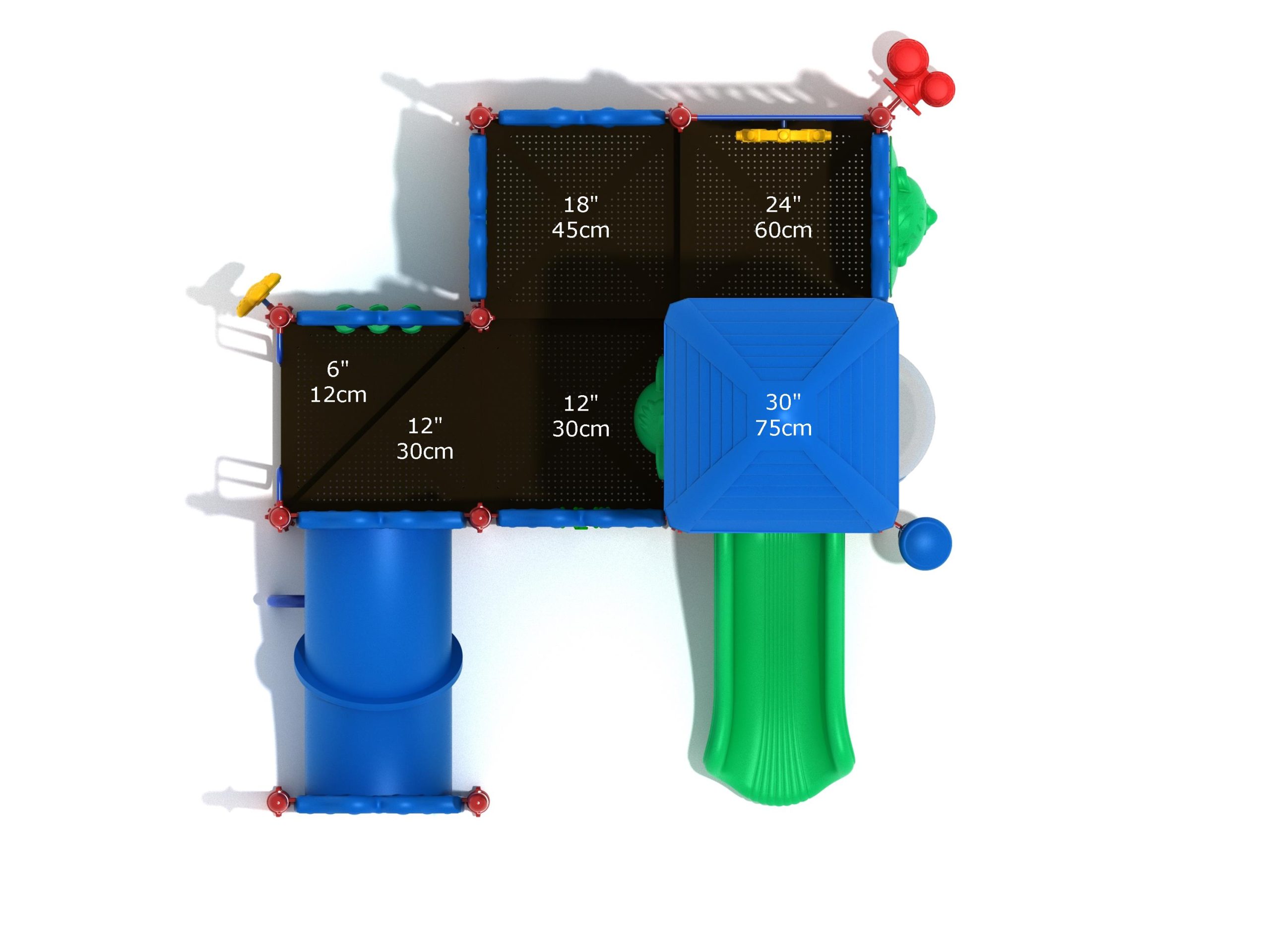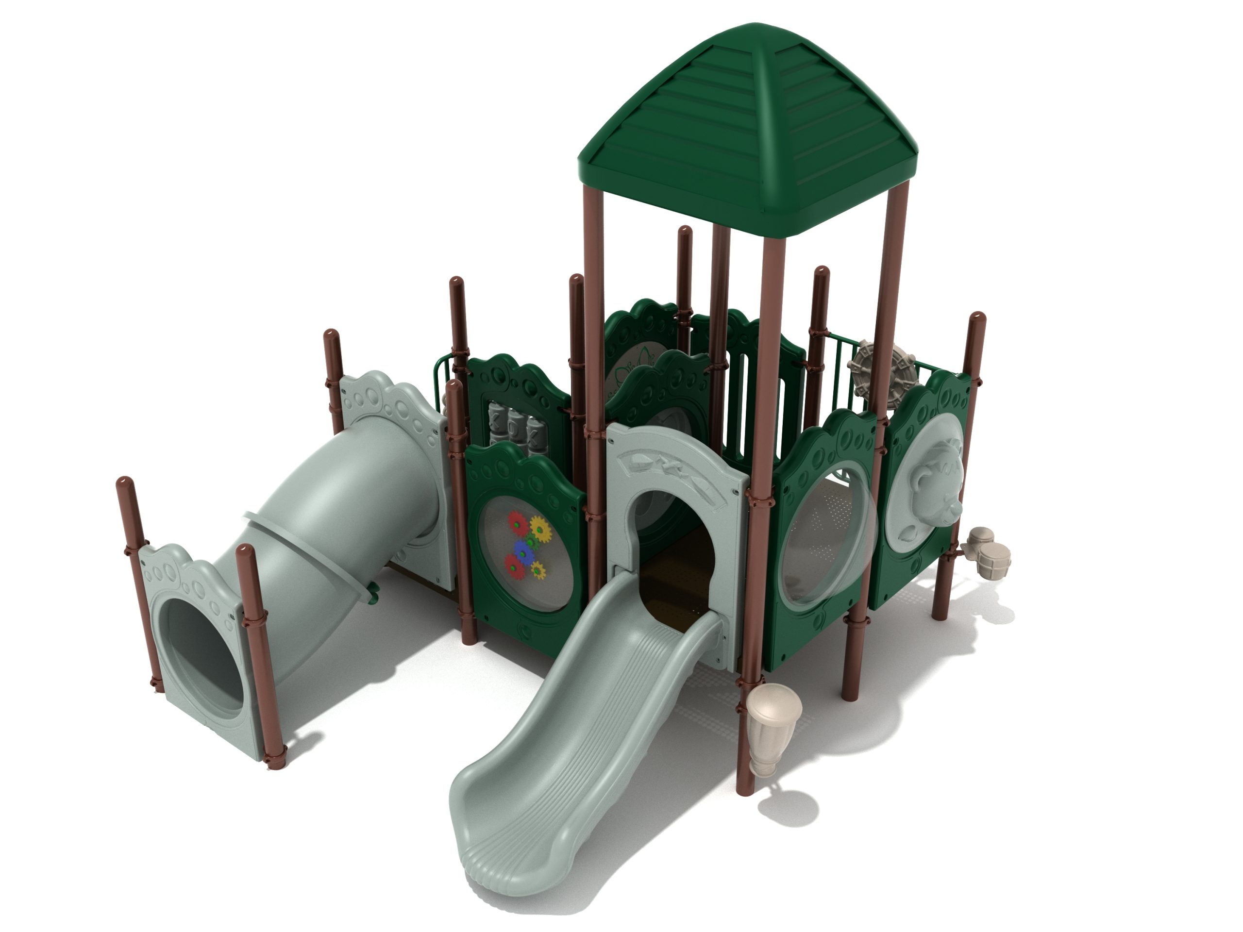 The Stamford play center is jam-packed with interesting features designed to stimulate young minds. From problem-solving on the Tic Tac Toe Panel and Maze Panel to giggling at the Bear Panel and Elephant Panel which feature cute characters, children will love to explore this structure on their own or with an adult as the sides are low enough to reach over and keep an eye on them. There’s a Metal Barrier with Ship’s Wheel attached which spins around to steer the fun in any creative way they want, and kids who love music will be drawn to features like the Rain Wheel, Bongos and Single Drum. There’s an Incline Tube Bridge to encourage crawling and you can pop your head out at the other end to give them a surprise as they pass through. A Straight Slide leads down from the main platform, but before they do you can guarantee they’re going to want a quick game of peek-a-boo at the Bubble Panel window.