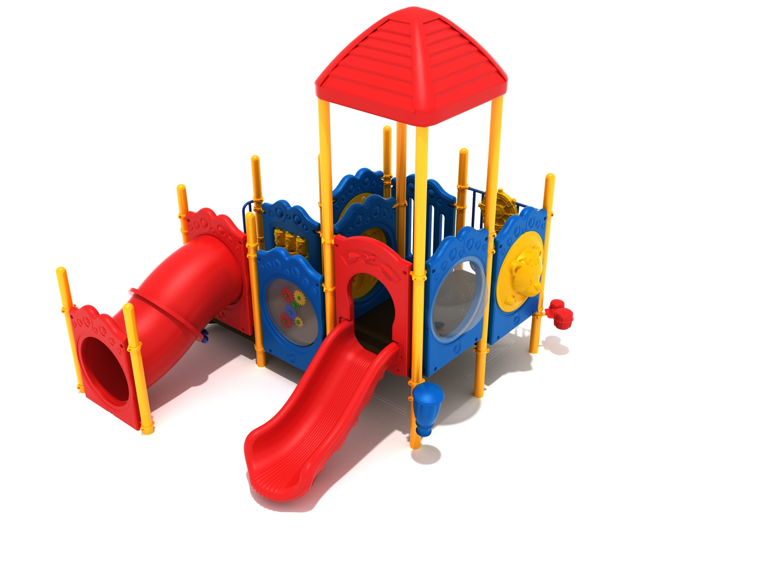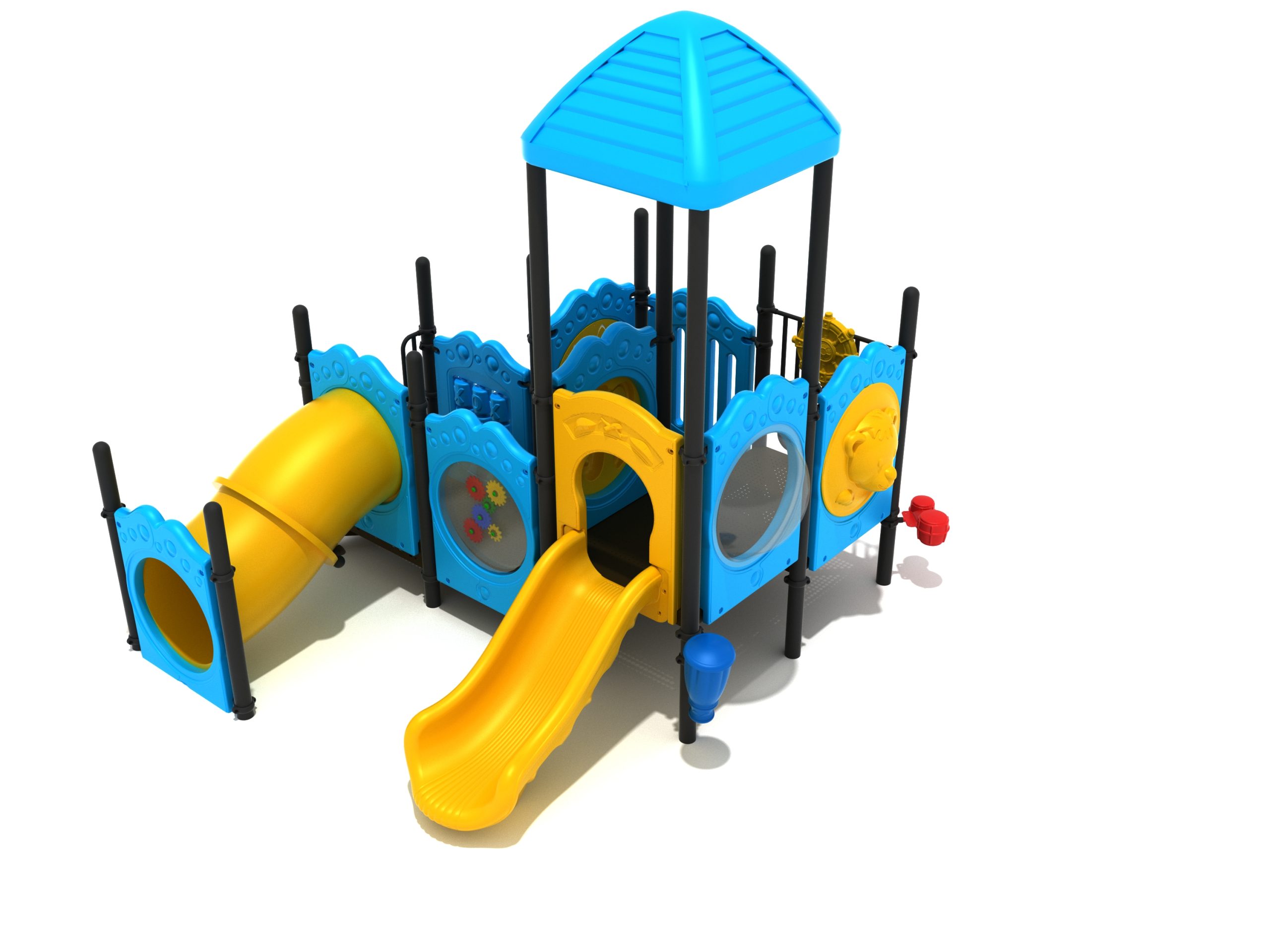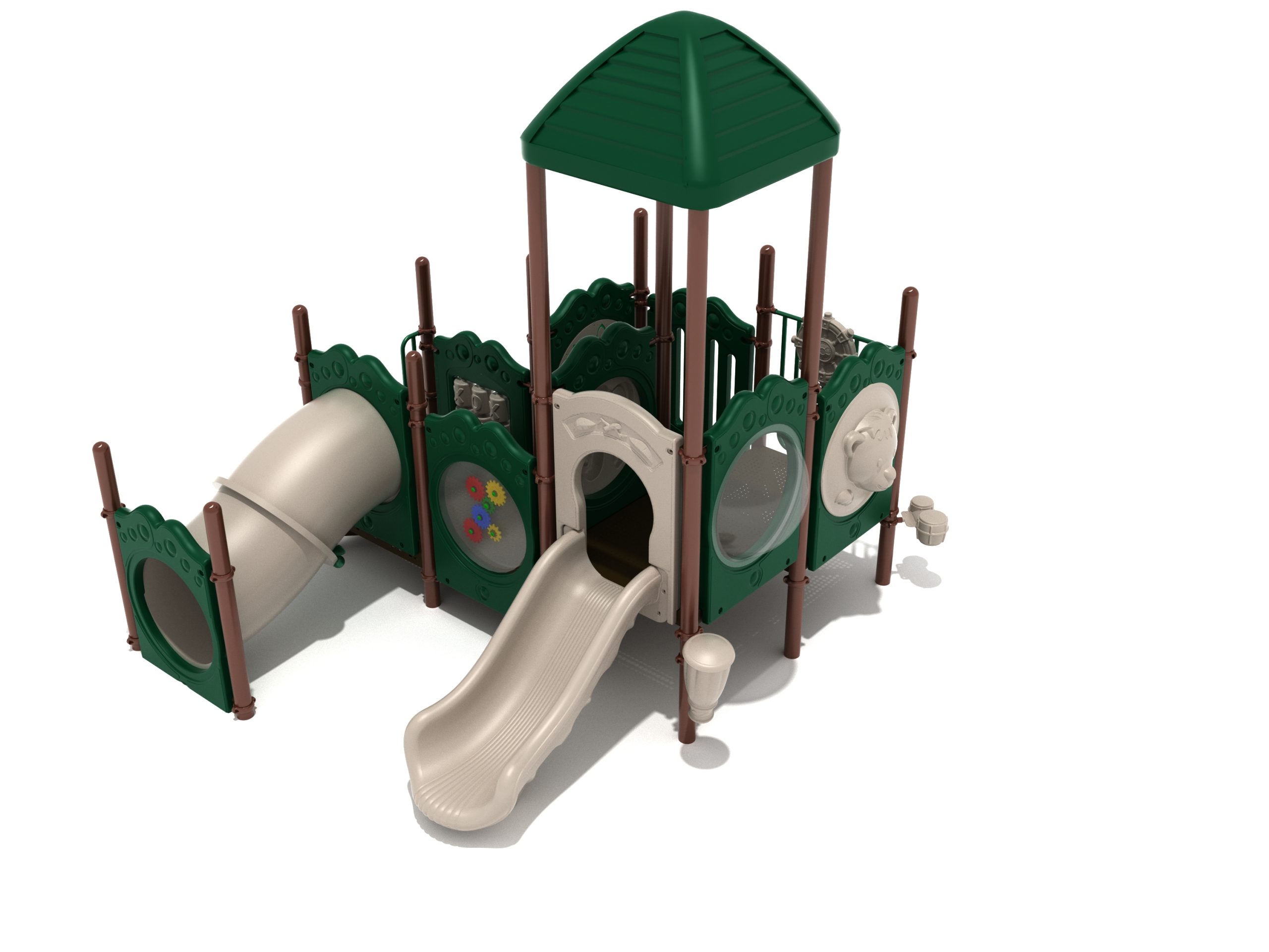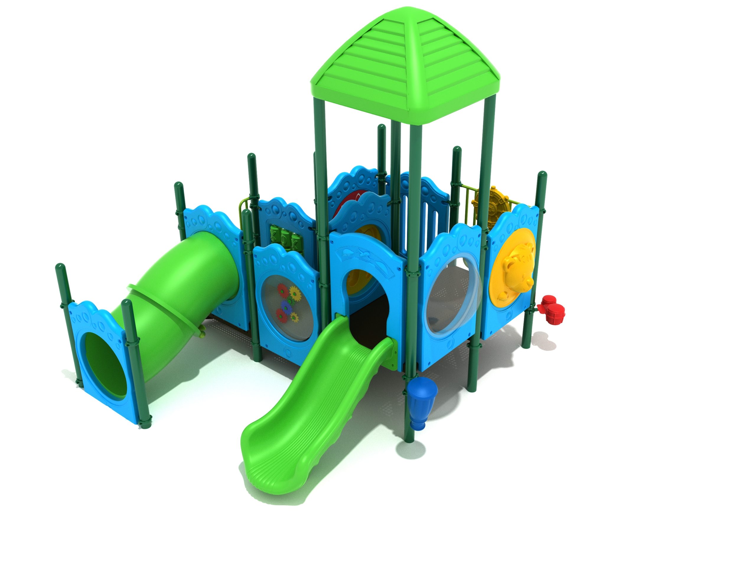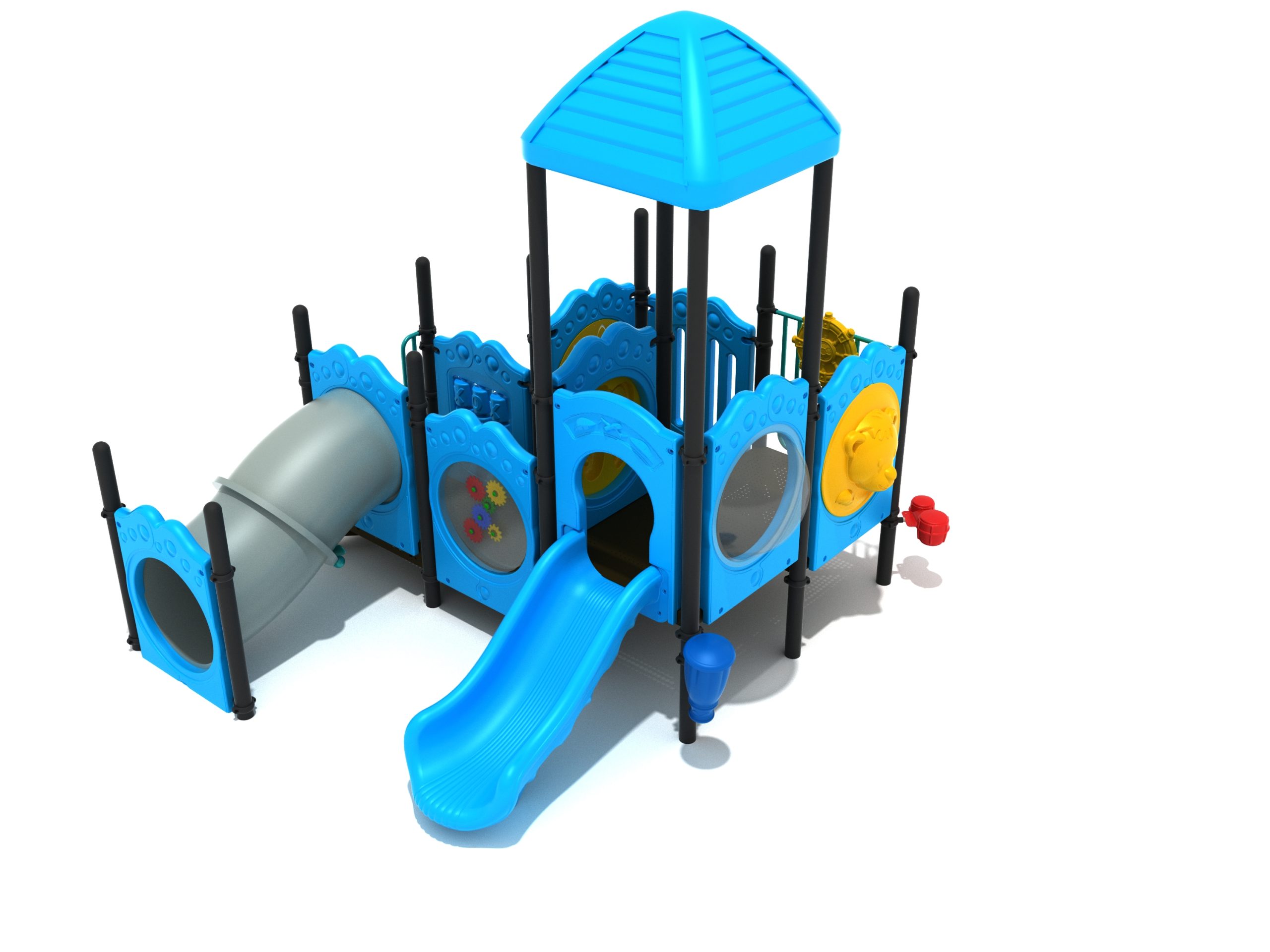 The Stamford play center is jam-packed with interesting features designed to stimulate young minds. From problem-solving on the Tic Tac Toe Panel and Maze Panel to giggling at the Bear Panel and Elephant Panel which feature cute characters, children will love to explore this structure on their own or with an adult as the sides are low enough to reach over and keep an eye on them. There’s a Metal Barrier with Ship’s Wheel attached which spins around to steer the fun in any creative way they want, and kids who love music will be drawn to features like the Rain Wheel, Bongos and Single Drum. There’s an Incline Tube Bridge to encourage crawling and you can pop your head out at the other end to give them a surprise as they pass through. A Straight Slide leads down from the main platform, but before they do you can guarantee they’re going to want a quick game of peek-a-boo at the Bubble Panel window.