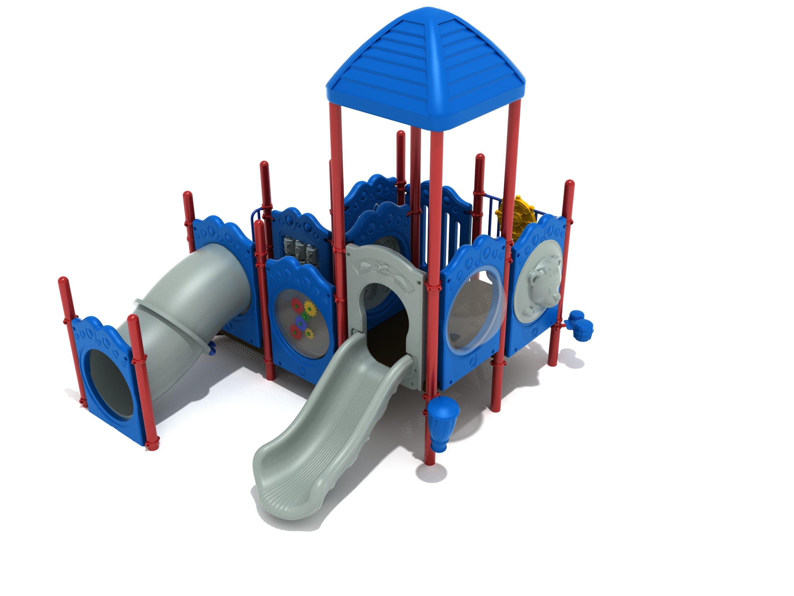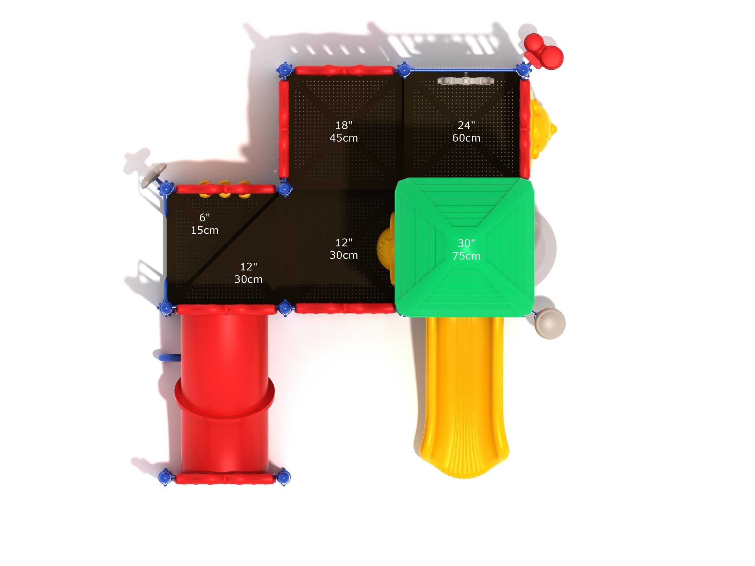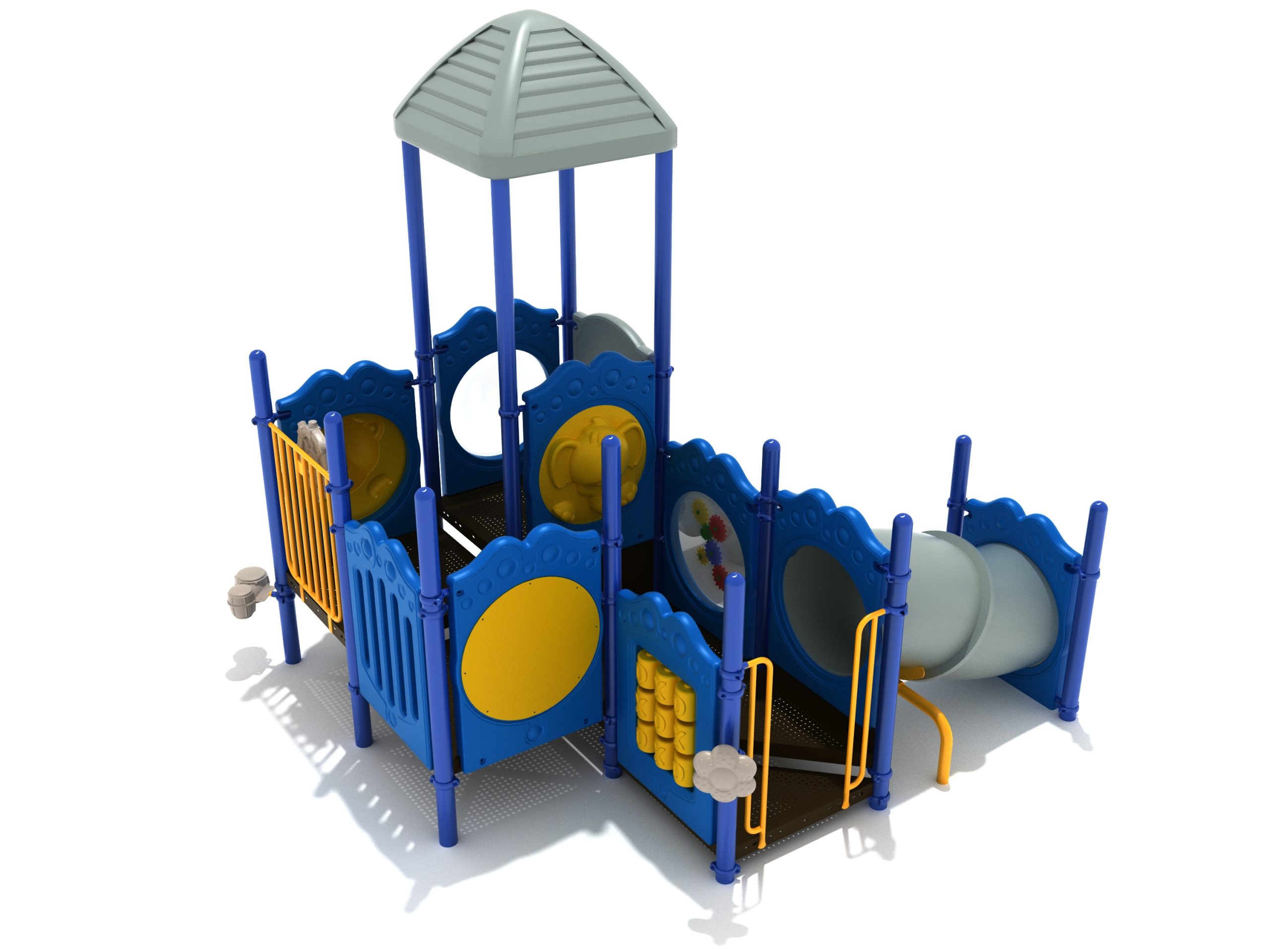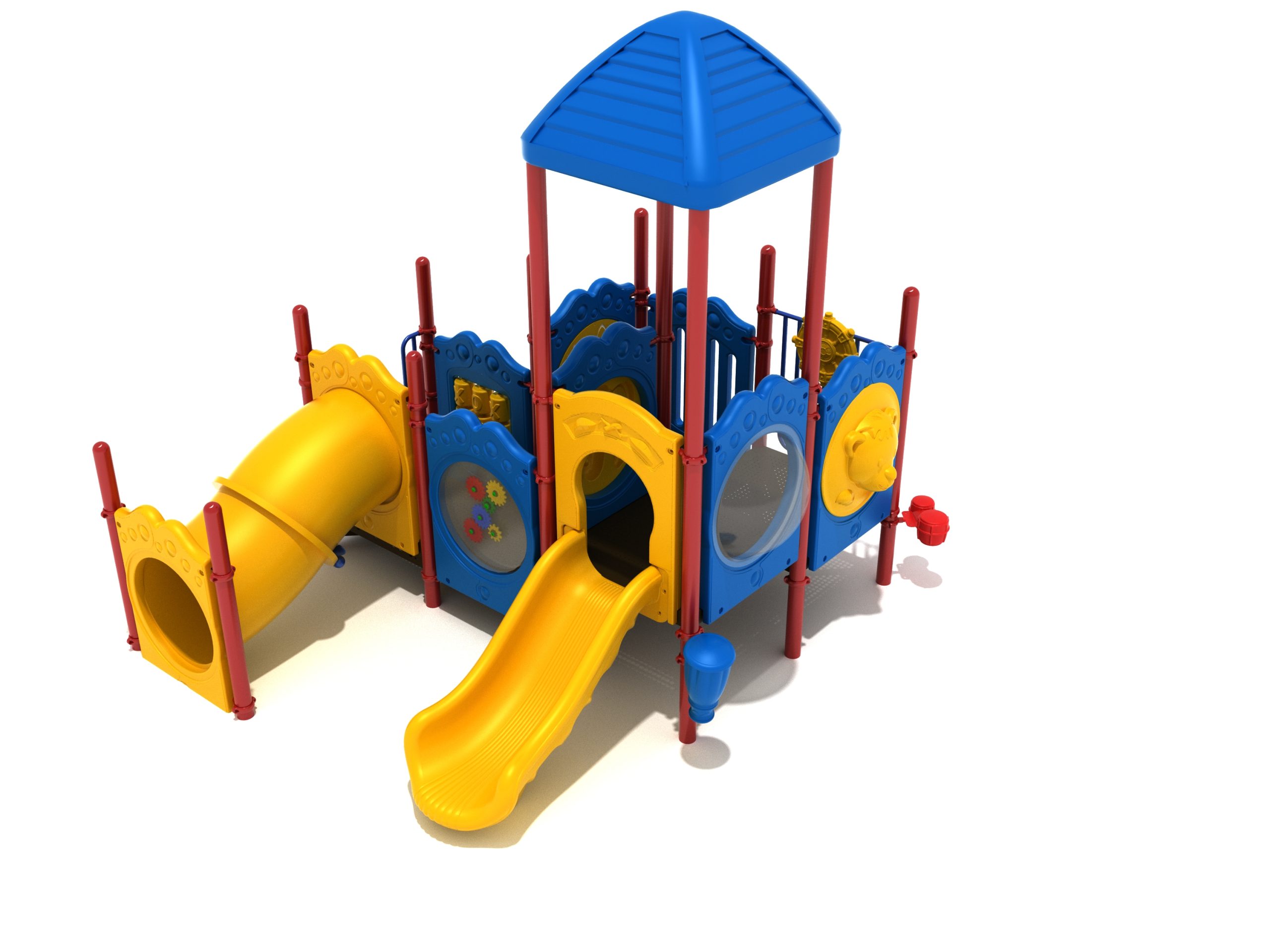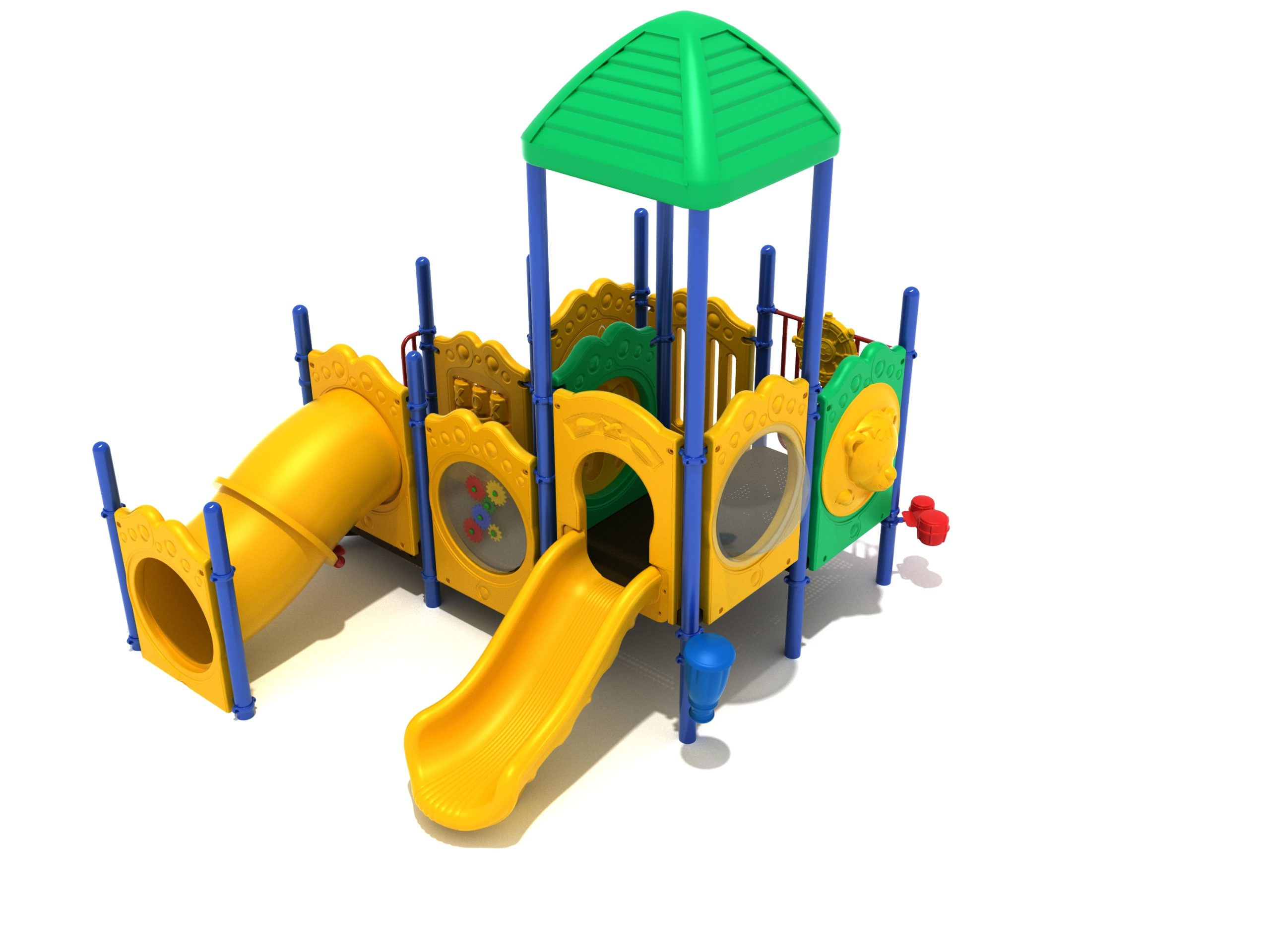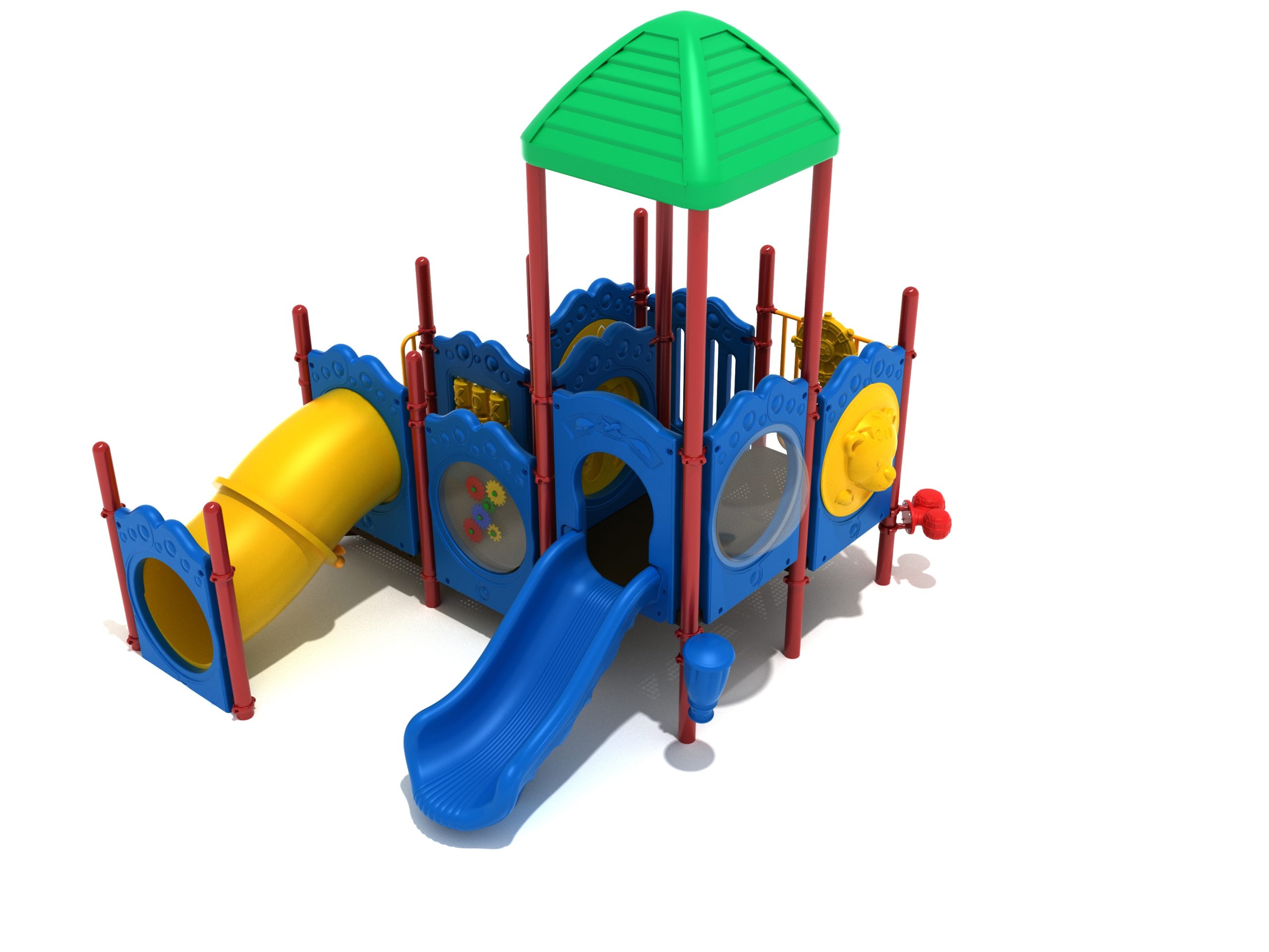 The Stamford play center is jam-packed with interesting features designed to stimulate young minds. From problem-solving on the Tic Tac Toe Panel and Maze Panel to giggling at the Bear Panel and Elephant Panel which feature cute characters, children will love to explore this structure on their own or with an adult as the sides are low enough to reach over and keep an eye on them. There’s a Metal Barrier with Ship’s Wheel attached which spins around to steer the fun in any creative way they want, and kids who love music will be drawn to features like the Rain Wheel, Bongos and Single Drum. There’s an Incline Tube Bridge to encourage crawling and you can pop your head out at the other end to give them a surprise as they pass through. A Straight Slide leads down from the main platform, but before they do you can guarantee they’re going to want a quick game of peek-a-boo at the Bubble Panel window.