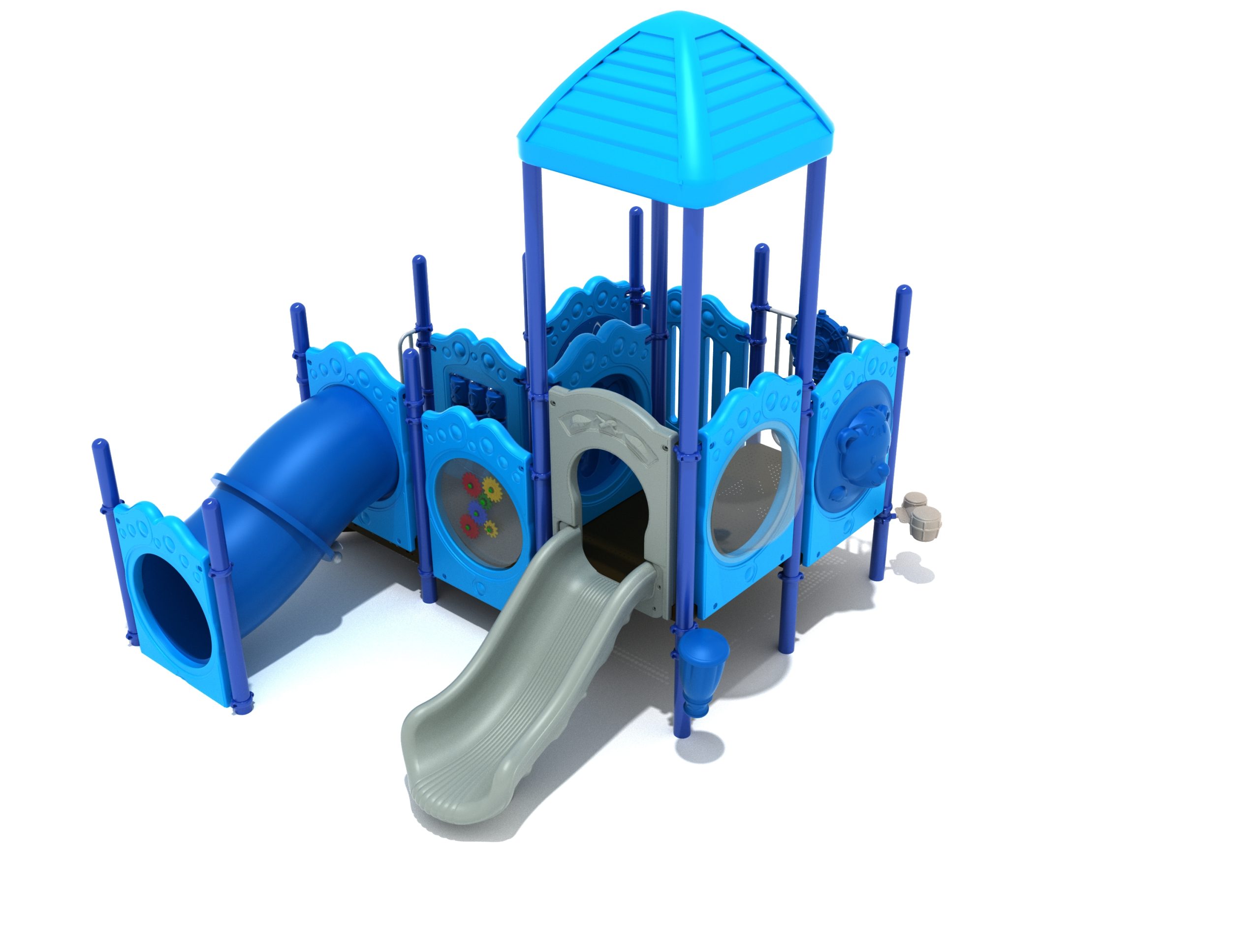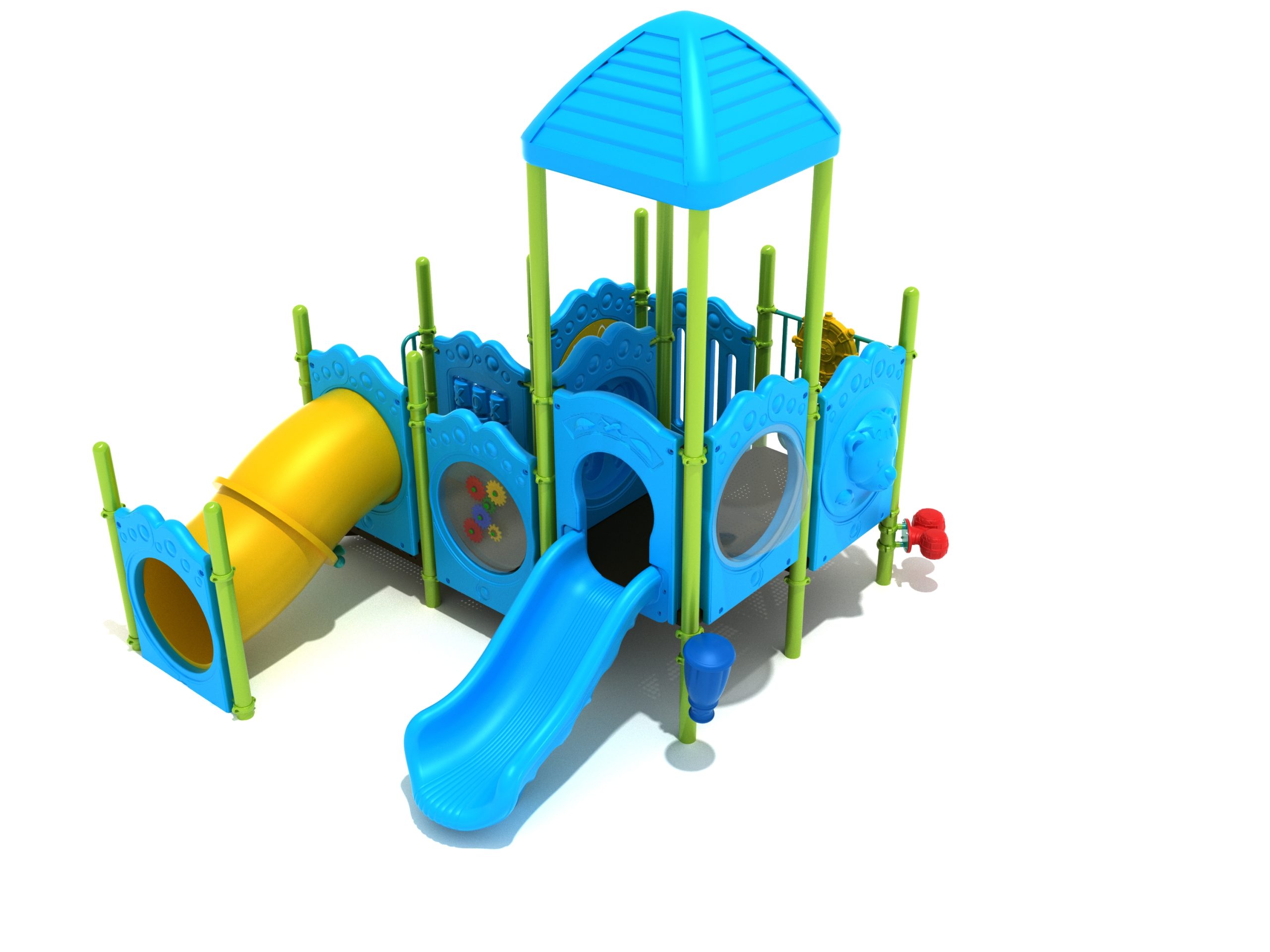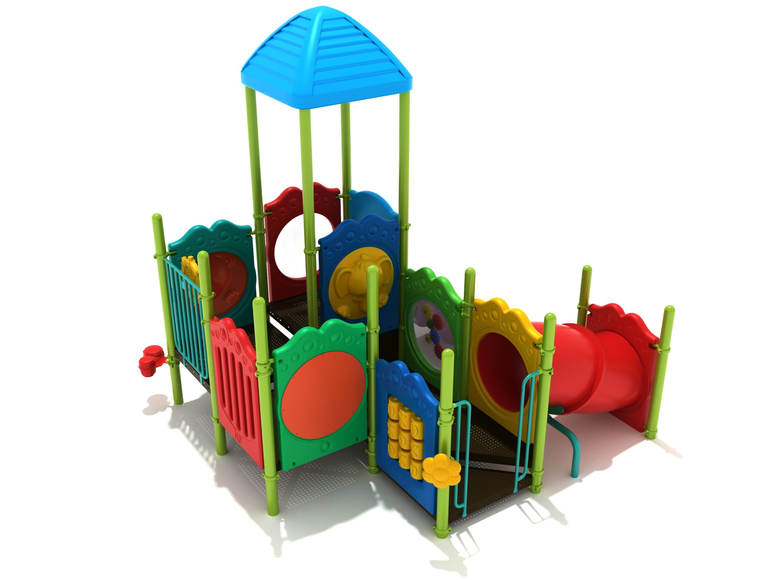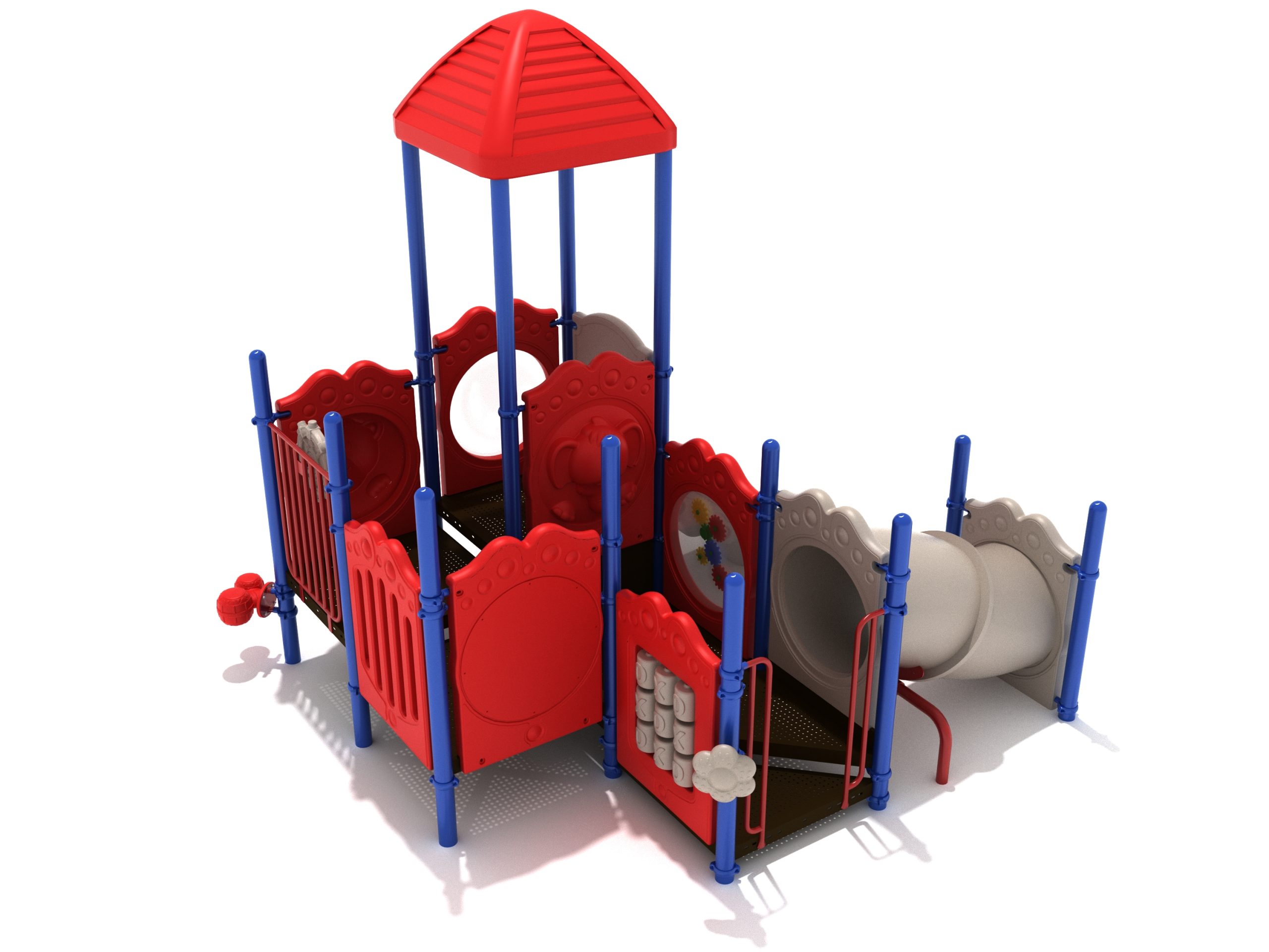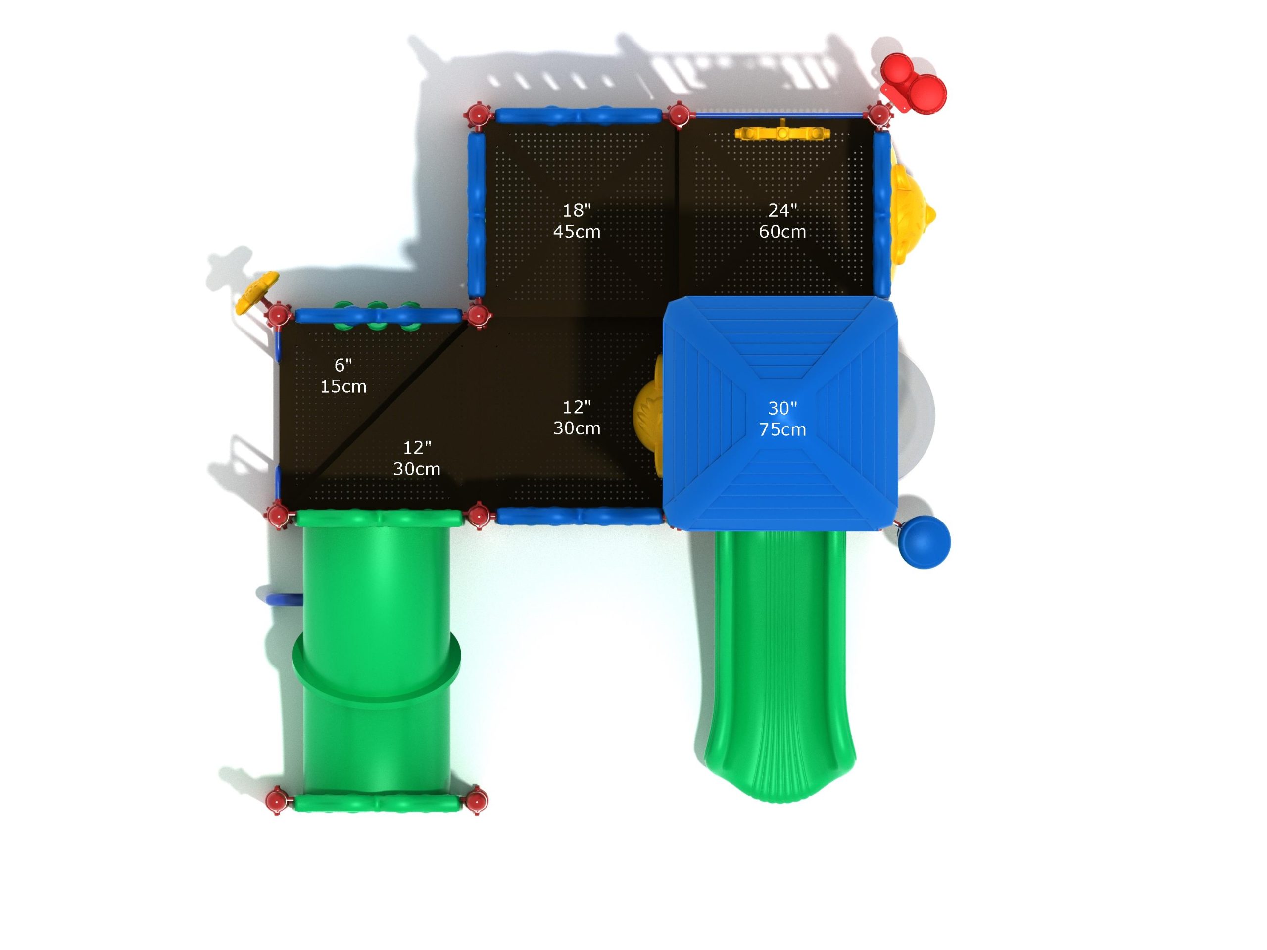 The Stamford play center is jam-packed with interesting features designed to stimulate young minds. From problem-solving on the Tic Tac Toe Panel and Maze Panel to giggling at the Bear Panel and Elephant Panel which feature cute characters, children will love to explore this structure on their own or with an adult as the sides are low enough to reach over and keep an eye on them. There’s a Metal Barrier with Ship’s Wheel attached which spins around to steer the fun in any creative way they want, and kids who love music will be drawn to features like the Rain Wheel, Bongos and Single Drum. There’s an Incline Tube Bridge to encourage crawling and you can pop your head out at the other end to give them a surprise as they pass through. A Straight Slide leads down from the main platform, but before they do you can guarantee they’re going to want a quick game of peek-a-boo at the Bubble Panel window.