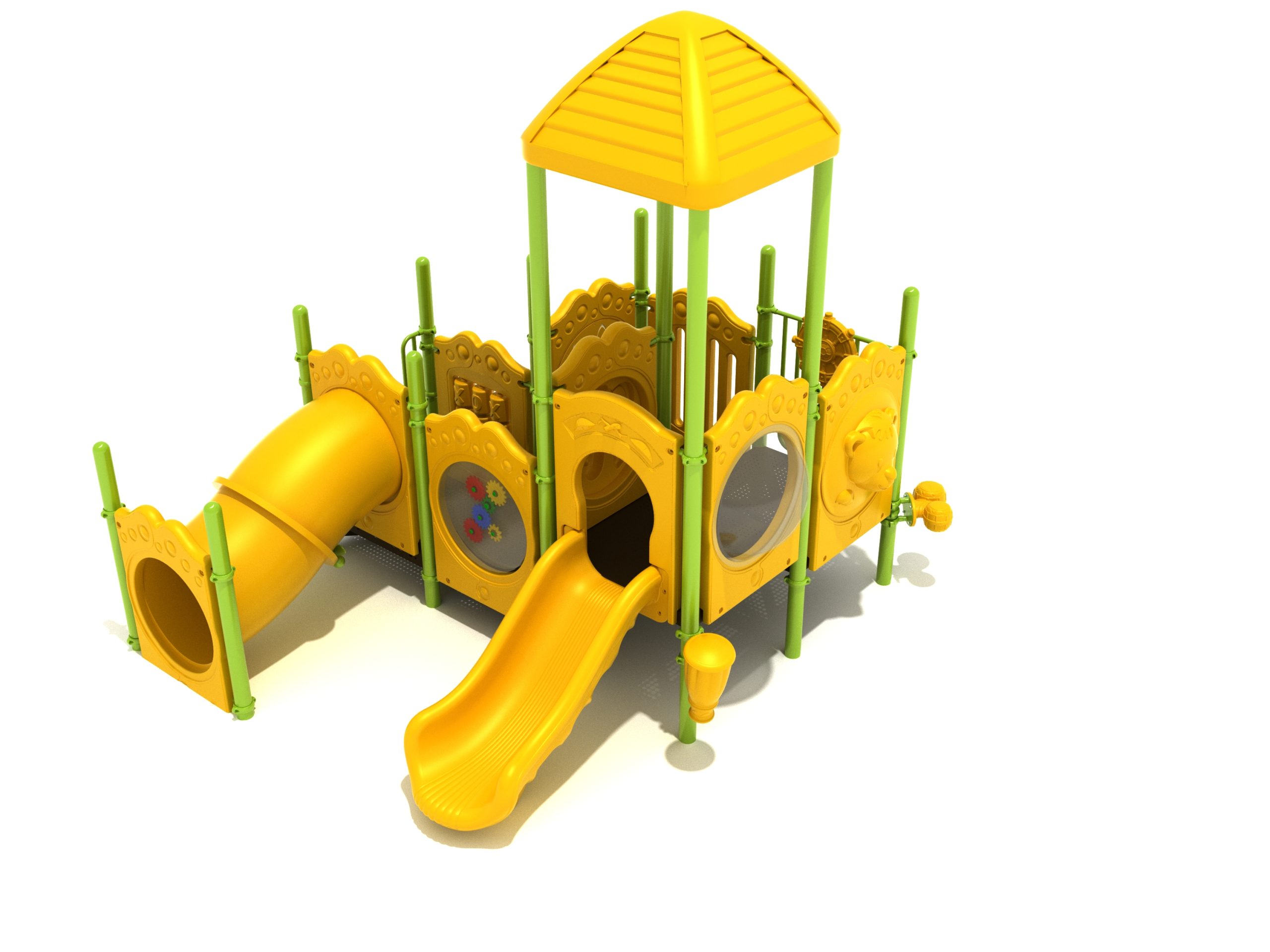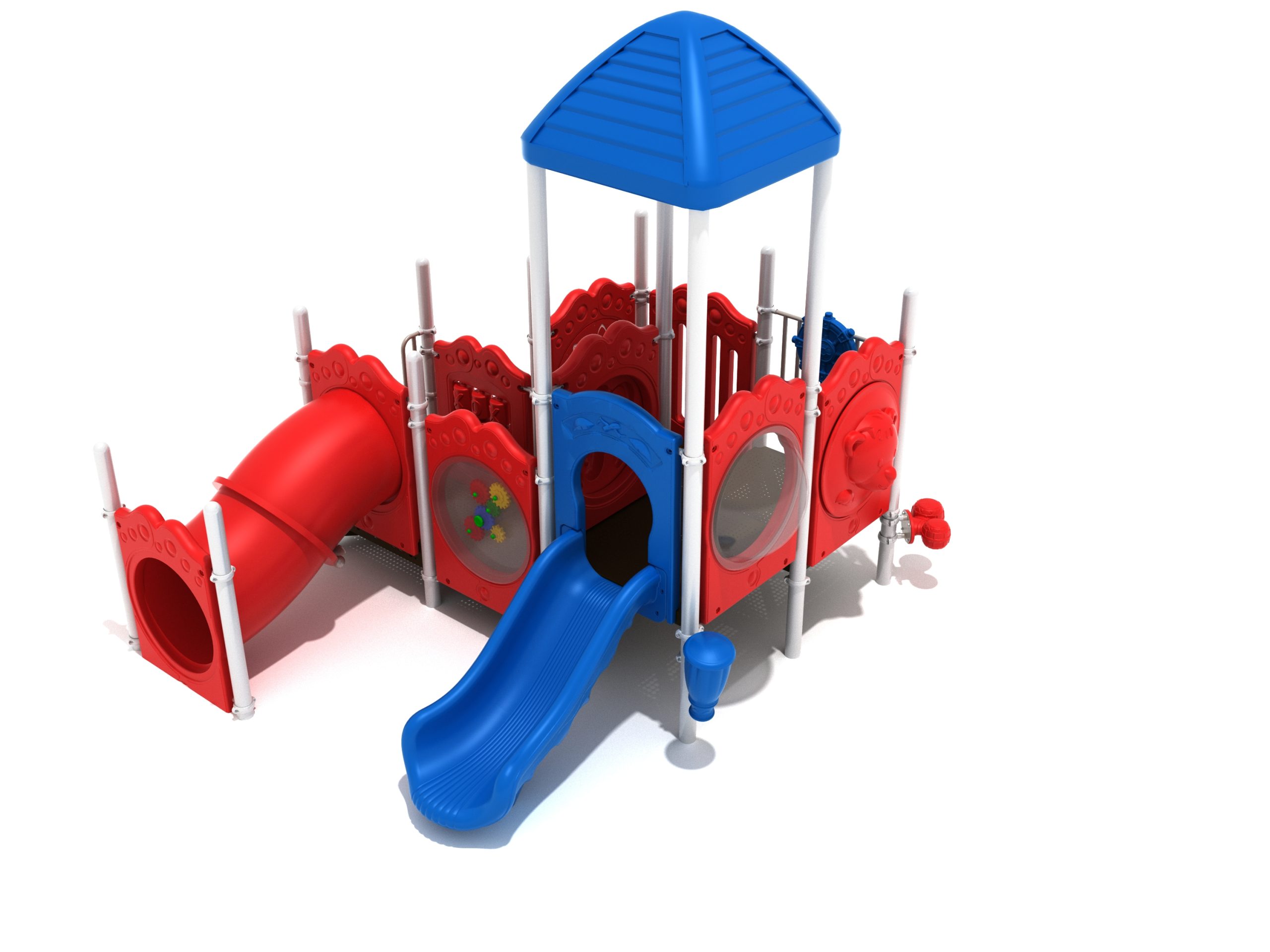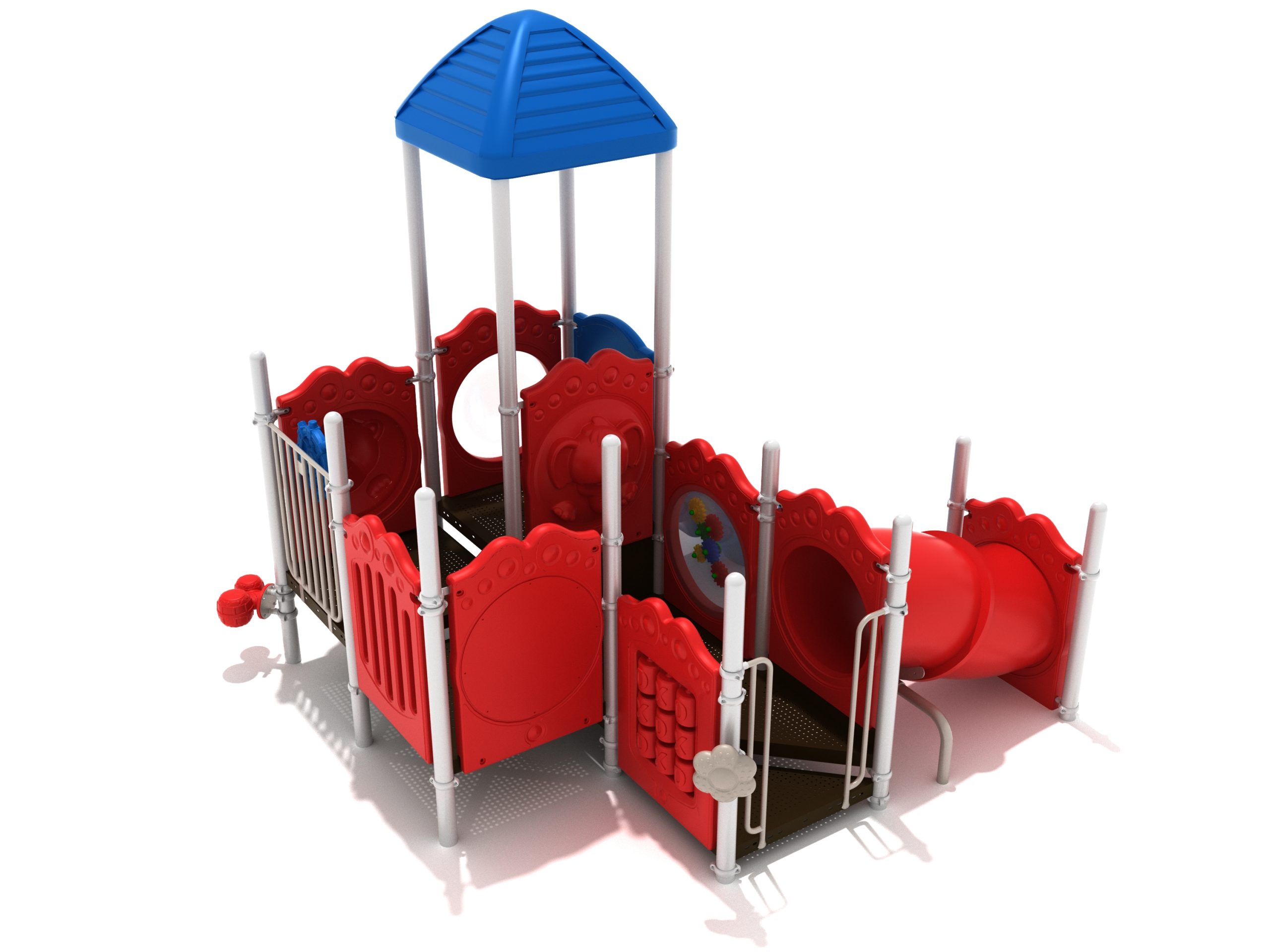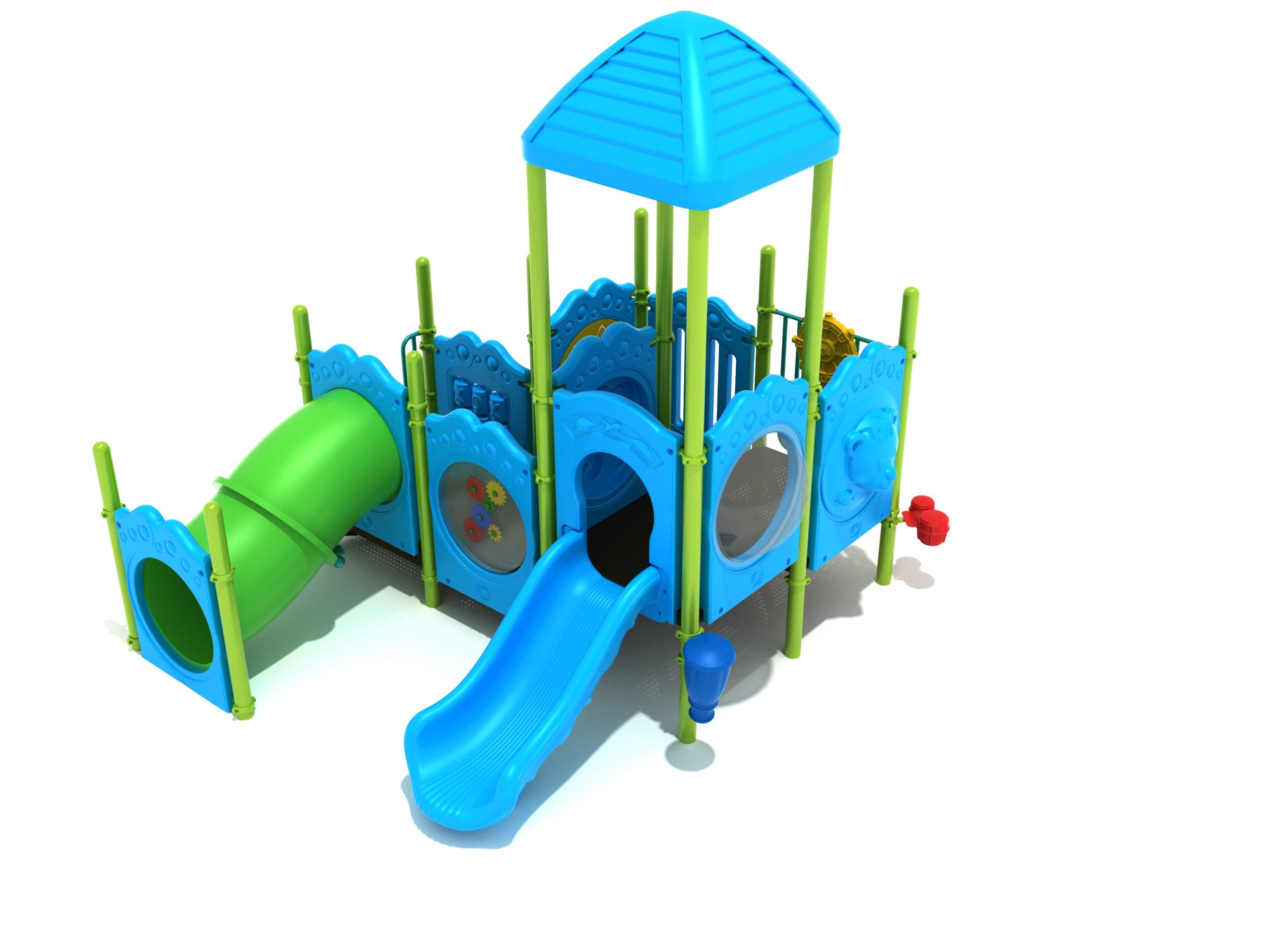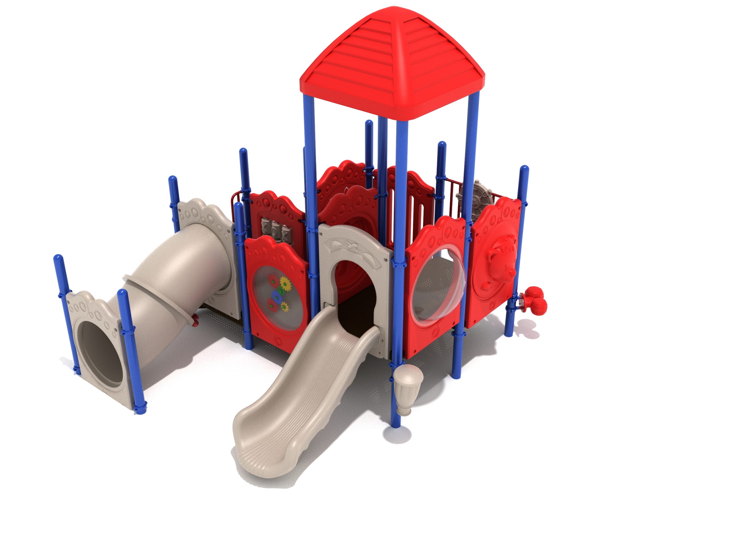 The Stamford play center is jam-packed with interesting features designed to stimulate young minds. From problem-solving on the Tic Tac Toe Panel and Maze Panel to giggling at the Bear Panel and Elephant Panel which feature cute characters, children will love to explore this structure on their own or with an adult as the sides are low enough to reach over and keep an eye on them. There’s a Metal Barrier with Ship’s Wheel attached which spins around to steer the fun in any creative way they want, and kids who love music will be drawn to features like the Rain Wheel, Bongos and Single Drum. There’s an Incline Tube Bridge to encourage crawling and you can pop your head out at the other end to give them a surprise as they pass through. A Straight Slide leads down from the main platform, but before they do you can guarantee they’re going to want a quick game of peek-a-boo at the Bubble Panel window.