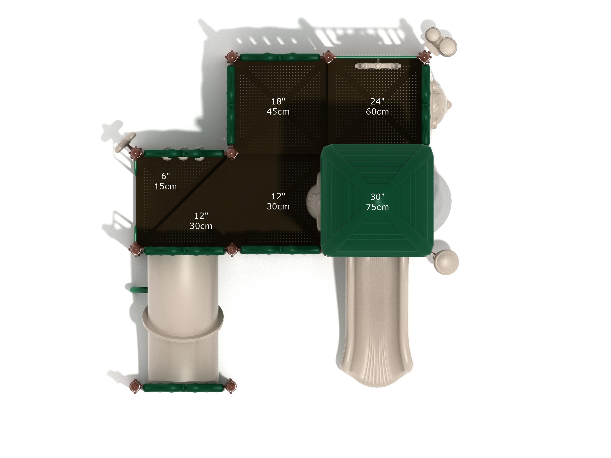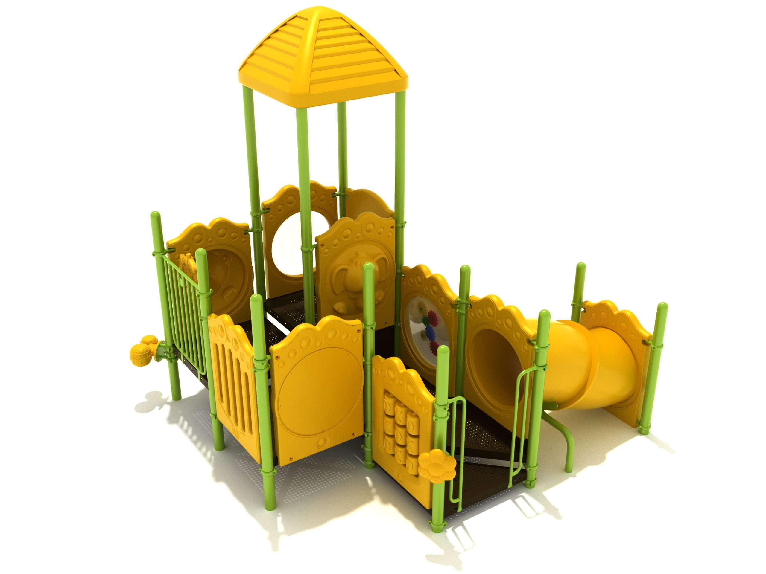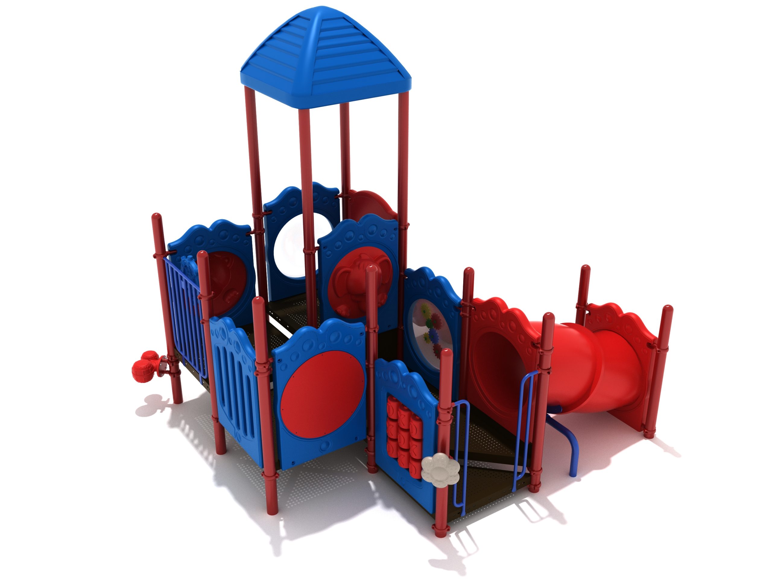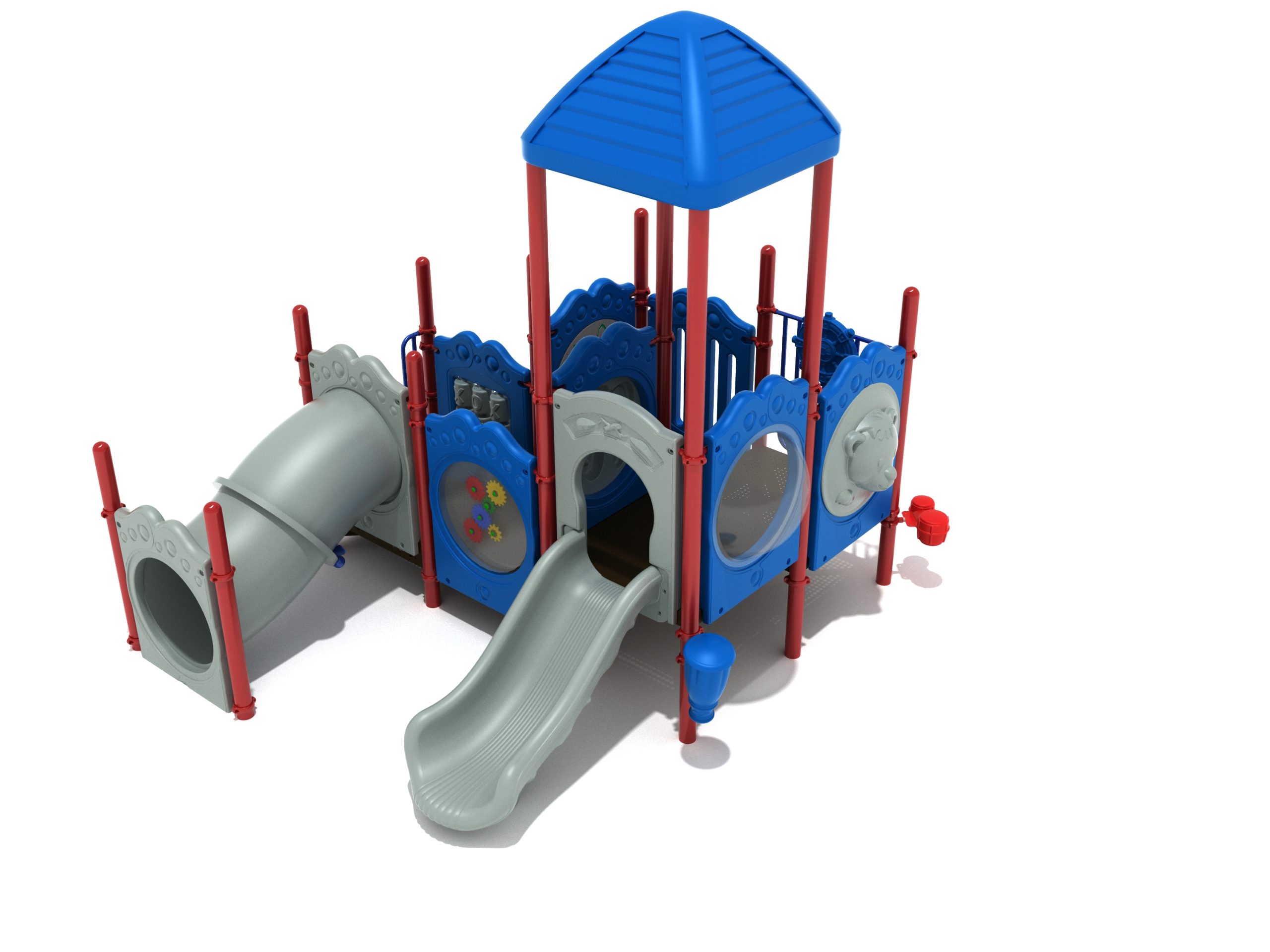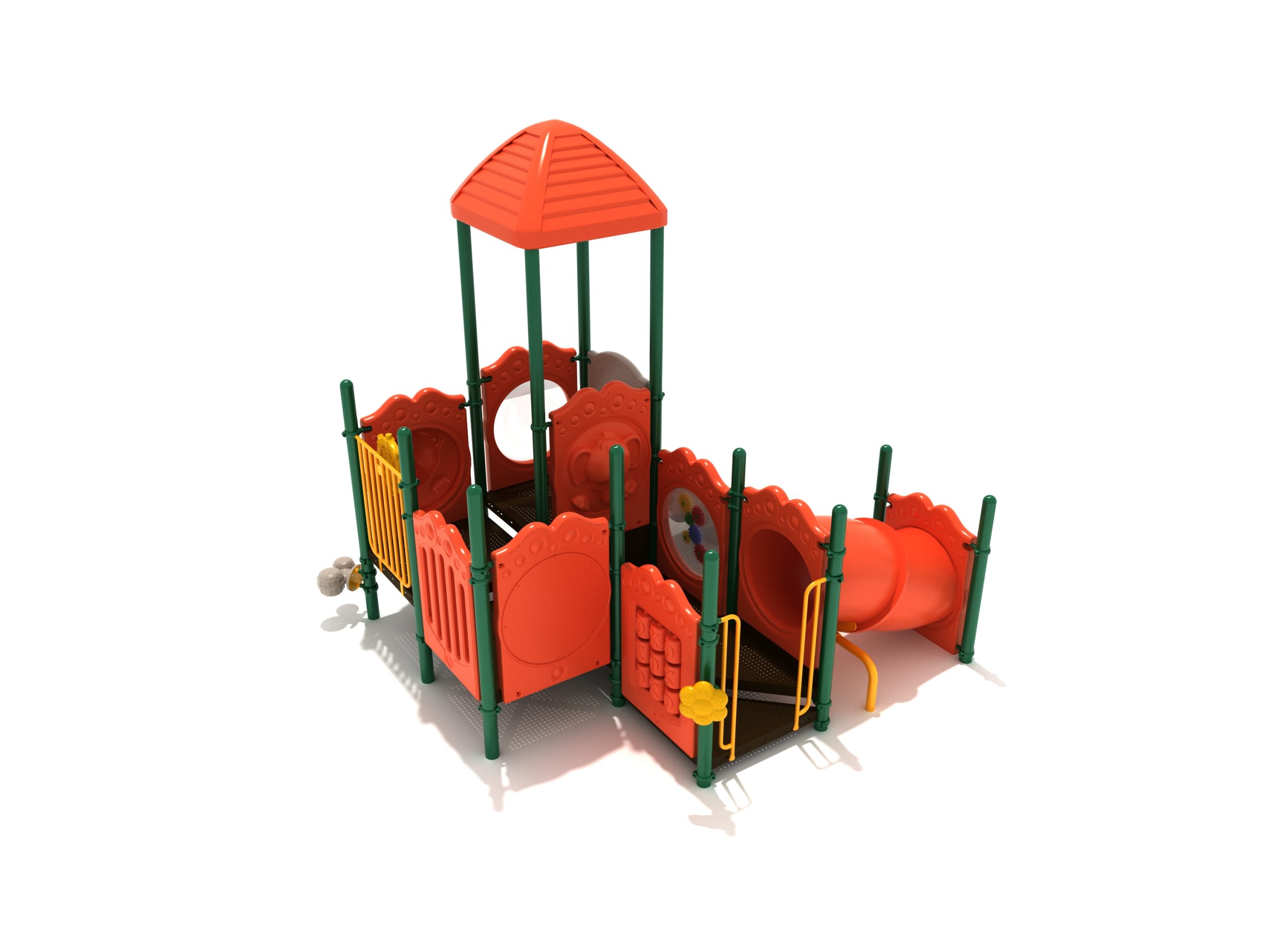 The Stamford play center is jam-packed with interesting features designed to stimulate young minds. From problem-solving on the Tic Tac Toe Panel and Maze Panel to giggling at the Bear Panel and Elephant Panel which feature cute characters, children will love to explore this structure on their own or with an adult as the sides are low enough to reach over and keep an eye on them. There’s a Metal Barrier with Ship’s Wheel attached which spins around to steer the fun in any creative way they want, and kids who love music will be drawn to features like the Rain Wheel, Bongos and Single Drum. There’s an Incline Tube Bridge to encourage crawling and you can pop your head out at the other end to give them a surprise as they pass through. A Straight Slide leads down from the main platform, but before they do you can guarantee they’re going to want a quick game of peek-a-boo at the Bubble Panel window.
