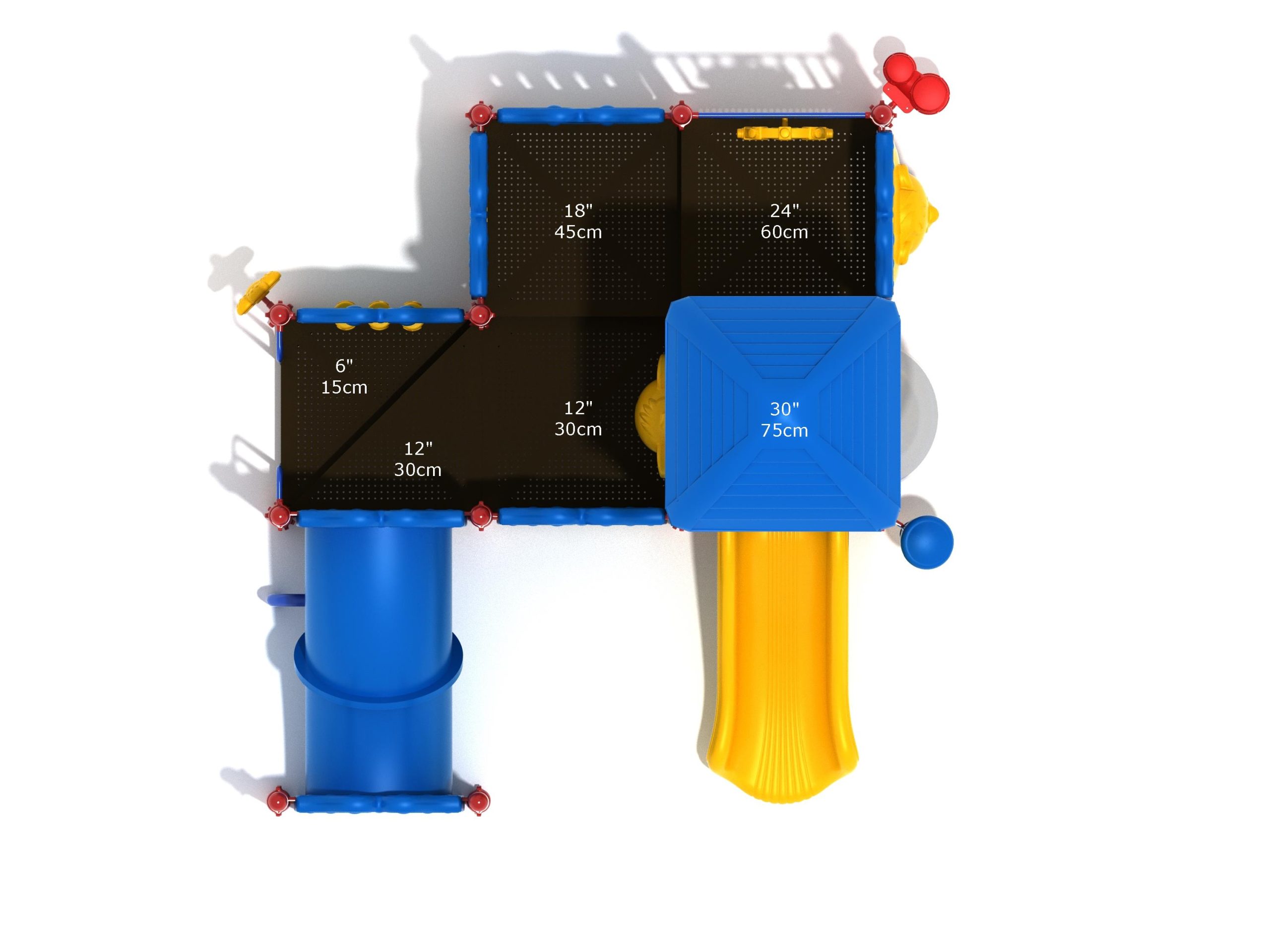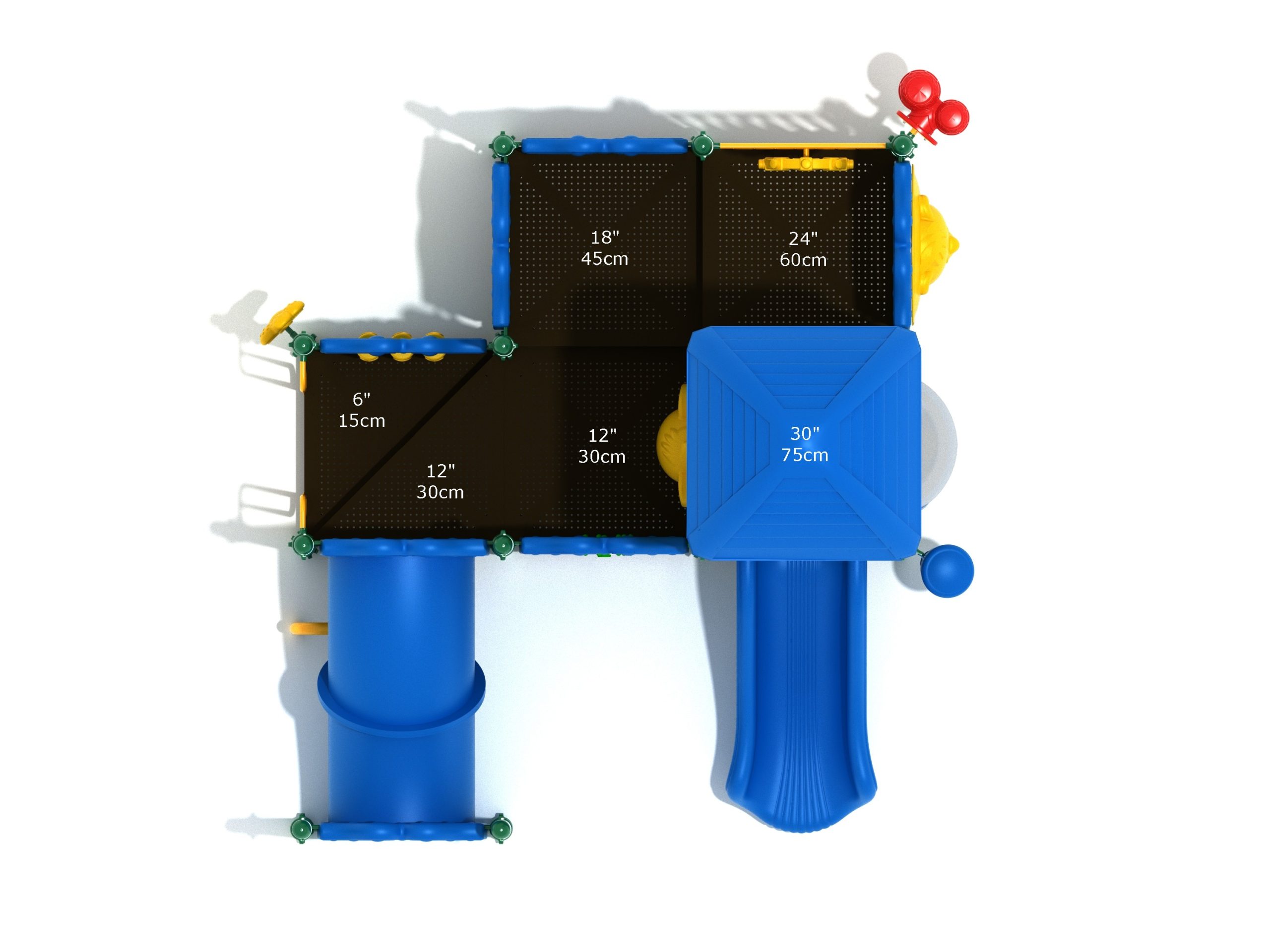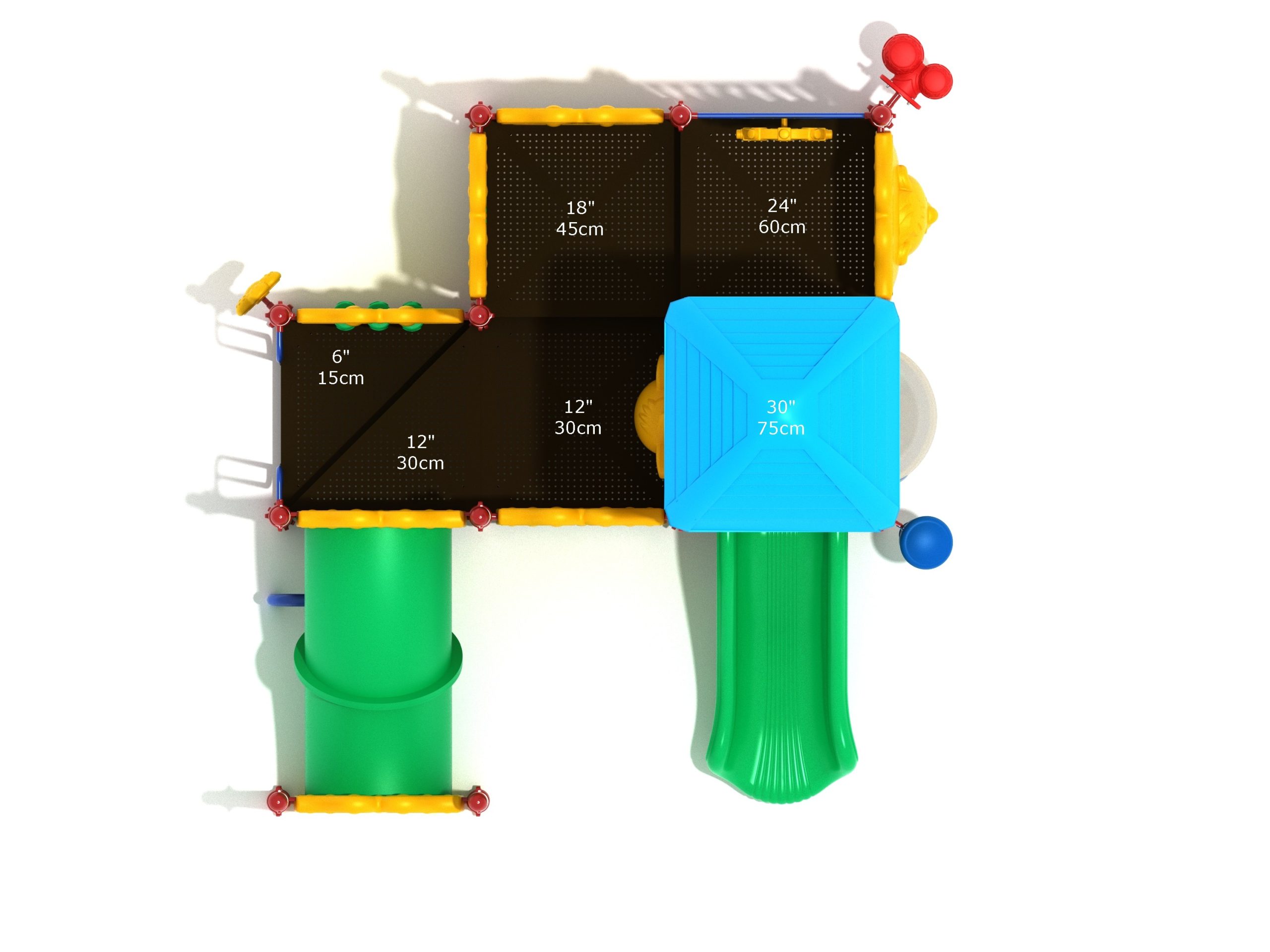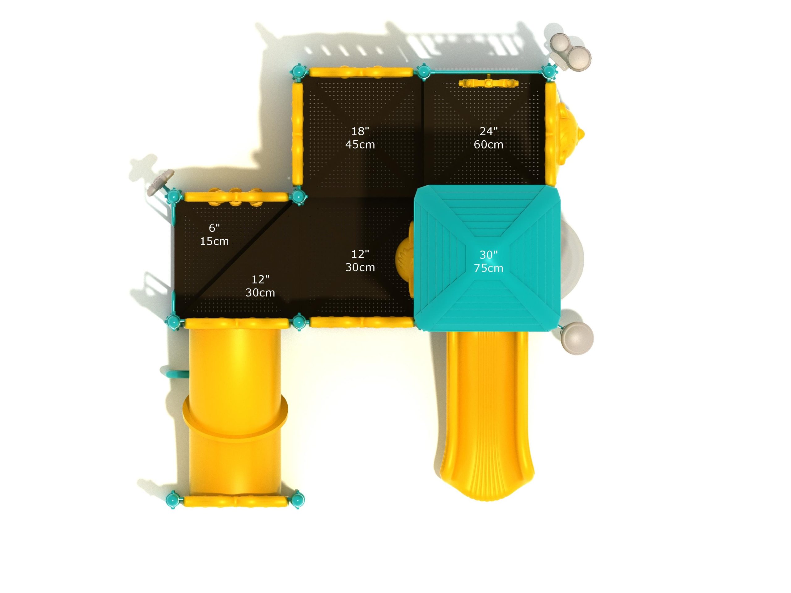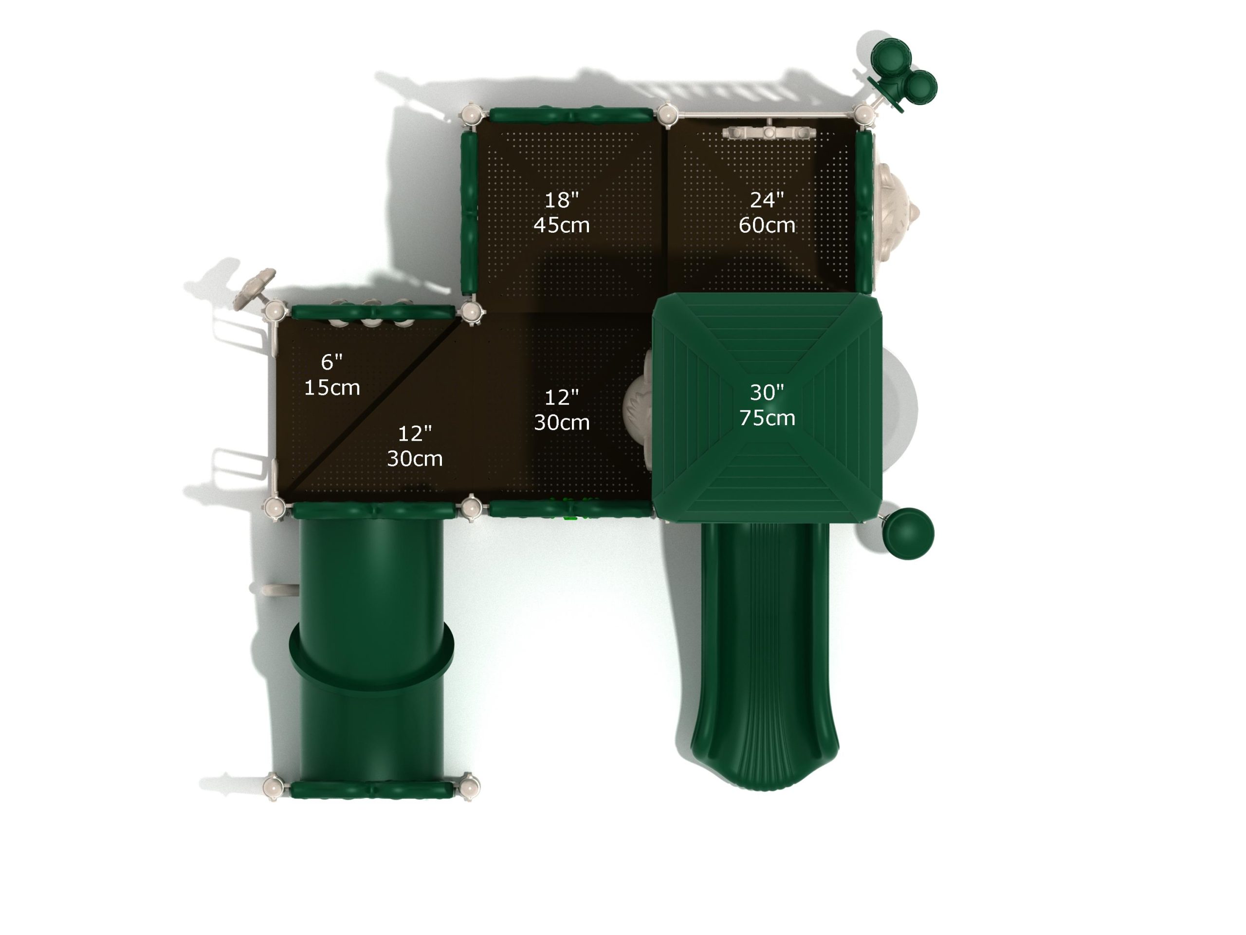 The Stamford play center is jam-packed with interesting features designed to stimulate young minds. From problem-solving on the Tic Tac Toe Panel and Maze Panel to giggling at the Bear Panel and Elephant Panel which feature cute characters, children will love to explore this structure on their own or with an adult as the sides are low enough to reach over and keep an eye on them. There’s a Metal Barrier with Ship’s Wheel attached which spins around to steer the fun in any creative way they want, and kids who love music will be drawn to features like the Rain Wheel, Bongos and Single Drum. There’s an Incline Tube Bridge to encourage crawling and you can pop your head out at the other end to give them a surprise as they pass through. A Straight Slide leads down from the main platform, but before they do you can guarantee they’re going to want a quick game of peek-a-boo at the Bubble Panel window.