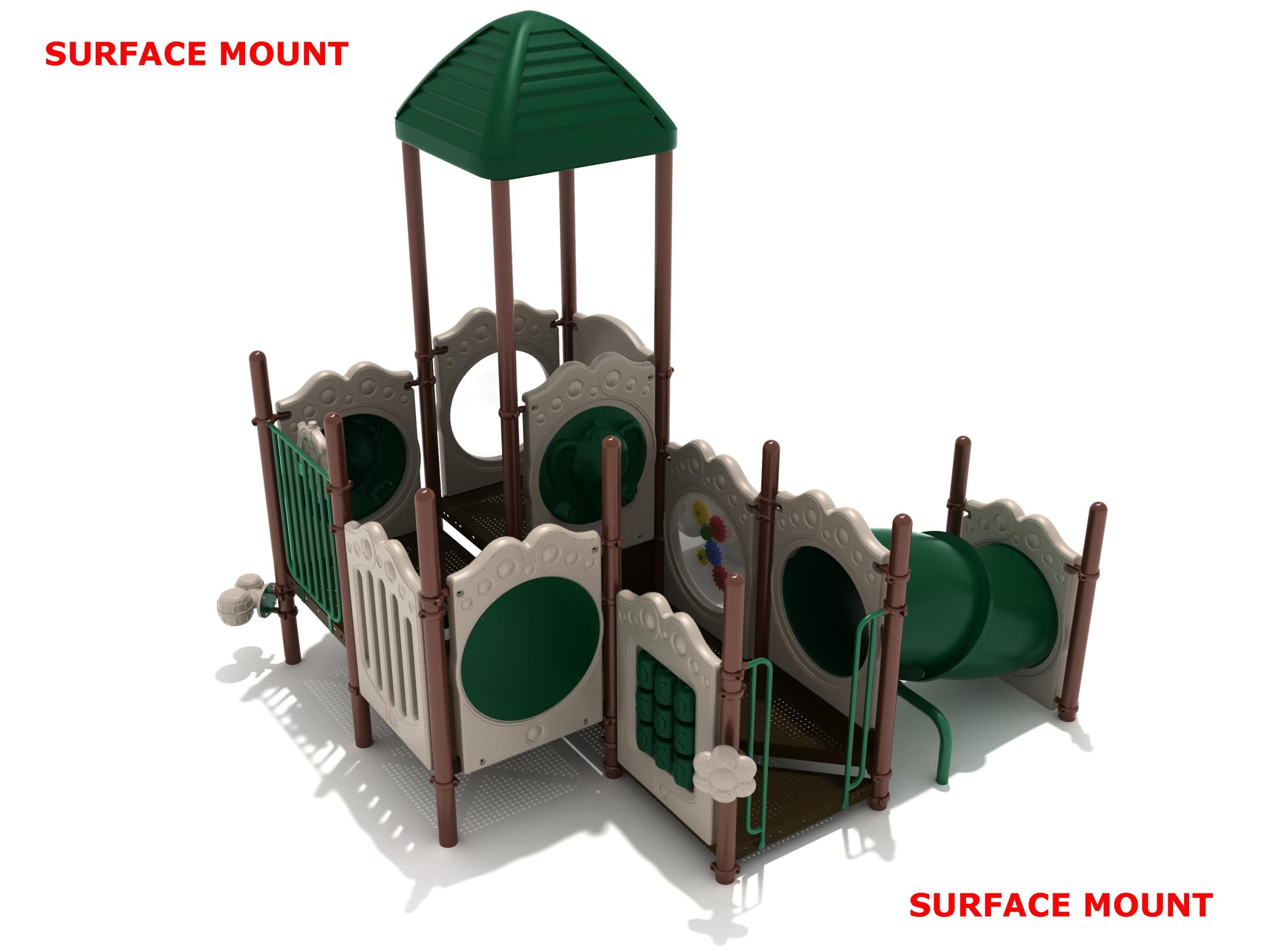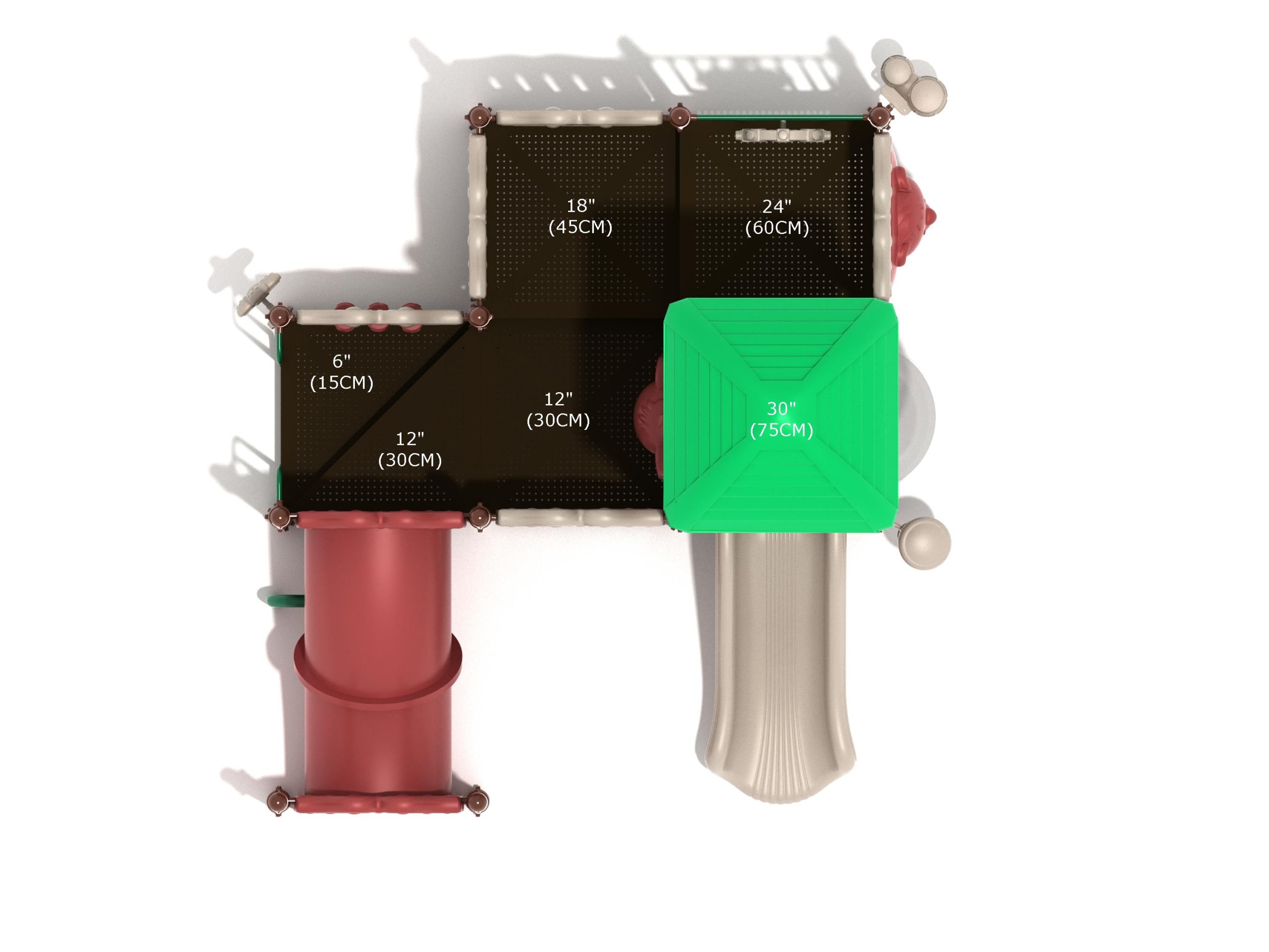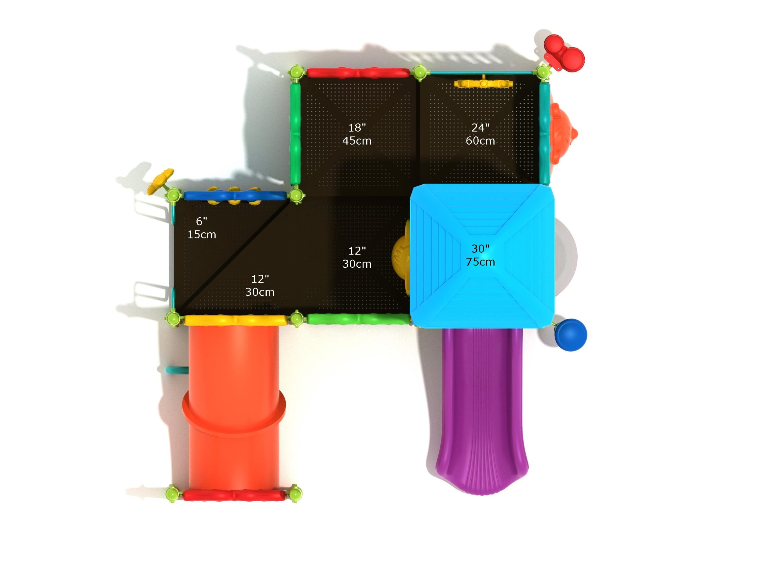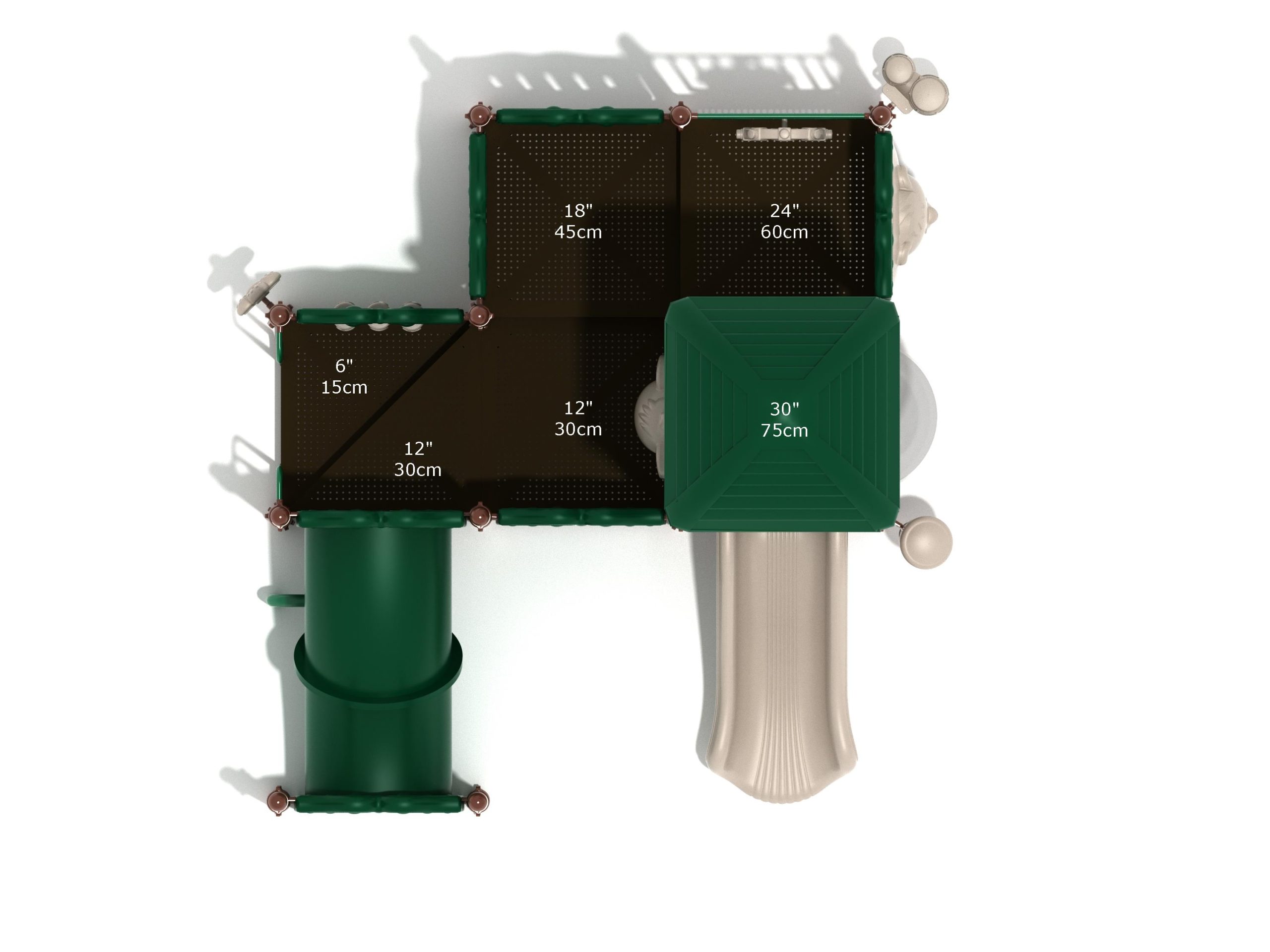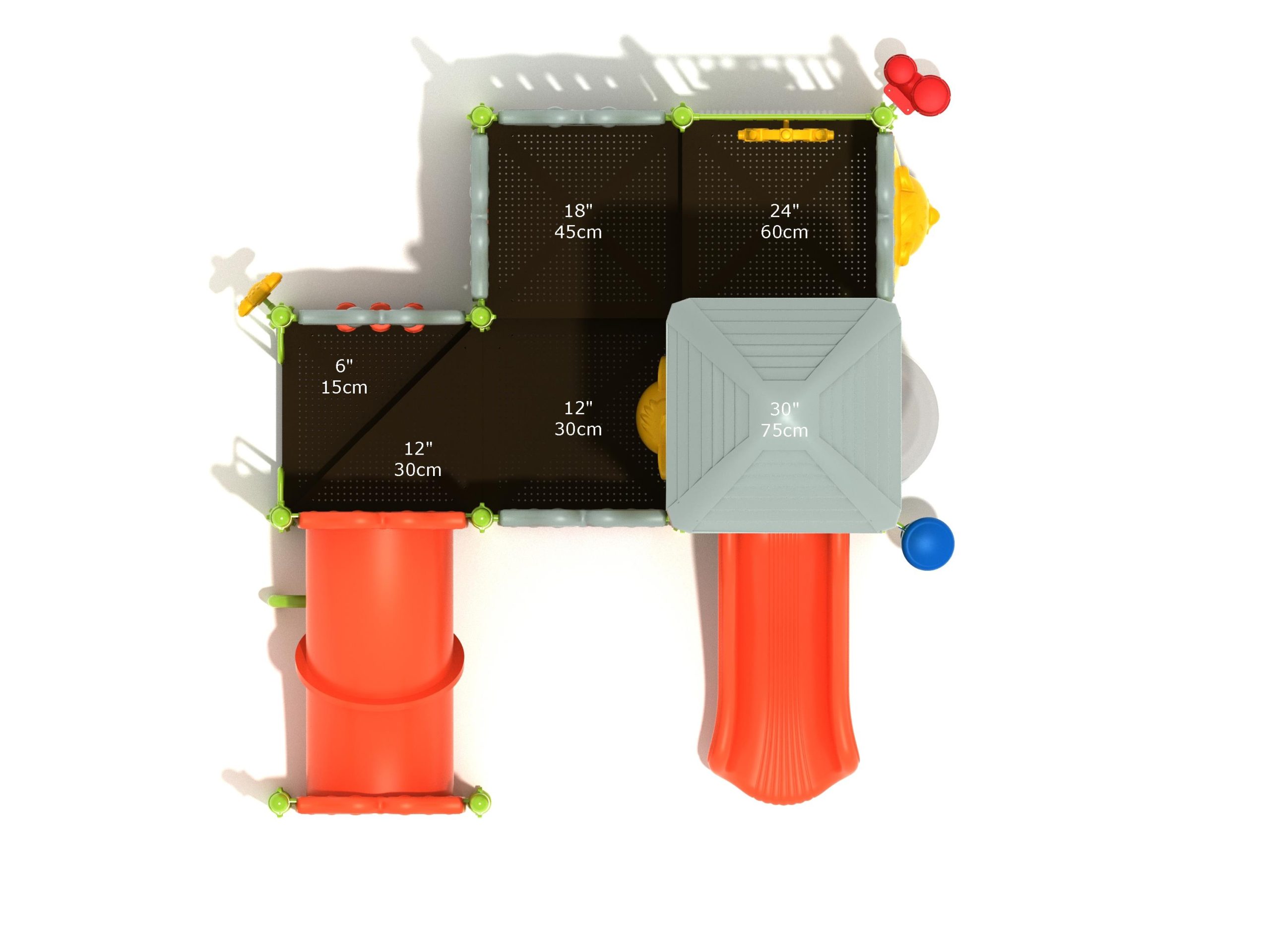 The Stamford play center is jam-packed with interesting features designed to stimulate young minds. From problem-solving on the Tic Tac Toe Panel and Maze Panel to giggling at the Bear Panel and Elephant Panel which feature cute characters, children will love to explore this structure on their own or with an adult as the sides are low enough to reach over and keep an eye on them. There’s a Metal Barrier with Ship’s Wheel attached which spins around to steer the fun in any creative way they want, and kids who love music will be drawn to features like the Rain Wheel, Bongos and Single Drum. There’s an Incline Tube Bridge to encourage crawling and you can pop your head out at the other end to give them a surprise as they pass through. A Straight Slide leads down from the main platform, but before they do you can guarantee they’re going to want a quick game of peek-a-boo at the Bubble Panel window.
