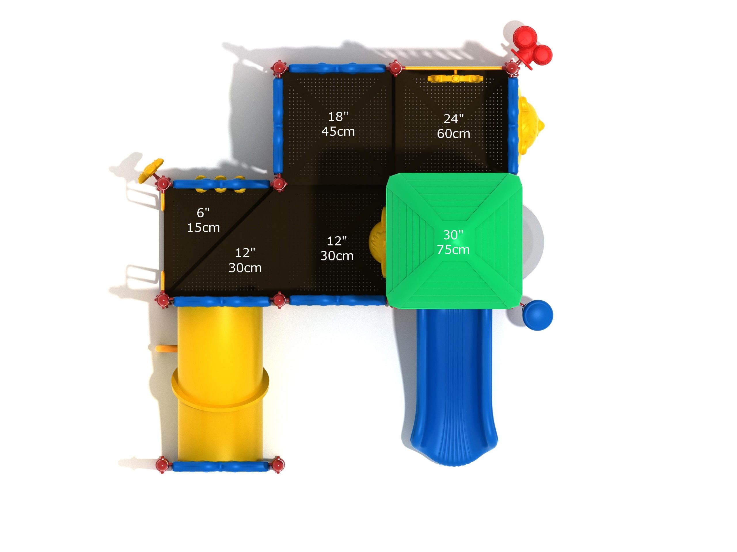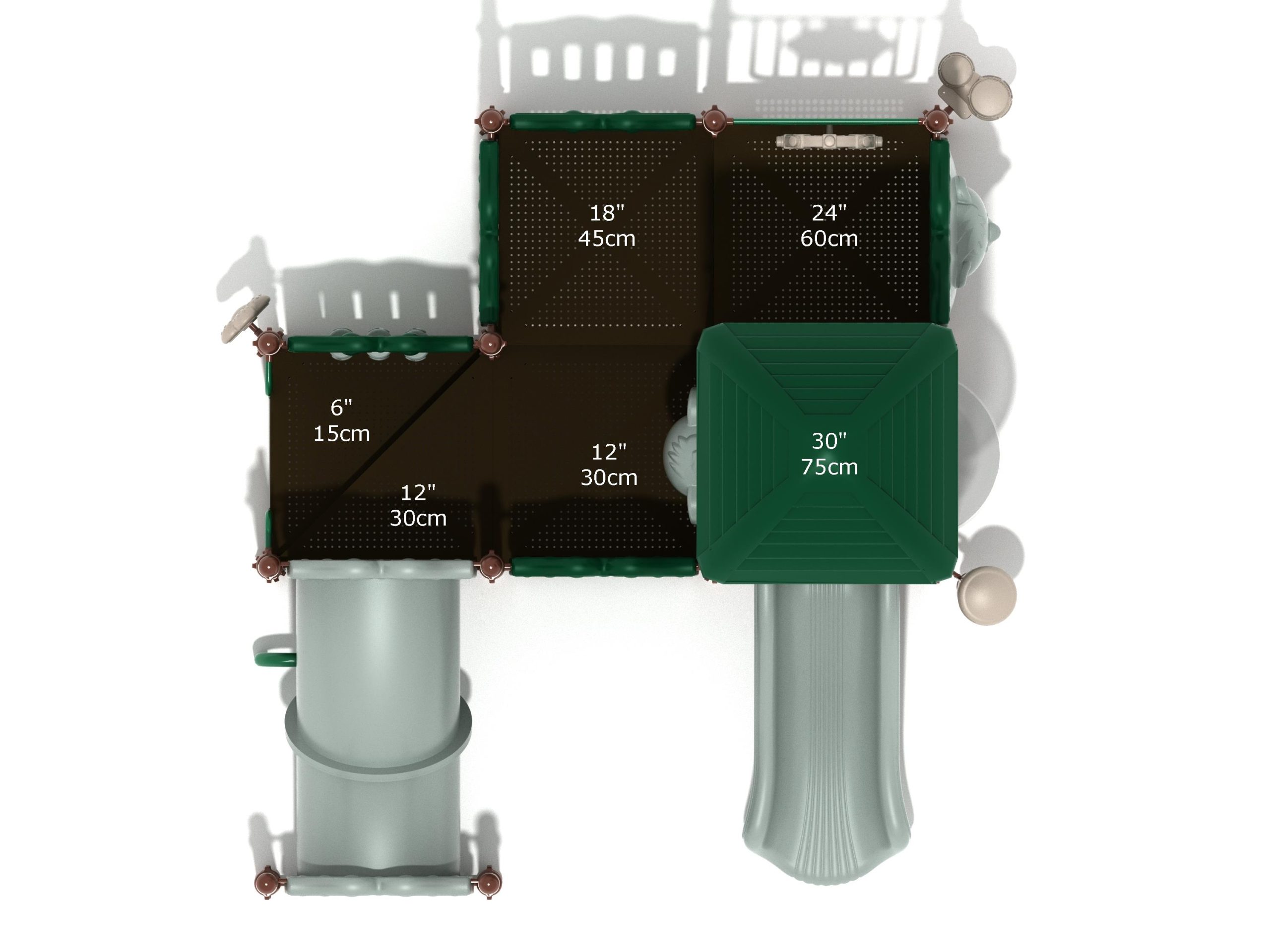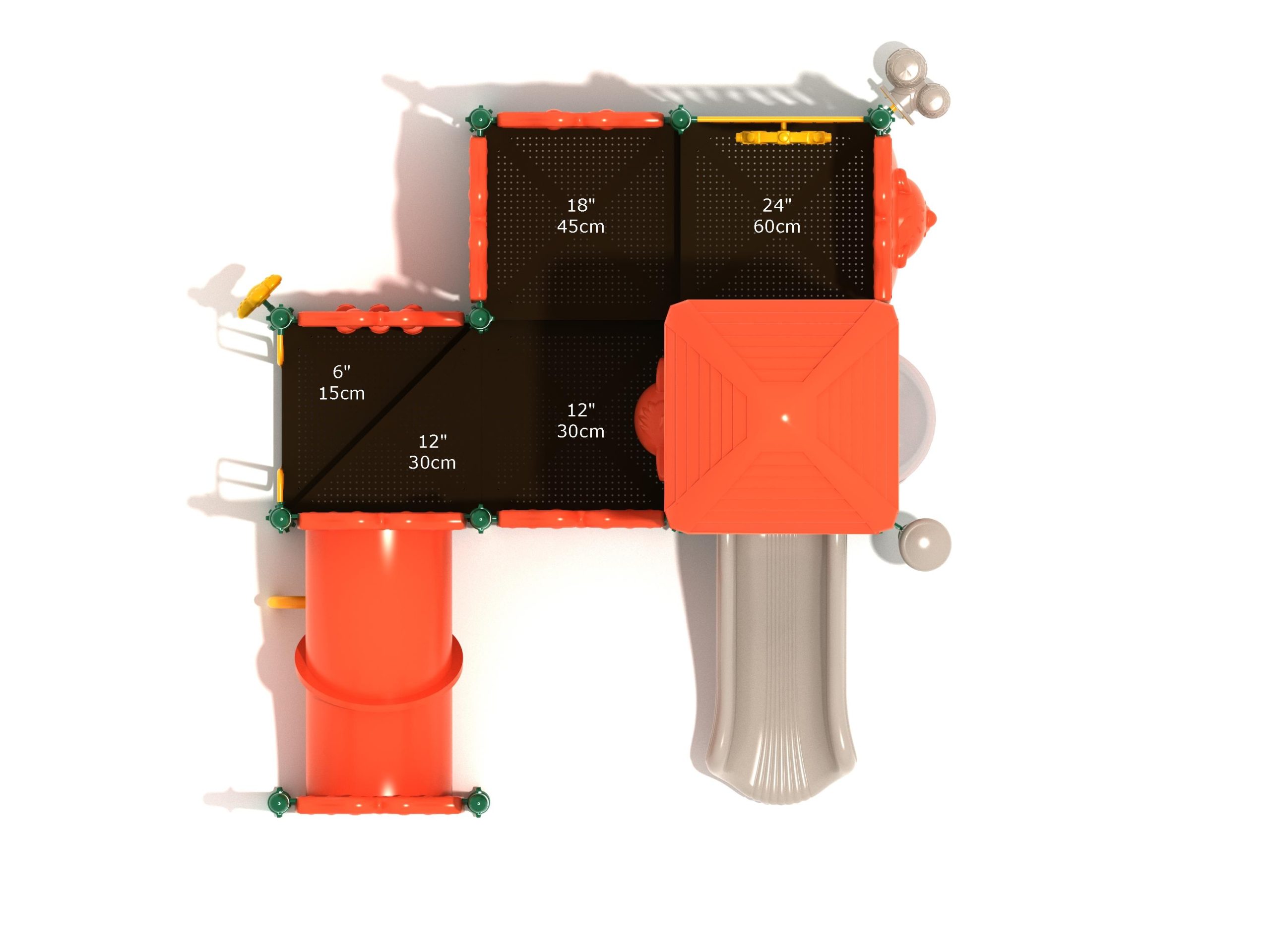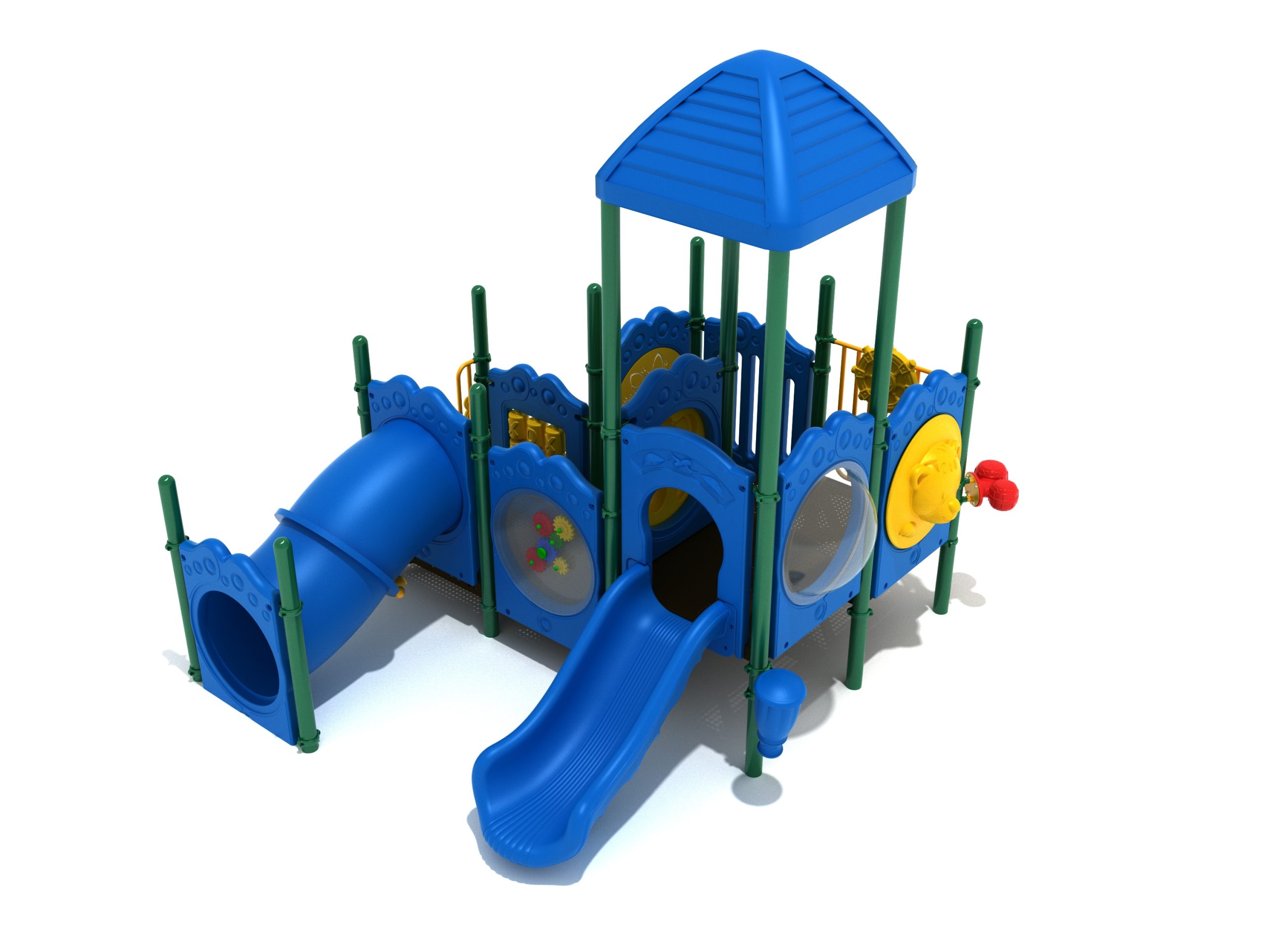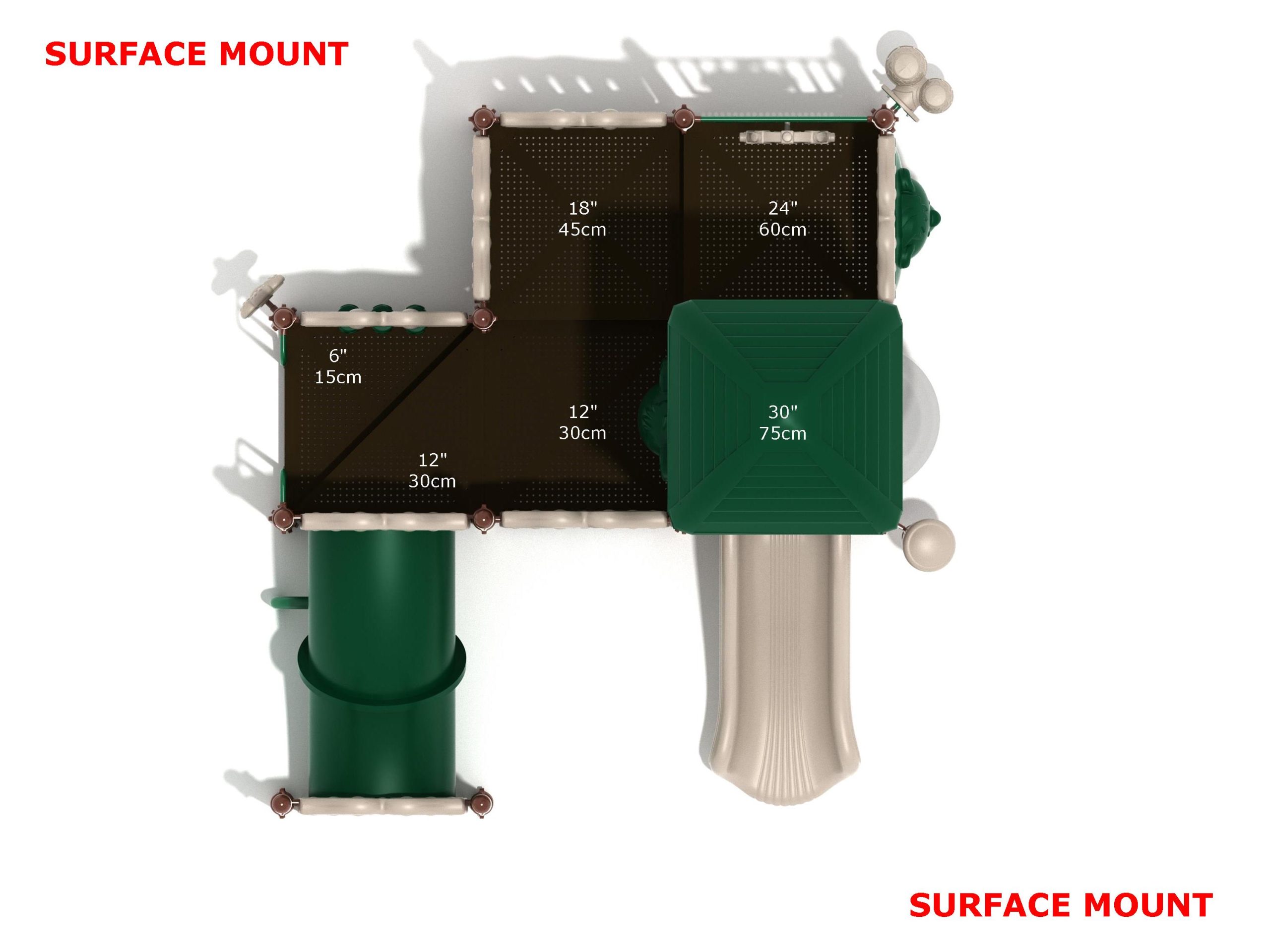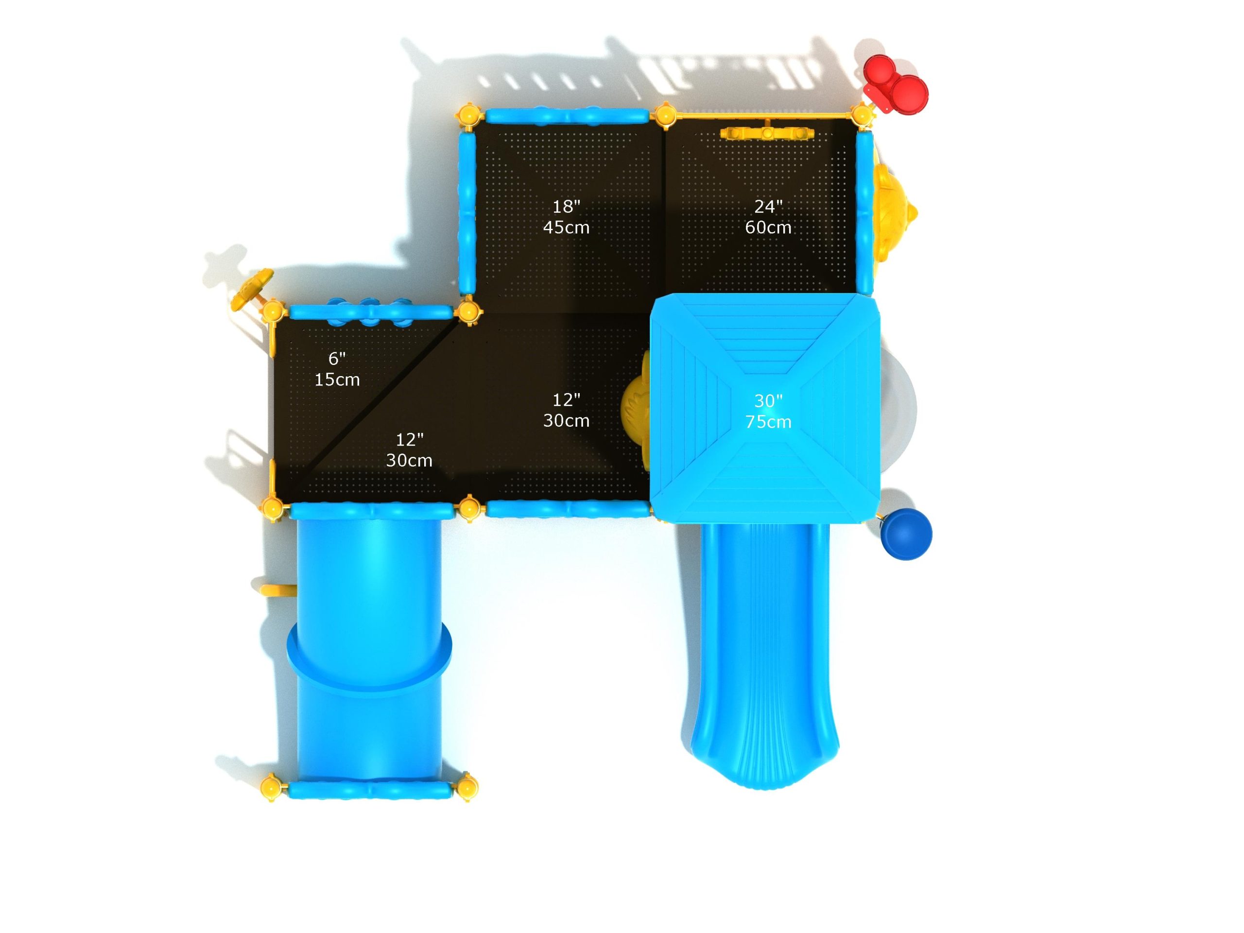 The Stamford play center is jam-packed with interesting features designed to stimulate young minds. From problem-solving on the Tic Tac Toe Panel and Maze Panel to giggling at the Bear Panel and Elephant Panel which feature cute characters, children will love to explore this structure on their own or with an adult as the sides are low enough to reach over and keep an eye on them. There’s a Metal Barrier with Ship’s Wheel attached which spins around to steer the fun in any creative way they want, and kids who love music will be drawn to features like the Rain Wheel, Bongos and Single Drum. There’s an Incline Tube Bridge to encourage crawling and you can pop your head out at the other end to give them a surprise as they pass through. A Straight Slide leads down from the main platform, but before they do you can guarantee they’re going to want a quick game of peek-a-boo at the Bubble Panel window.