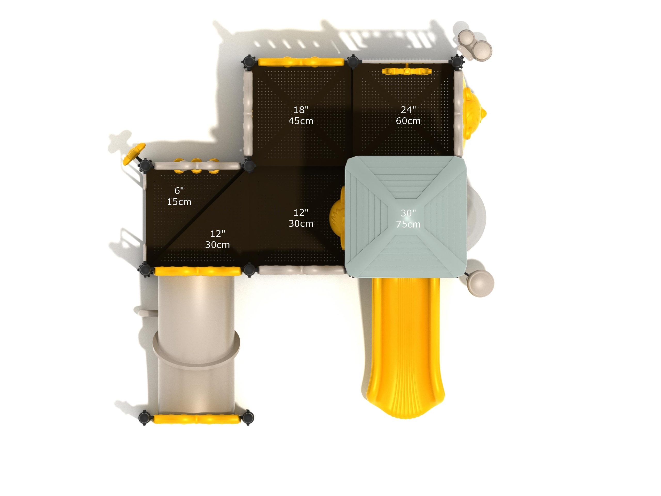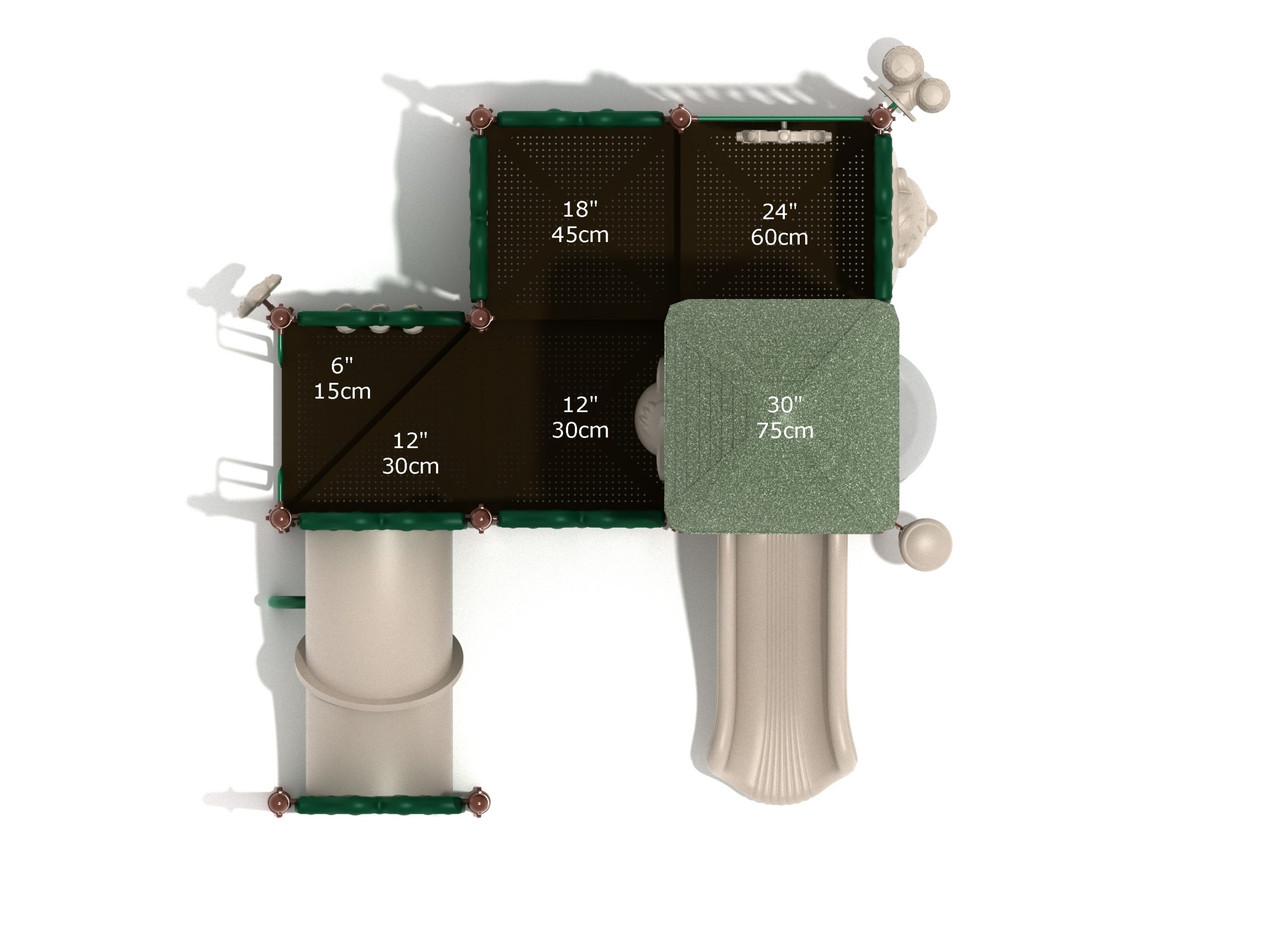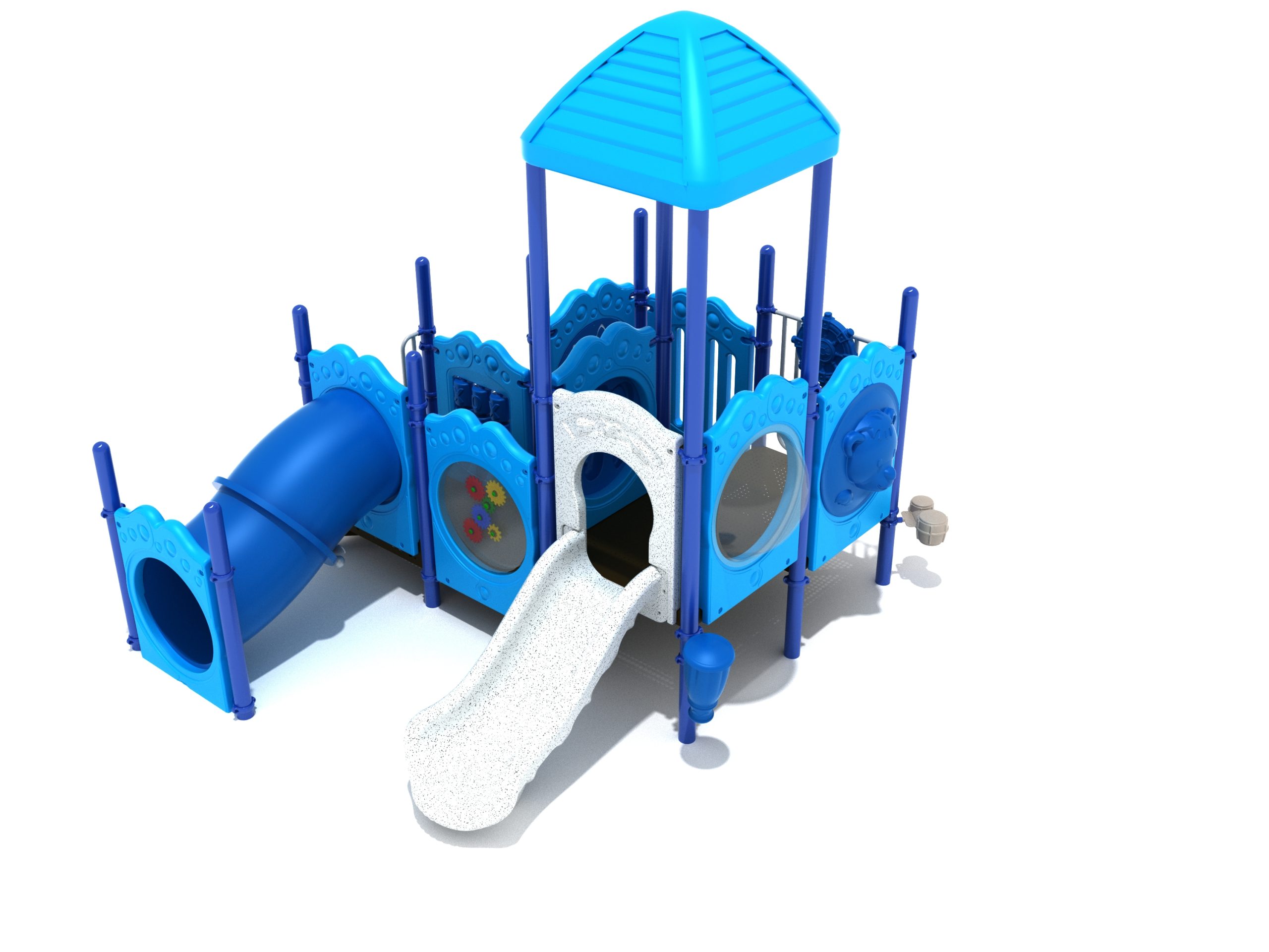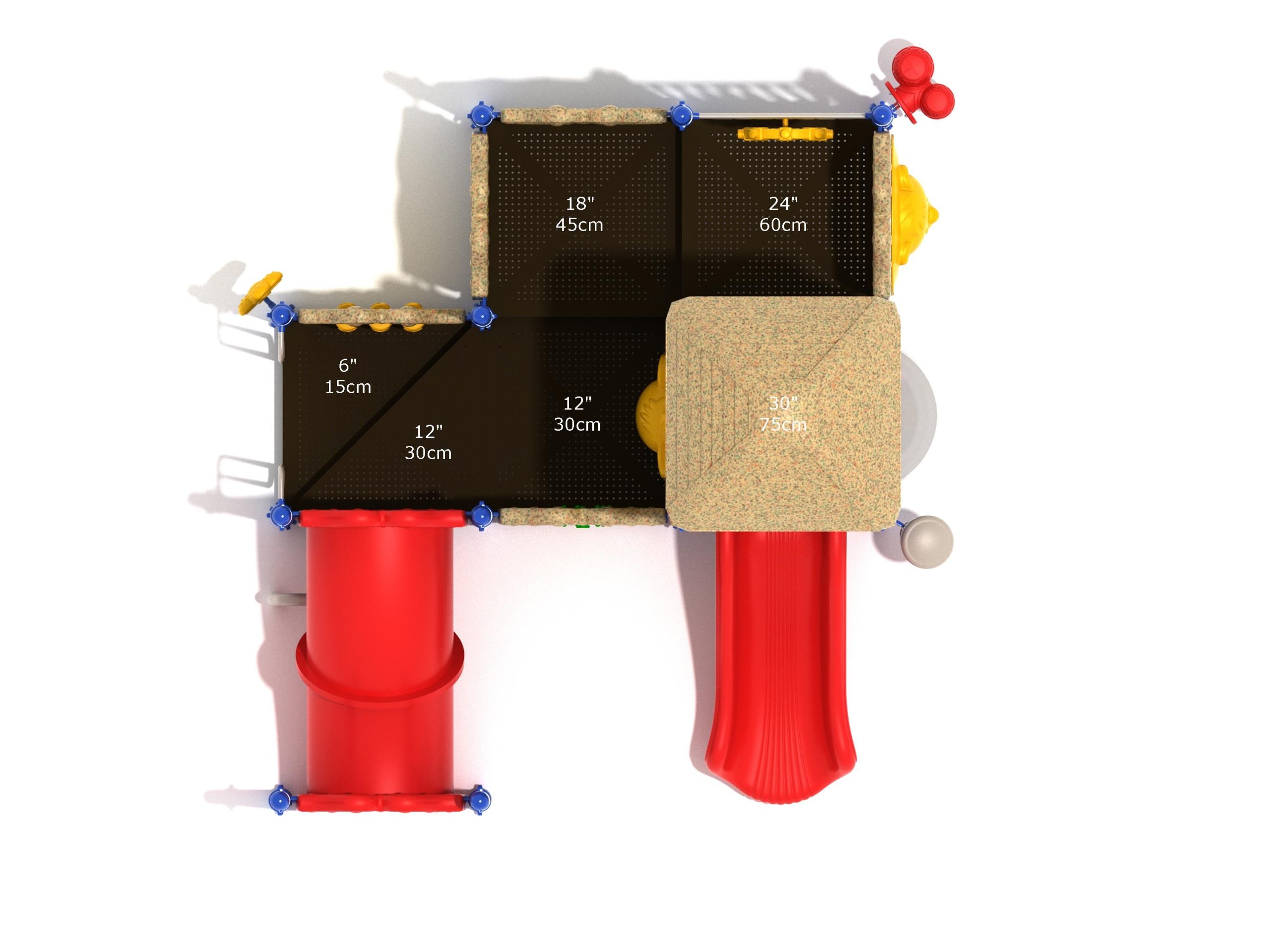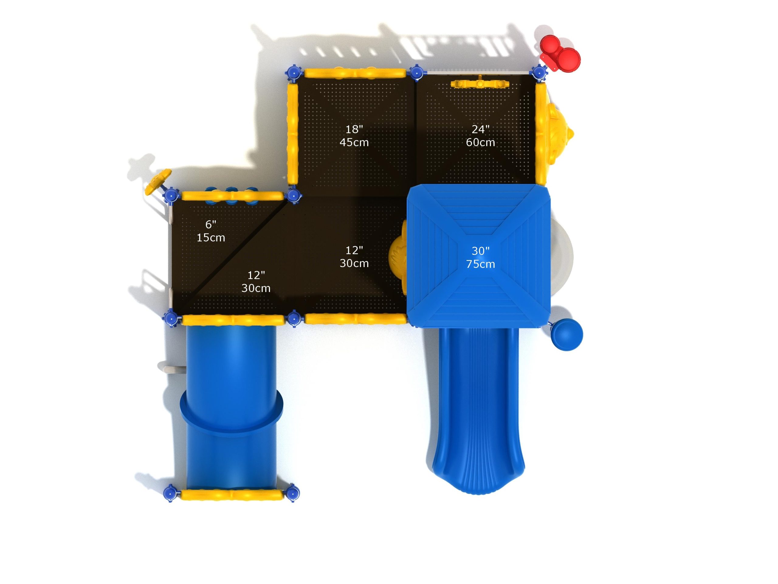 The Stamford play center is jam-packed with interesting features designed to stimulate young minds. From problem-solving on the Tic Tac Toe Panel and Maze Panel to giggling at the Bear Panel and Elephant Panel which feature cute characters, children will love to explore this structure on their own or with an adult as the sides are low enough to reach over and keep an eye on them. There’s a Metal Barrier with Ship’s Wheel attached which spins around to steer the fun in any creative way they want, and kids who love music will be drawn to features like the Rain Wheel, Bongos and Single Drum. There’s an Incline Tube Bridge to encourage crawling and you can pop your head out at the other end to give them a surprise as they pass through. A Straight Slide leads down from the main platform, but before they do you can guarantee they’re going to want a quick game of peek-a-boo at the Bubble Panel window.
