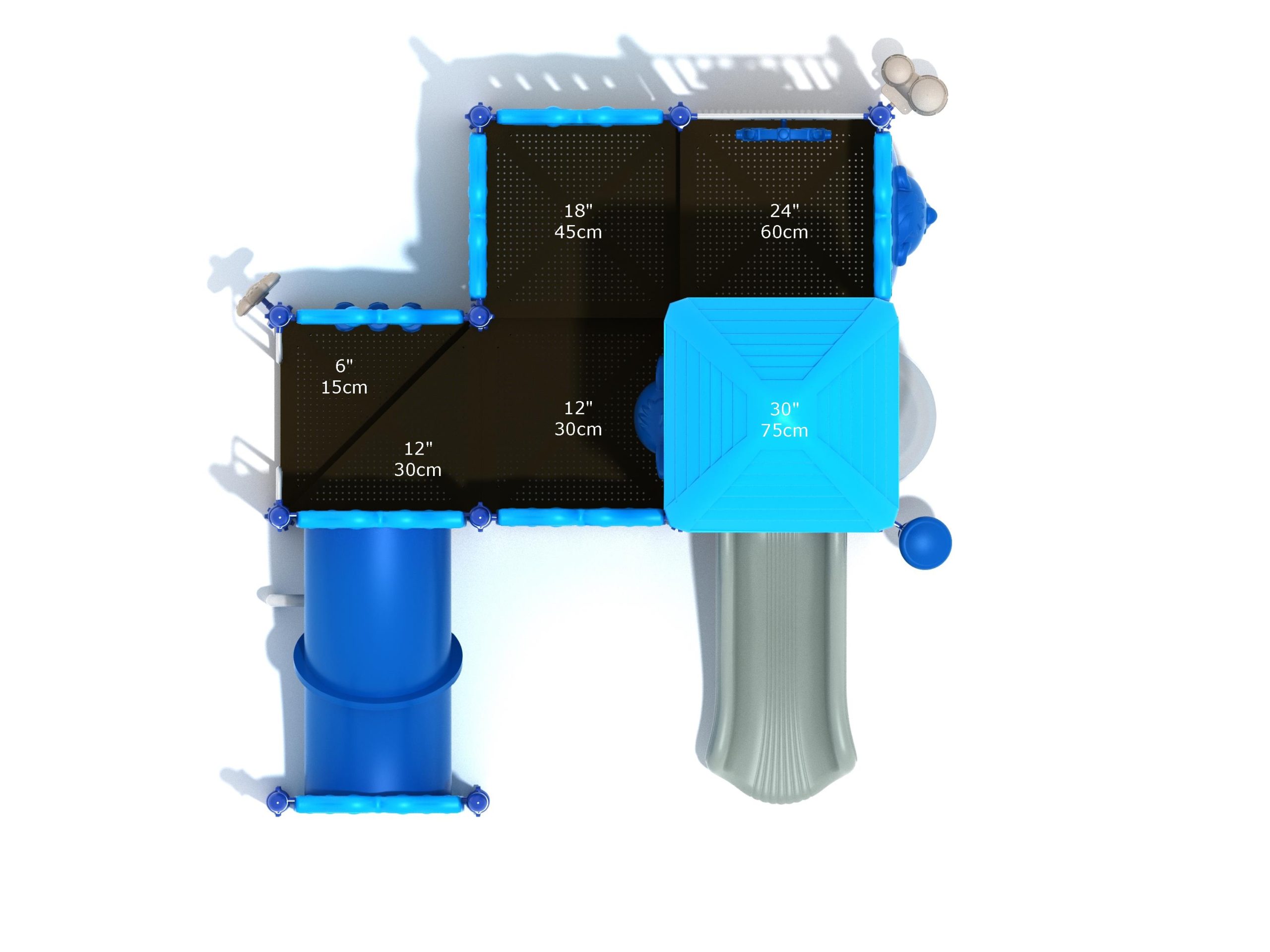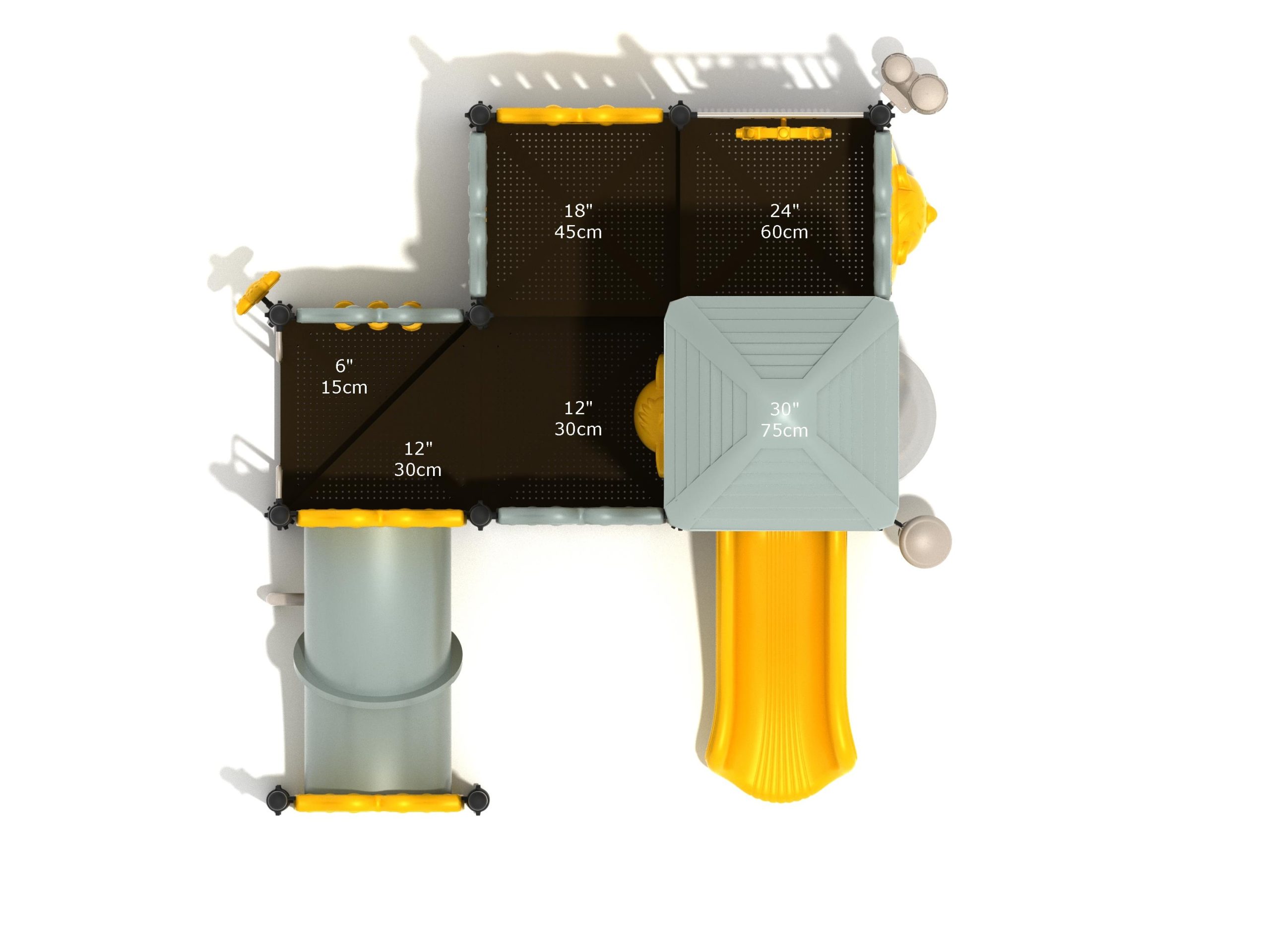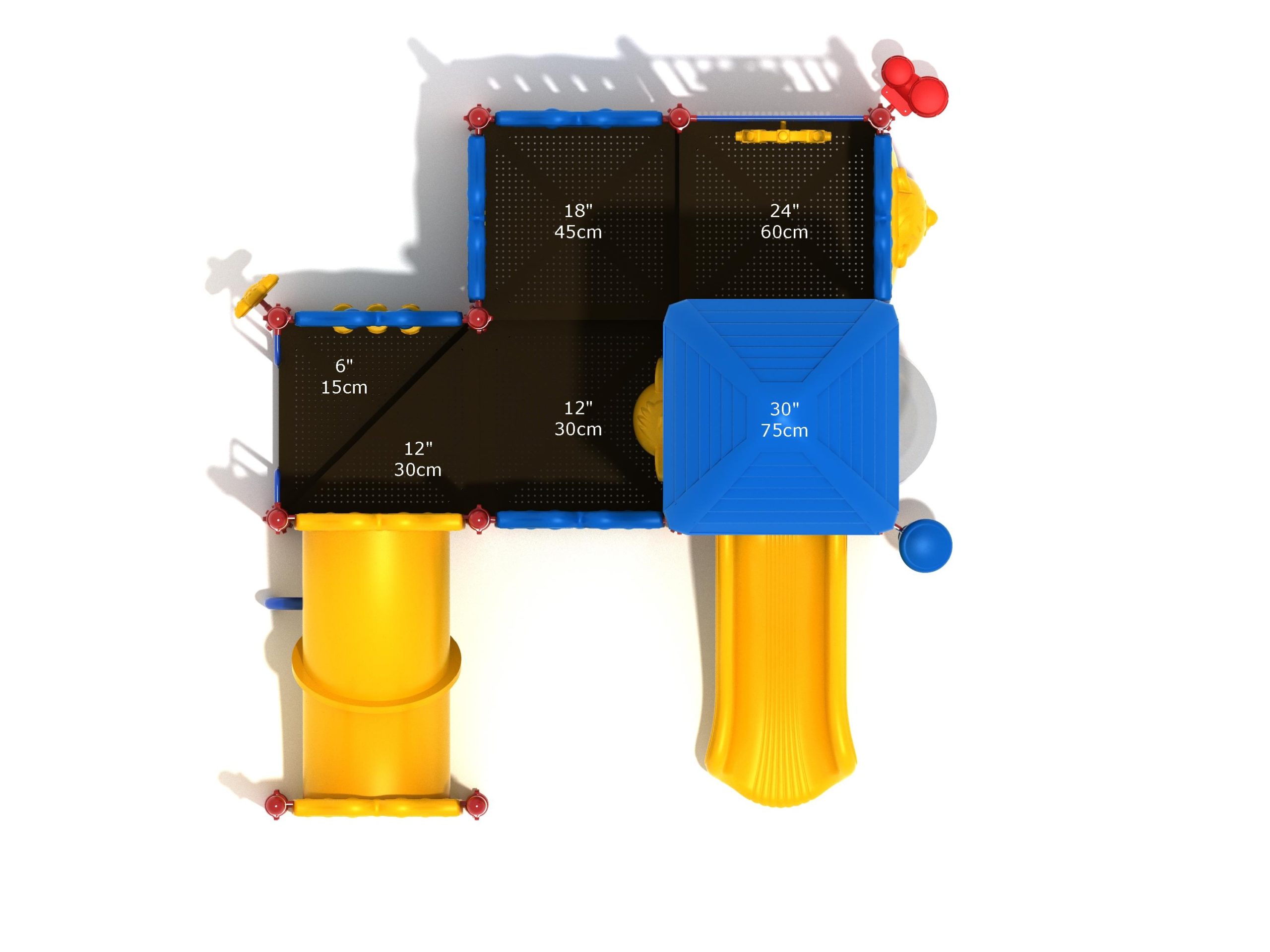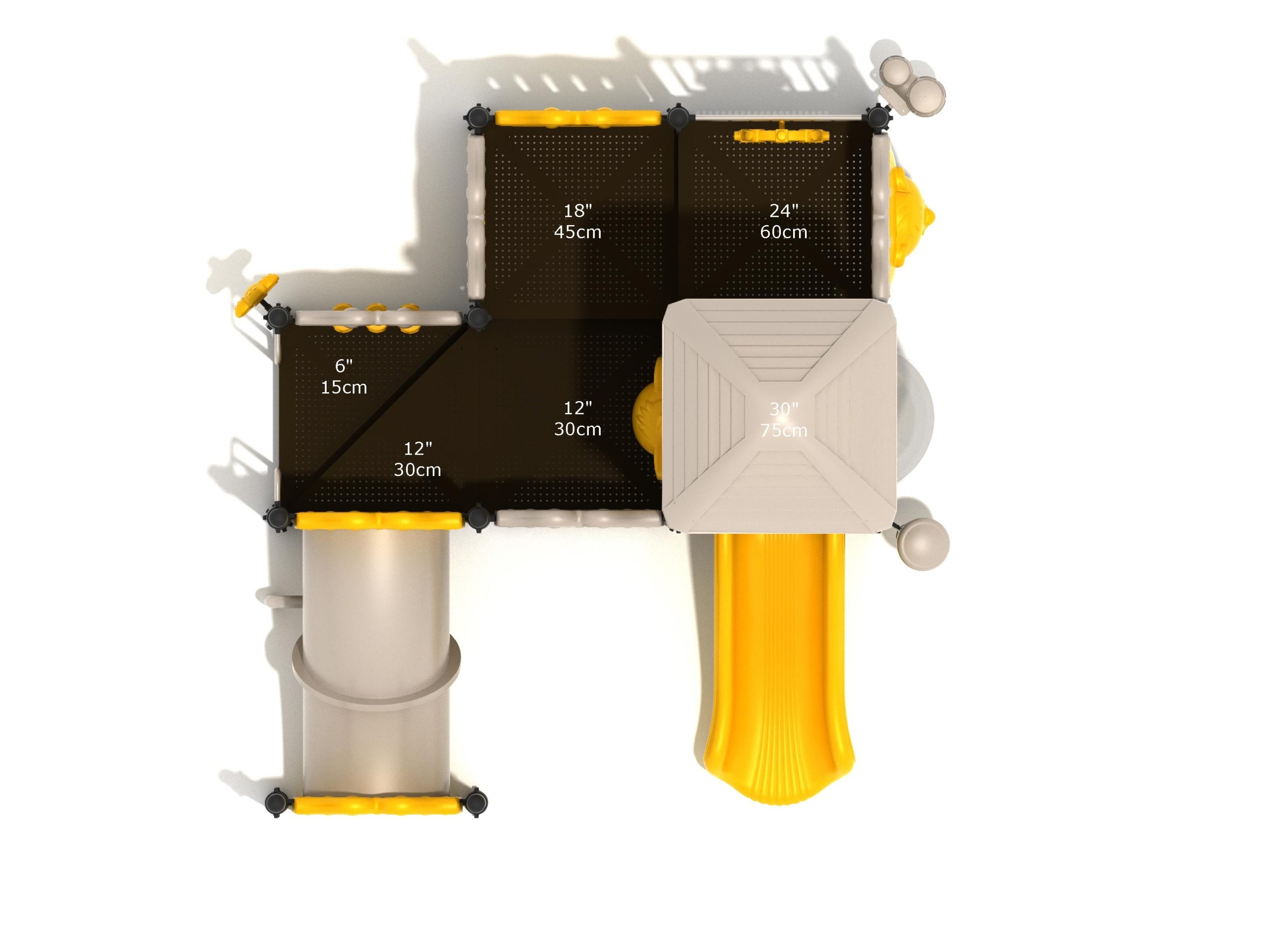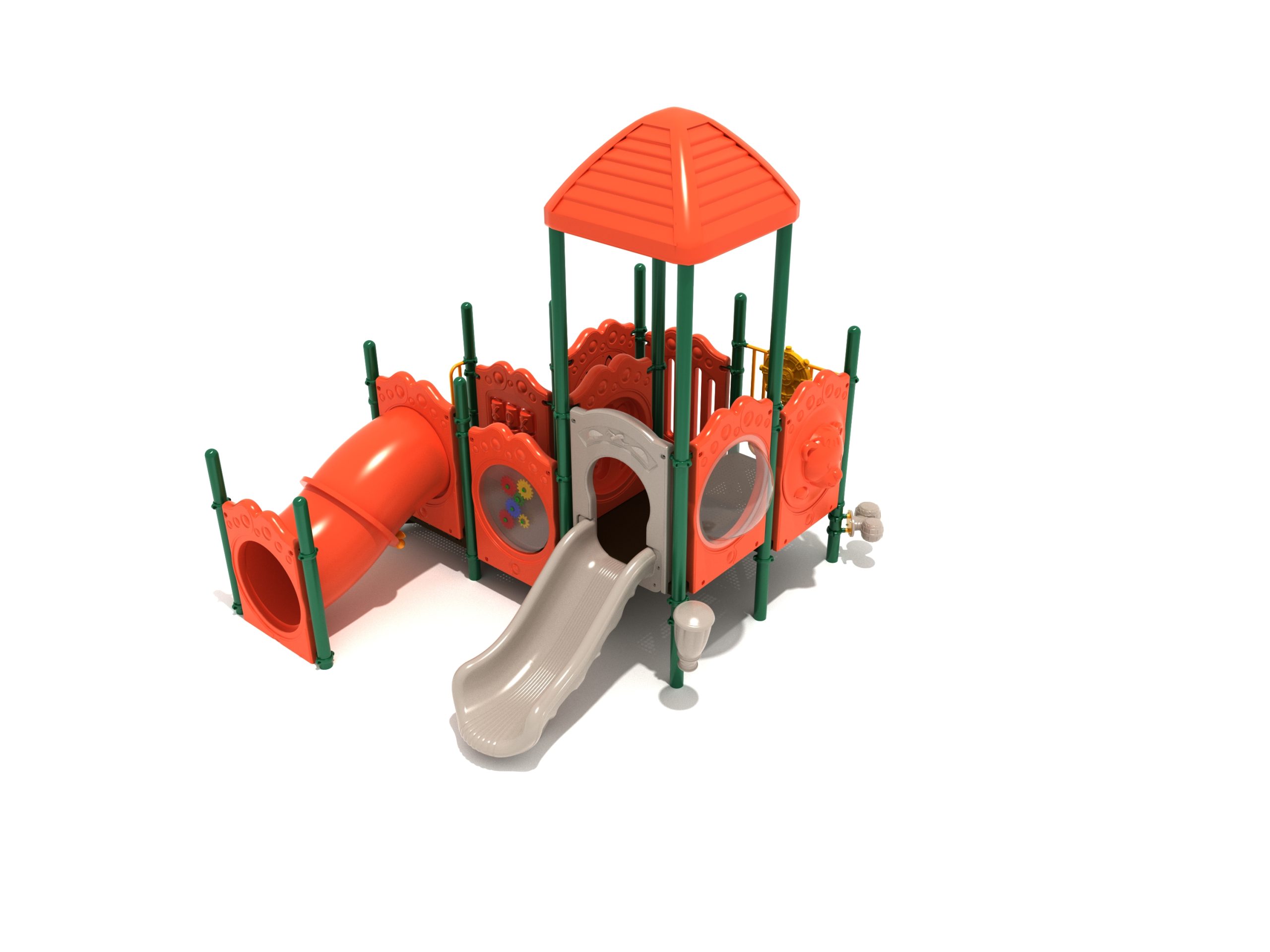 The Stamford play center is jam-packed with interesting features designed to stimulate young minds. From problem-solving on the Tic Tac Toe Panel and Maze Panel to giggling at the Bear Panel and Elephant Panel which feature cute characters, children will love to explore this structure on their own or with an adult as the sides are low enough to reach over and keep an eye on them. There’s a Metal Barrier with Ship’s Wheel attached which spins around to steer the fun in any creative way they want, and kids who love music will be drawn to features like the Rain Wheel, Bongos and Single Drum. There’s an Incline Tube Bridge to encourage crawling and you can pop your head out at the other end to give them a surprise as they pass through. A Straight Slide leads down from the main platform, but before they do you can guarantee they’re going to want a quick game of peek-a-boo at the Bubble Panel window.