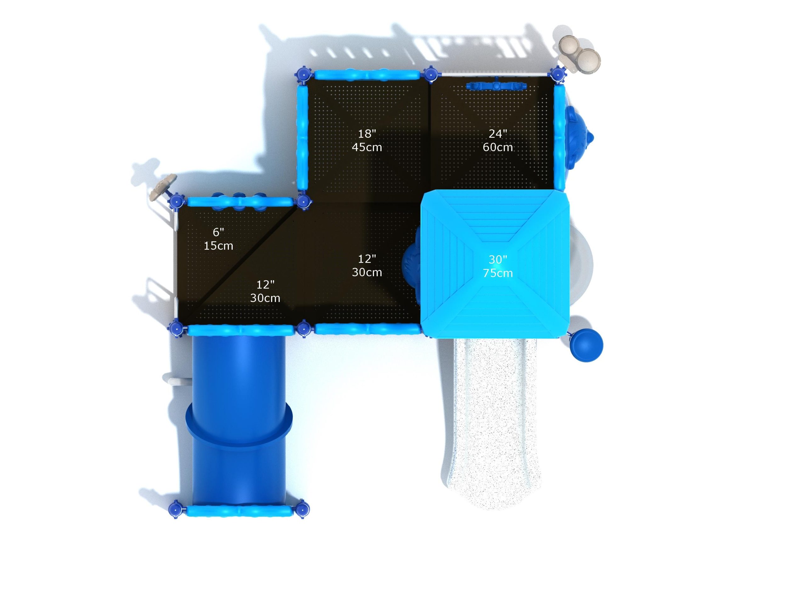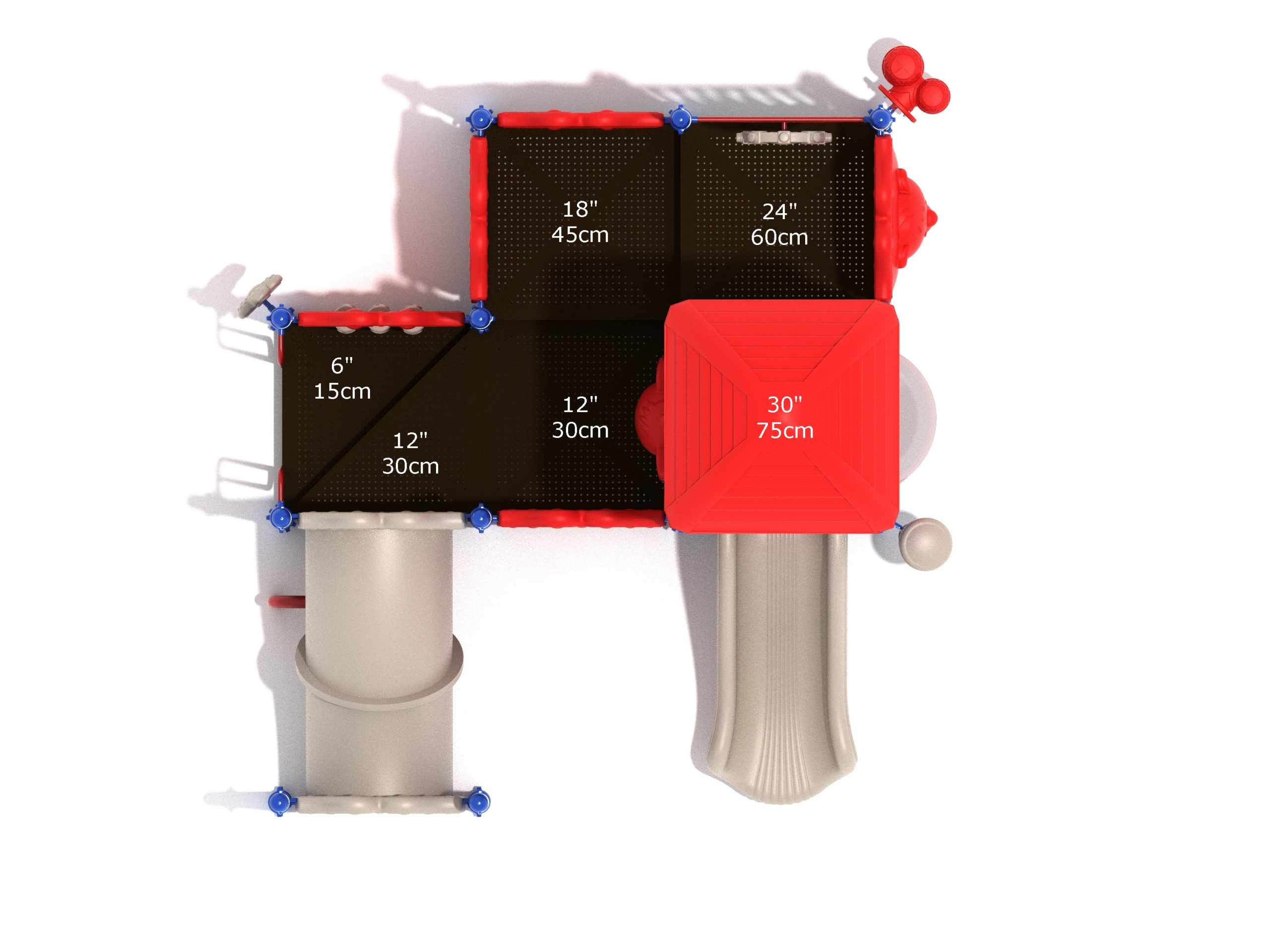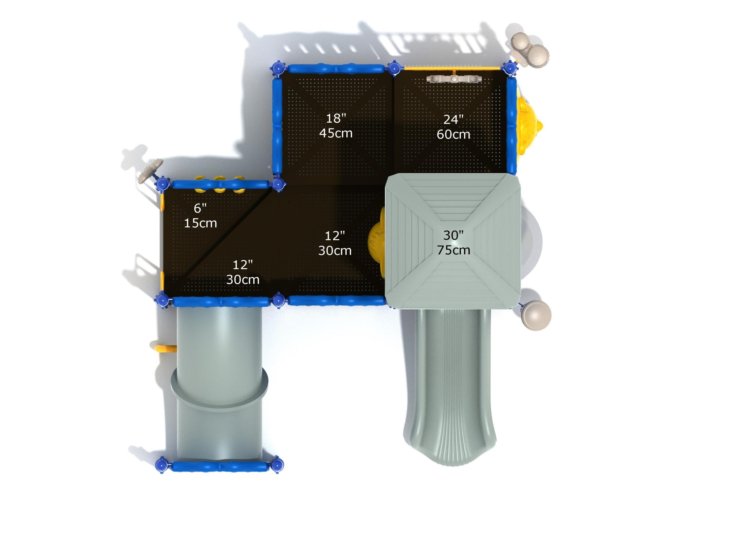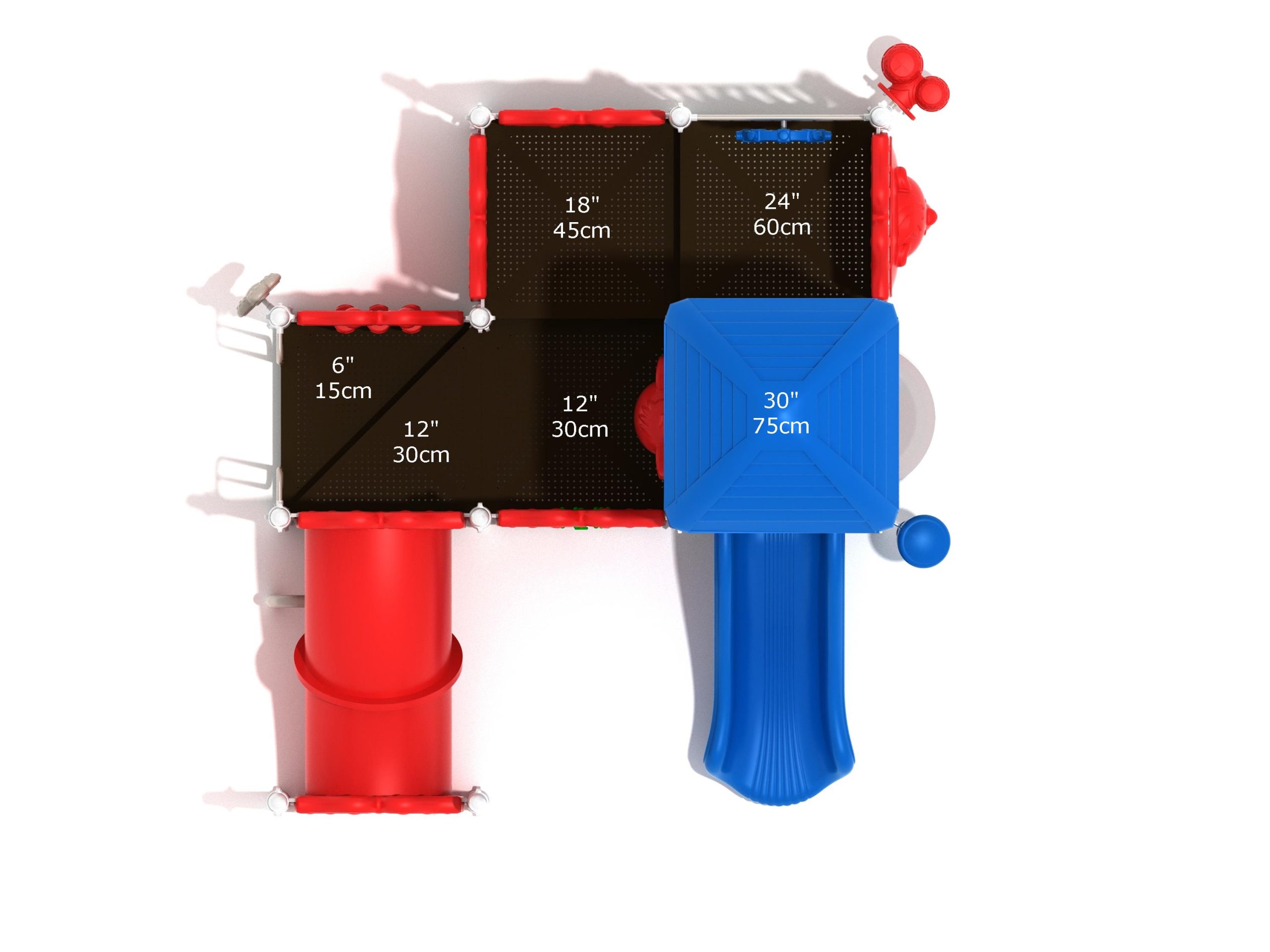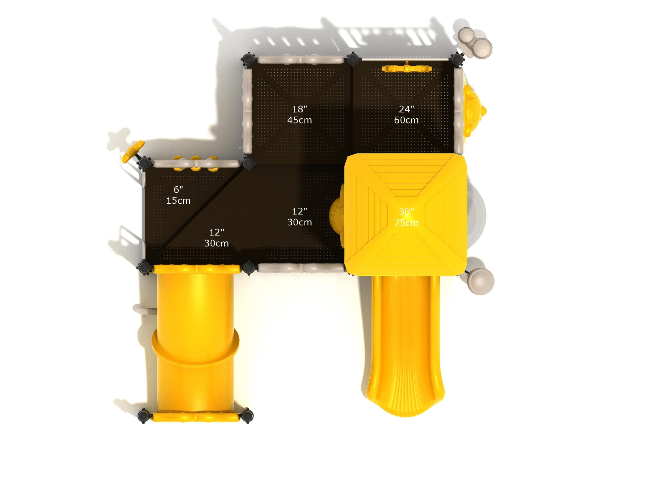 The Stamford play center is jam-packed with interesting features designed to stimulate young minds. From problem-solving on the Tic Tac Toe Panel and Maze Panel to giggling at the Bear Panel and Elephant Panel which feature cute characters, children will love to explore this structure on their own or with an adult as the sides are low enough to reach over and keep an eye on them. There’s a Metal Barrier with Ship’s Wheel attached which spins around to steer the fun in any creative way they want, and kids who love music will be drawn to features like the Rain Wheel, Bongos and Single Drum. There’s an Incline Tube Bridge to encourage crawling and you can pop your head out at the other end to give them a surprise as they pass through. A Straight Slide leads down from the main platform, but before they do you can guarantee they’re going to want a quick game of peek-a-boo at the Bubble Panel window.