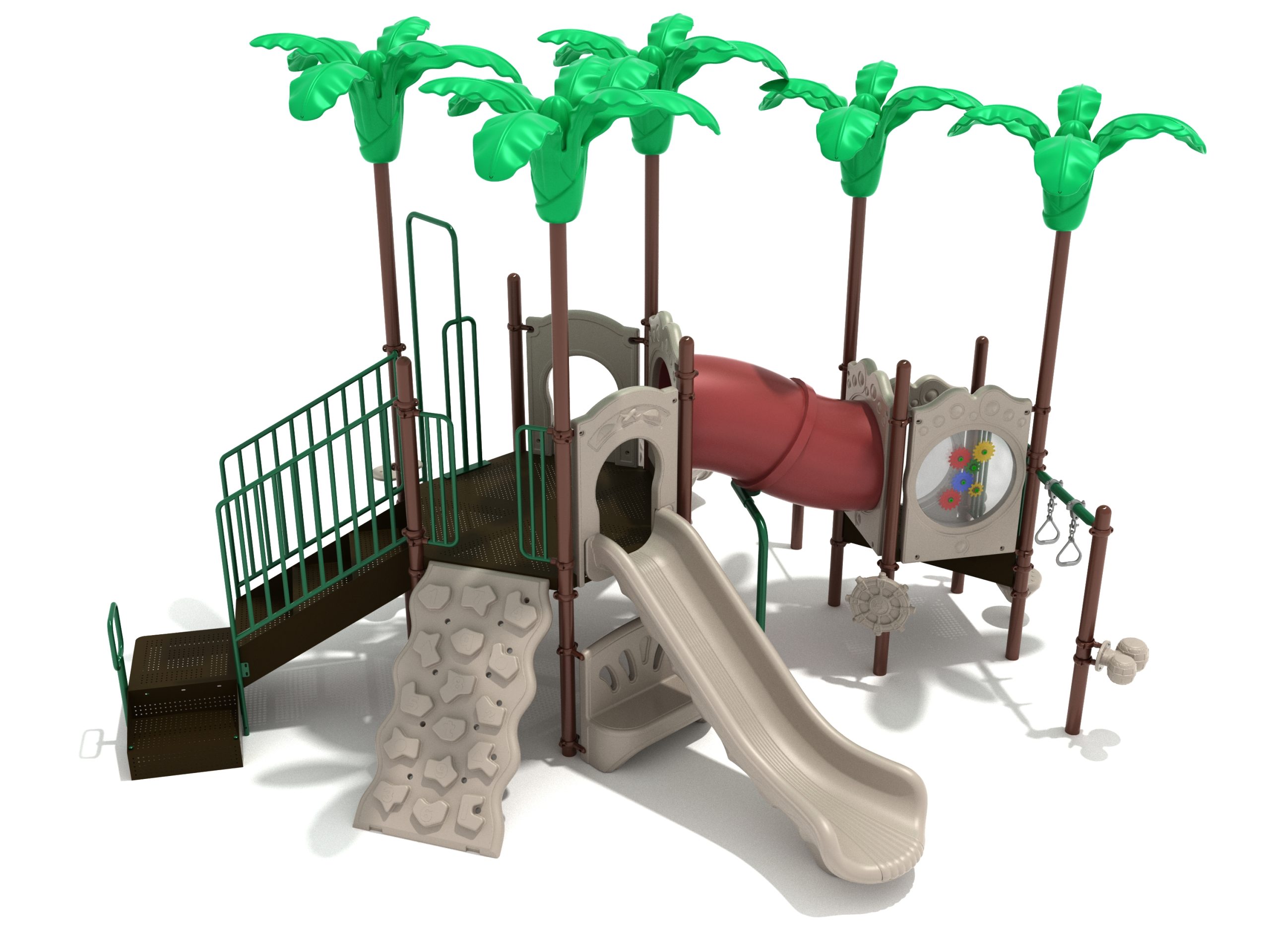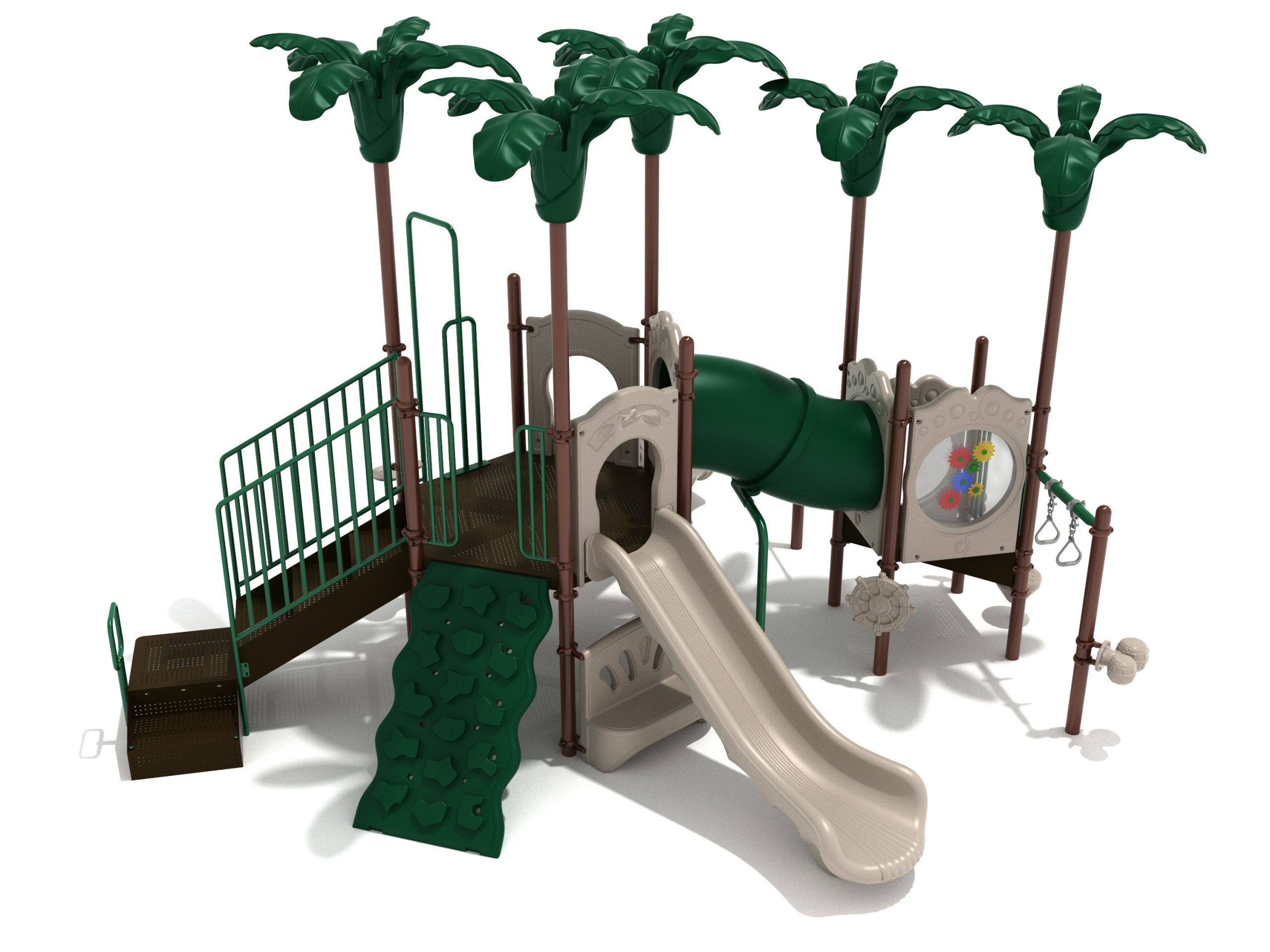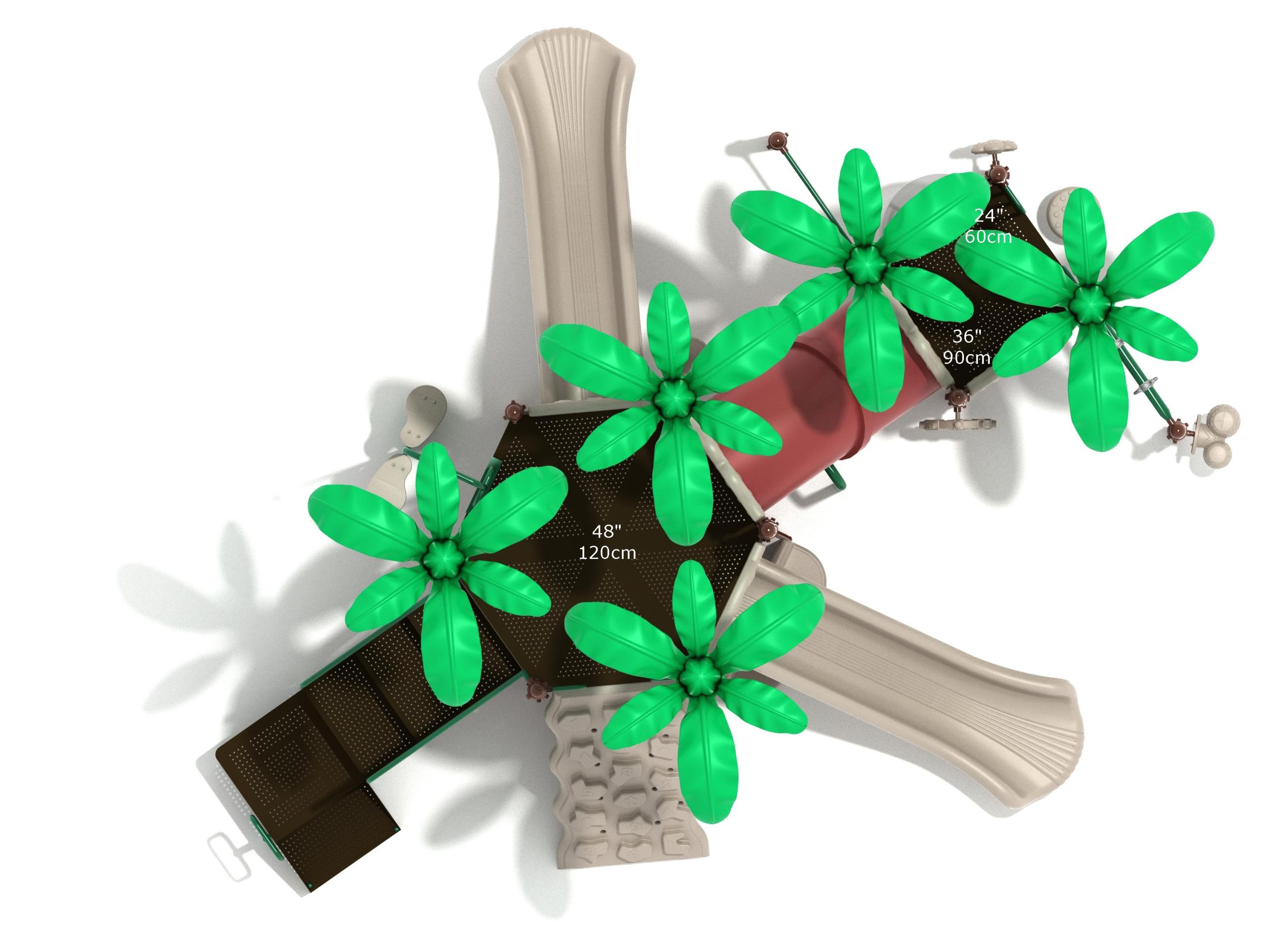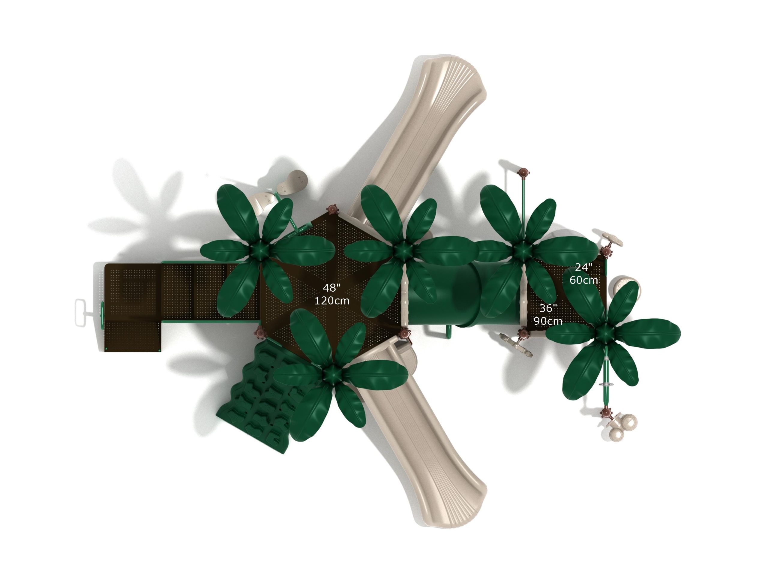 The Tempe play equipment is a feast for the eyes as it sits like a tropical oasis in the middle of the playground thanks to the five gorgeous Palm Tree Toppers which provide sufficient shade from the hot sun. The hexagon platform is a central feature from which other exciting activities extend including two Straight Slides which emerge in opposite directions for fun downward travel. The platform can be accessed either by scaling the Pea Pod Climber which extends up like a growing plant with leaves on each side, or by scrambling diligently up the rocky bank of the Figure Climber which gives kids the feeling of hiking in the mountains. There’s a Bench Panel underneath the slide so children can hear others whizzing past above them, a Rain Wheel to bring the sound of splashing water to this rainforest setting, plus a Gear Panel and Ship’s Wheel to inspire the imagination. On one end of the Tempe structure there is a lot going on. From a Pebble Step to climb up and Bubble Panel to look out of, to two Swinging Rings for gymnastic stunts and a Pull Up Bar to build upper body flexibility and strength.