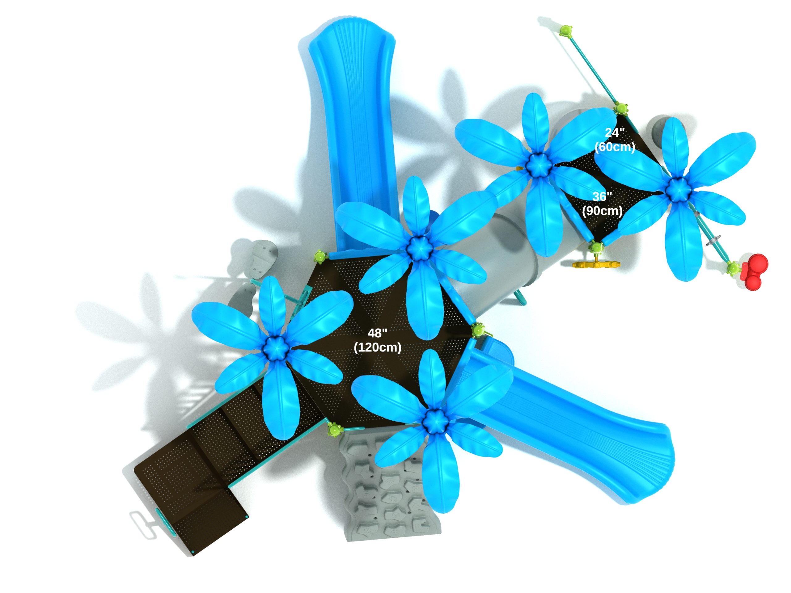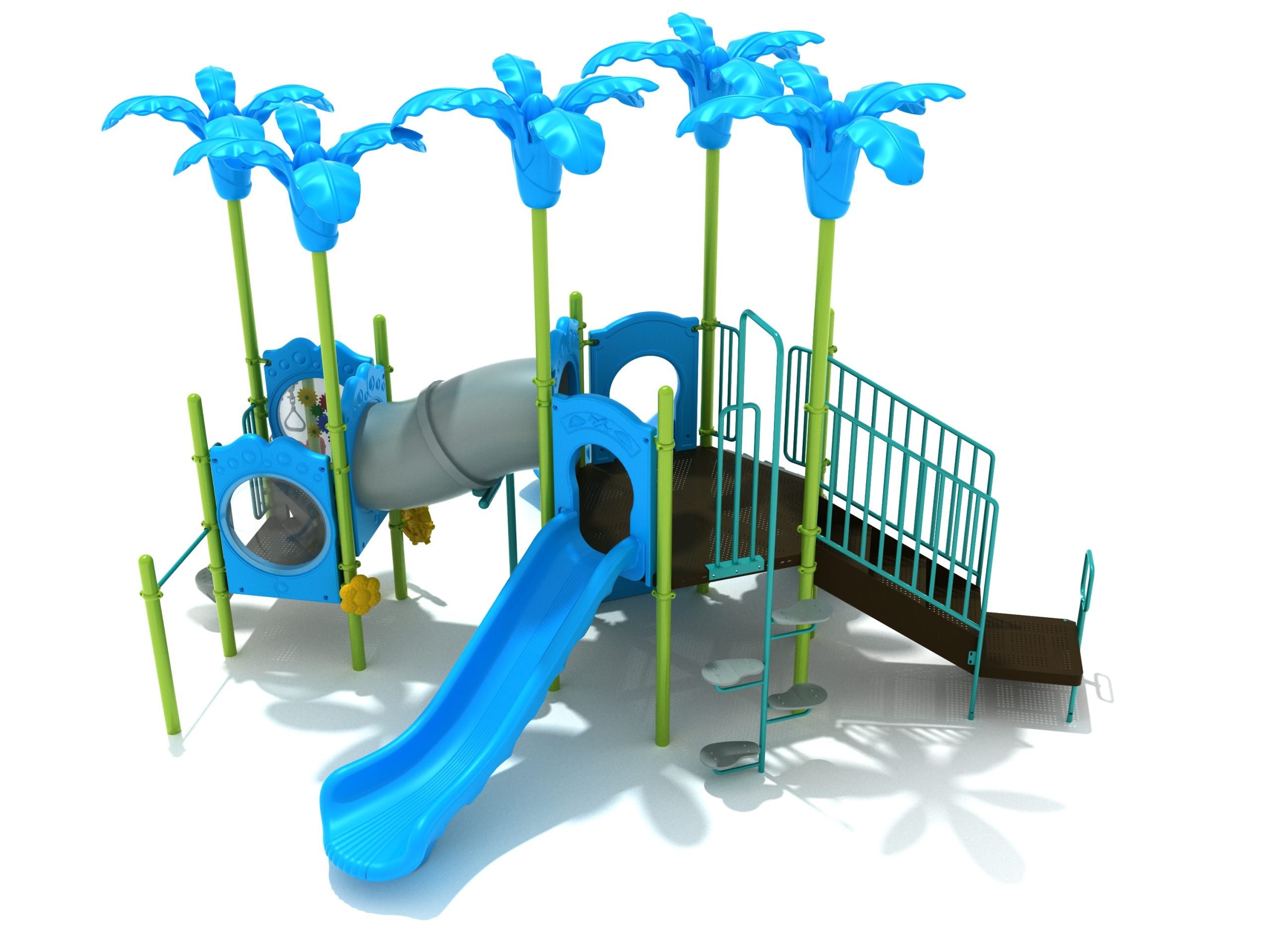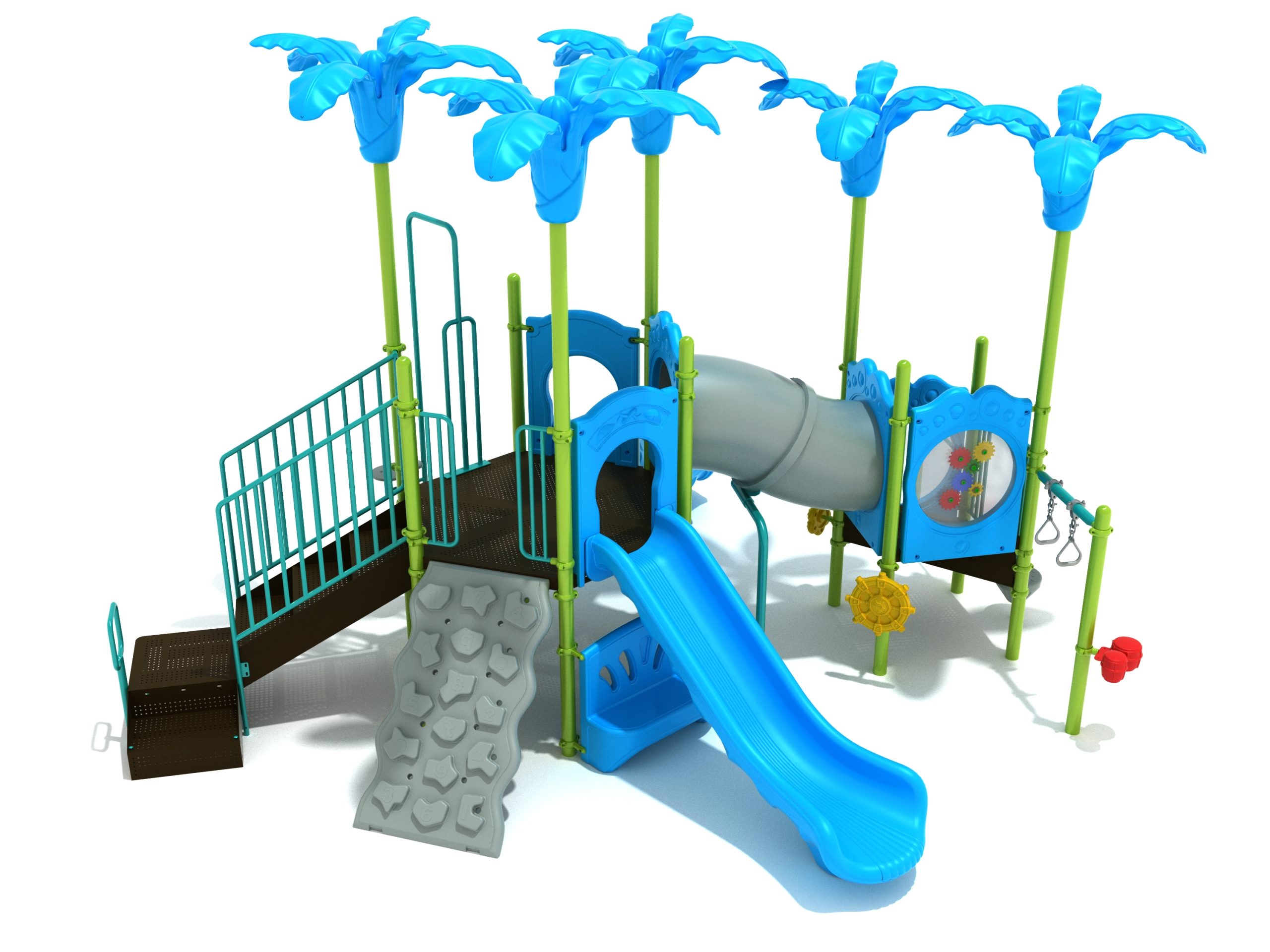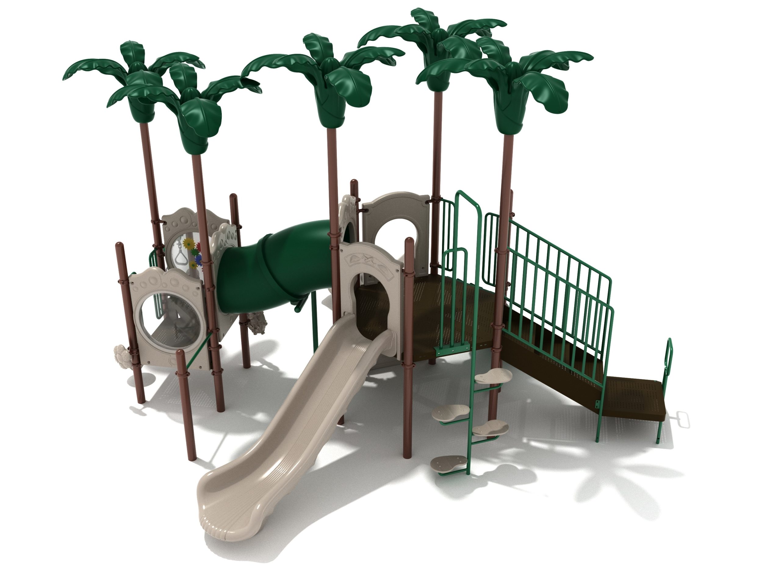 The Tempe play equipment is a feast for the eyes as it sits like a tropical oasis in the middle of the playground thanks to the five gorgeous Palm Tree Toppers which provide sufficient shade from the hot sun. The hexagon platform is a central feature from which other exciting activities extend including two Straight Slides which emerge in opposite directions for fun downward travel. The platform can be accessed either by scaling the Pea Pod Climber which extends up like a growing plant with leaves on each side, or by scrambling diligently up the rocky bank of the Figure Climber which gives kids the feeling of hiking in the mountains. There’s a Bench Panel underneath the slide so children can hear others whizzing past above them, a Rain Wheel to bring the sound of splashing water to this rainforest setting, plus a Gear Panel and Ship’s Wheel to inspire the imagination. On one end of the Tempe structure there is a lot going on. From a Pebble Step to climb up and Bubble Panel to look out of, to two Swinging Rings for gymnastic stunts and a Pull Up Bar to build upper body flexibility and strength.