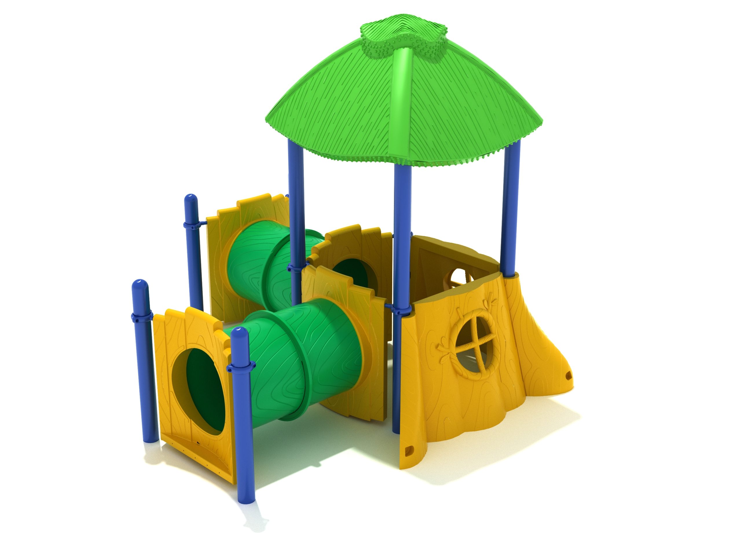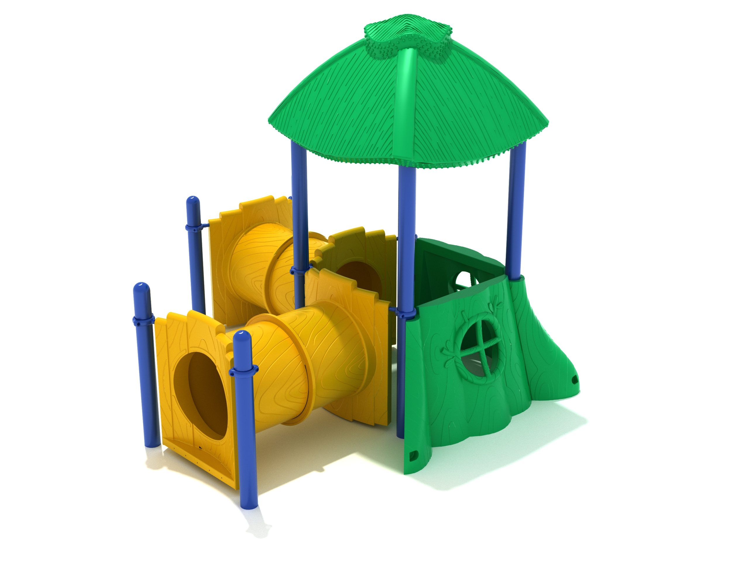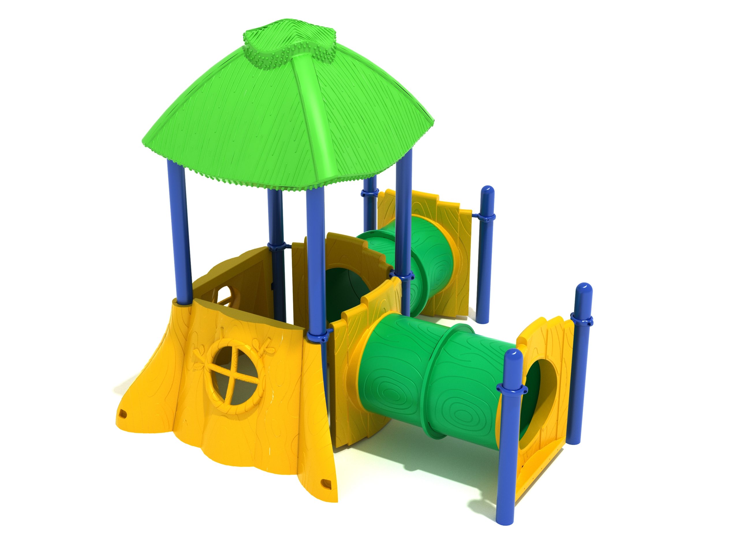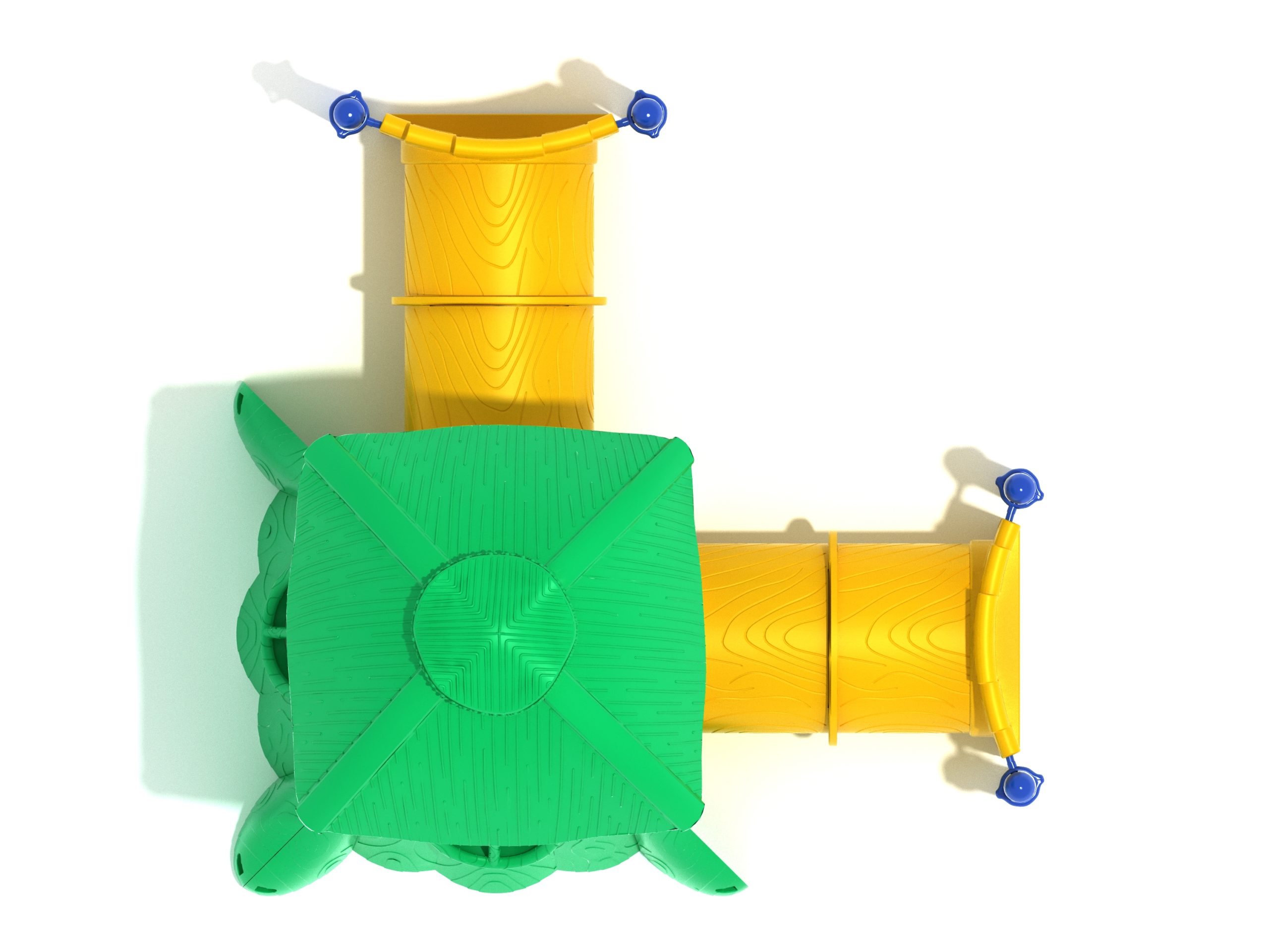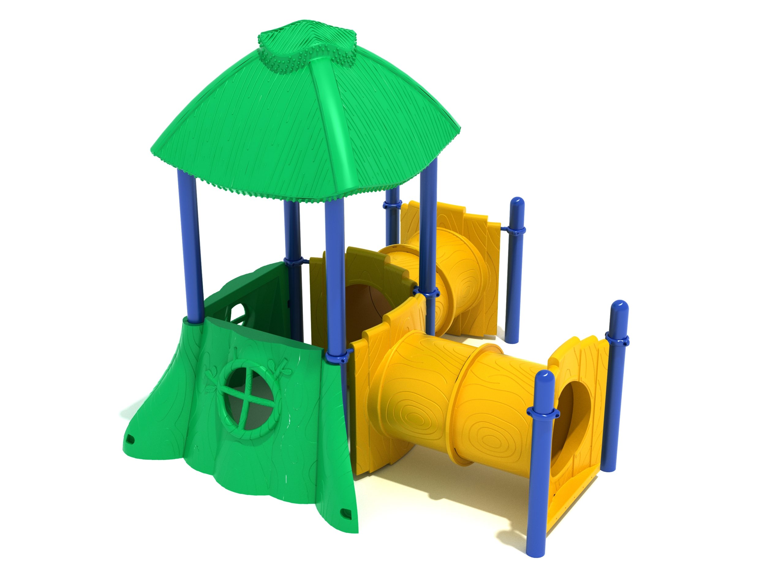 The Treetop Connection play structure is half enclosed shelter, and half exciting obstacle. That is because two of its four walls are Stump Window Panels, while the other two are tube tunnels. Children will love crawling through one of the tubes and being unsure which of their friends might surprise them on the other side. Navigating through tunnel passages on the playground is fun in itself, but in this structure the tunnels are also passages into a small semi-enclosed hut. The walls of this dwelling are rotationally molded plastic panels with a detailed design that resembles a small home carved out of a tree. They have circular windows which let in some indirect sunlight and provide a view of the playground even while children are crawling through the tubes. This is a perfect place for shy kids to find a moment of respite from their peers, or for a couple of friends to use as their own clubhouse.