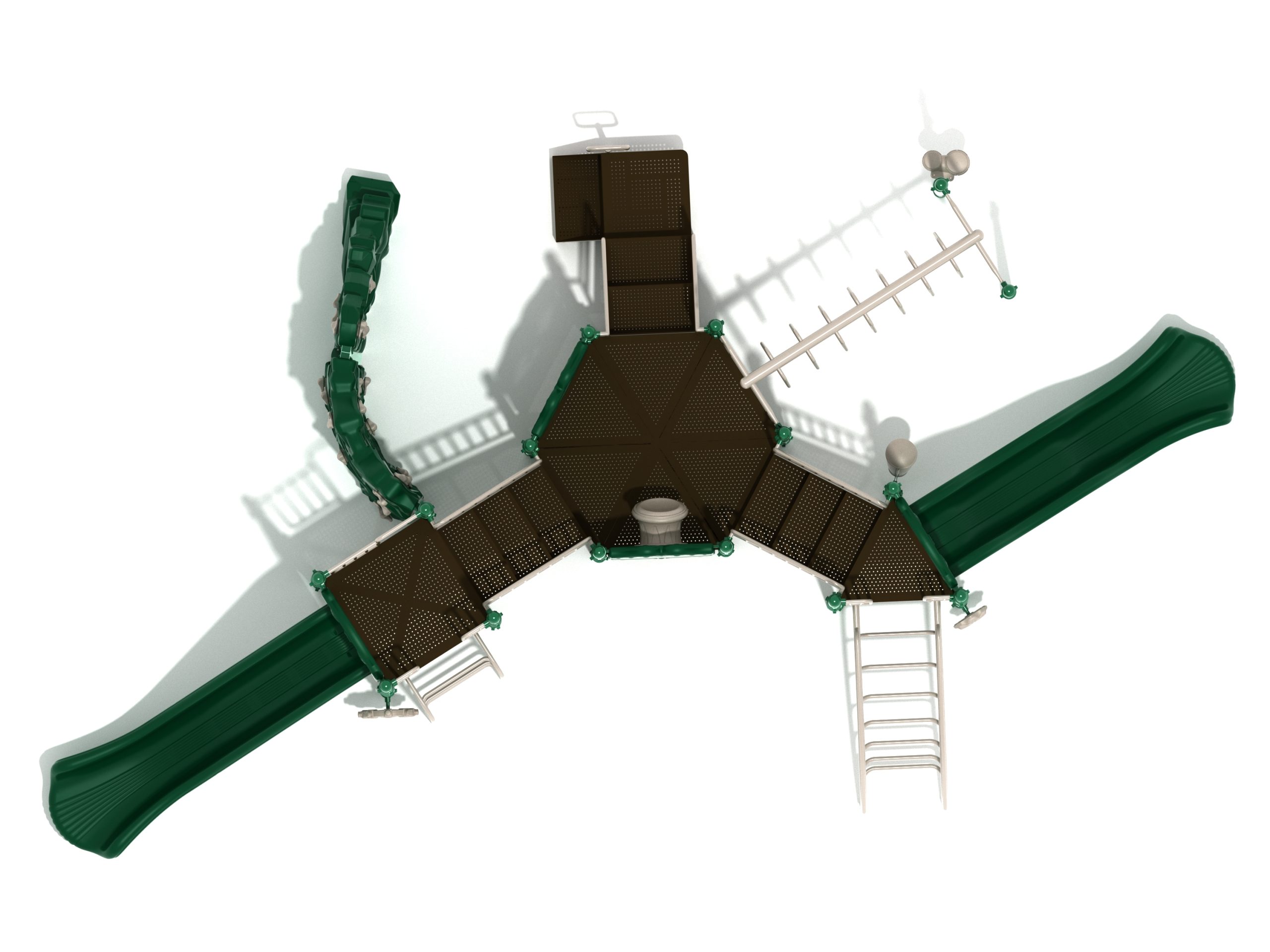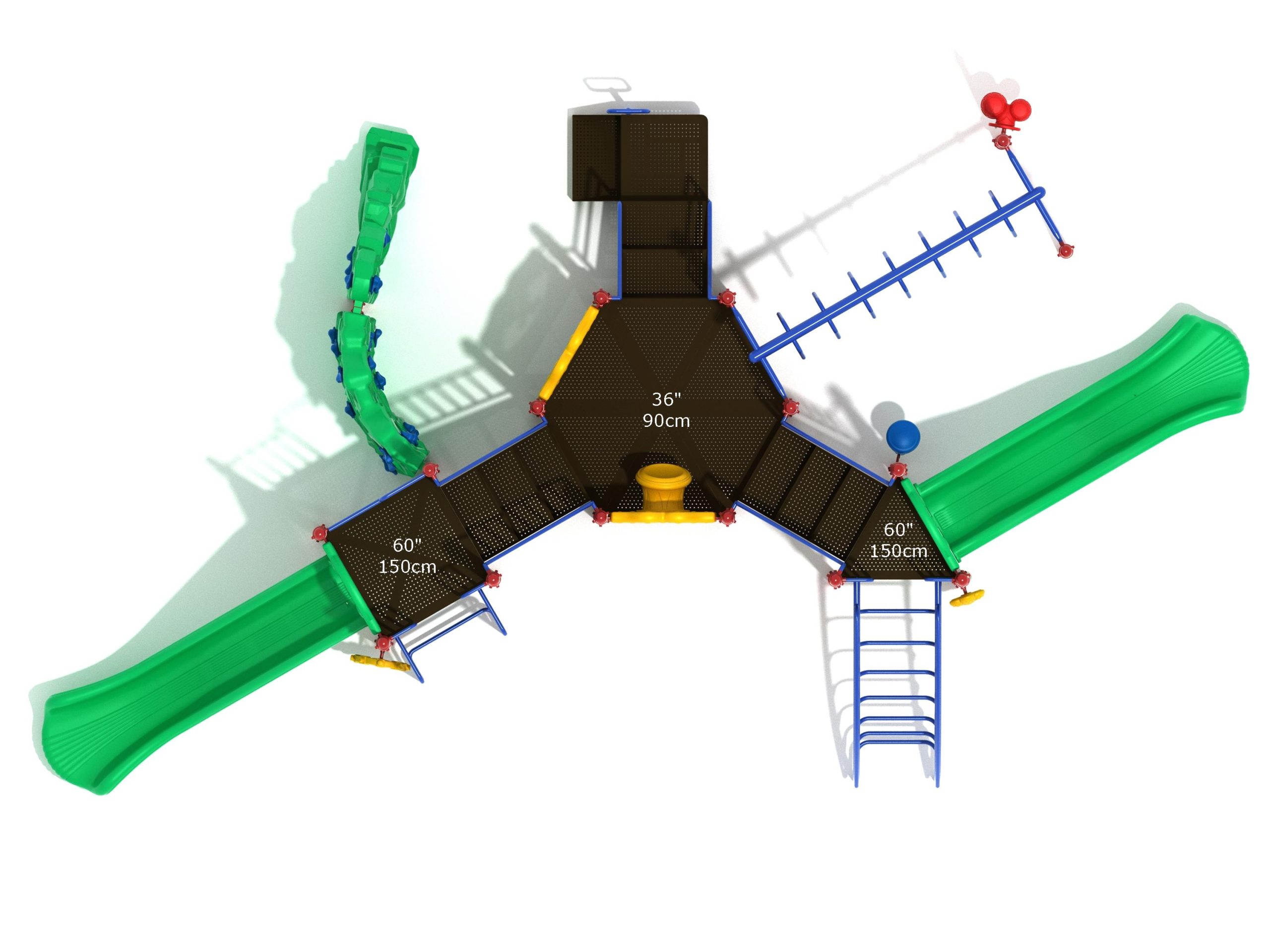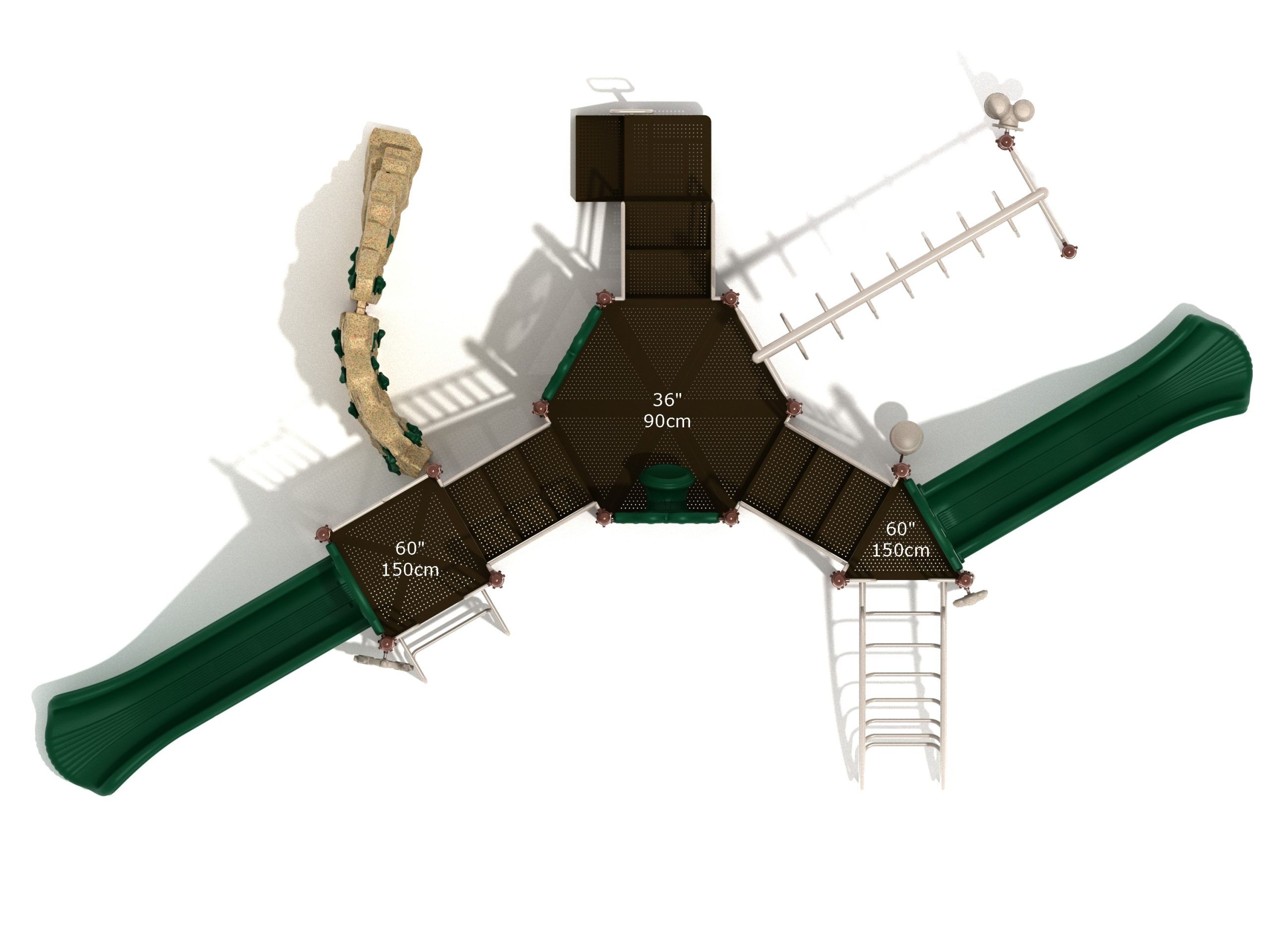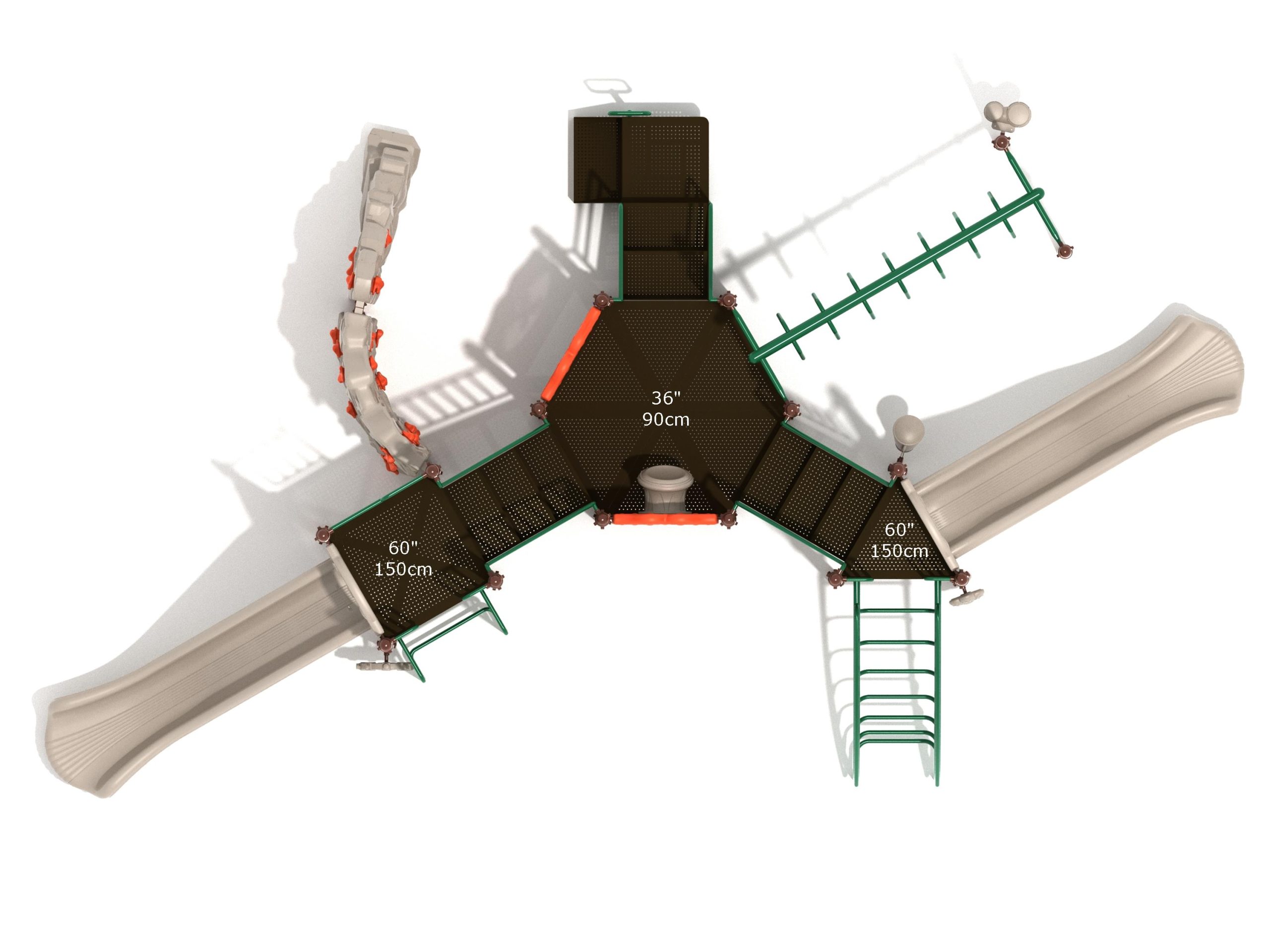 Children will be able to build their arm and leg muscles quickly with so much physical activity that’s possible on this commercial-grade Tyson’s Corner play equipment. Kids can choose to reach the central hexagonal deck with a Drum Panel in five different ways. A Craggy Climber End Section is the perfect size and shape to get a foothold before making the way across onto a more difficult Craggy Climber Turn Section which has holds on both sides for two children to climb at the same time. A Vertical Ladder and Inverted Arch Ladder provide a simpler way to get up but it still requires lots of agility, dexterity and balance. Children who always have to go for the hardest option will be pleased with the addition of an Overhead Straight Trapezoid Loop Ladder to swing and hang their way to victory. At the top there’s a Straight Slide to use or a Wave Slide for added excitement. There are also Bongos and a Single Drum to make music with.