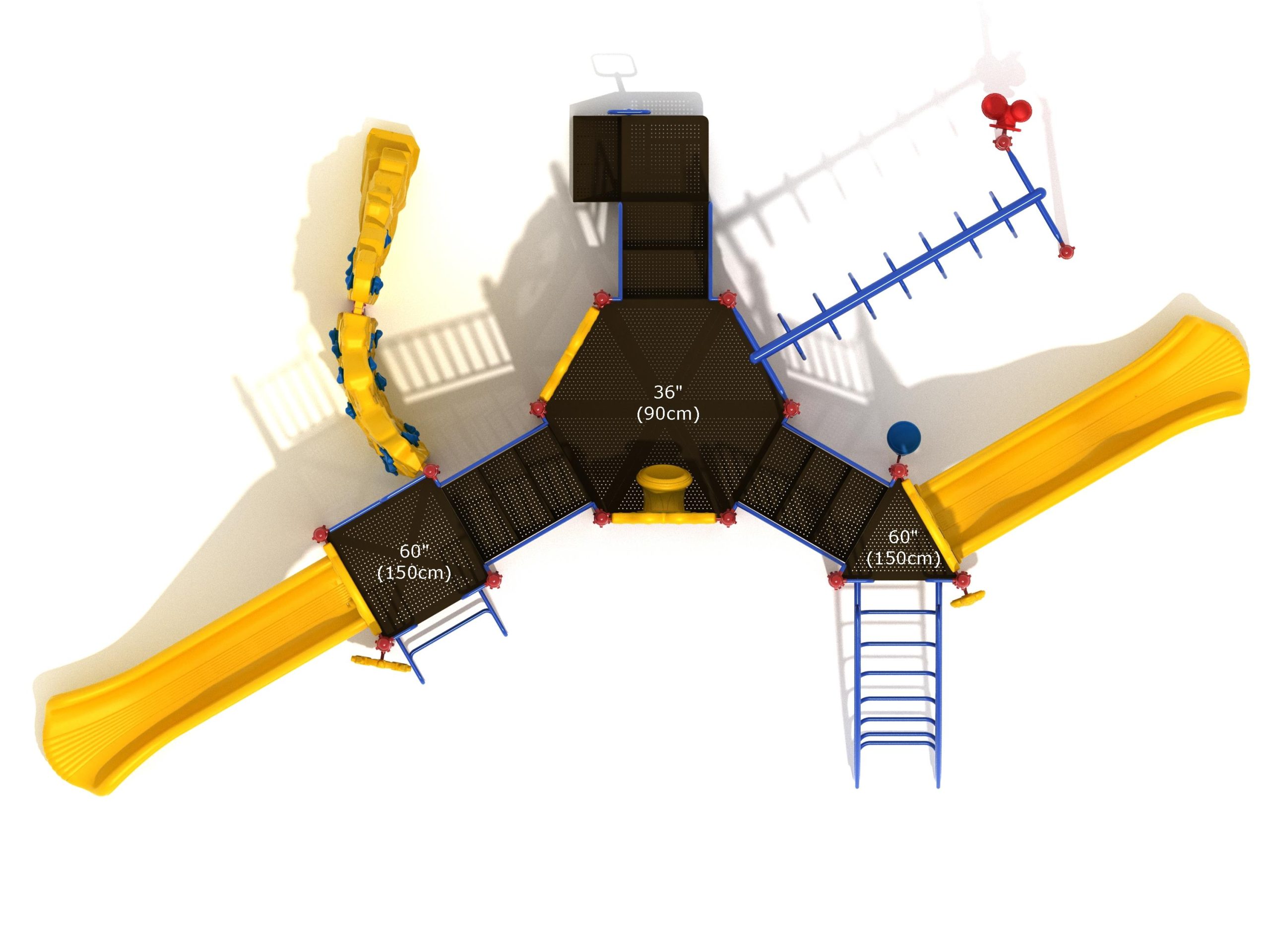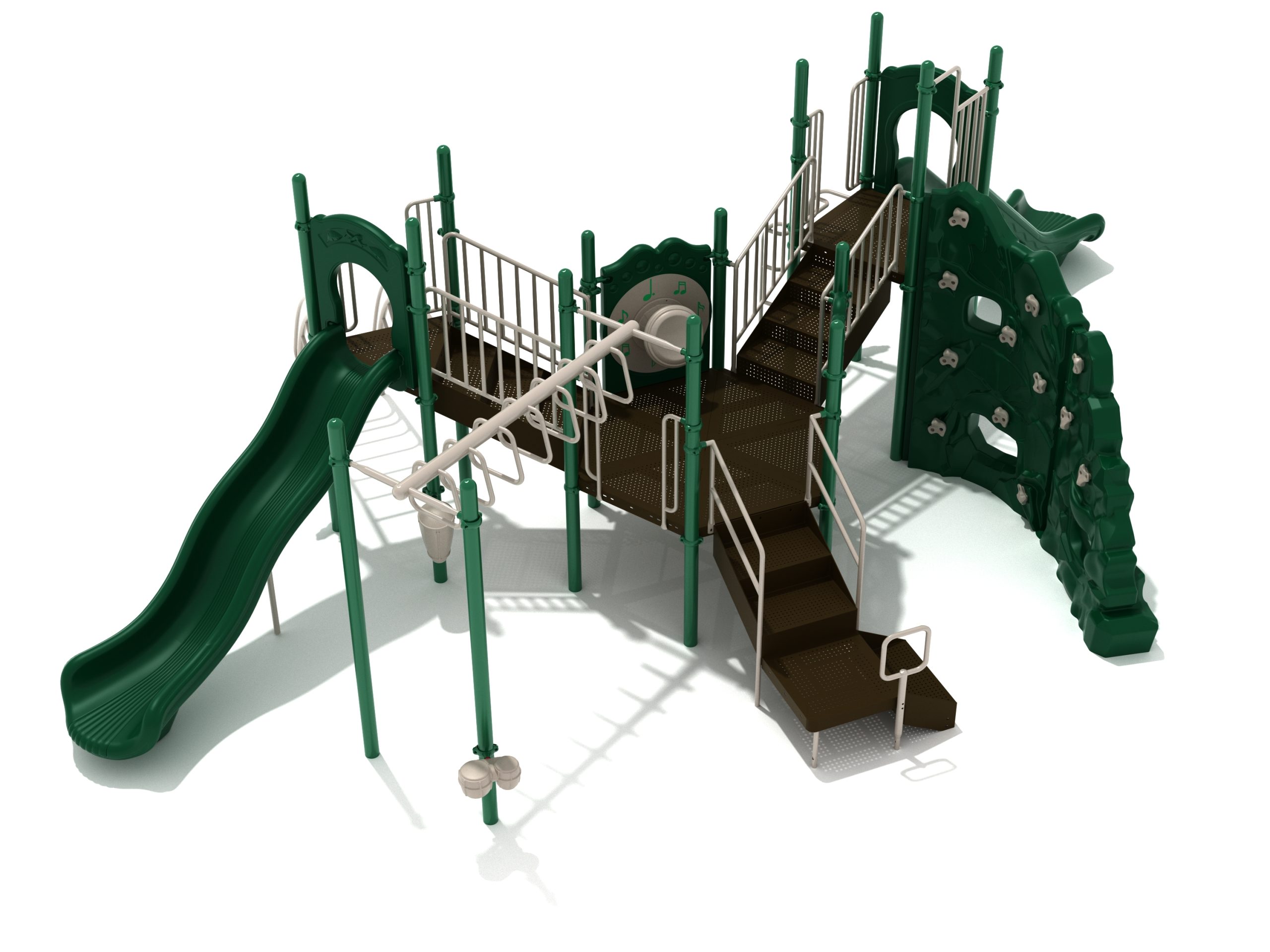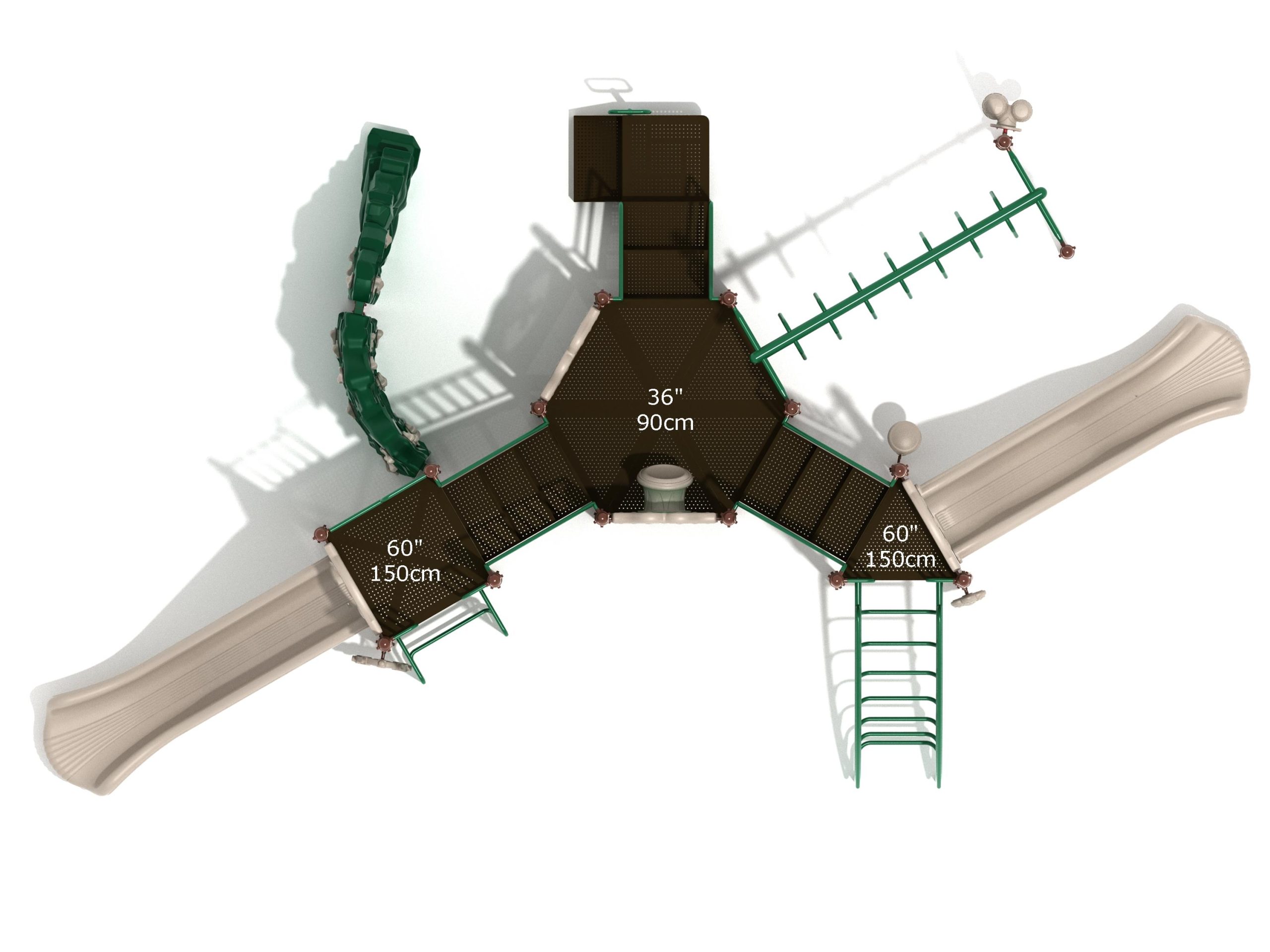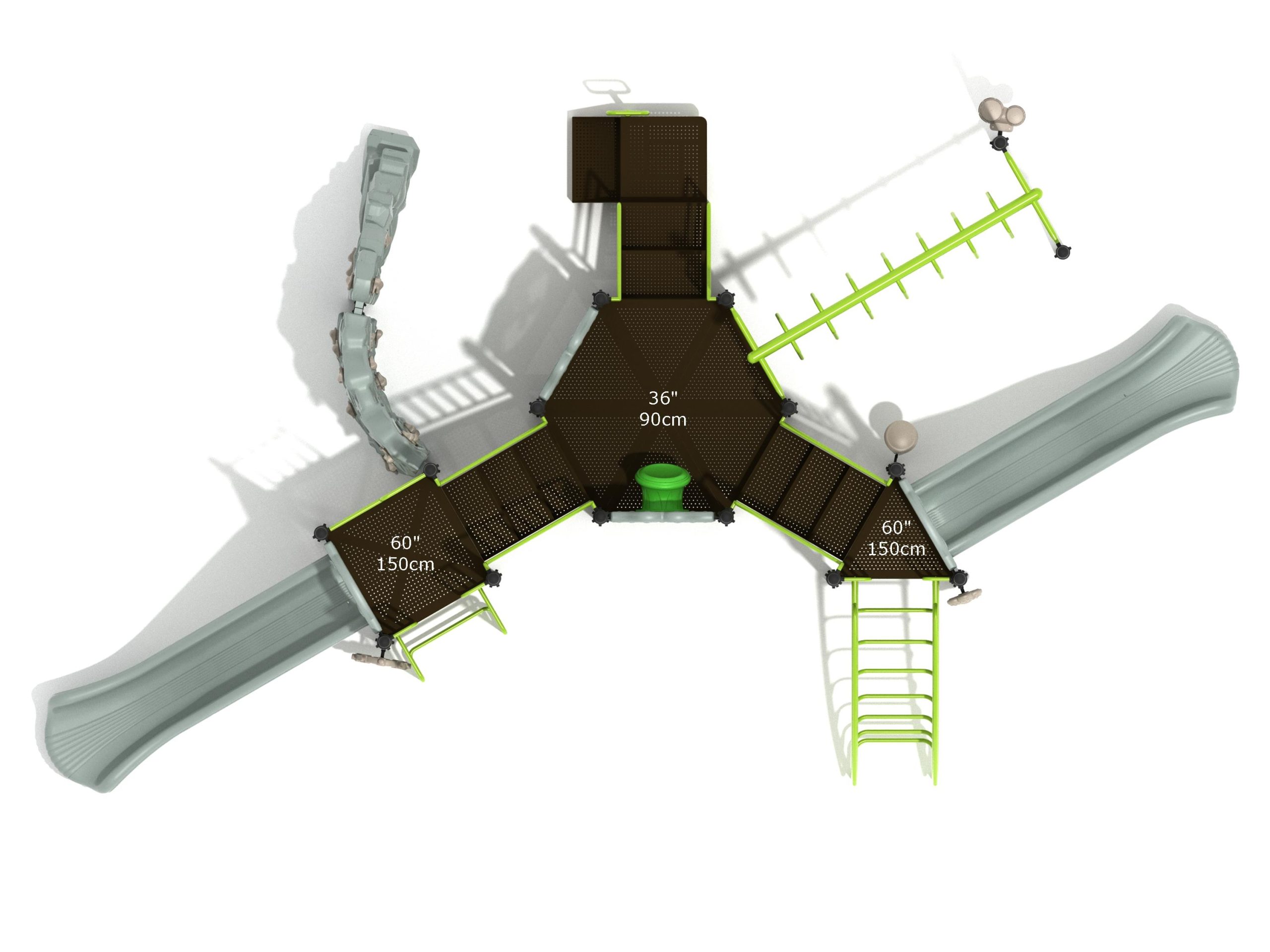 Children will be able to build their arm and leg muscles quickly with so much physical activity that’s possible on this commercial-grade Tyson’s Corner play equipment. Kids can choose to reach the central hexagonal deck with a Drum Panel in five different ways. A Craggy Climber End Section is the perfect size and shape to get a foothold before making the way across onto a more difficult Craggy Climber Turn Section which has holds on both sides for two children to climb at the same time. A Vertical Ladder and Inverted Arch Ladder provide a simpler way to get up but it still requires lots of agility, dexterity and balance. Children who always have to go for the hardest option will be pleased with the addition of an Overhead Straight Trapezoid Loop Ladder to swing and hang their way to victory. At the top there’s a Straight Slide to use or a Wave Slide for added excitement. There are also Bongos and a Single Drum to make music with.