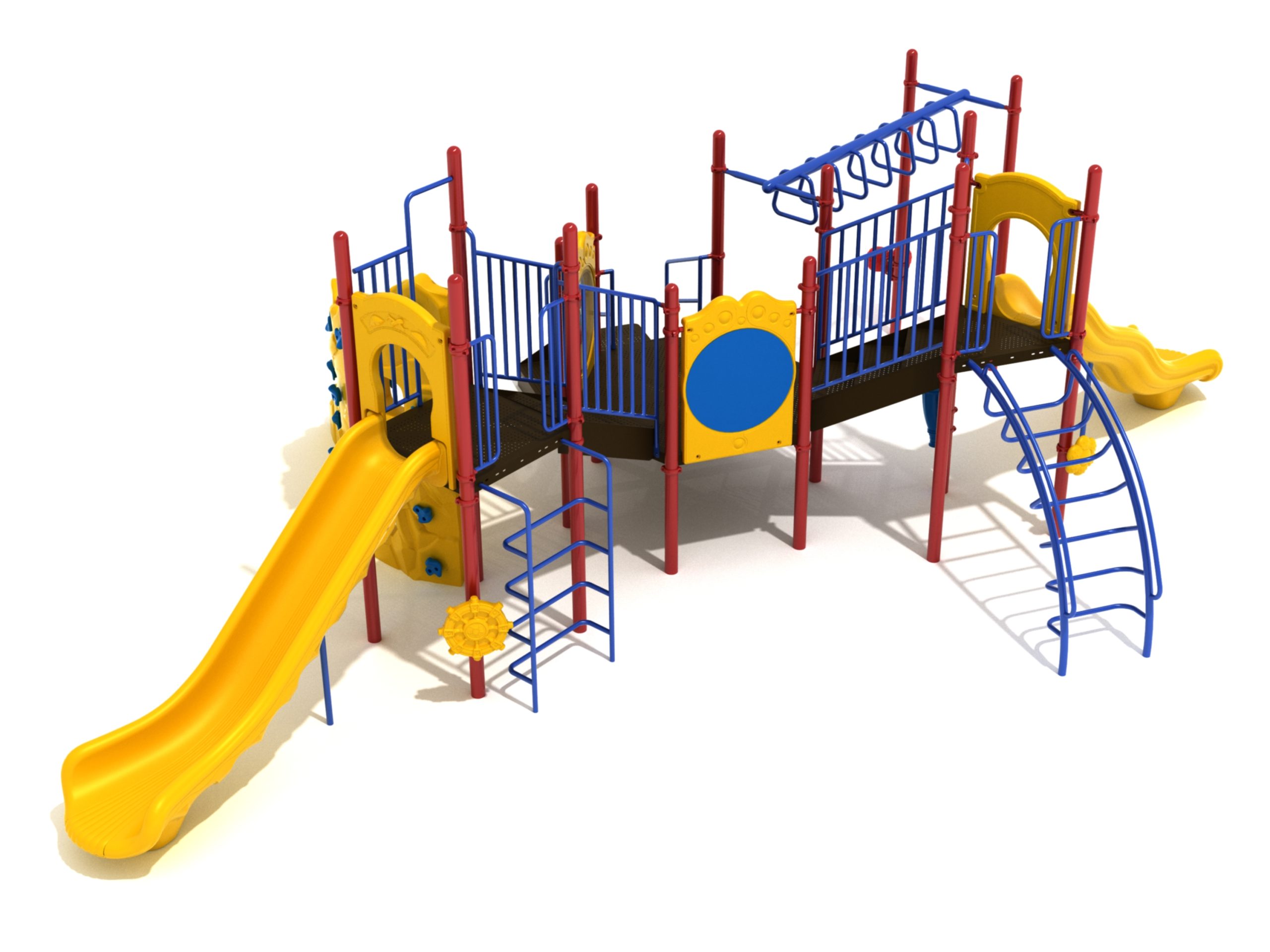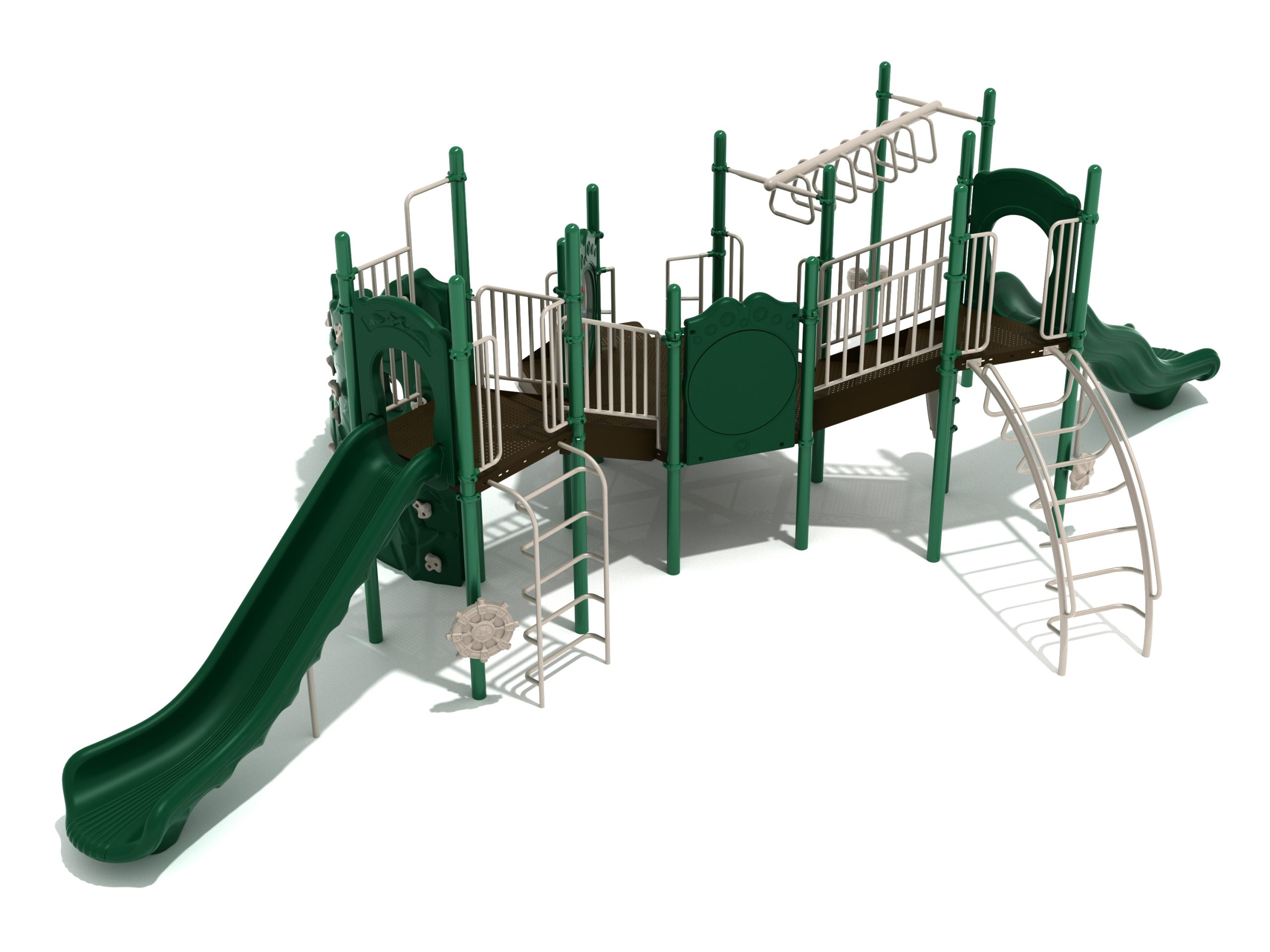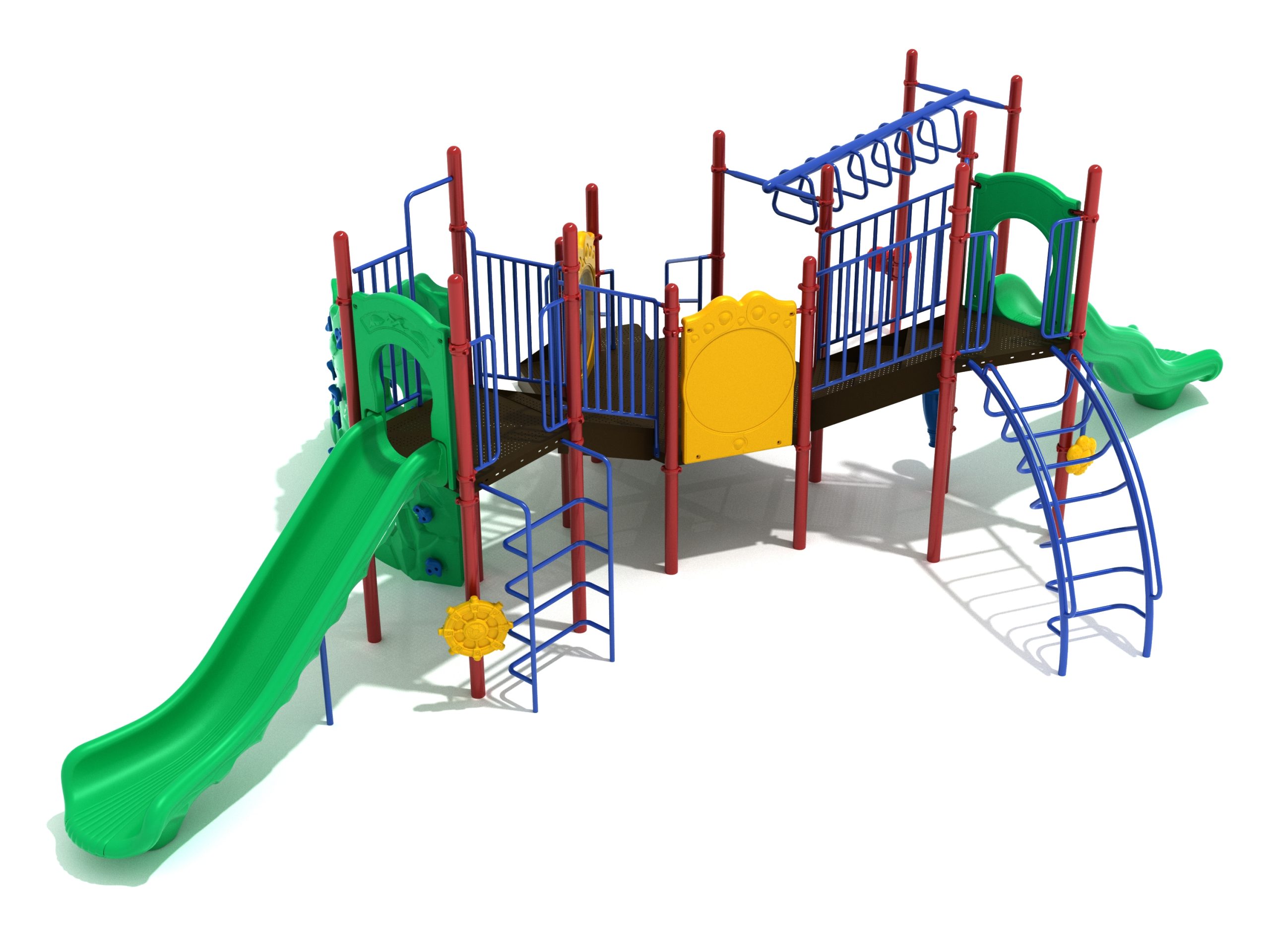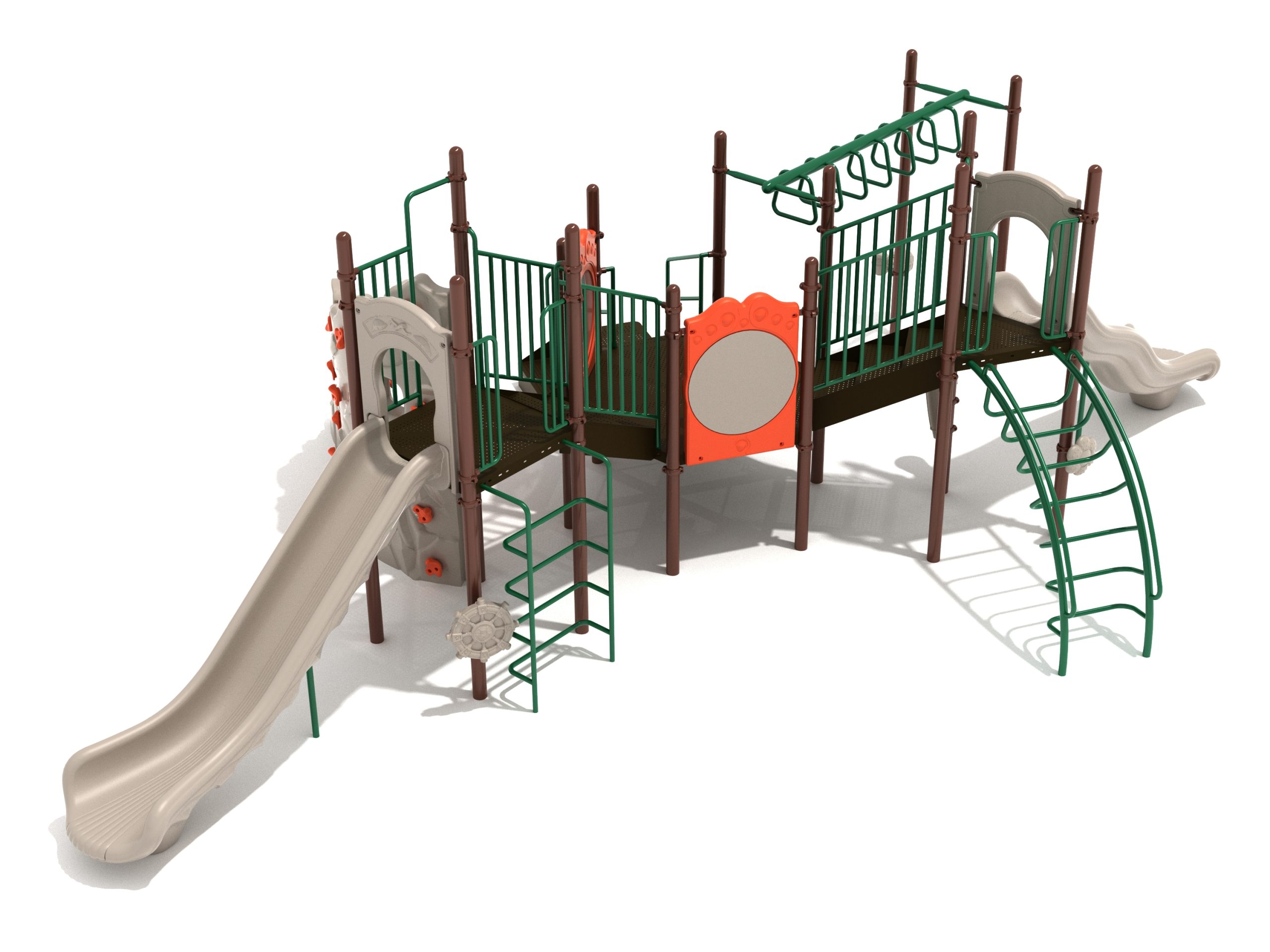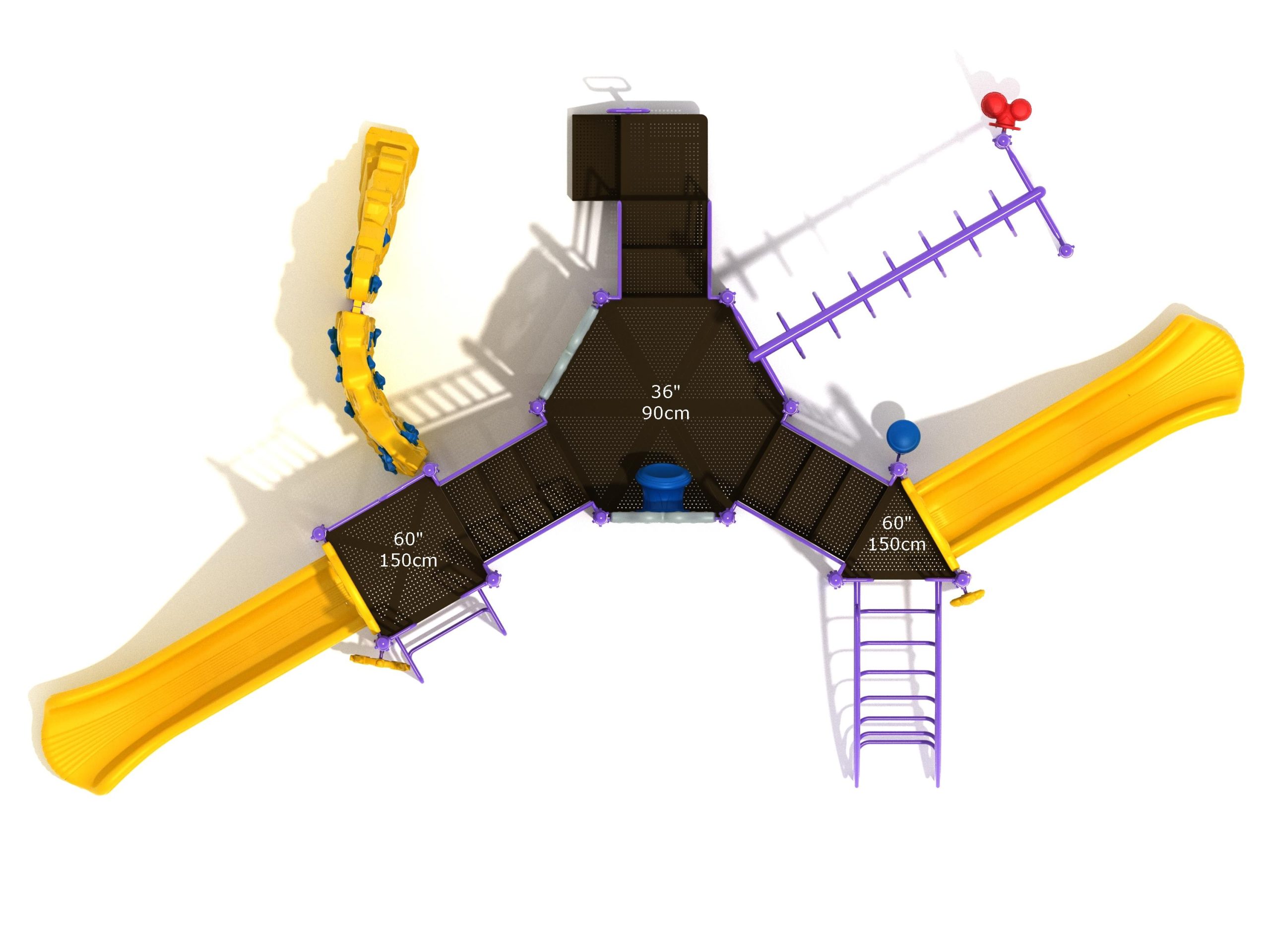 Children will be able to build their arm and leg muscles quickly with so much physical activity that’s possible on this commercial-grade Tyson’s Corner play equipment. Kids can choose to reach the central hexagonal deck with a Drum Panel in five different ways. A Craggy Climber End Section is the perfect size and shape to get a foothold before making the way across onto a more difficult Craggy Climber Turn Section which has holds on both sides for two children to climb at the same time. A Vertical Ladder and Inverted Arch Ladder provide a simpler way to get up but it still requires lots of agility, dexterity and balance. Children who always have to go for the hardest option will be pleased with the addition of an Overhead Straight Trapezoid Loop Ladder to swing and hang their way to victory. At the top there’s a Straight Slide to use or a Wave Slide for added excitement. There are also Bongos and a Single Drum to make music with.