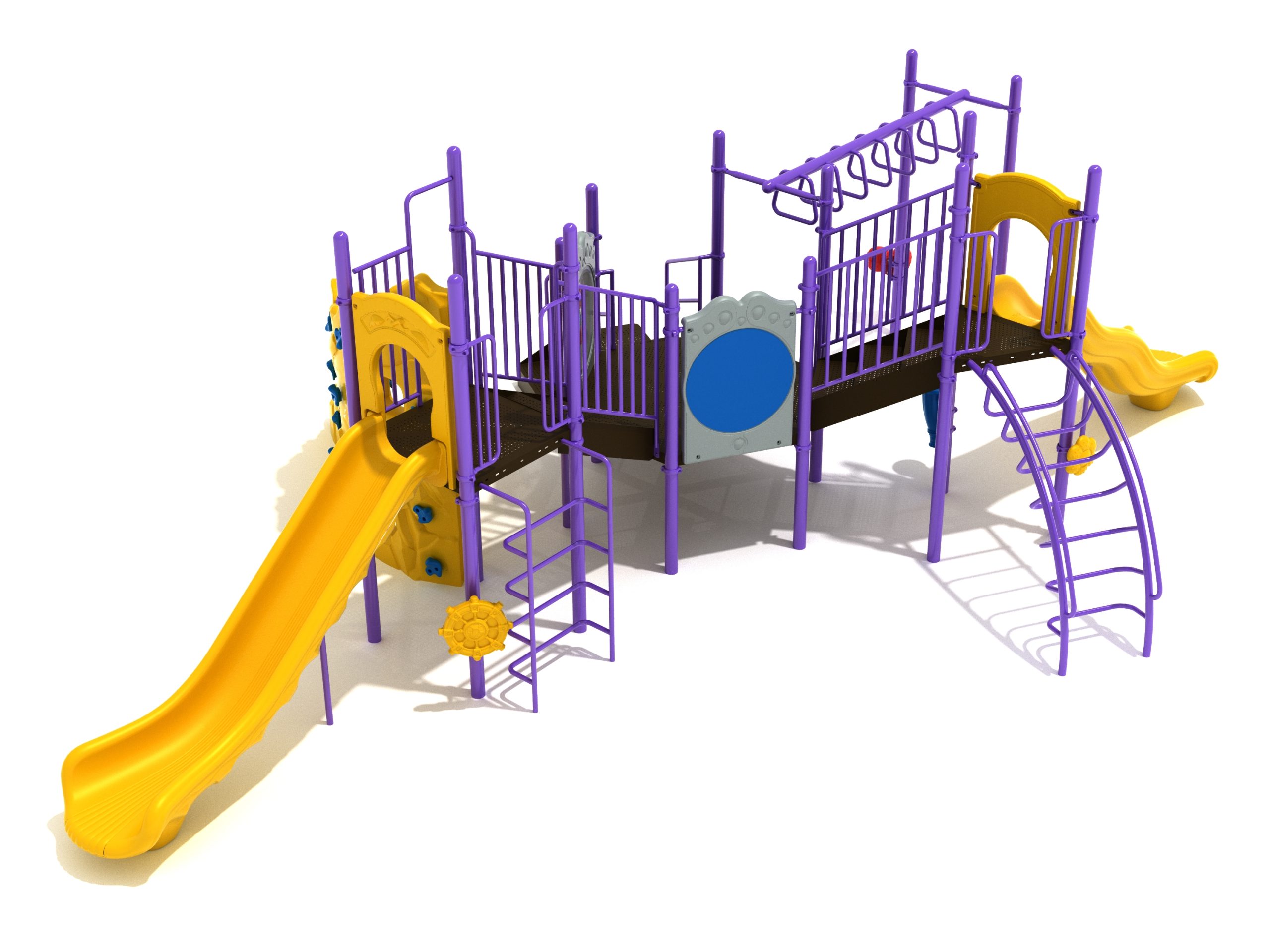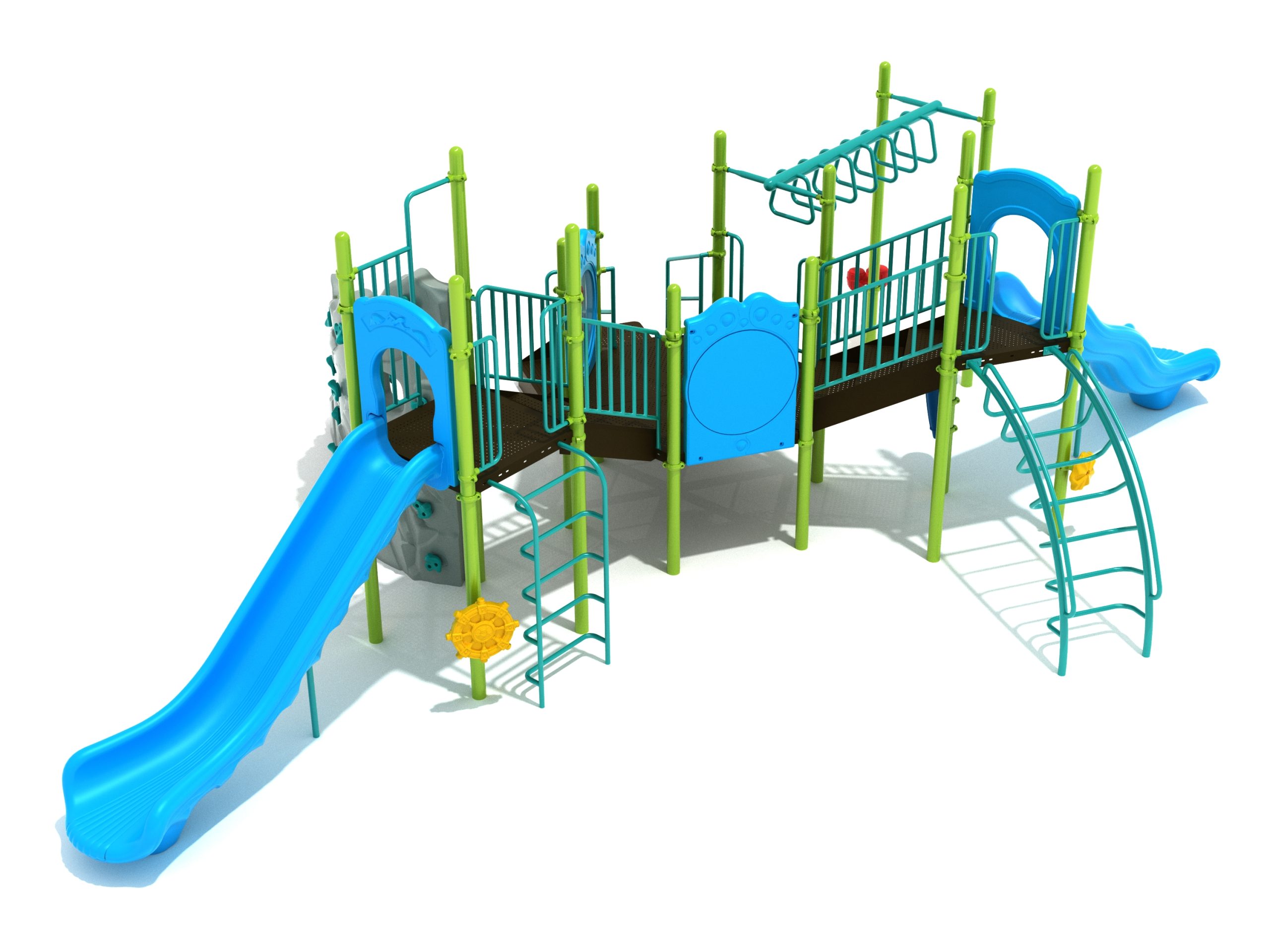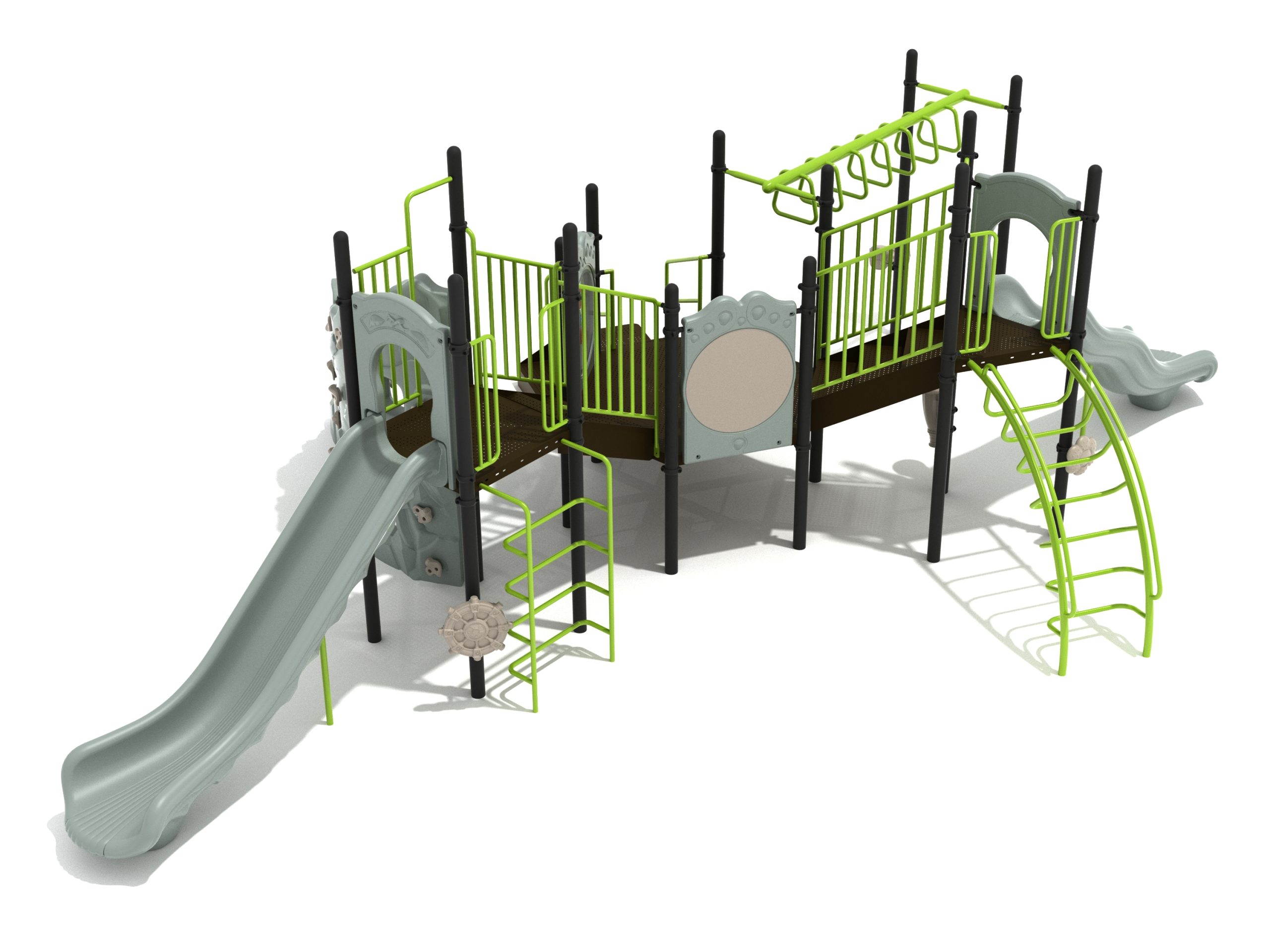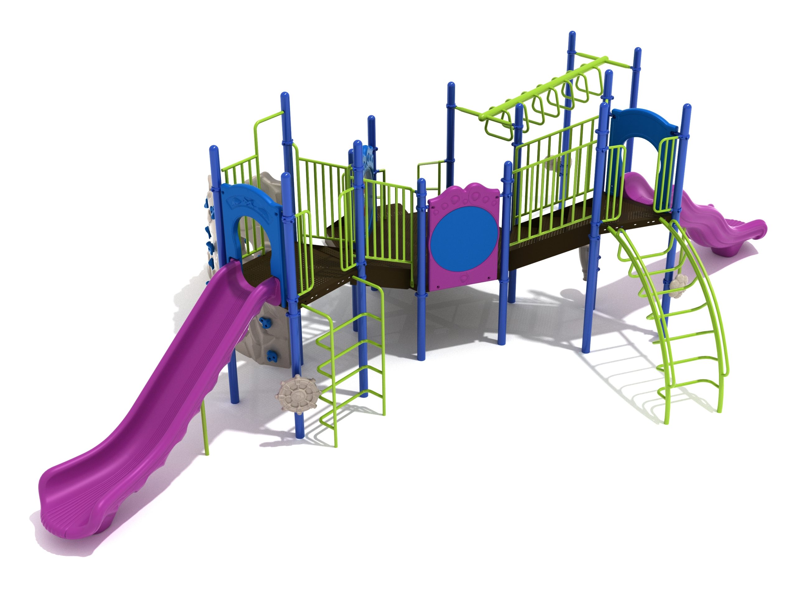 Children will be able to build their arm and leg muscles quickly with so much physical activity that’s possible on this commercial-grade Tyson’s Corner play equipment. Kids can choose to reach the central hexagonal deck with a Drum Panel in five different ways. A Craggy Climber End Section is the perfect size and shape to get a foothold before making the way across onto a more difficult Craggy Climber Turn Section which has holds on both sides for two children to climb at the same time. A Vertical Ladder and Inverted Arch Ladder provide a simpler way to get up but it still requires lots of agility, dexterity and balance. Children who always have to go for the hardest option will be pleased with the addition of an Overhead Straight Trapezoid Loop Ladder to swing and hang their way to victory. At the top there’s a Straight Slide to use or a Wave Slide for added excitement. There are also Bongos and a Single Drum to make music with.