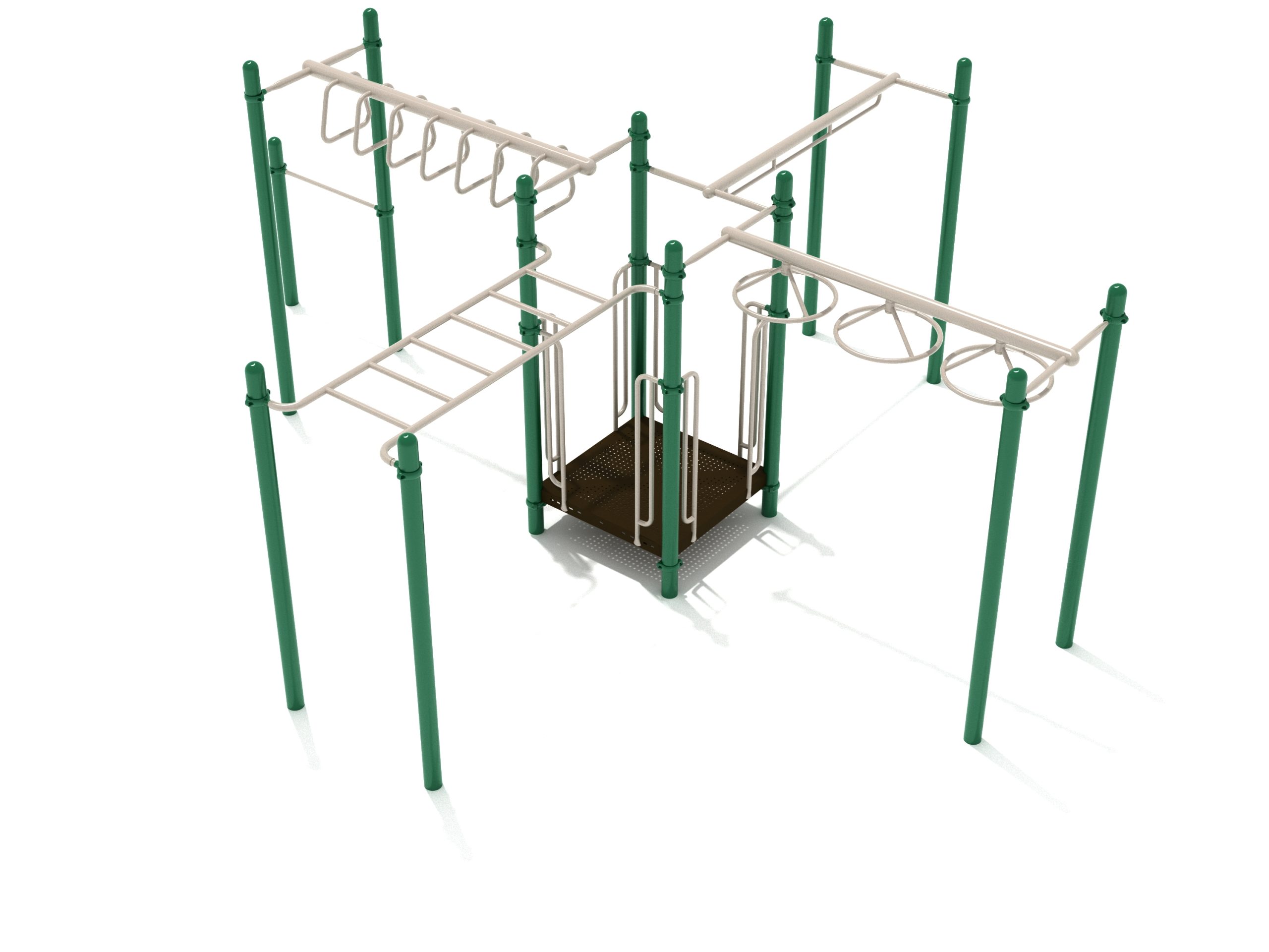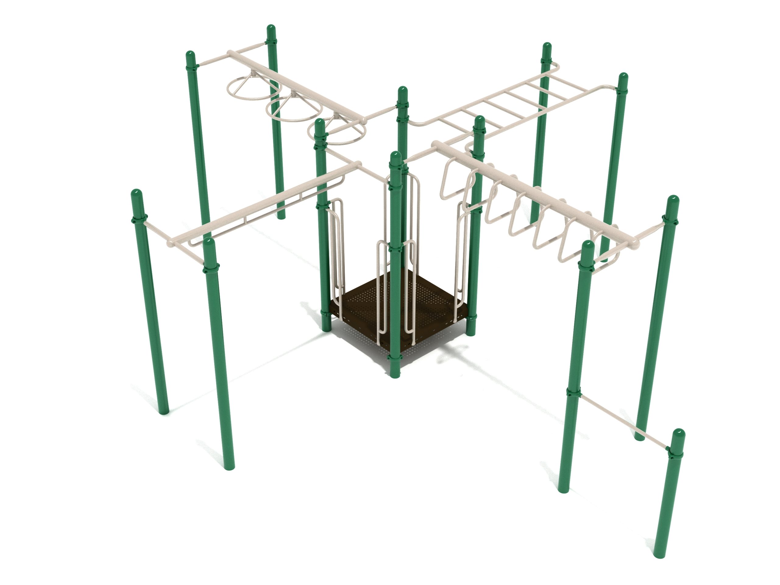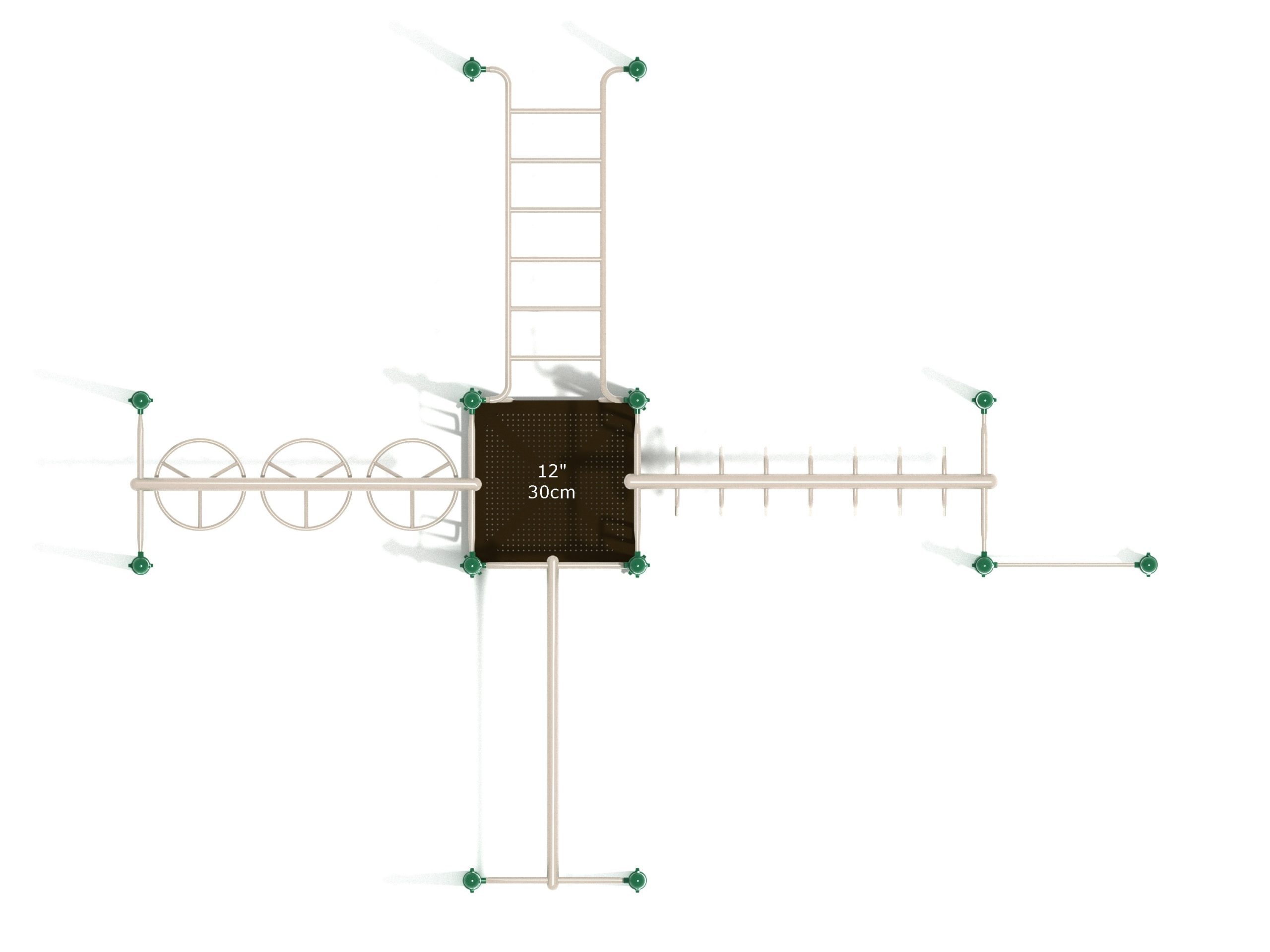 Gymnastic abilities and upper body strength will be tested again and again on the White Plains play set. Children can start on the central platform and choose from four different overhead bar experiences. They can swing their way to the end and drop or double the challenge and turn their body around and shimmy back to the platform. The Overhead Straight Rung Horizontal Ladder and Overhead Single Parallel Bar Ladder are two of the easiest ones to master but will still challenge young monkeys as they must coordinate hand movements while keeping their body balanced to succeed. The Overhead Straight Trapezoid Loop Ladder steps up the difficulty as the bars are angled and to grip them children must have the confidence to let go and reach for the next bar. There’s a Pull Up Bar attached at the end to practice on too. The real challenge comes from the Overhead 3 Wheel Swing Ladder where too much body movement makes the child swing around dizzily until they can grab the circular bar in front.