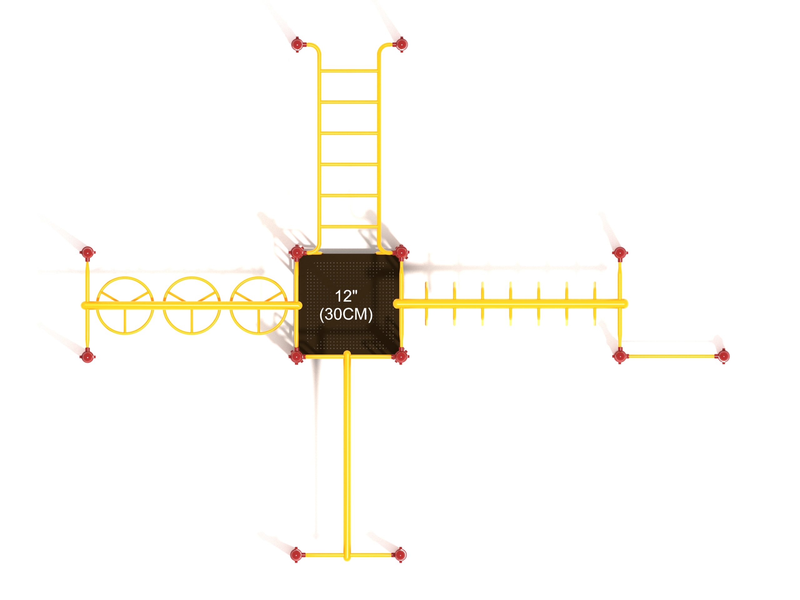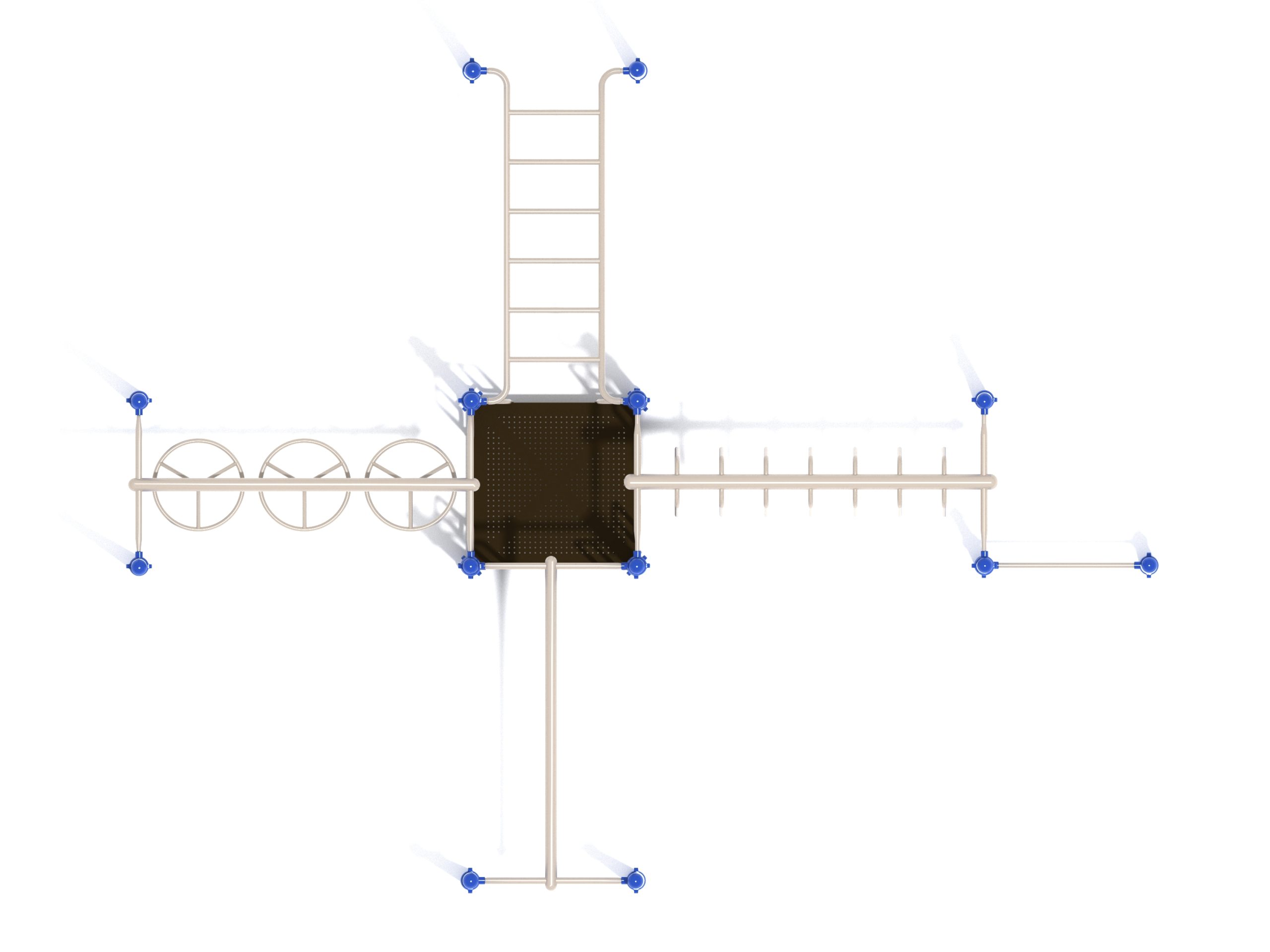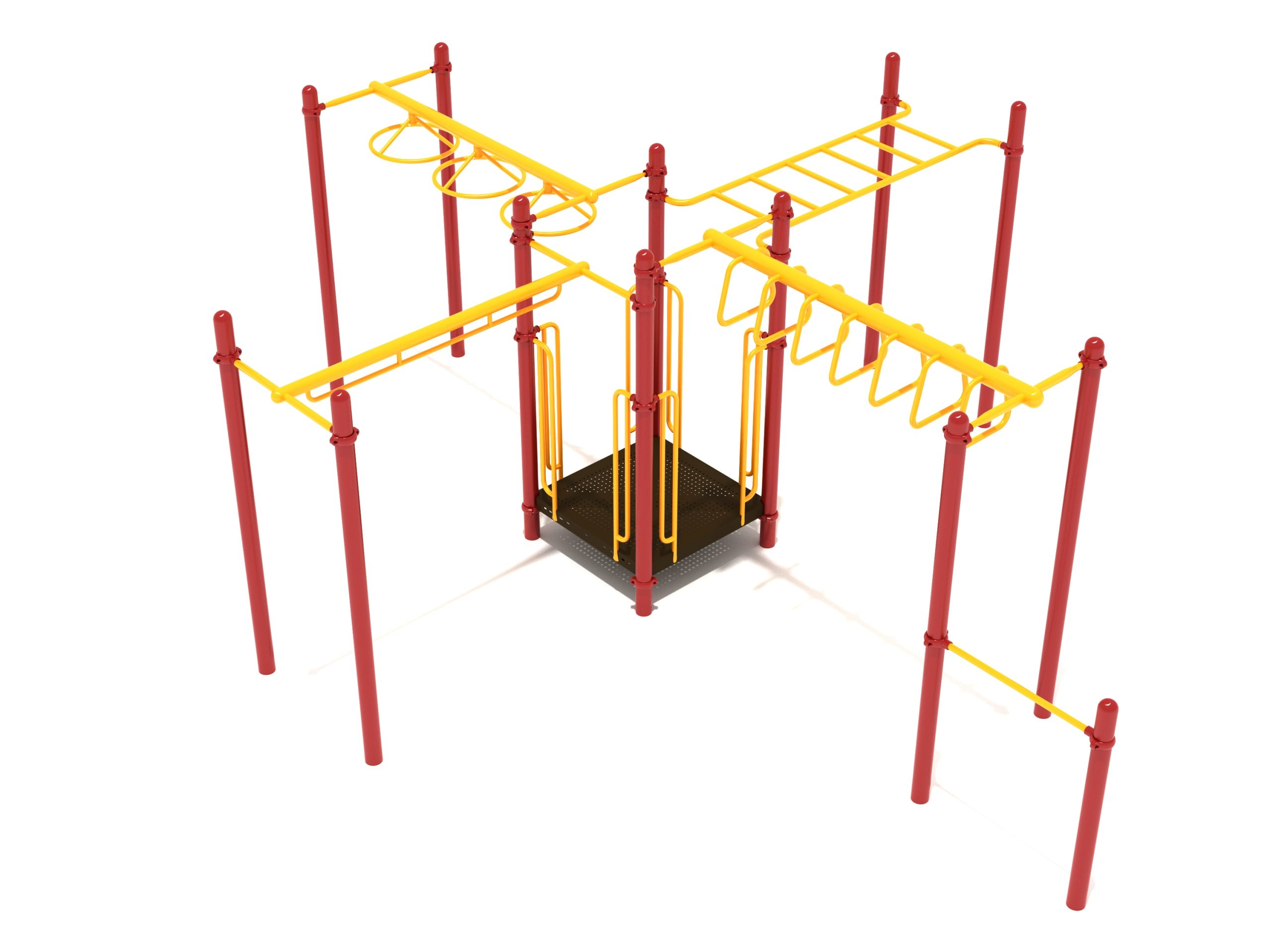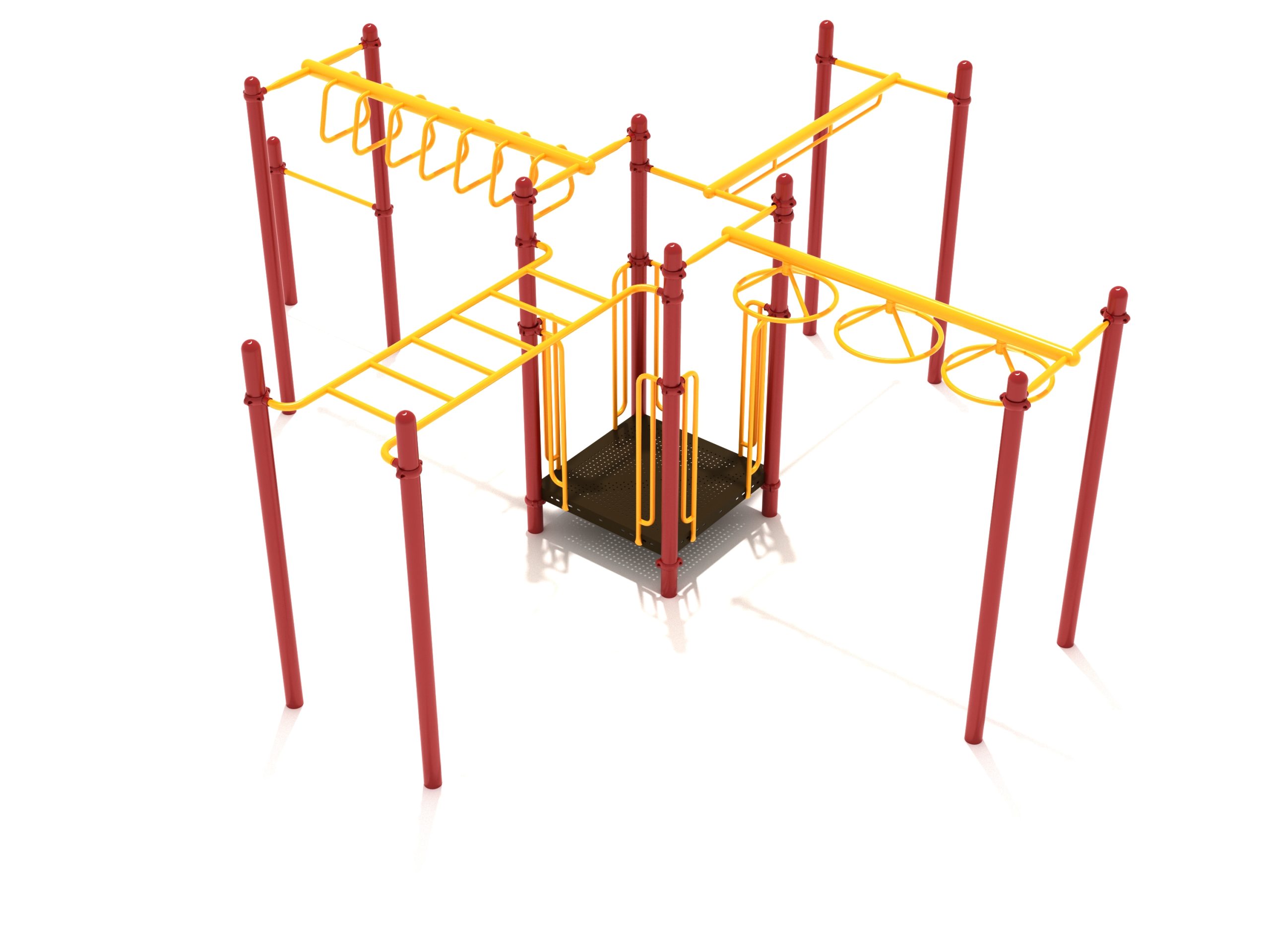 Gymnastic abilities and upper body strength will be tested again and again on the White Plains play set. Children can start on the central platform and choose from four different overhead bar experiences. They can swing their way to the end and drop or double the challenge and turn their body around and shimmy back to the platform. The Overhead Straight Rung Horizontal Ladder and Overhead Single Parallel Bar Ladder are two of the easiest ones to master but will still challenge young monkeys as they must coordinate hand movements while keeping their body balanced to succeed. The Overhead Straight Trapezoid Loop Ladder steps up the difficulty as the bars are angled and to grip them children must have the confidence to let go and reach for the next bar. There’s a Pull Up Bar attached at the end to practice on too. The real challenge comes from the Overhead 3 Wheel Swing Ladder where too much body movement makes the child swing around dizzily until they can grab the circular bar in front.