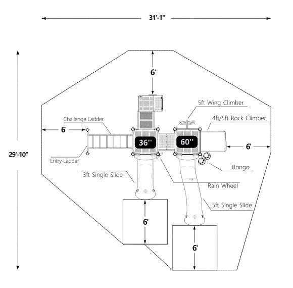 Get ready for the ultimate play experience at Jungle Play Playground! This incredible playground structure is jam-packed with thrilling play features that will keep kids entertained for hours on end. With two single slides, kids can zip to the bottom in style. The wing climber and rock climber offer challenging and exciting ways to scramble to the top, and the overhead entry ladder and challenge ladder provide additional climbing options. The bongo is a fun and musical element that kids will love, and the rain wheel adds a touch of whimsy to the playground. With so much to discover and explore, the Jungle Play Playground is the perfect place for kids to let their imaginations run wild. So come on down and let the fun begin! The Jungle Play Playground is the ultimate destination for kids' fun and excitement.