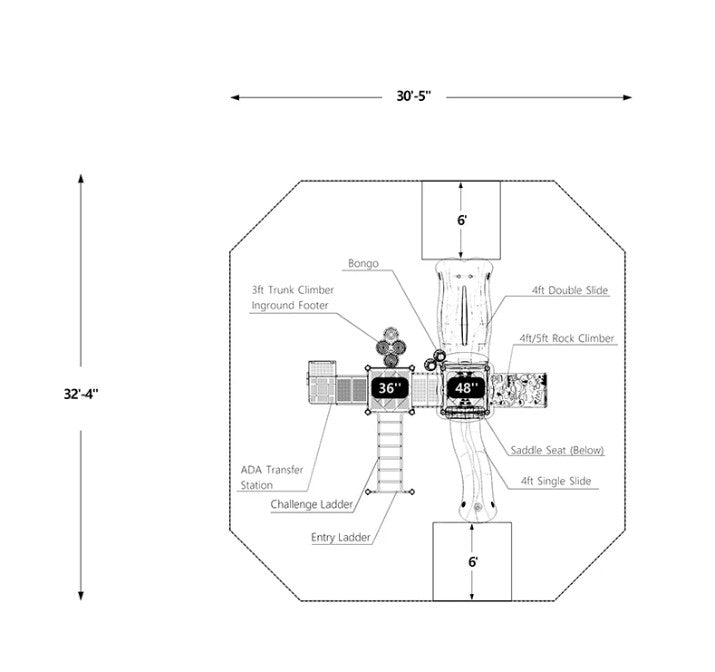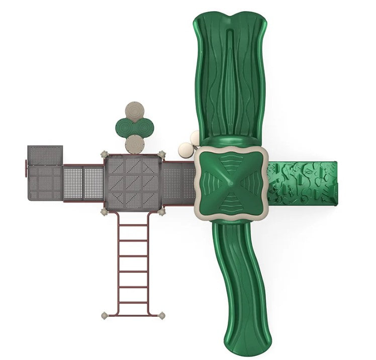 Get ready for the ultimate play experience with the Leafy Time Playground! This incredible playground structure is filled to the brim with thrilling play features that will keep kids entertained for hours on end. With a single slide and a double slide, kids can coast their way to the bottom in style. The rock climber and challenge ladder offer challenging and exciting ways for kids to reach new heights, and the overhead entry ladder provides an additional climbing option. The bongos are a fun and musical element that kids will love, and with so much to discover and explore, the Leafy Time Playground is the perfect place for kids to let their imaginations run wild. So come on down and let the fun begin! The Leafy Time Playground is the ultimate destination for kids' fun and excitement.